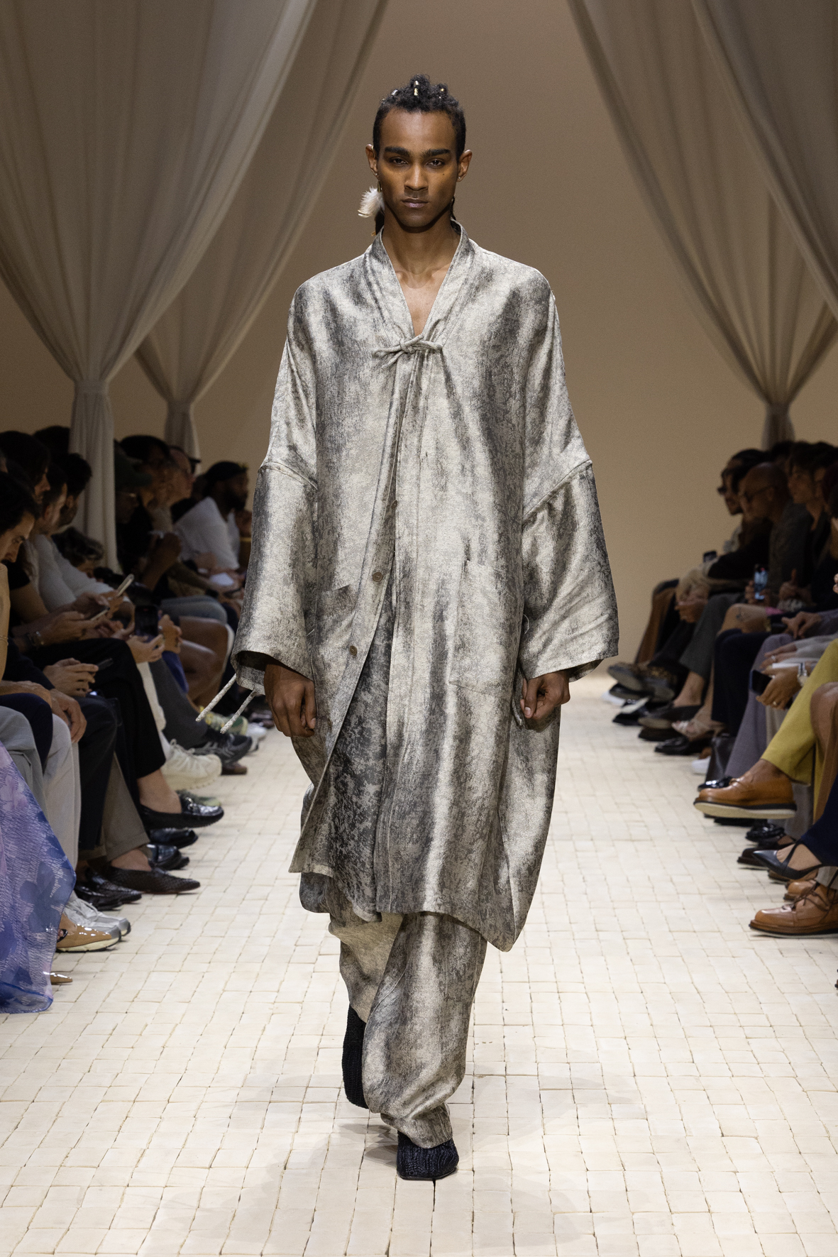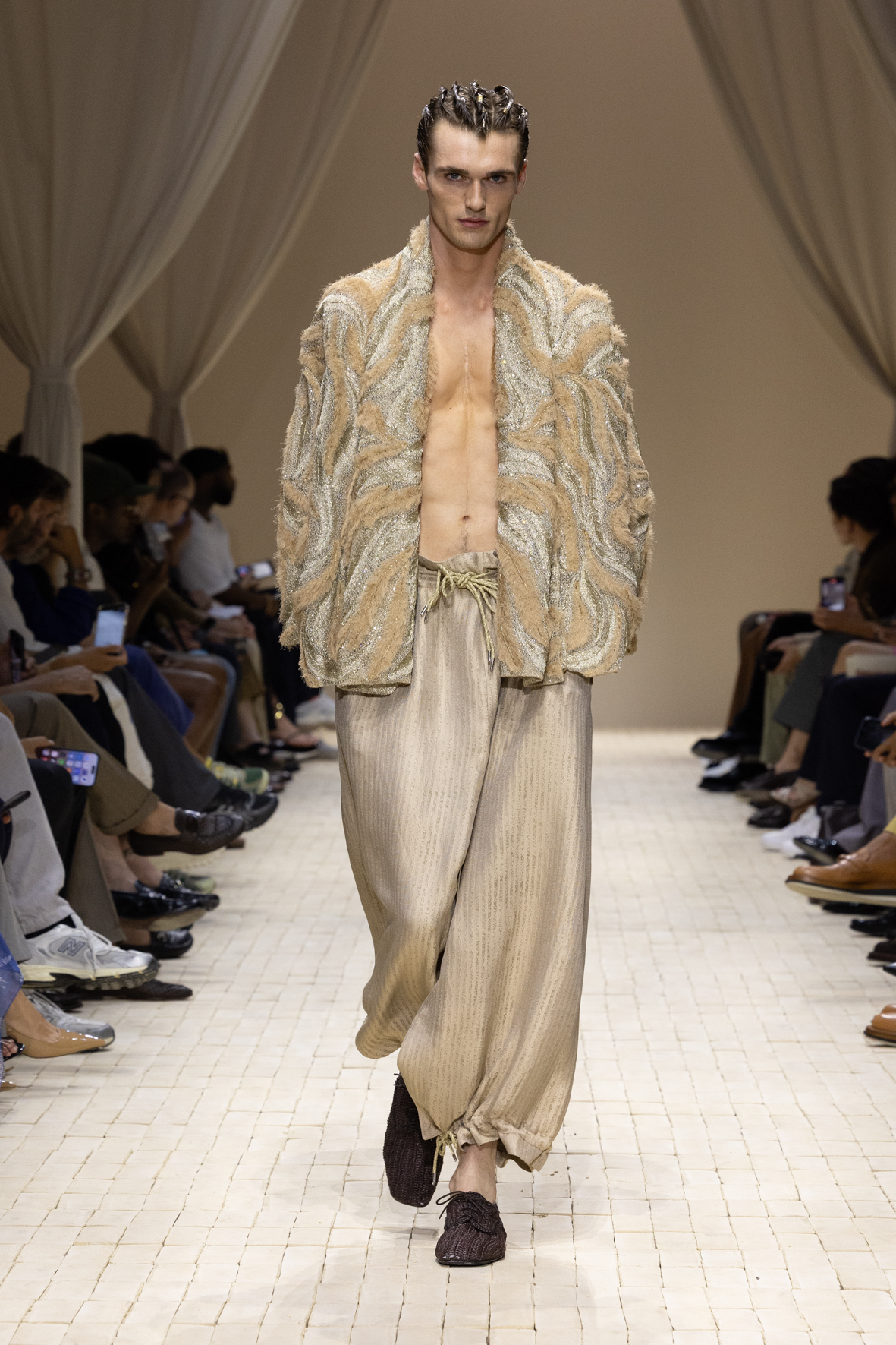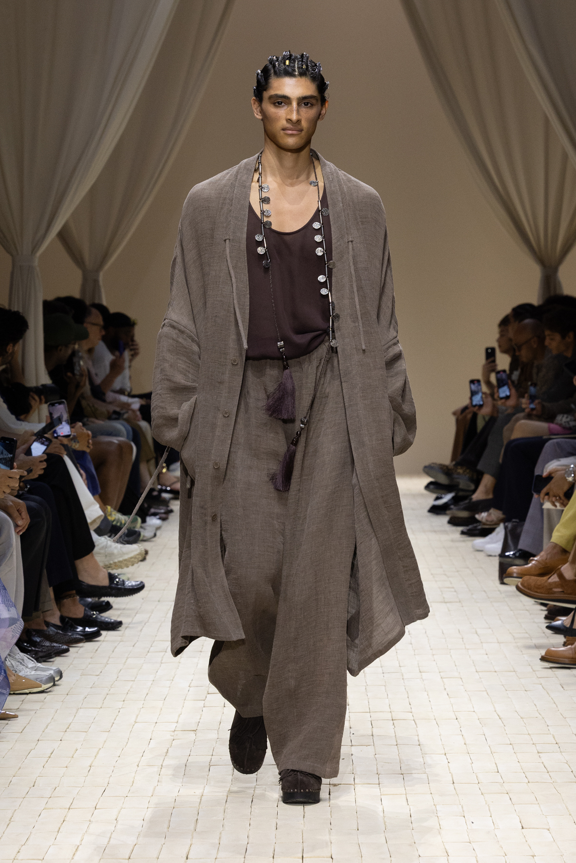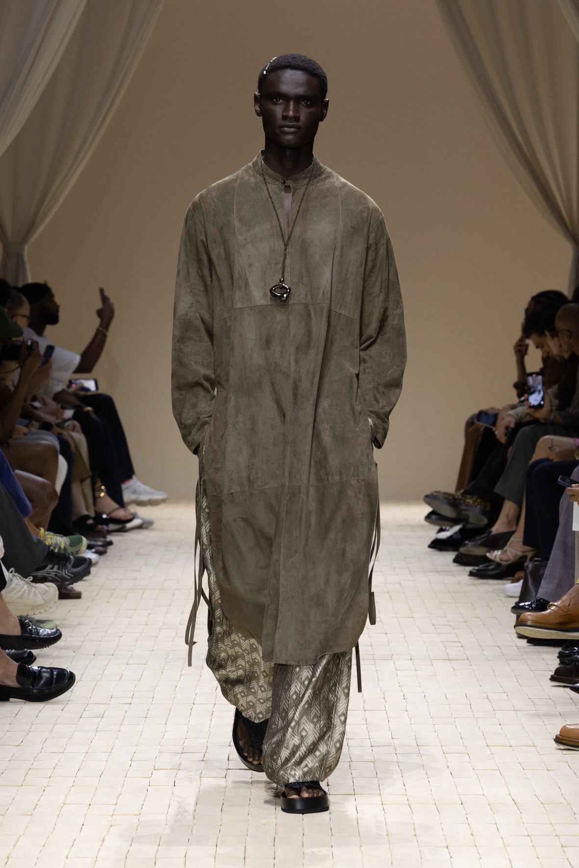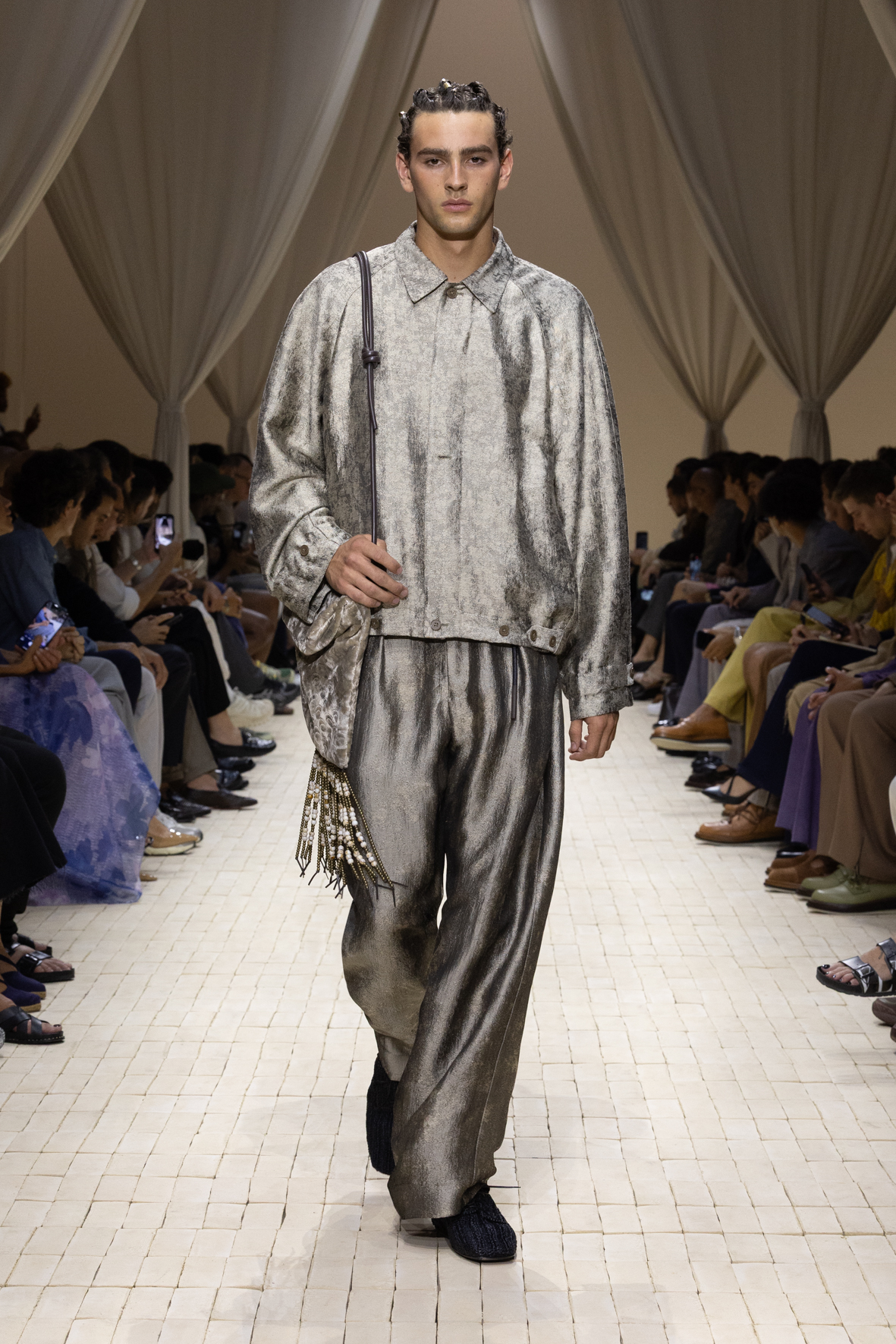 对本源的思考始于材质:绉绸和亚麻或粗粝而挺括,或流畅而轻盈;冷染技术则赋予色彩经受烈日洗礼的古朴质感,如温暖的沙色、泥土色和红土色调,其间点缀着草原的色彩、深邃的紫罗兰和饱和度较低的红色。跃然于衣 面的图案灵感源自摩洛哥马赛克或柏柏尔帐篷;缩褶绣令人联想到仪式纹身,密集的珠饰和丝线刺绣则勾勒出富有韵律的几何图案和象征无限的符号意向。