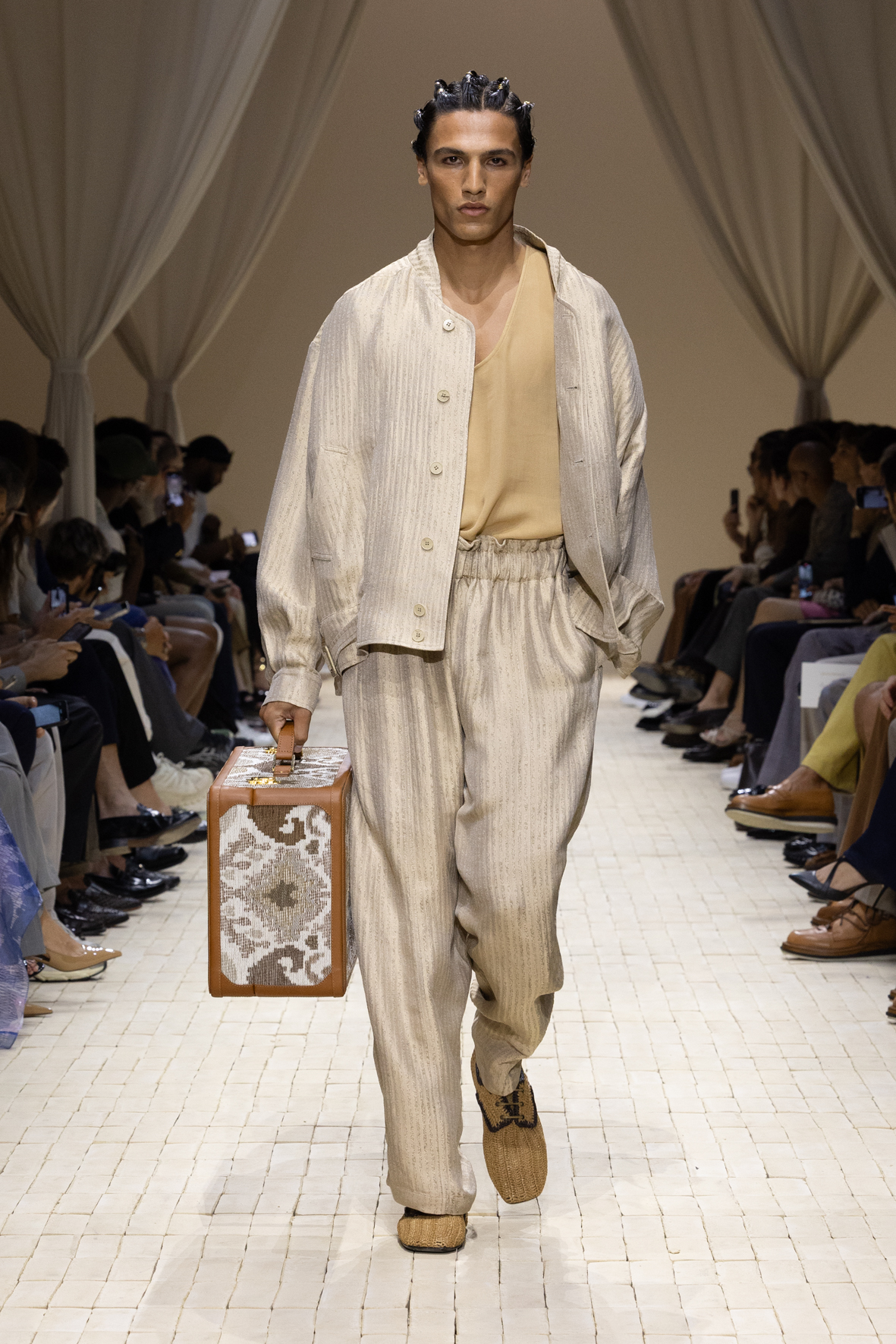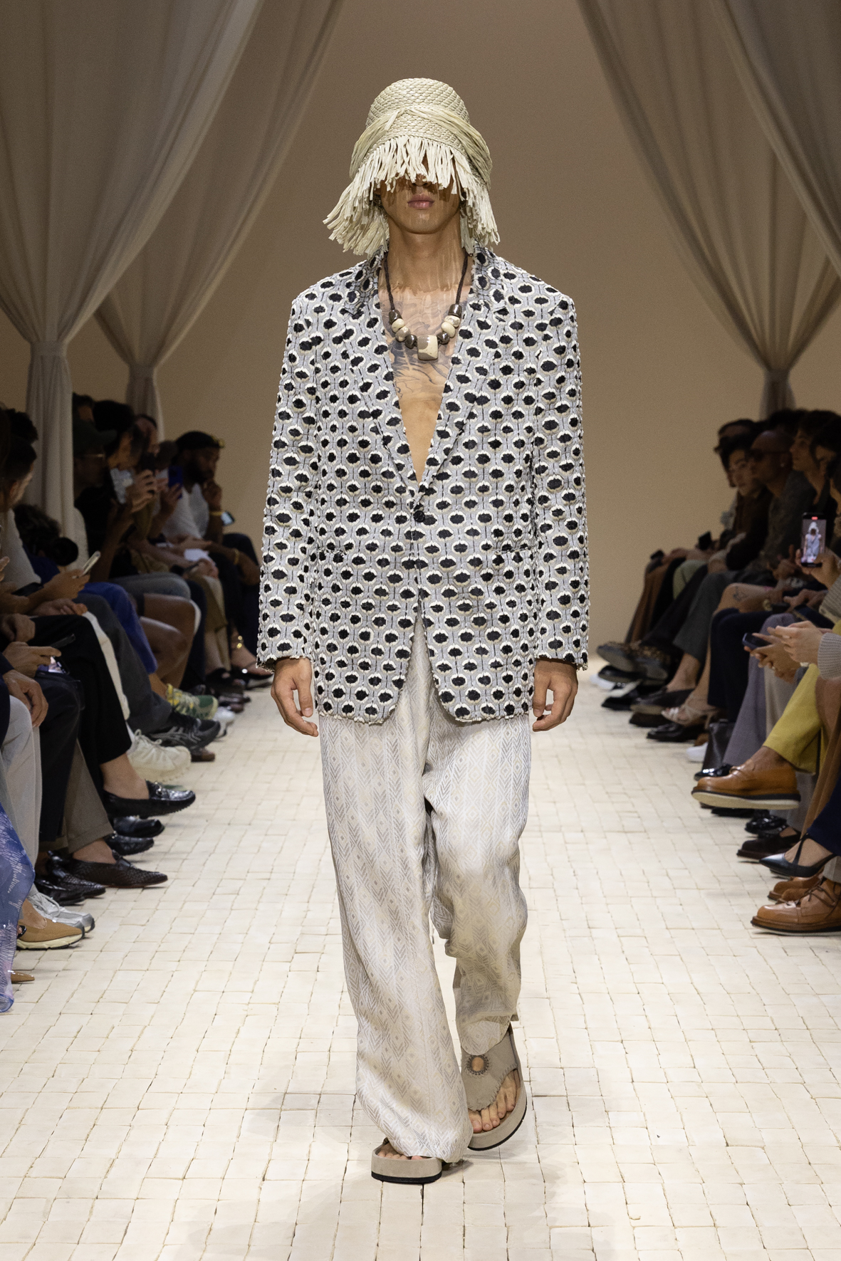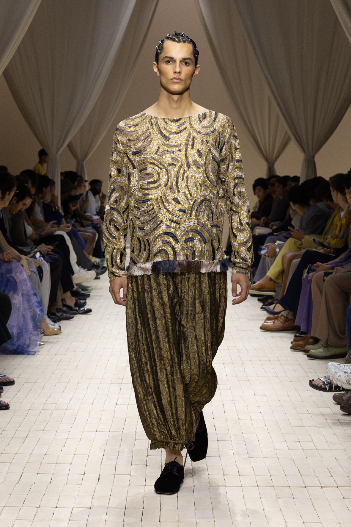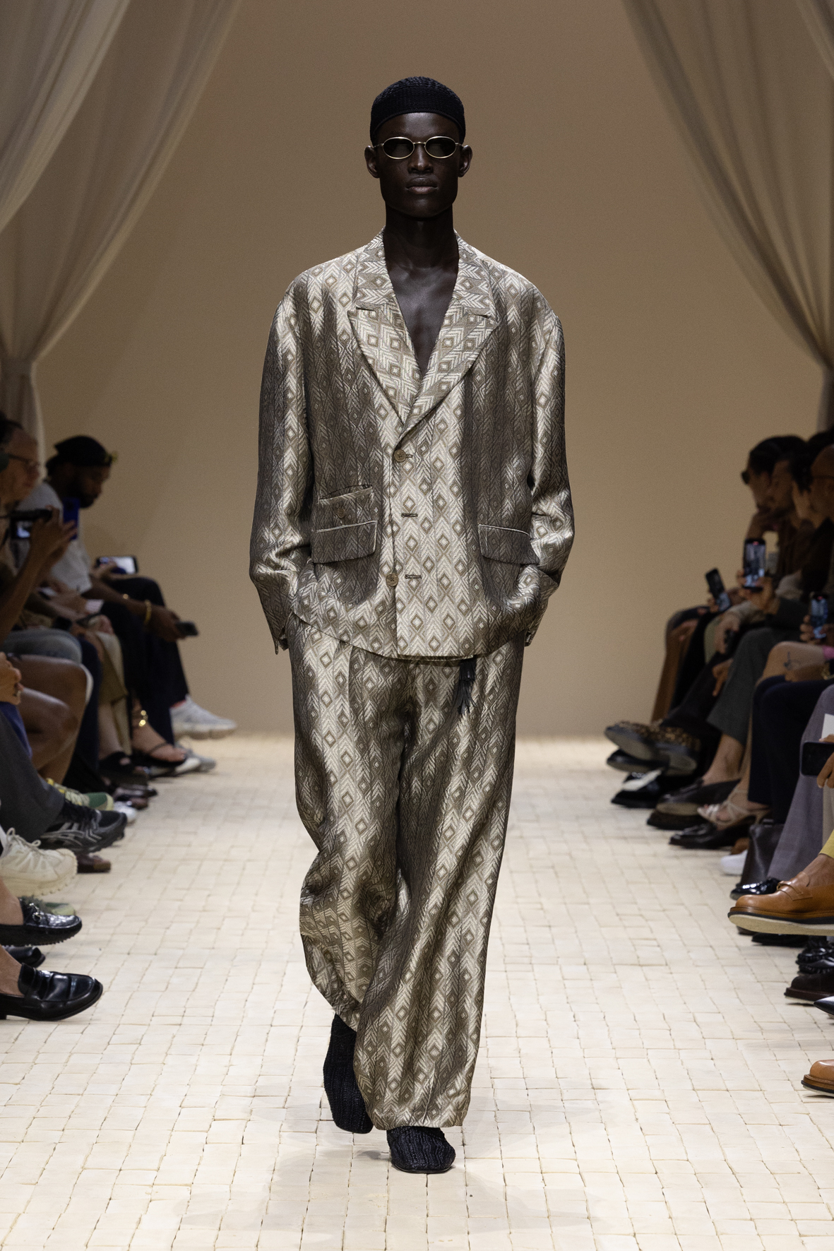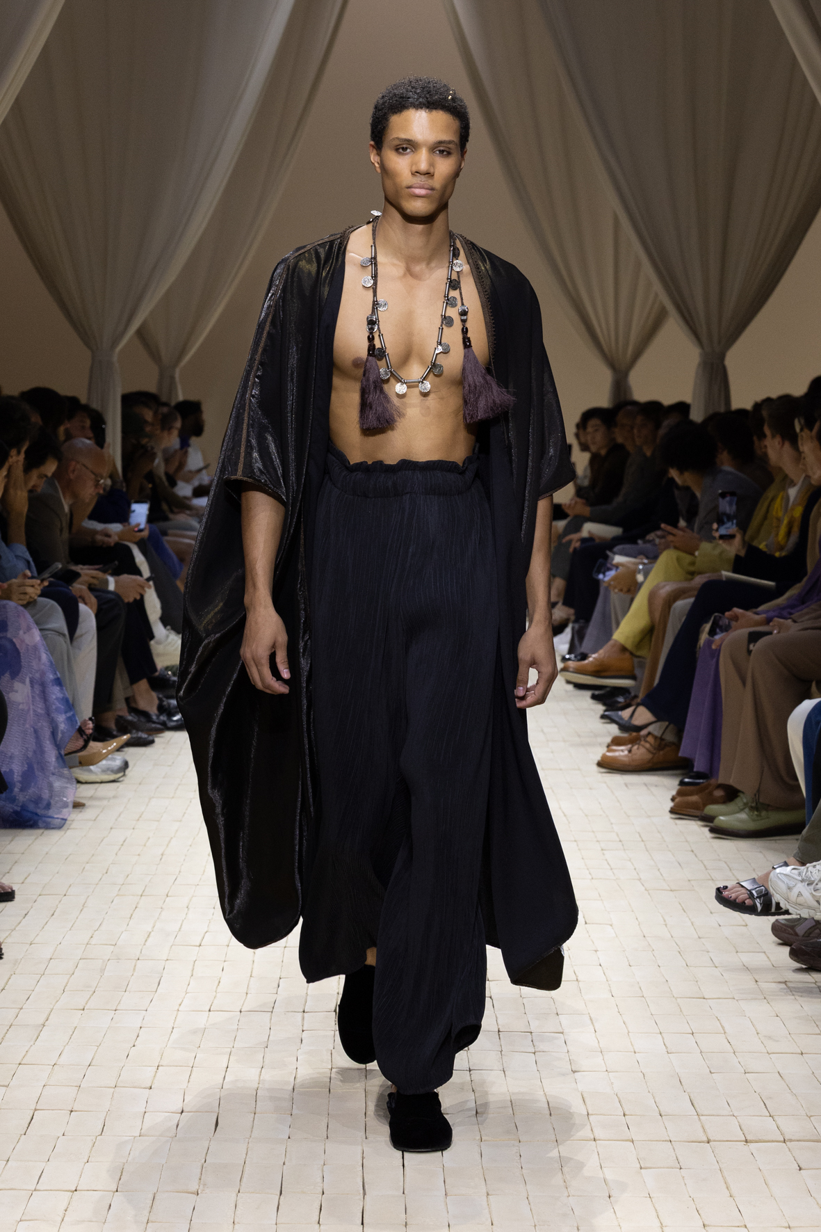 对本源的思考始于材质:绉绸和亚麻或粗粝而挺括,或流畅而轻盈;冷染技术则赋予色彩经受烈日洗礼的古朴质感,如温暖的沙色、泥土色和红土色调,其间点缀着草原的色彩、深邃的紫罗兰和饱和度较低的红色。跃然于衣 面的图案灵感源自摩洛哥马赛克或柏柏尔帐篷;缩褶绣令人联想到仪式纹身,密集的珠饰和丝线刺绣则勾勒出富有韵律的几何图案和象征无限的符号意向。