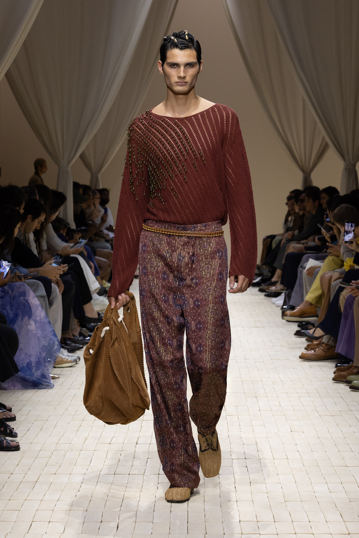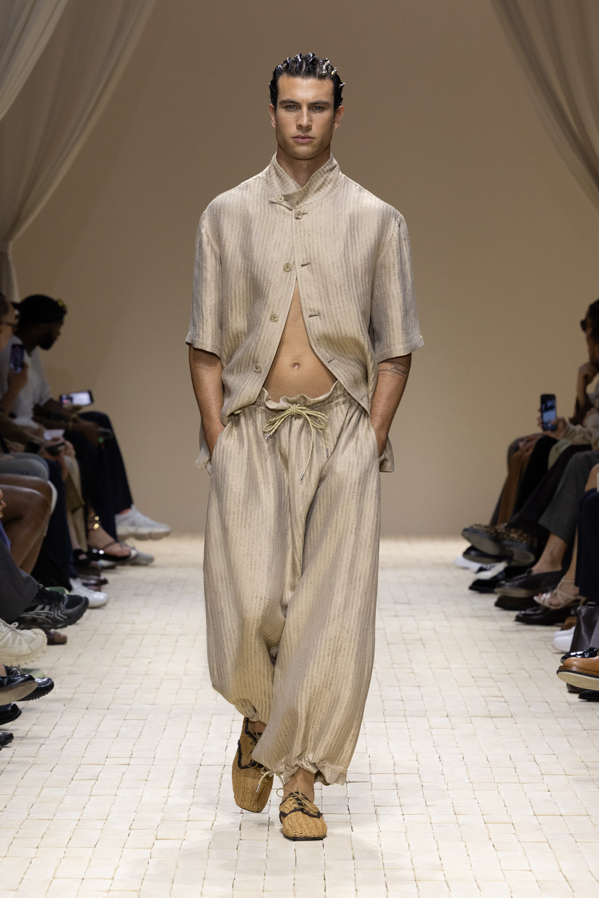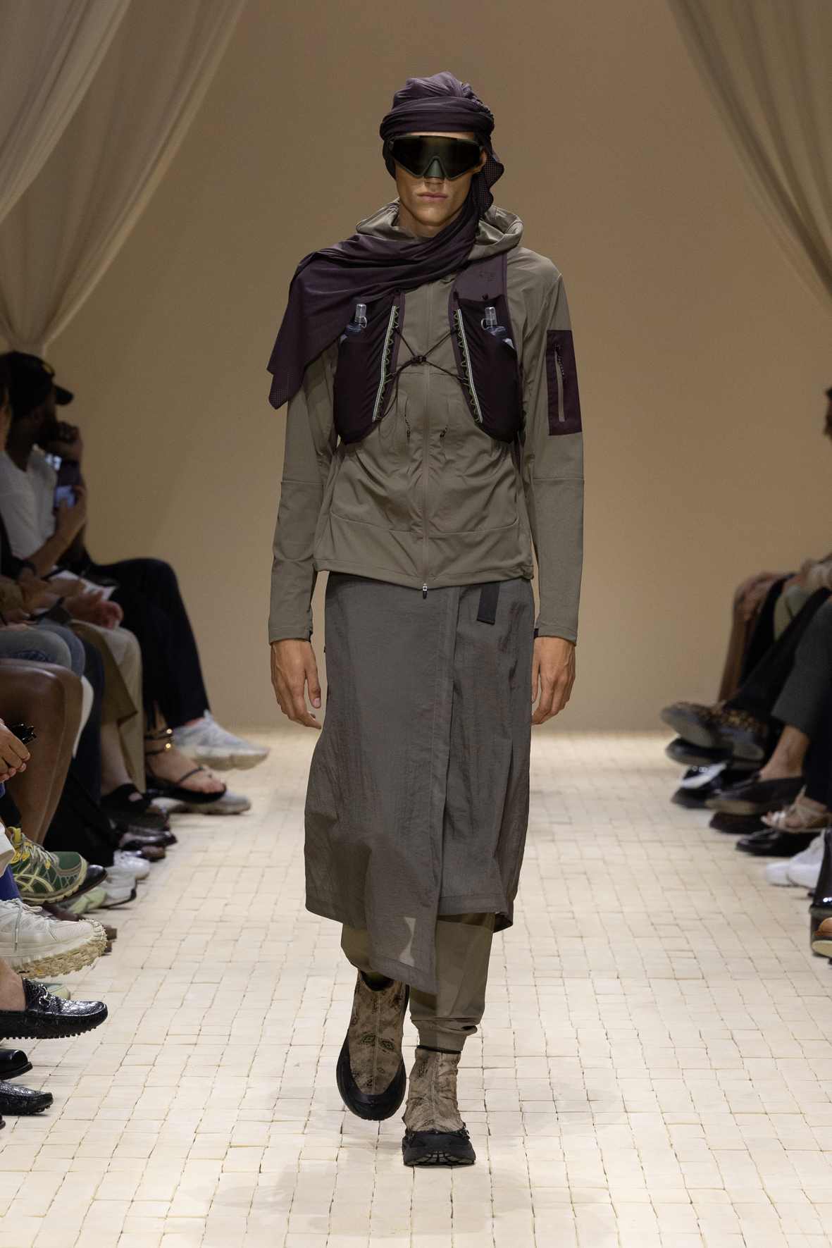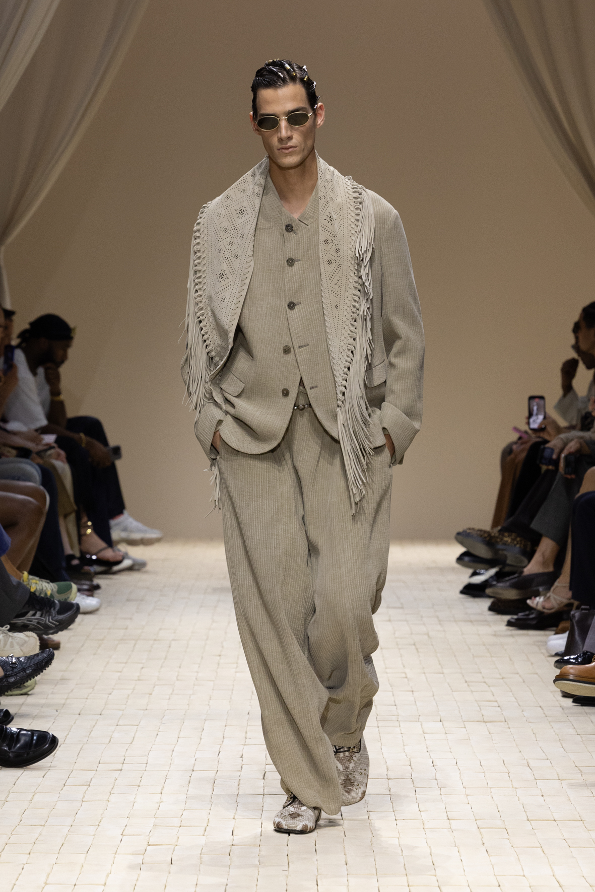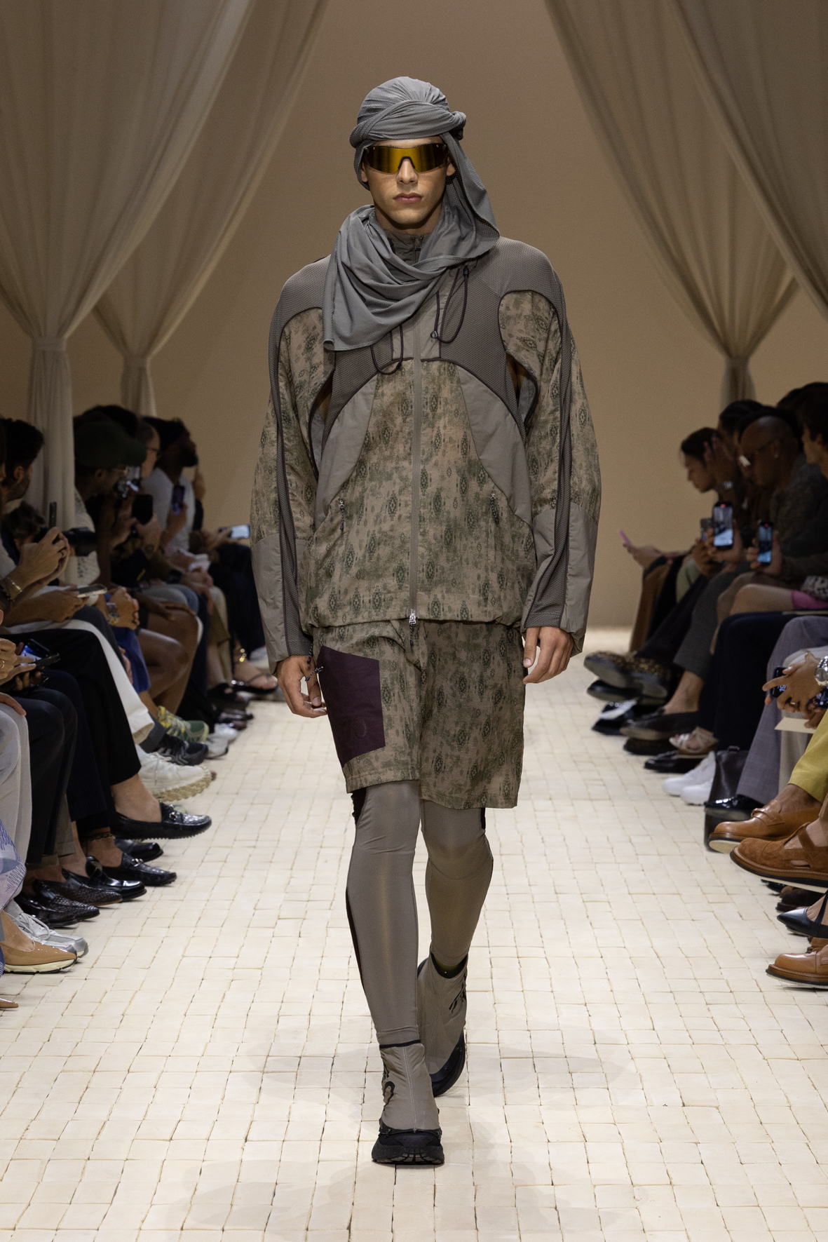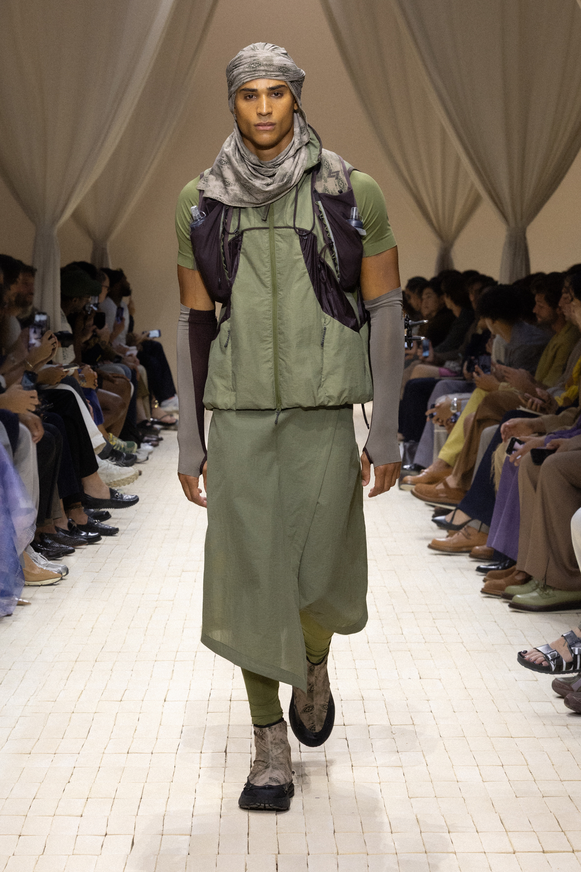 对本源的思考始于材质:绉绸和亚麻或粗粝而挺括,或流畅而轻盈;冷染技术则赋予色彩经受烈日洗礼的古朴质感,如温暖的沙色、泥土色和红土色调,其间点缀着草原的色彩、深邃的紫罗兰和饱和度较低的红色。跃然于衣 面的图案灵感源自摩洛哥马赛克或柏柏尔帐篷;缩褶绣令人联想到仪式纹身,密集的珠饰和丝线刺绣则勾勒出富有韵律的几何图案和象征无限的符号意向。