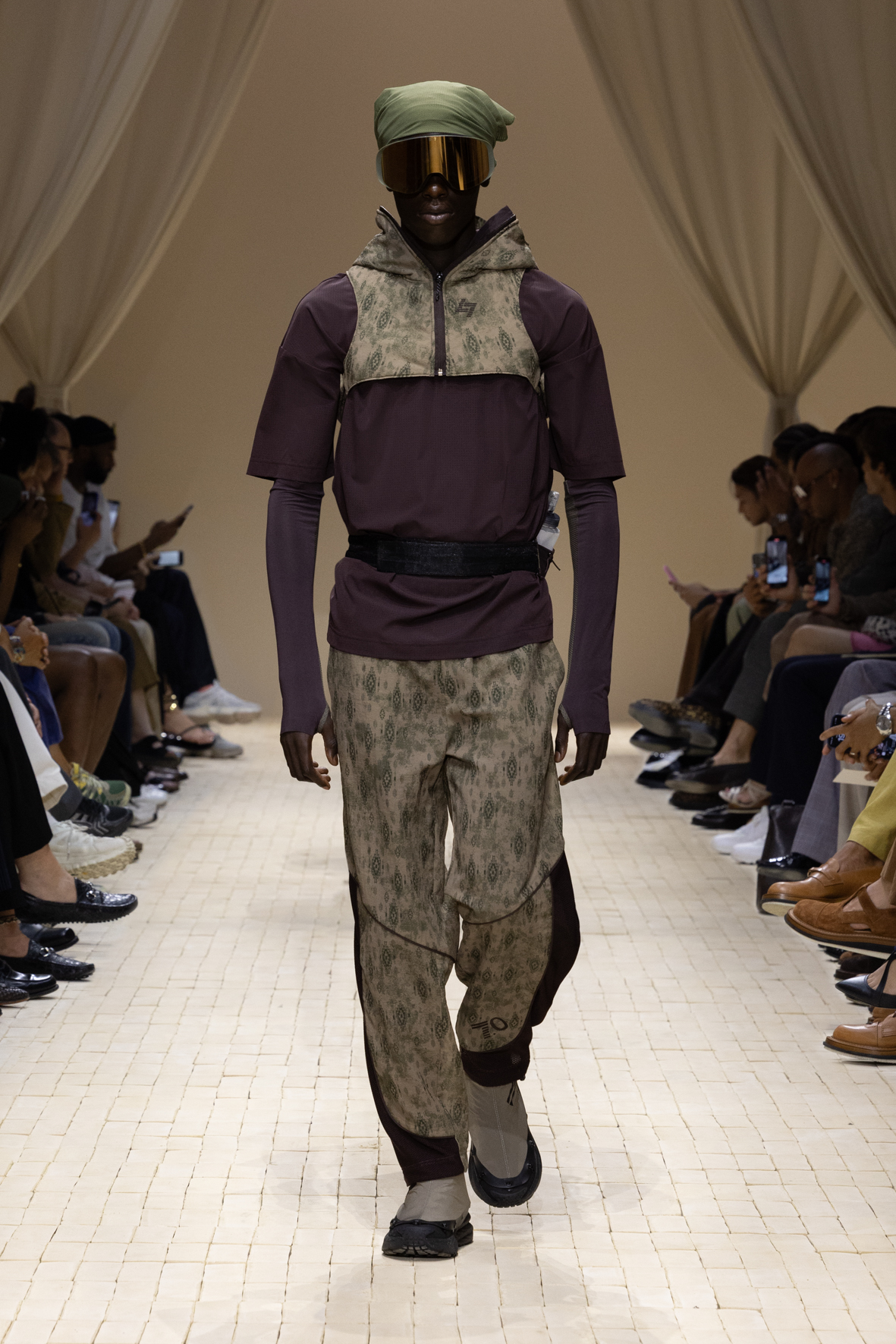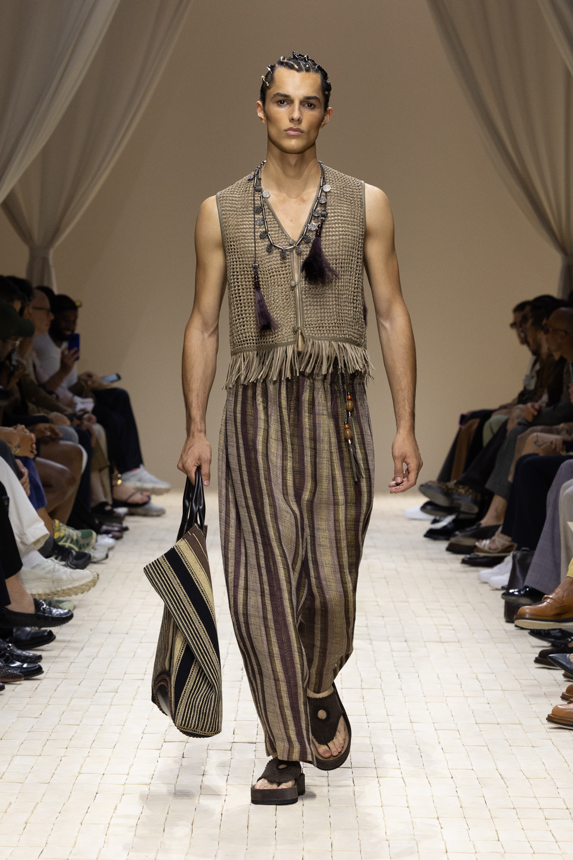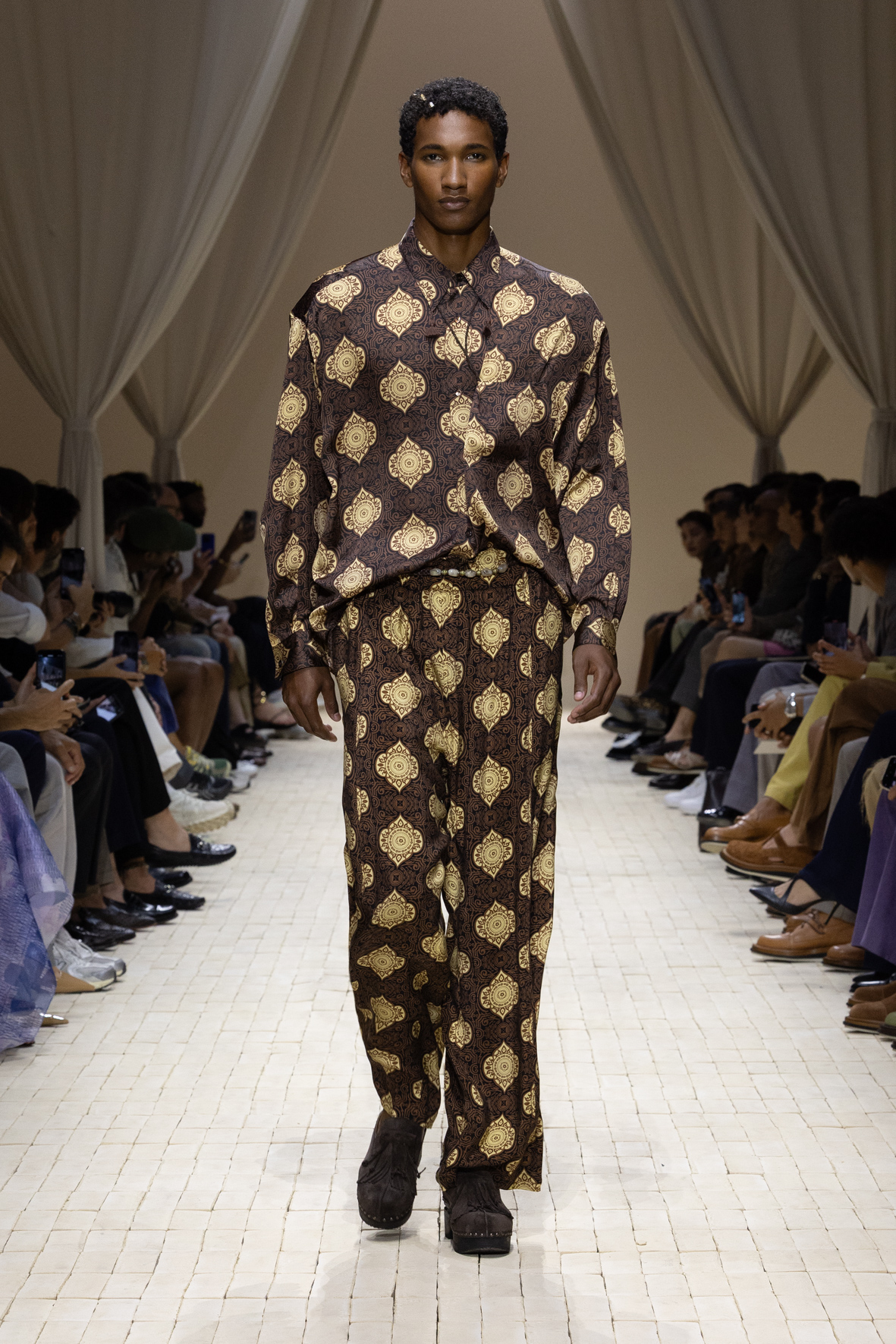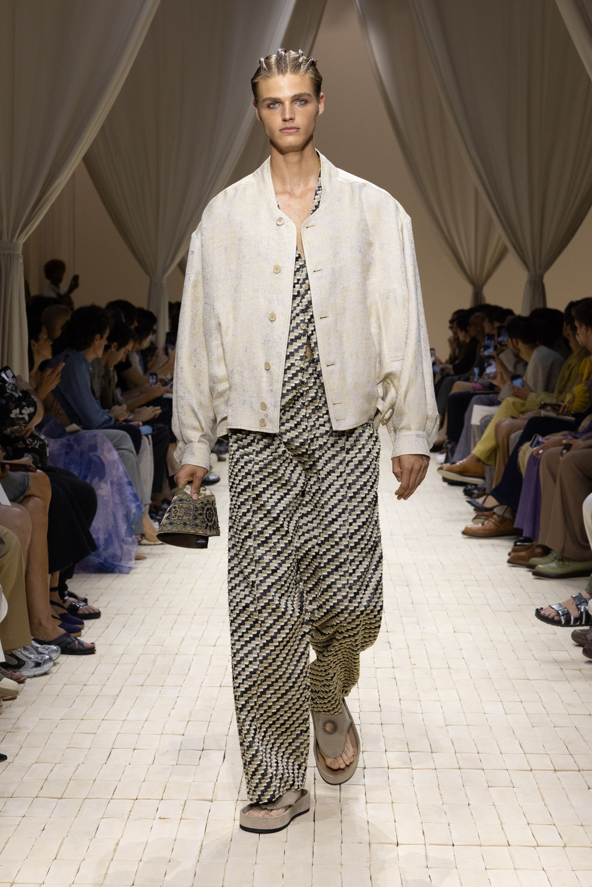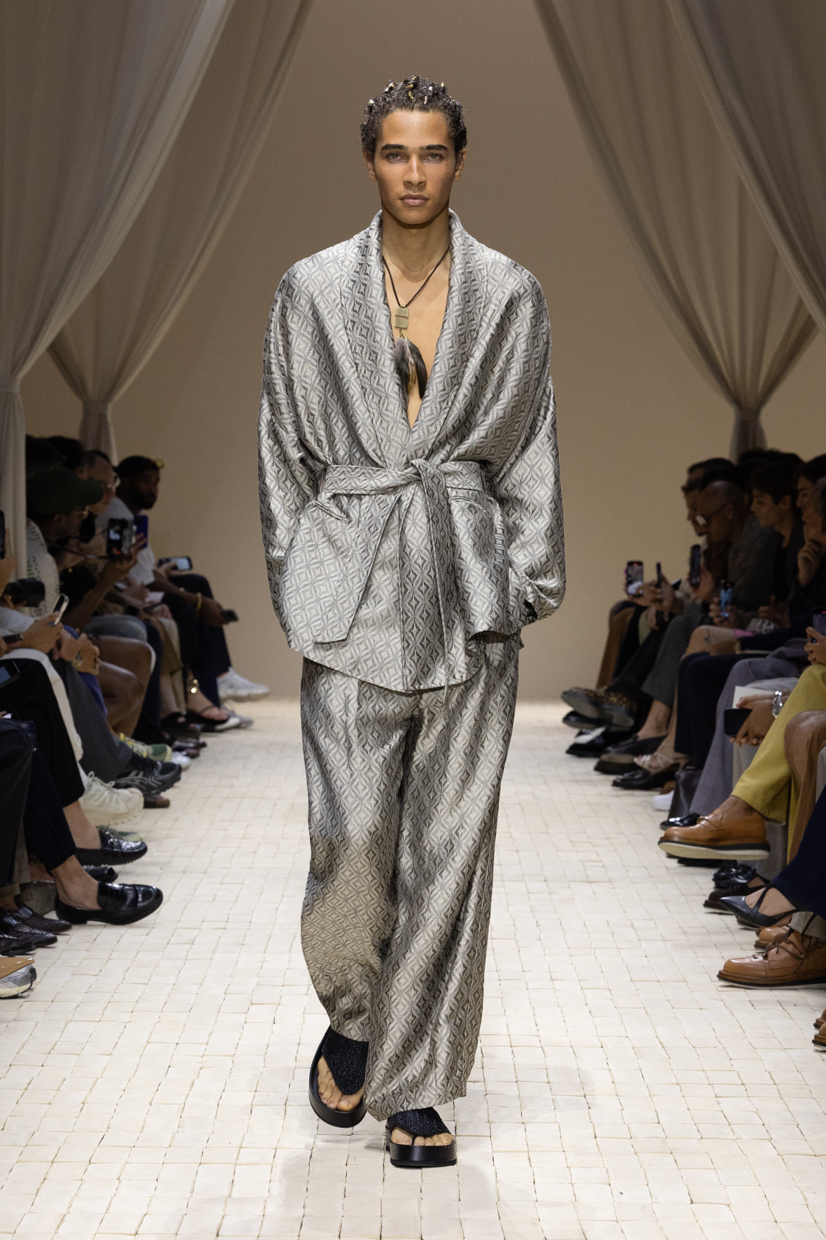 对本源的思考始于材质:绉绸和亚麻或粗粝而挺括,或流畅而轻盈;冷染技术则赋予色彩经受烈日洗礼的古朴质感,如温暖的沙色、泥土色和红土色调,其间点缀着草原的色彩、深邃的紫罗兰和饱和度较低的红色。跃然于衣 面的图案灵感源自摩洛哥马赛克或柏柏尔帐篷;缩褶绣令人联想到仪式纹身,密集的珠饰和丝线刺绣则勾勒出富有韵律的几何图案和象征无限的符号意向。