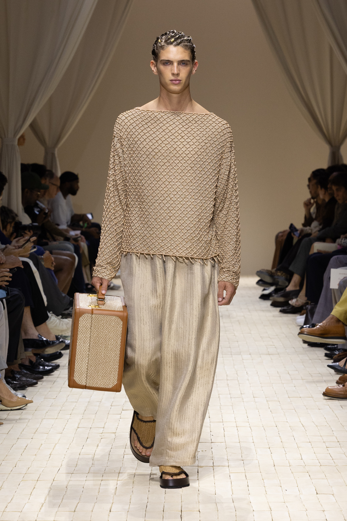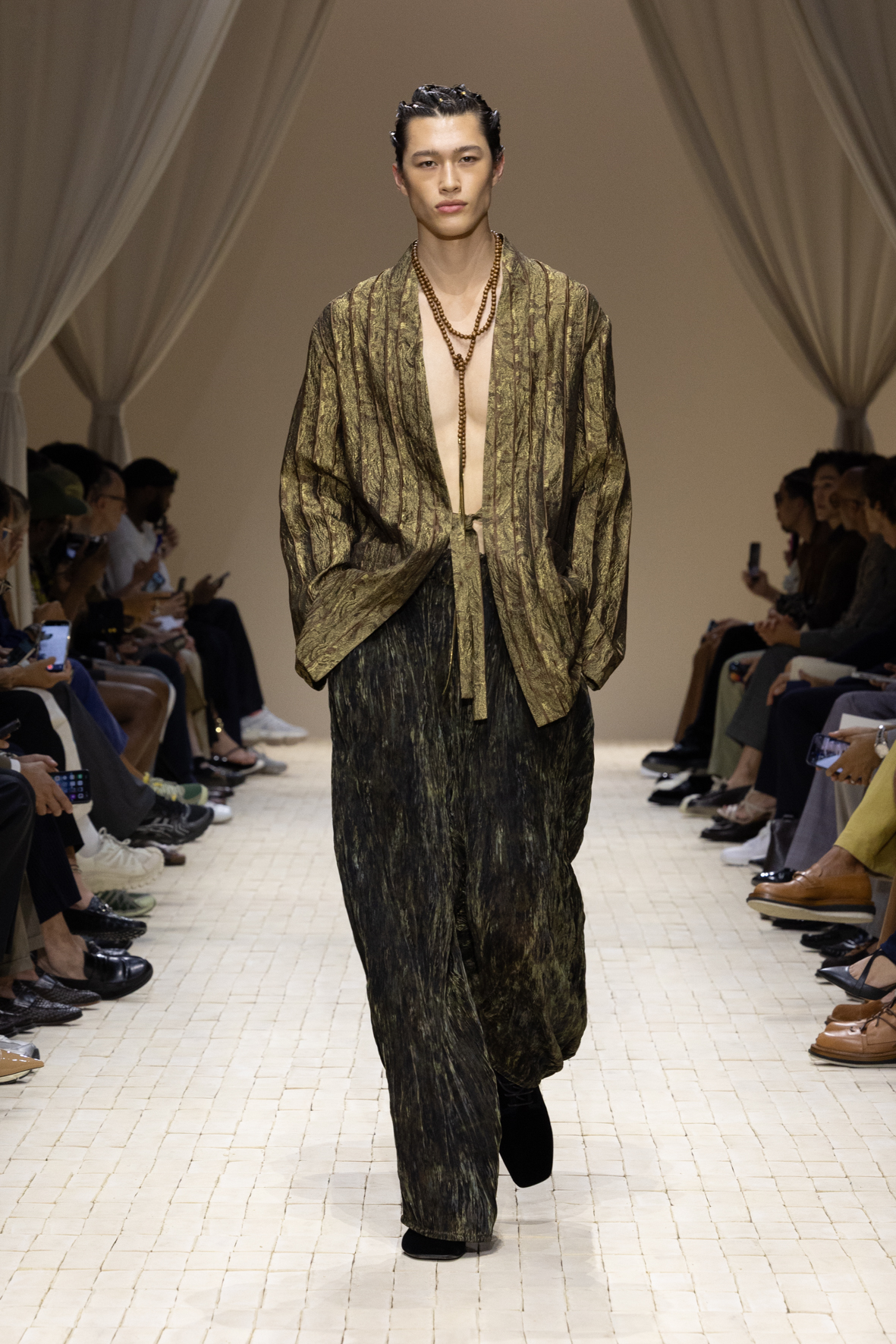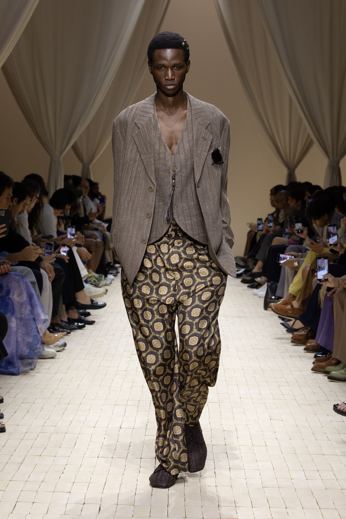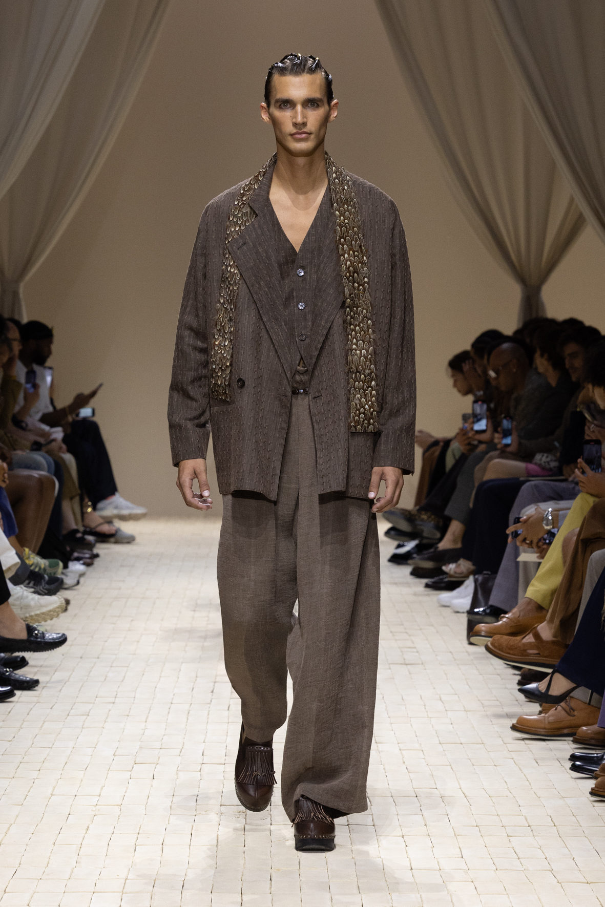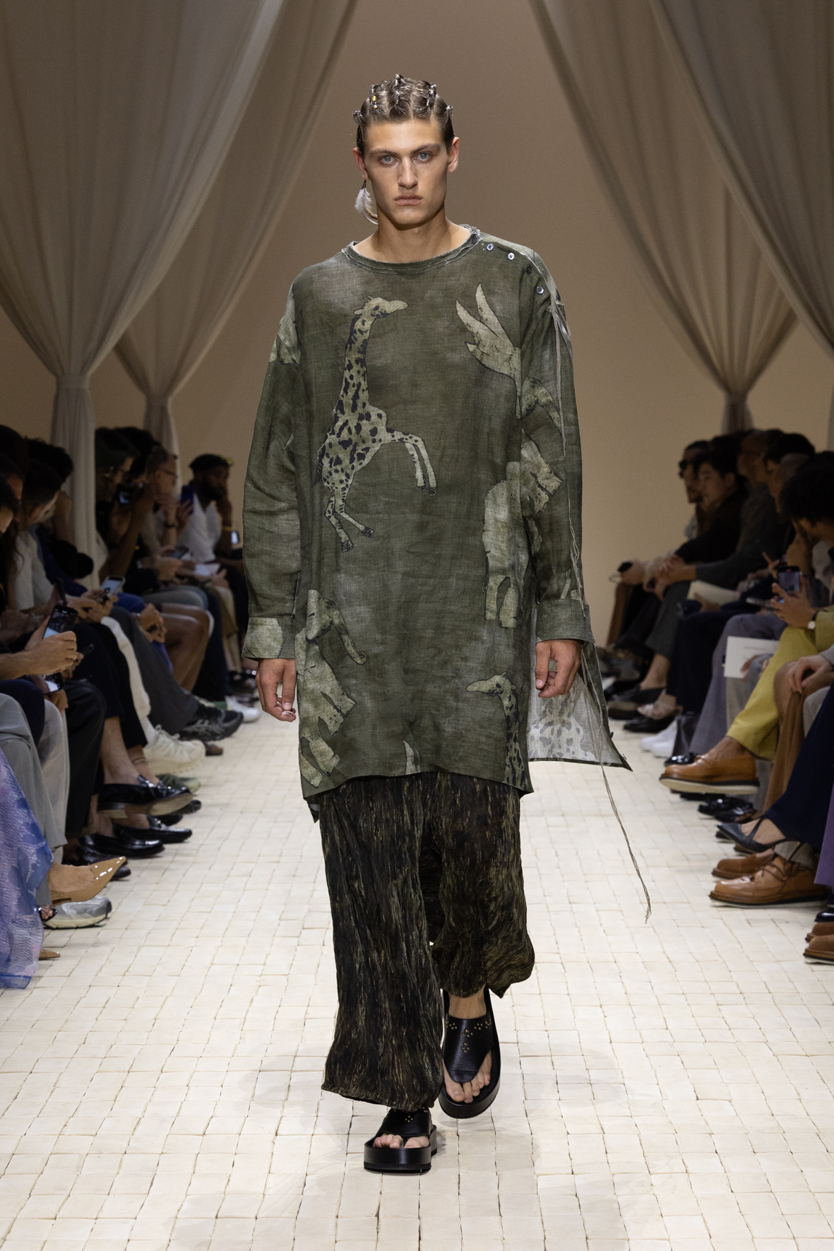 对本源的思考始于材质:绉绸和亚麻或粗粝而挺括,或流畅而轻盈;冷染技术则赋予色彩经受烈日洗礼的古朴质感,如温暖的沙色、泥土色和红土色调,其间点缀着草原的色彩、深邃的紫罗兰和饱和度较低的红色。跃然于衣 面的图案灵感源自摩洛哥马赛克或柏柏尔帐篷;缩褶绣令人联想到仪式纹身,密集的珠饰和丝线刺绣则勾勒出富有韵律的几何图案和象征无限的符号意向。