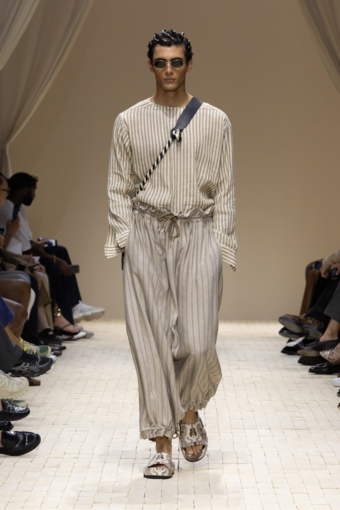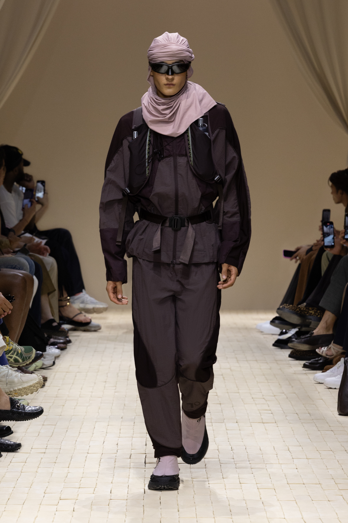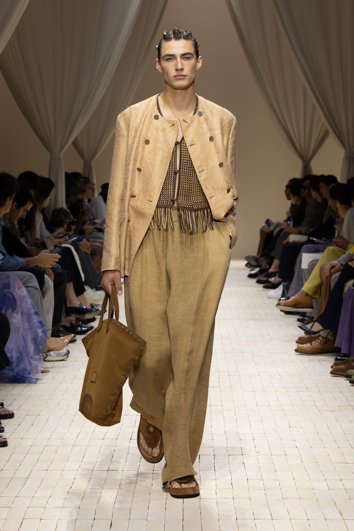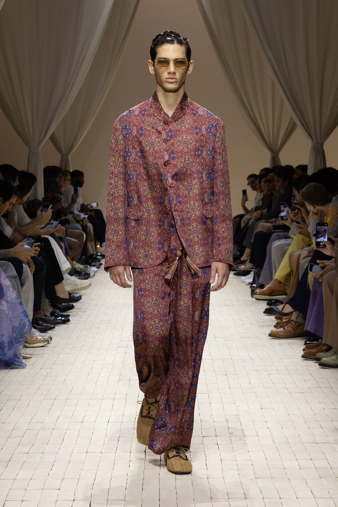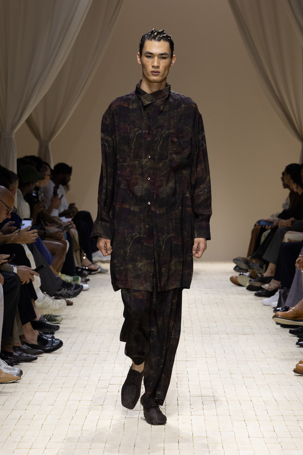 对本源的思考始于材质:绉绸和亚麻或粗粝而挺括,或流畅而轻盈;冷染技术则赋予色彩经受烈日洗礼的古朴质感,如温暖的沙色、泥土色和红土色调,其间点缀着草原的色彩、深邃的紫罗兰和饱和度较低的红色。跃然于衣 面的图案灵感源自摩洛哥马赛克或柏柏尔帐篷;缩褶绣令人联想到仪式纹身,密集的珠饰和丝线刺绣则勾勒出富有韵律的几何图案和象征无限的符号意向。