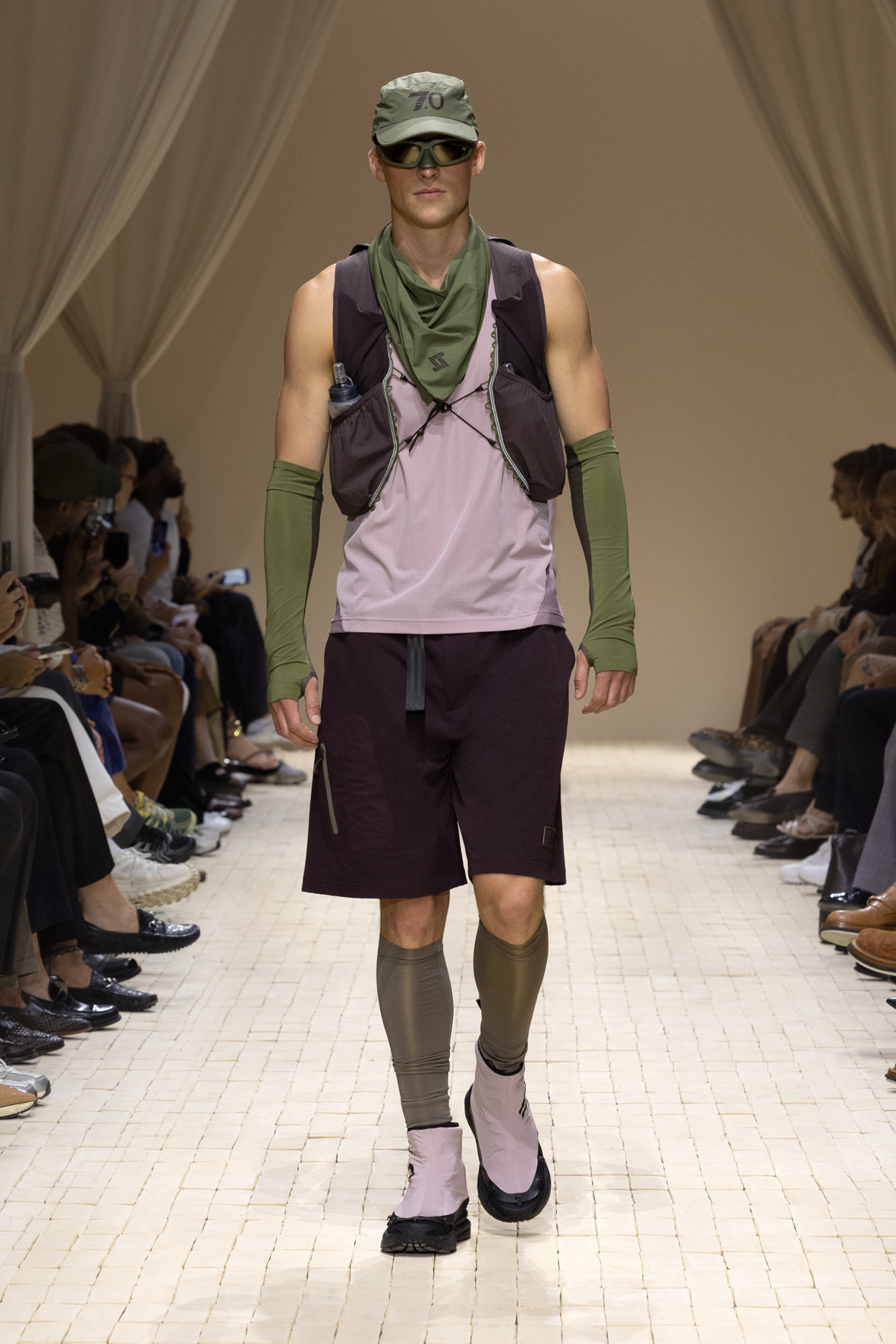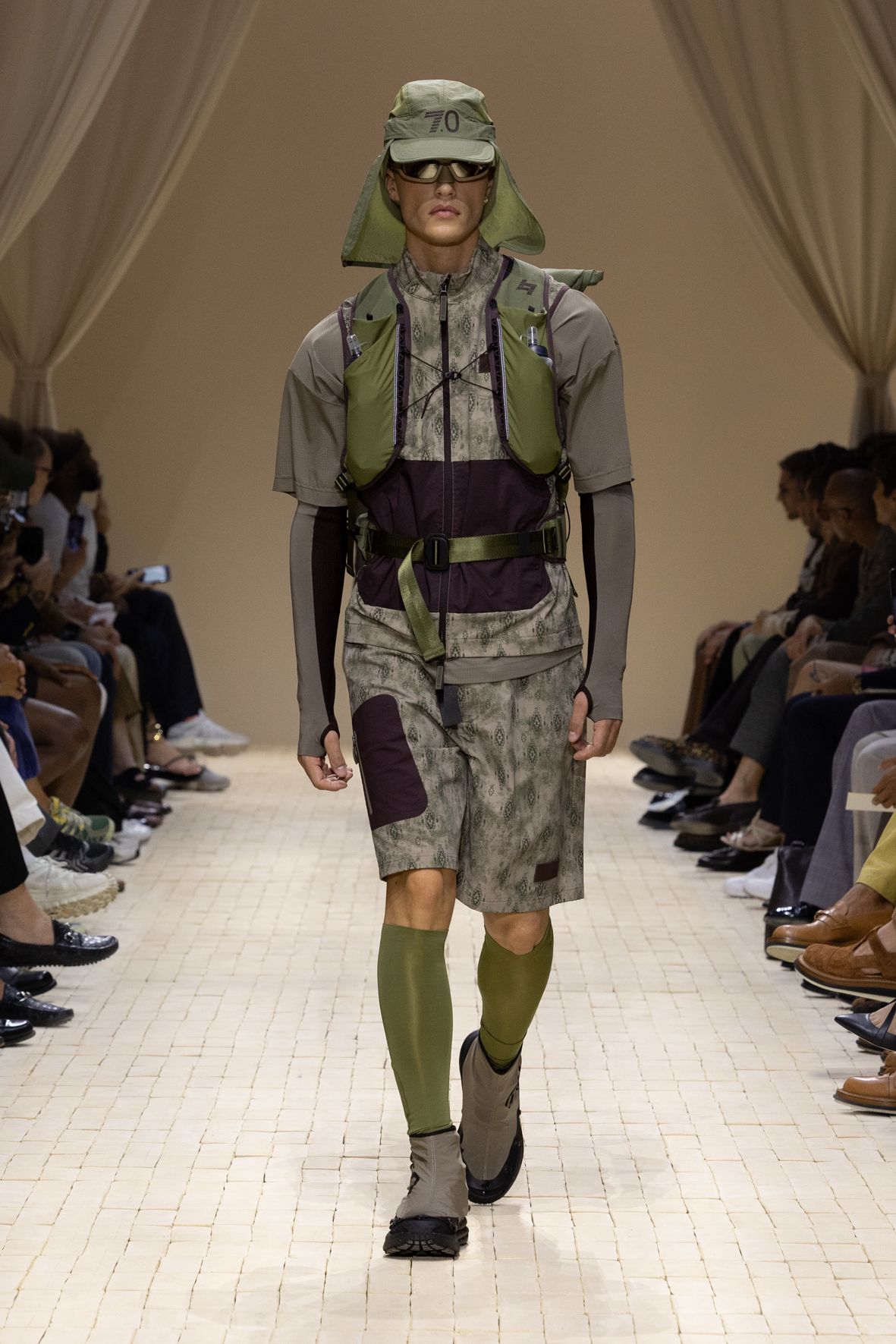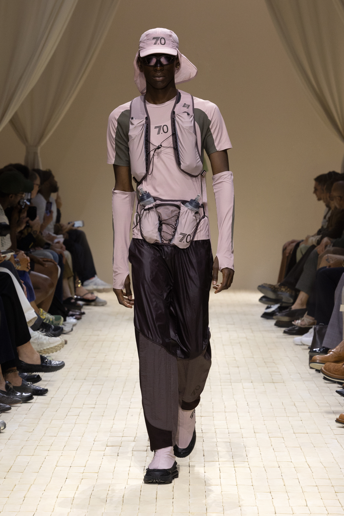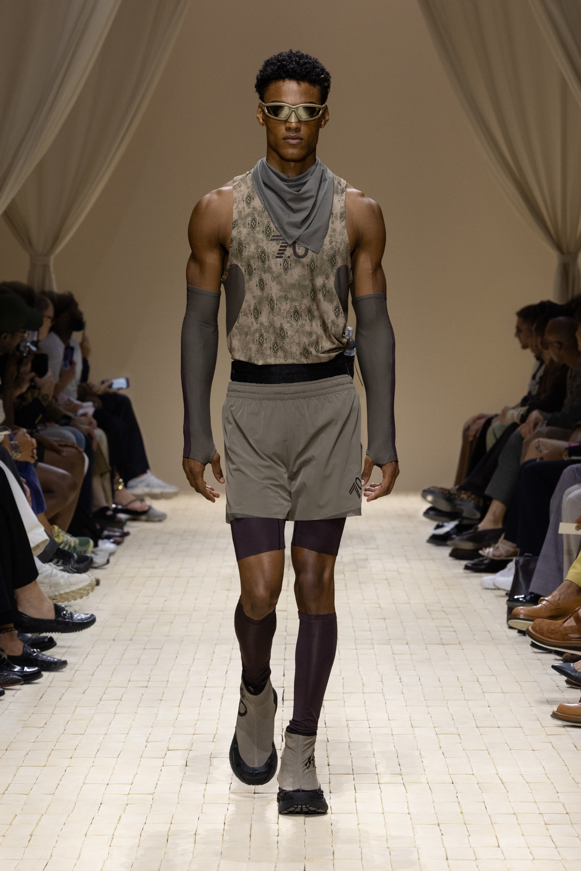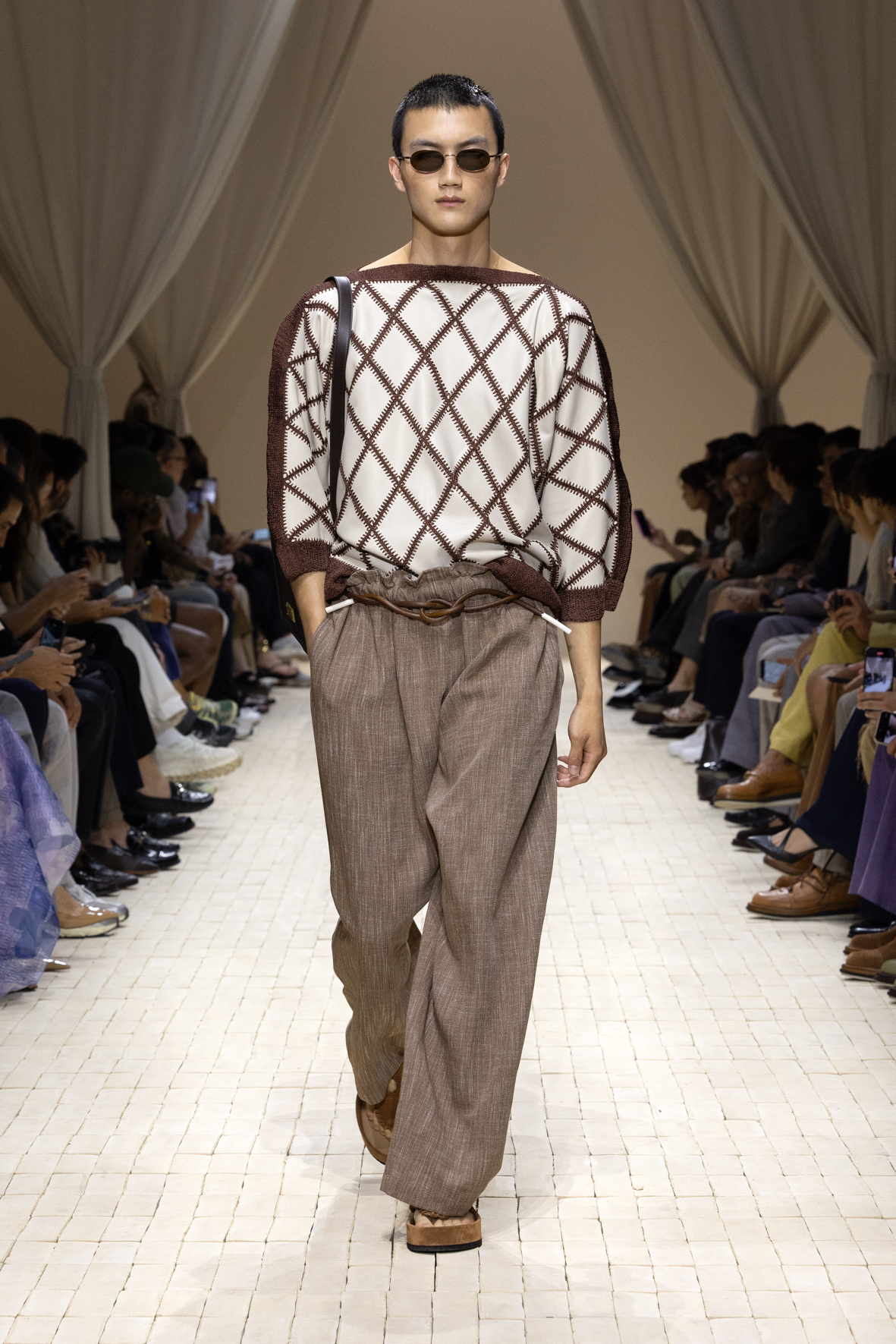 对本源的思考始于材质:绉绸和亚麻或粗粝而挺括,或流畅而轻盈;冷染技术则赋予色彩经受烈日洗礼的古朴质感,如温暖的沙色、泥土色和红土色调,其间点缀着草原的色彩、深邃的紫罗兰和饱和度较低的红色。跃然于衣 面的图案灵感源自摩洛哥马赛克或柏柏尔帐篷;缩褶绣令人联想到仪式纹身,密集的珠饰和丝线刺绣则勾勒出富有韵律的几何图案和象征无限的符号意向。