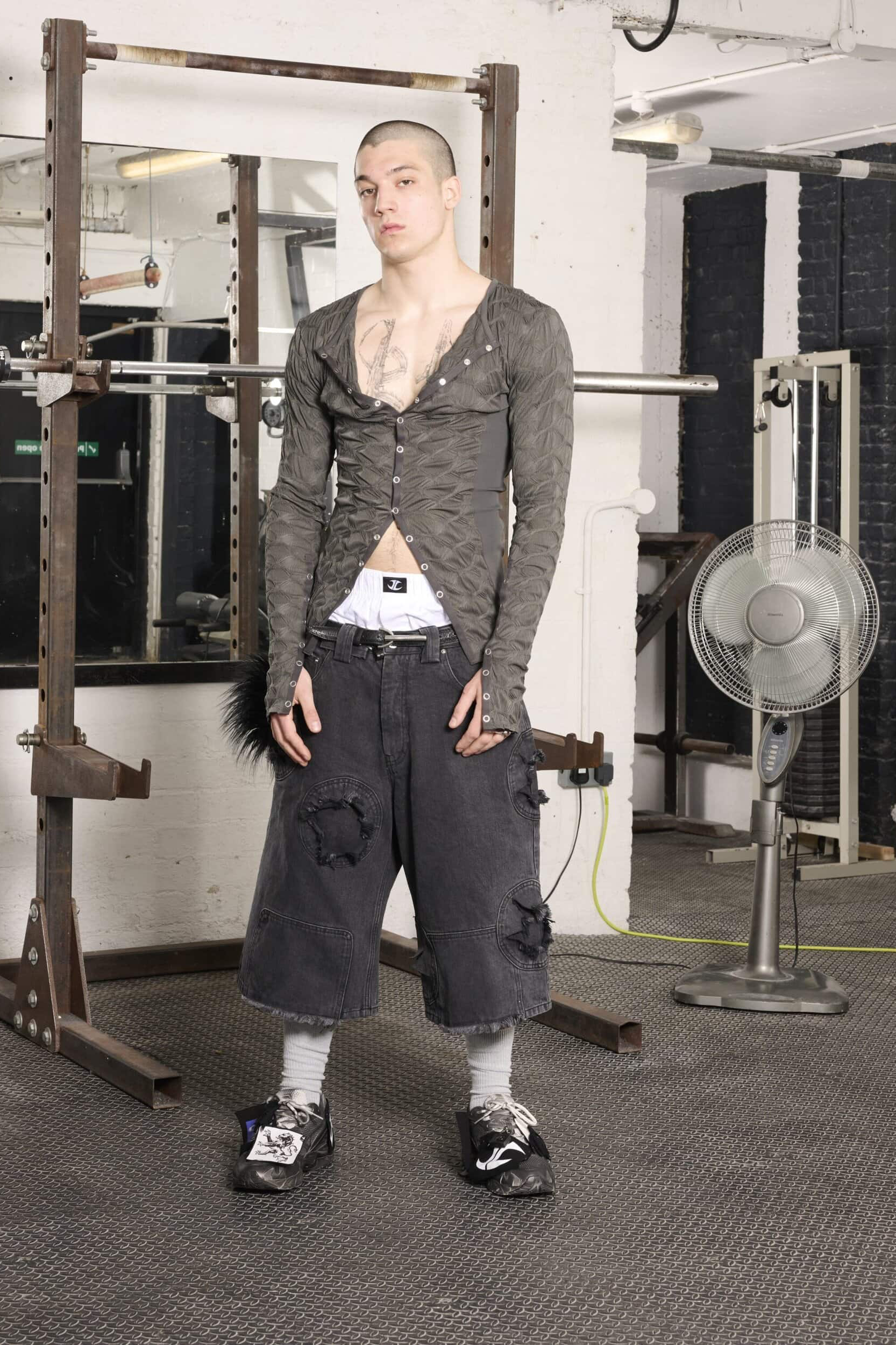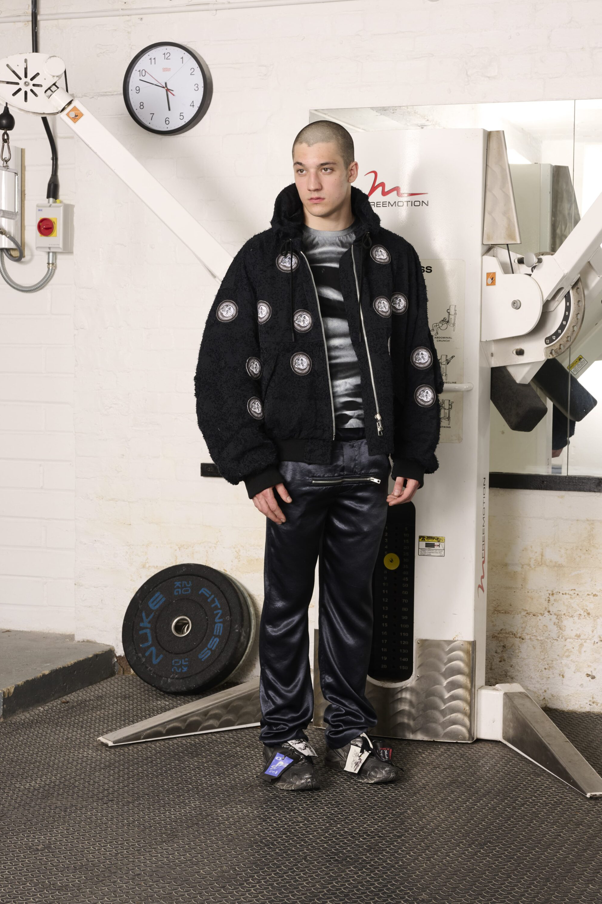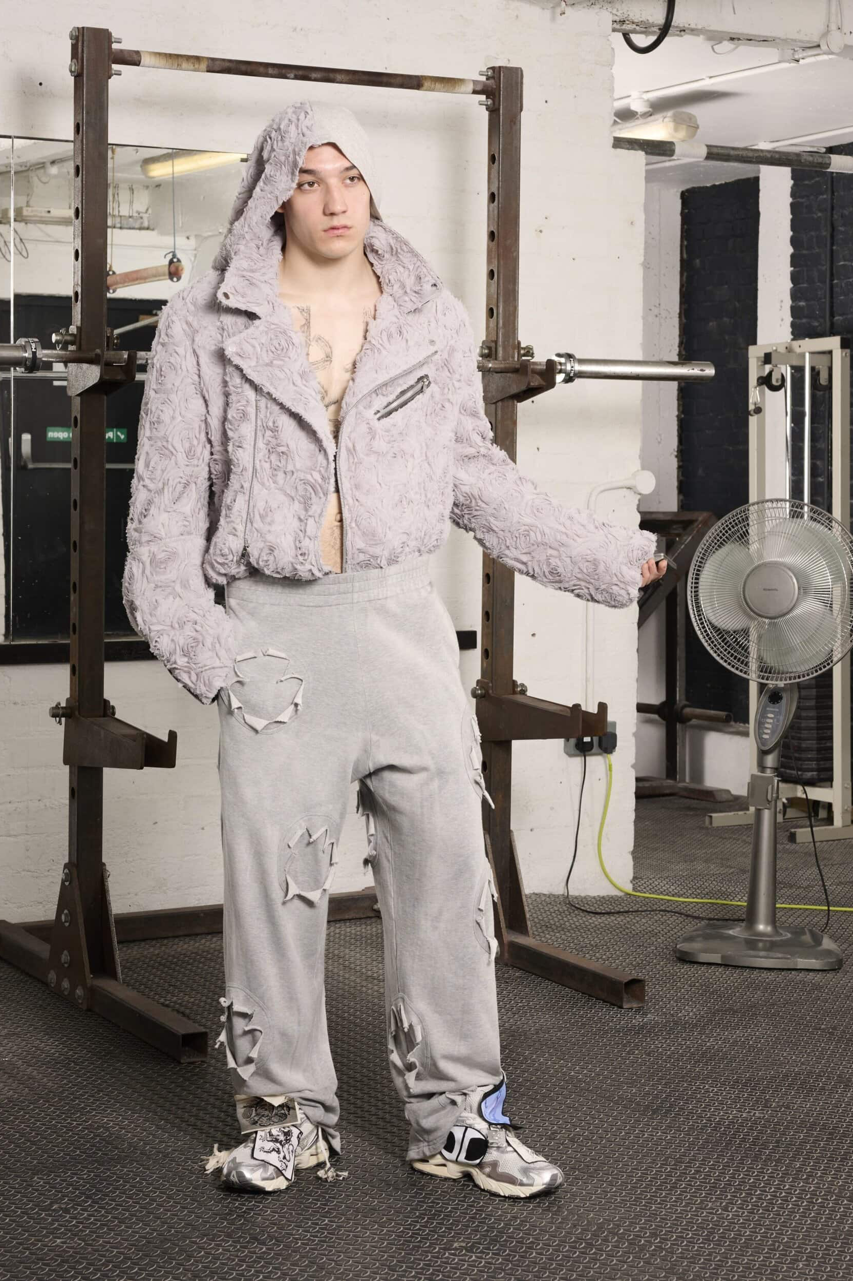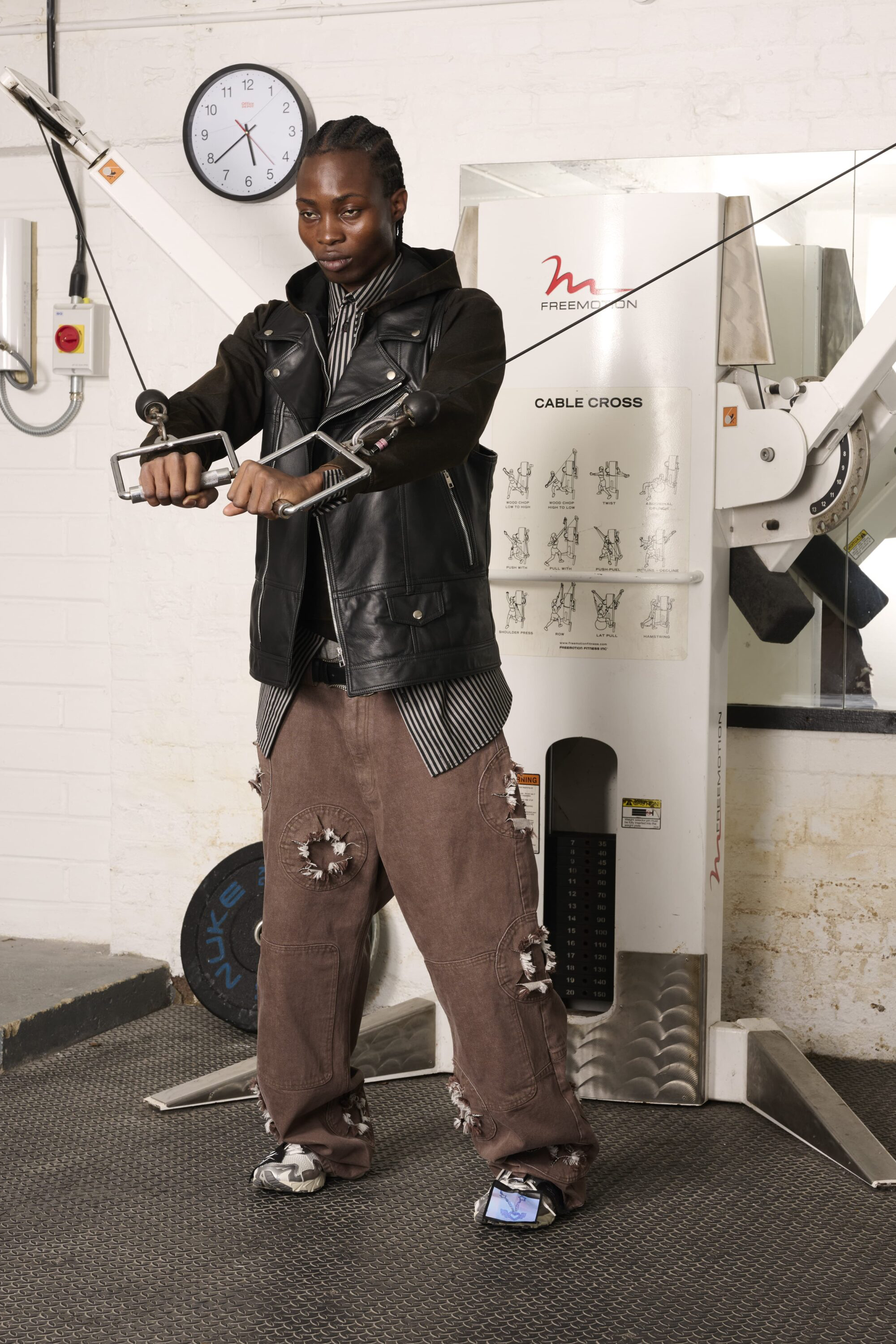 这一季探索了身体和精神上的韧性。品牌标志性单品以粗犷缎面、做旧皮革和提花针织面料重新演绎。做旧牛仔布提升了工装裤和夹克的质感,而重塑的风衣则与捆绑风格的扣环和腰带相得益彰。垂坠西装采用拼布设计,银色尖刺首饰为以质感和触感为基调的本季增添了张力。