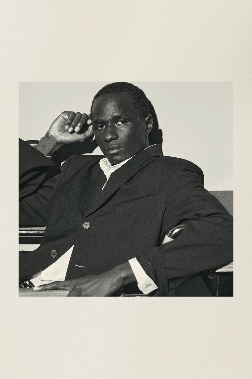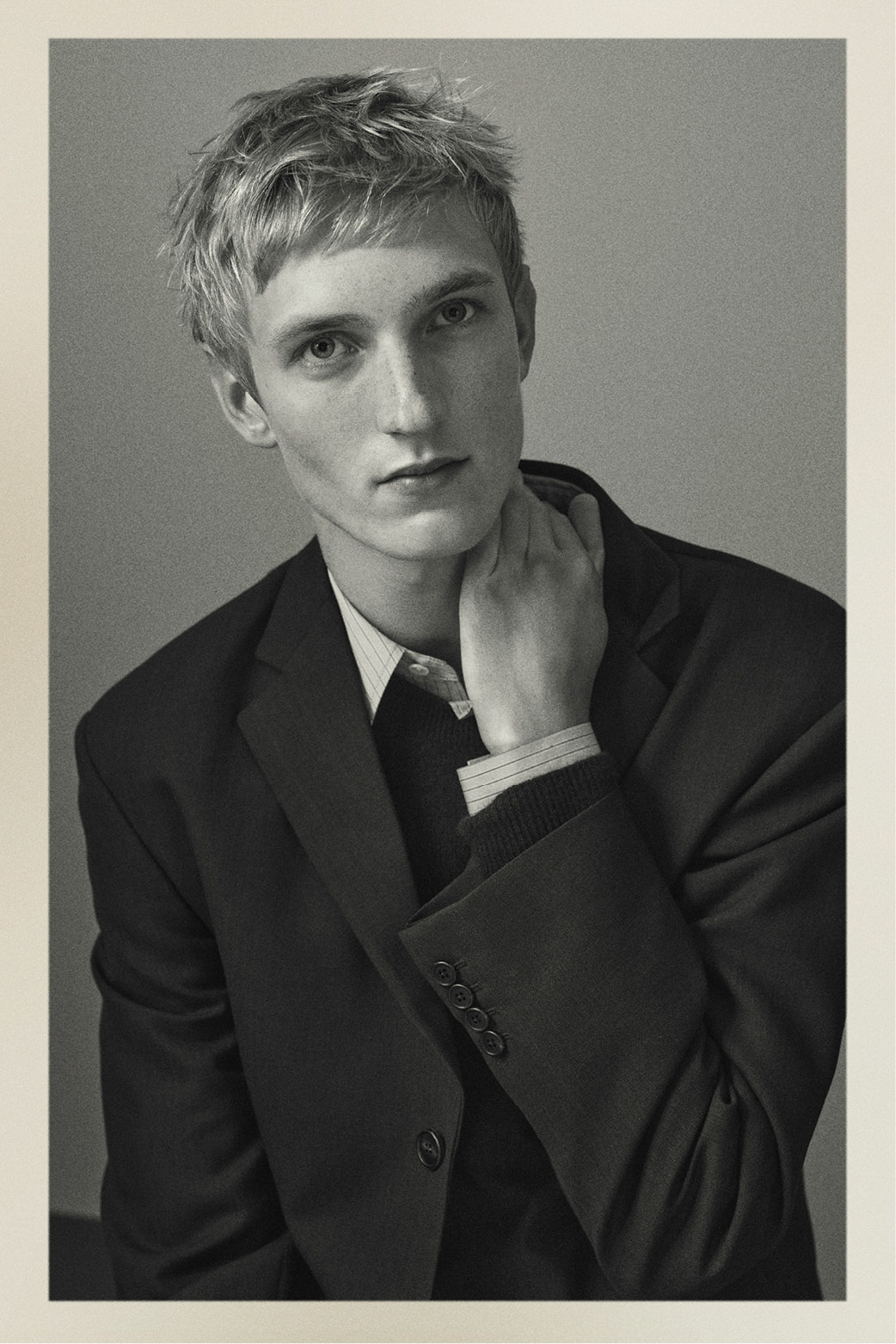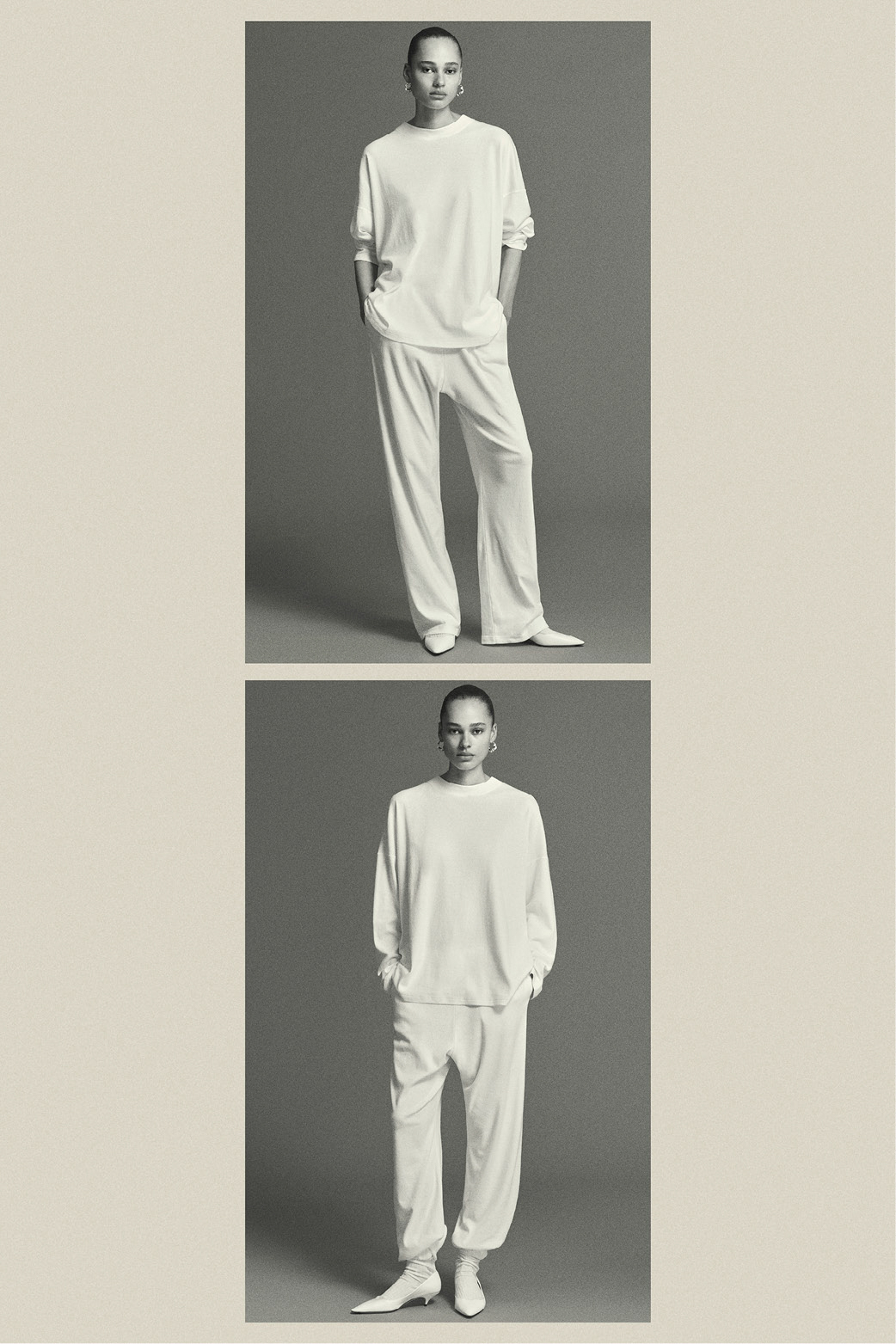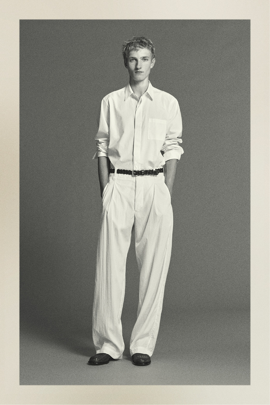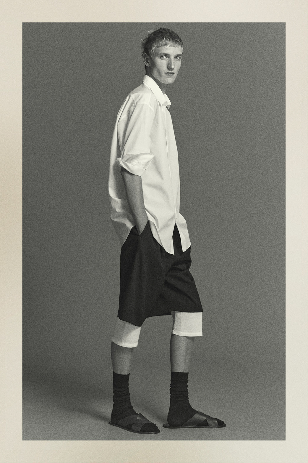本季,The Row 延续「居家即正装」的概念,将贴身衣物与室内着装转化为外穿层次。在以黑白为主调的 Lookbook 中,许多微妙色调被有意淡化,例如带有淡粉光泽的衬衫,或质地粗糙、有洗旧感的白色基础款棉衣。轻薄罗纹针织 T 恤、亚麻与真丝拼接的吊带裙、及膝短裤等单品,在宽松剪裁的西装外套下展现松弛而克制的现代轮廓。整体廓形较往季更为随性,注入运动感,同时在材质与工艺上维持一贯高水准。灰褐色真丝帆布西装精准利落,伞布真丝制成的裤装则以收褶细节突显轻盈与质感的平衡。