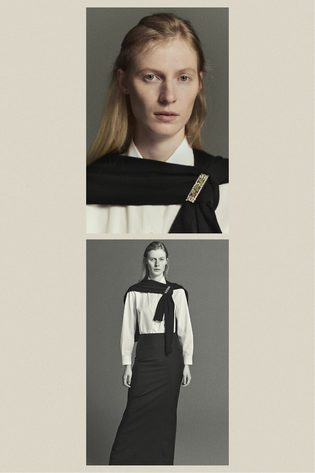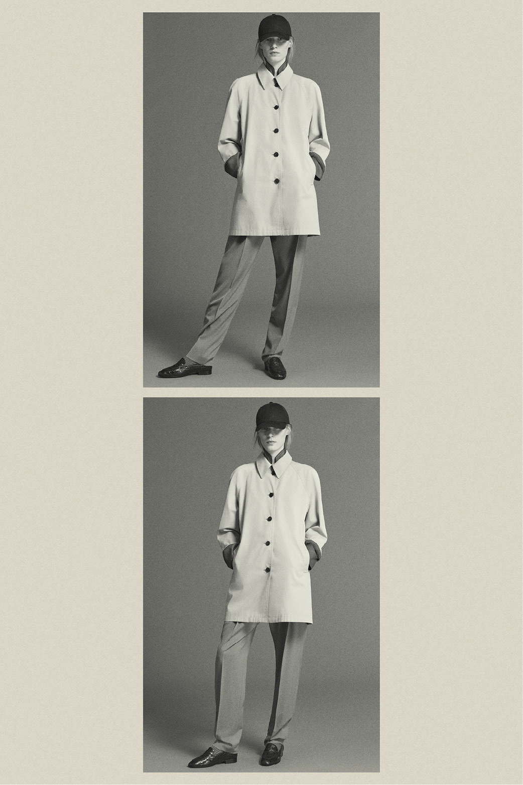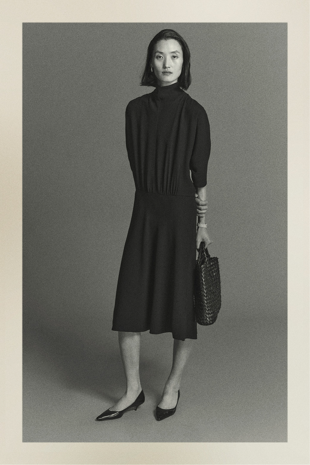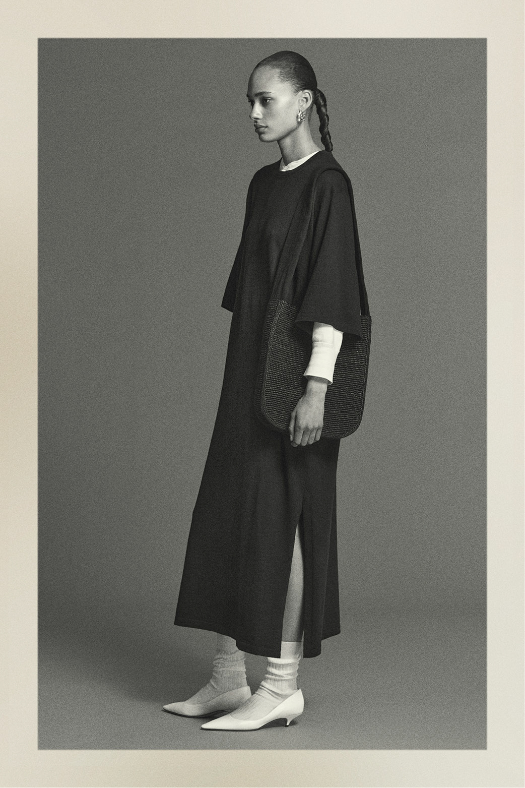 系列亦包含钩扣开衩铅笔裙、带夸张垂领的小黑裙、可拆衣领男装衬衫与超轻羊绒针织衫,日常与正式之间自然过渡。夜间选项则包括变色丝绒大衣、双层真丝吊带裙与绗缝长外套,强调触感与流动感。配饰方面延续低调奢华:极简纳帕皮包袋、缓震凉鞋与更多高跟鞋款,完成这一组既安静又充满张力的春季系列。