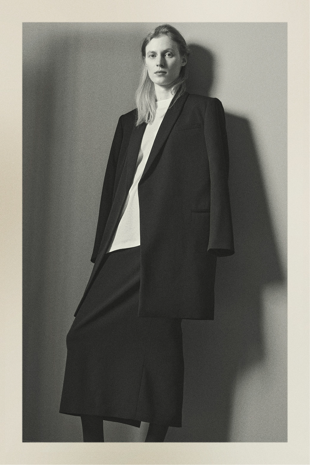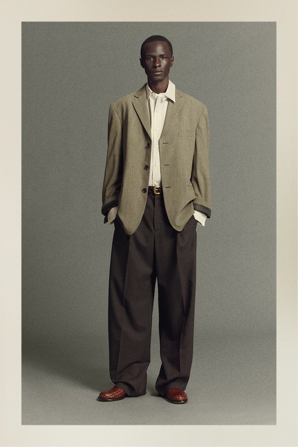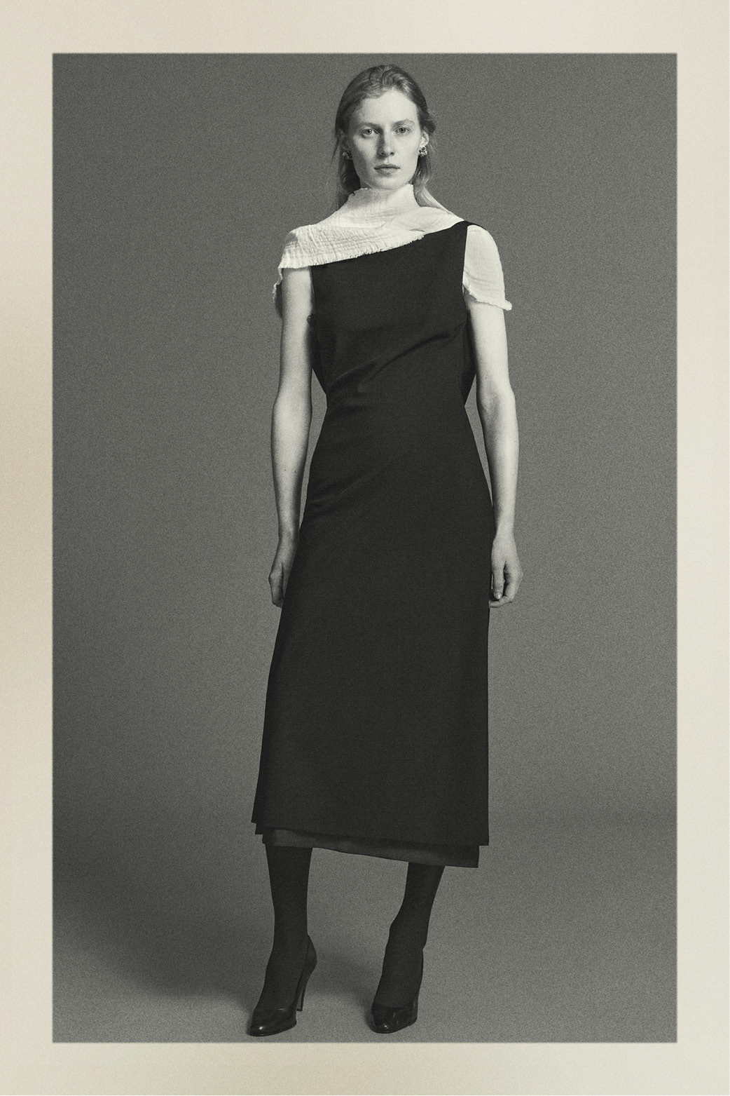 系列亦包含钩扣开衩铅笔裙、带夸张垂领的小黑裙、可拆衣领男装衬衫与超轻羊绒针织衫,日常与正式之间自然过渡。夜间选项则包括变色丝绒大衣、双层真丝吊带裙与绗缝长外套,强调触感与流动感。配饰方面延续低调奢华:极简纳帕皮包袋、缓震凉鞋与更多高跟鞋款,完成这一组既安静又充满张力的春季系列。