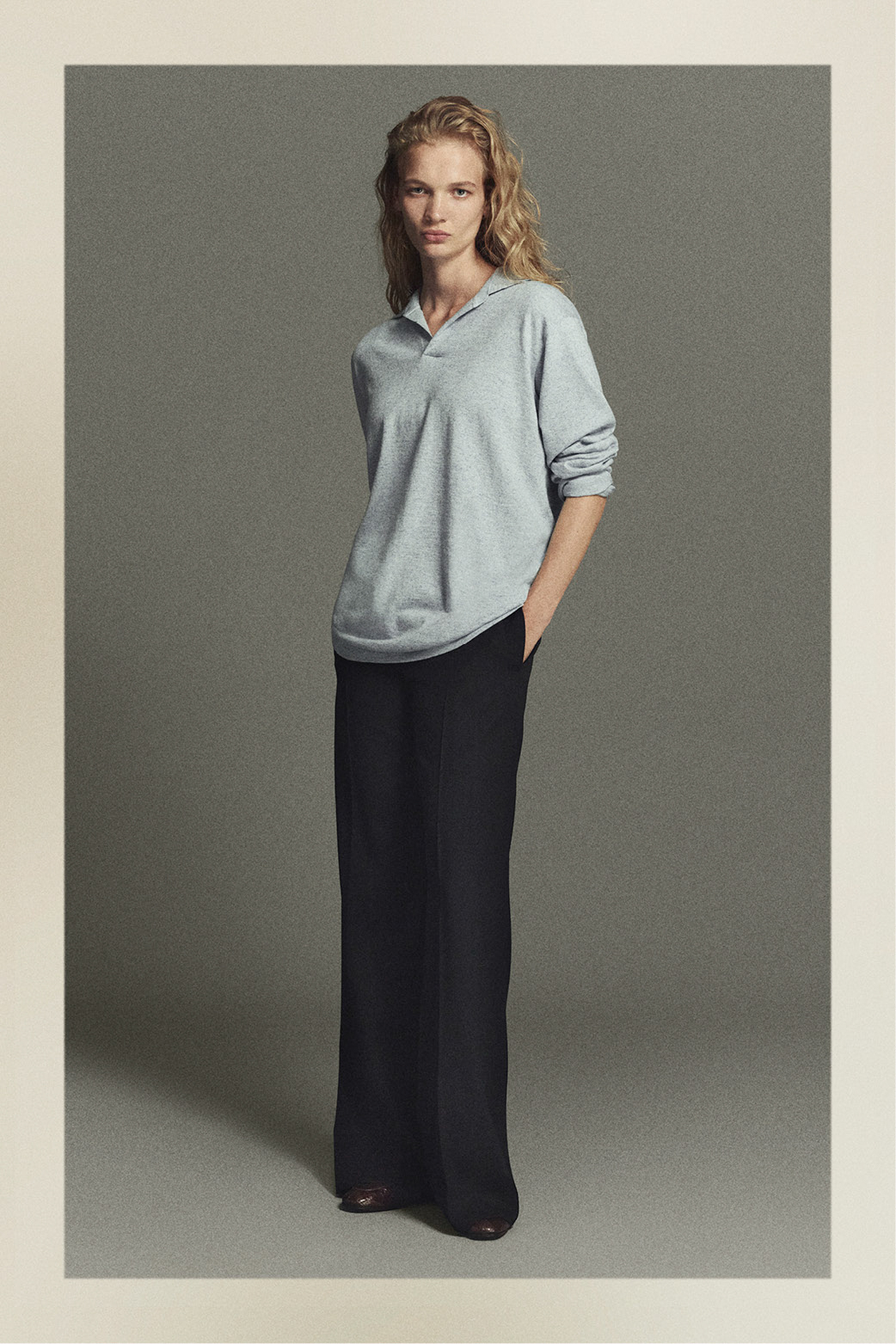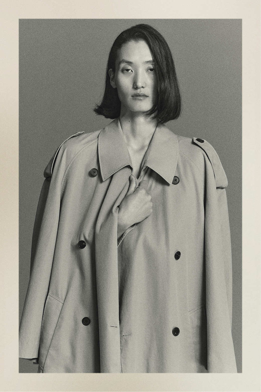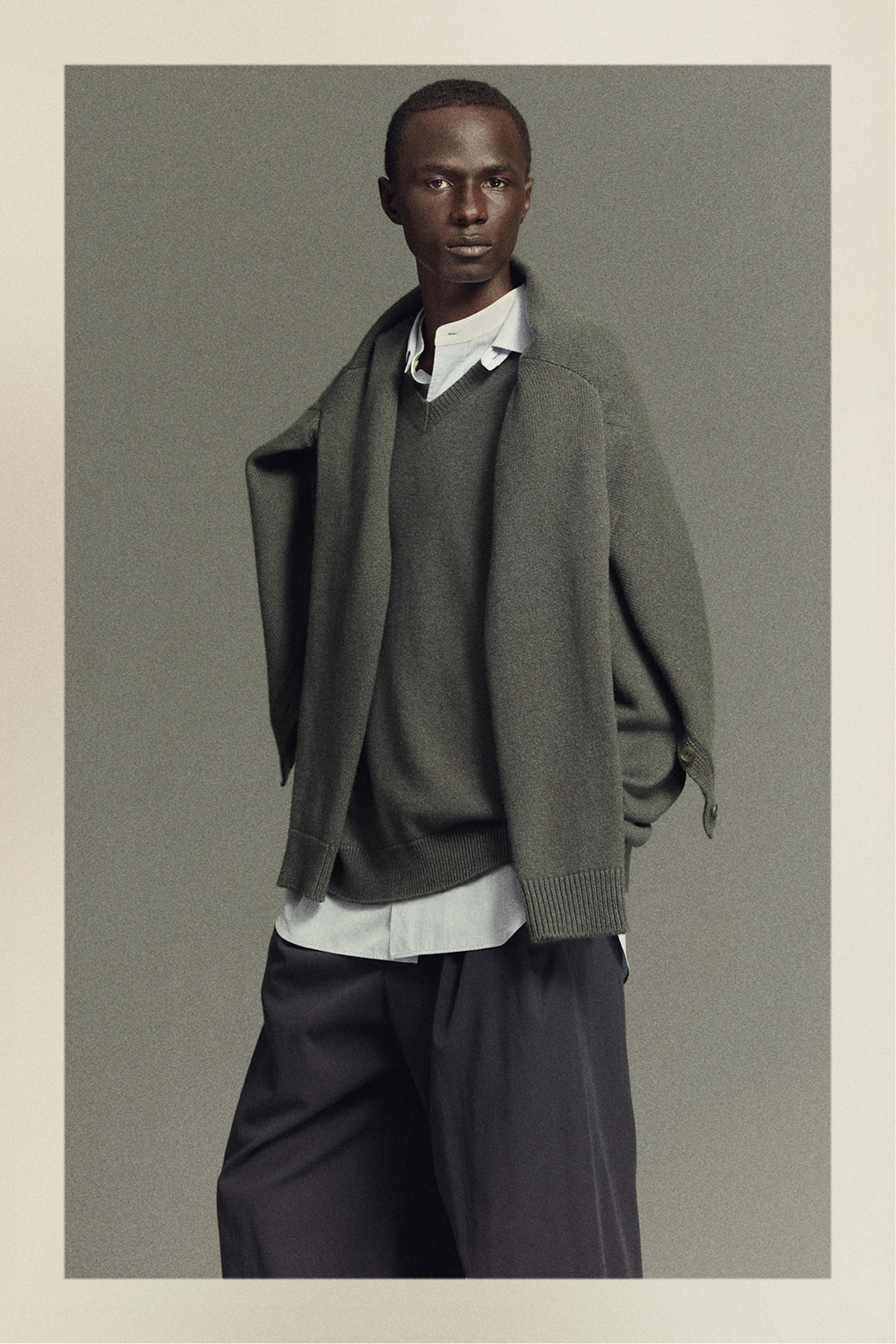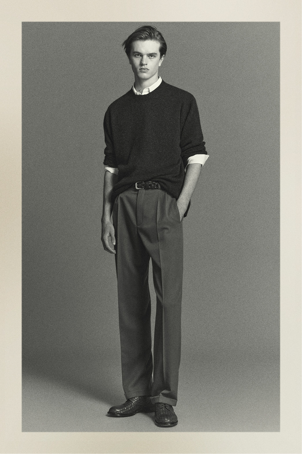 系列亦包含钩扣开衩铅笔裙、带夸张垂领的小黑裙、可拆衣领男装衬衫与超轻羊绒针织衫,日常与正式之间自然过渡。夜间选项则包括变色丝绒大衣、双层真丝吊带裙与绗缝长外套,强调触感与流动感。配饰方面延续低调奢华:极简纳帕皮包袋、缓震凉鞋与更多高跟鞋款,完成这一组既安静又充满张力的春季系列。