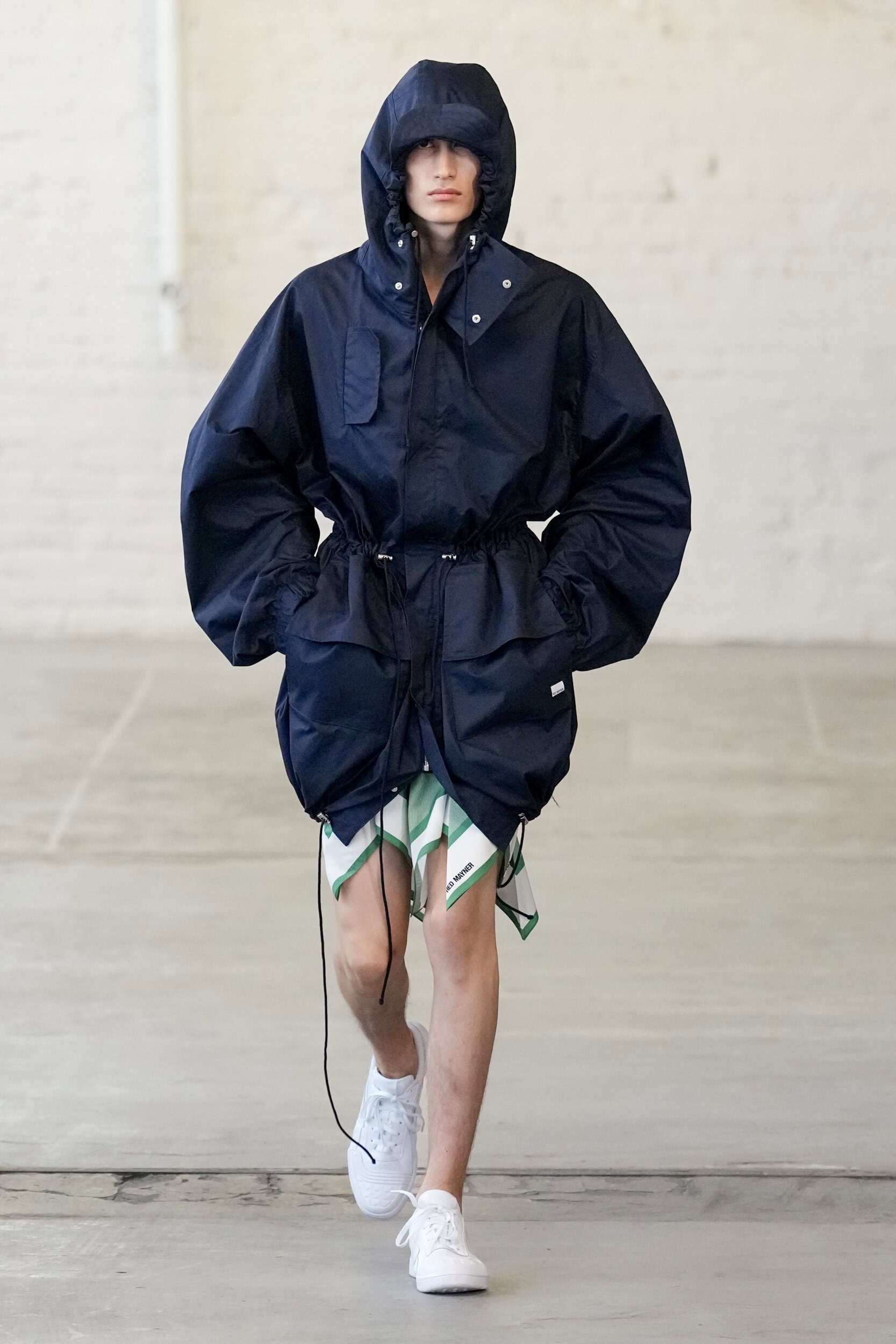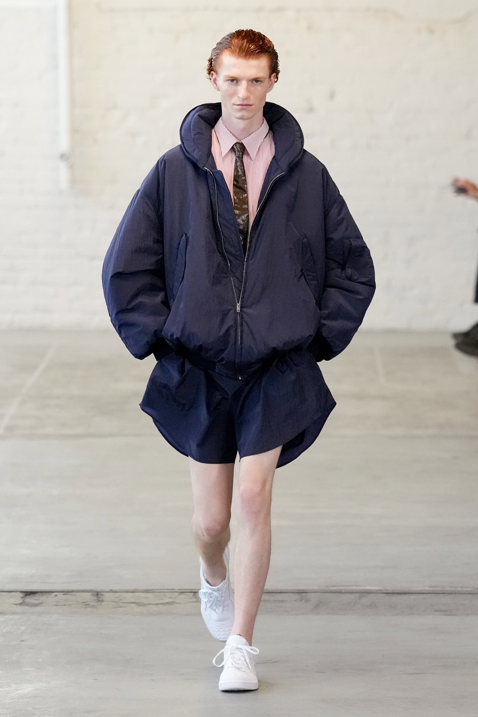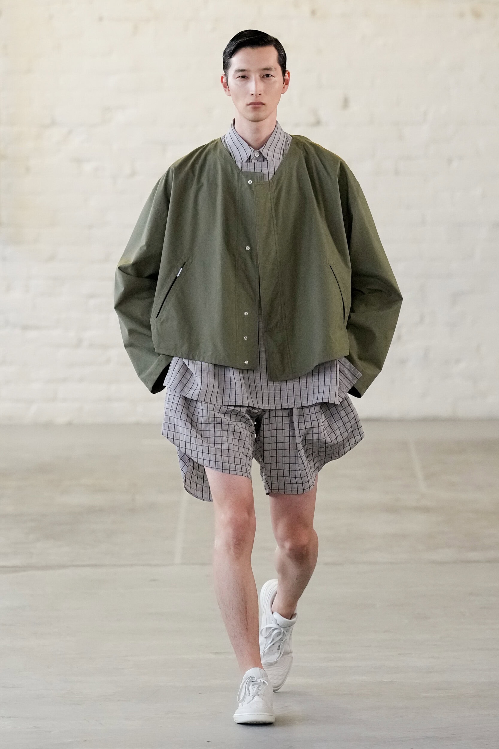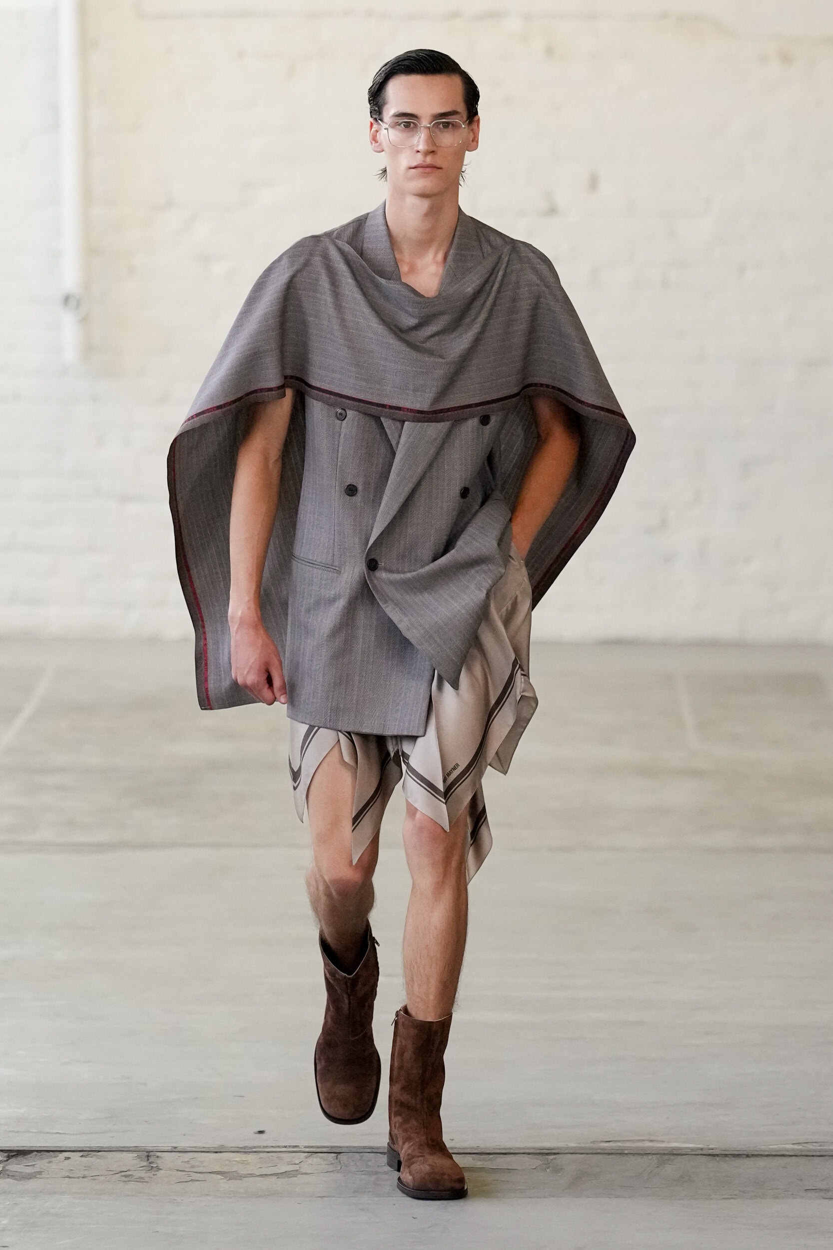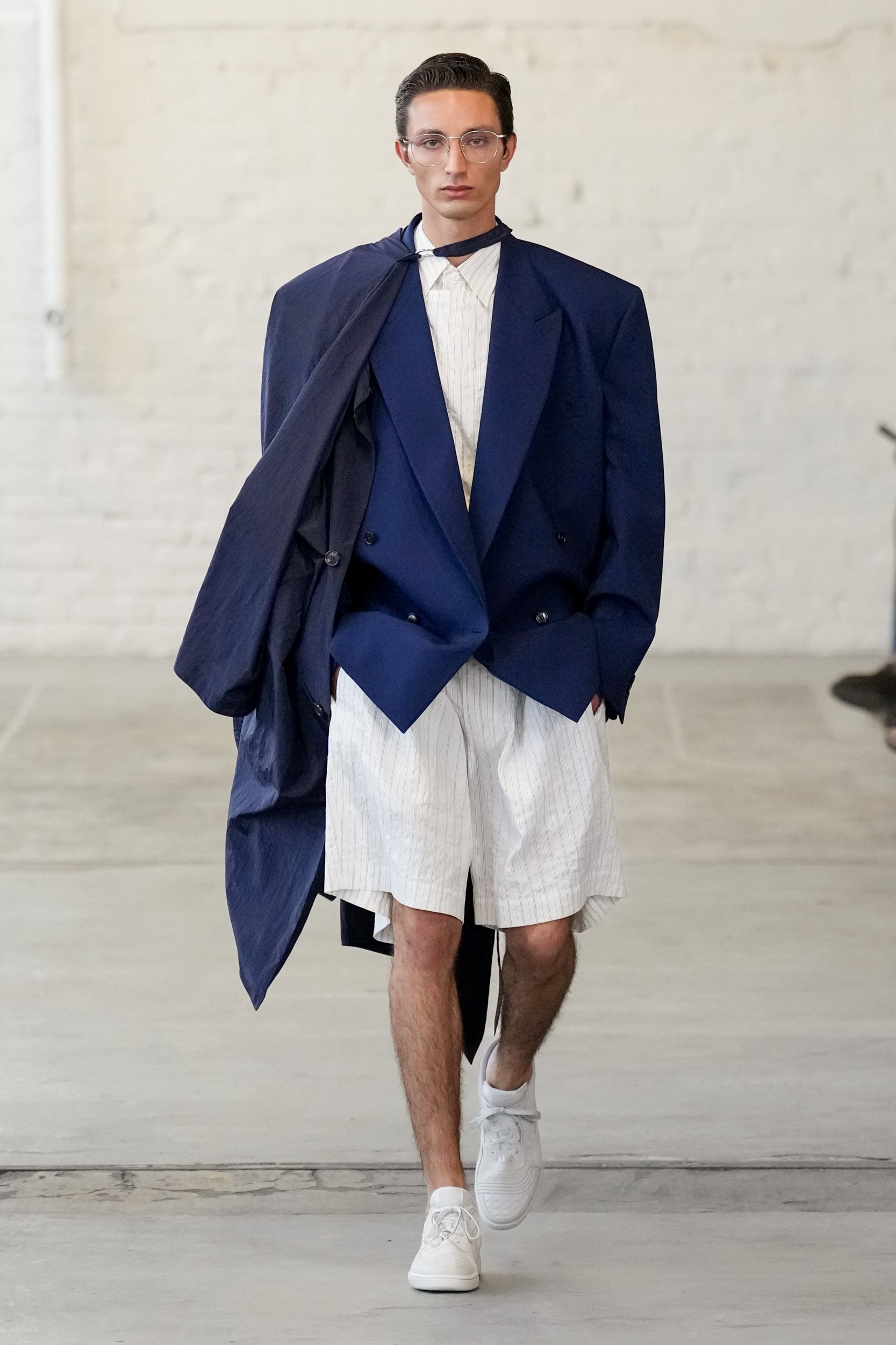 设计师称此次系列是对「反结构」的探索,他尝试将衣物「掏空」,使其呈现出壳状轮廓,既轻盈松软又不失分量。无论是大衣、夹克,还是斗篷式剪裁的单层外套与宽大的短裤开口,都展现出极高的技术完成度与细腻的构型意识。特别是如手帕边般飘逸的裤装,在行走中轻盈摆动,为系列增添流动的节奏。