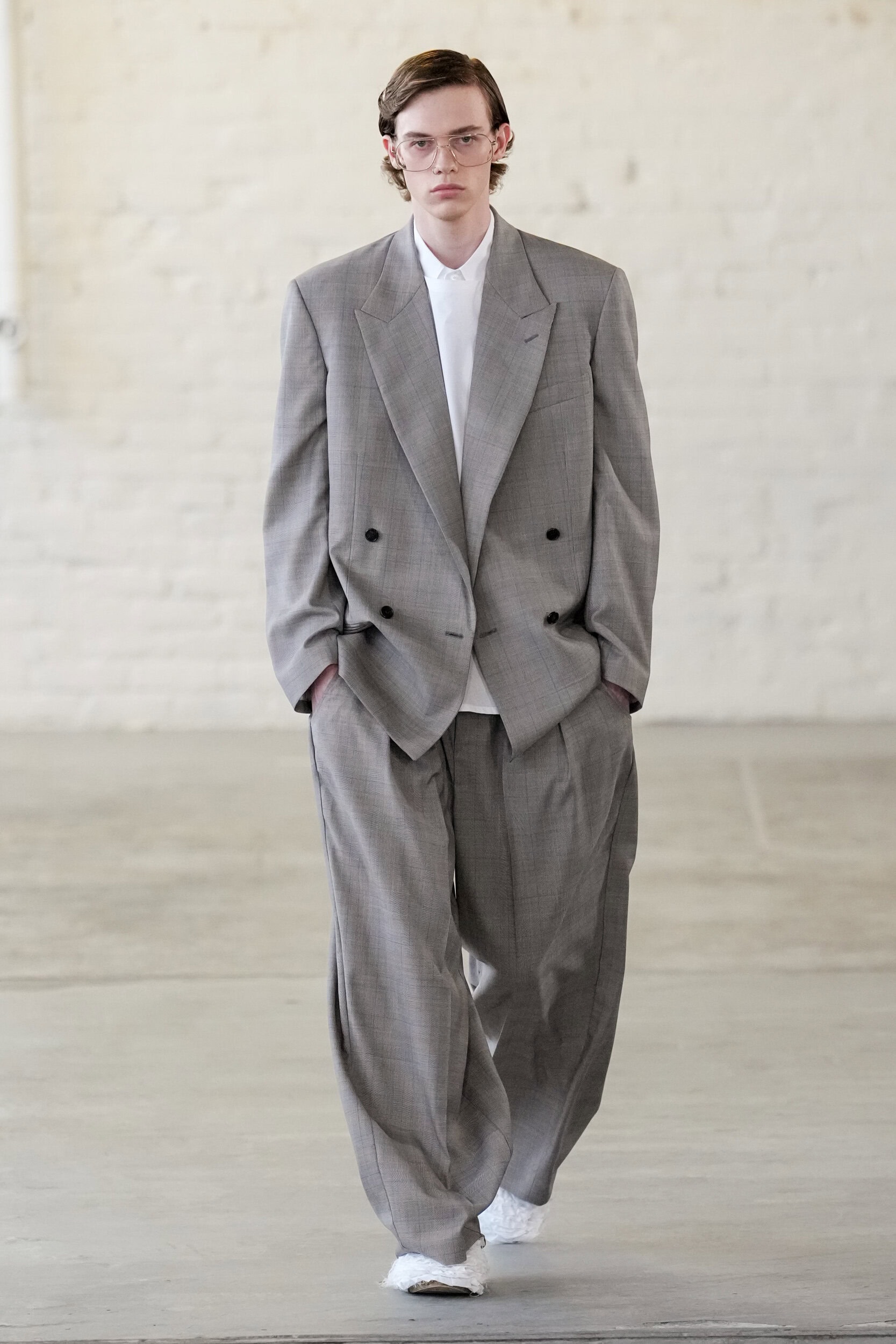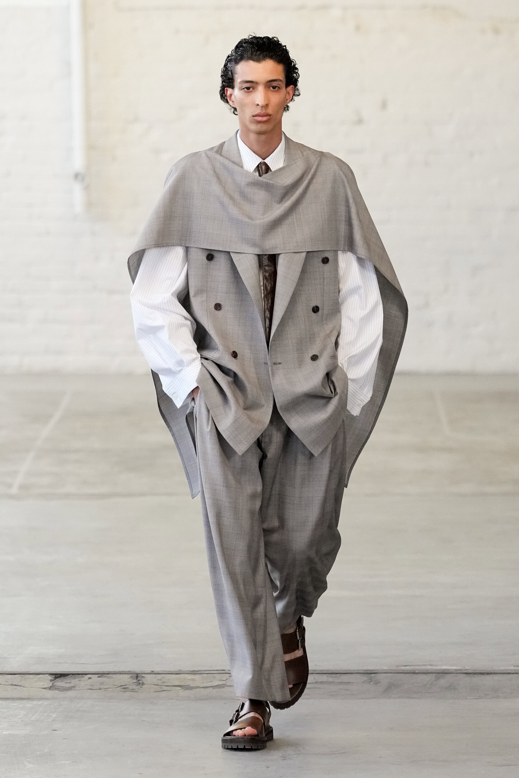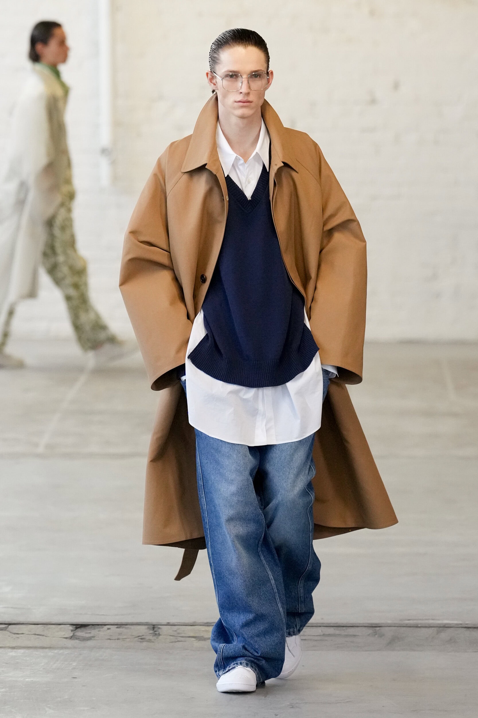 Hed Mayner 于本季展现出对「轻盈感」的全新追求。相较过往标志性的宽大肩线与结构性轮廓,2026 春夏系列在剪裁上明显向身体靠近,轻质羊毛、透薄棉料与针织材质被悬垂于肩部与腰线,随行走鼓起空气,带来柔和的浮动感。