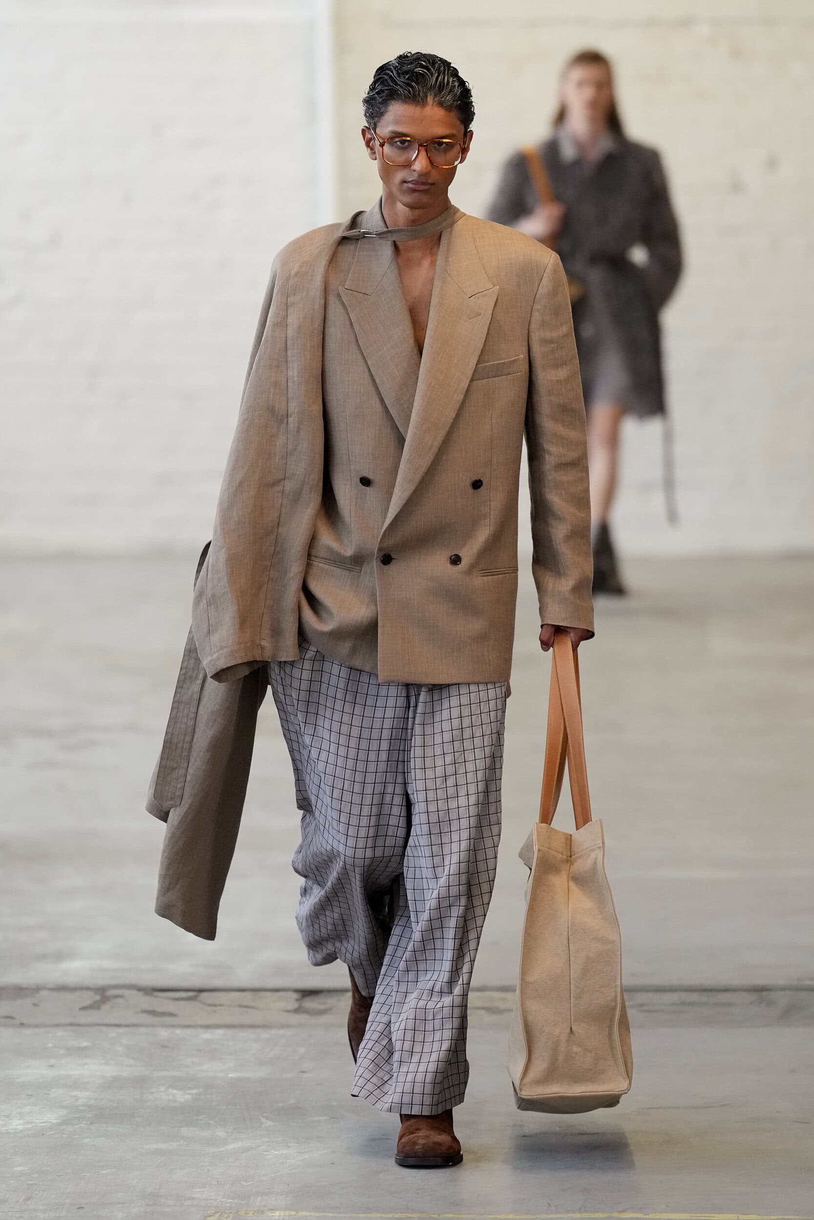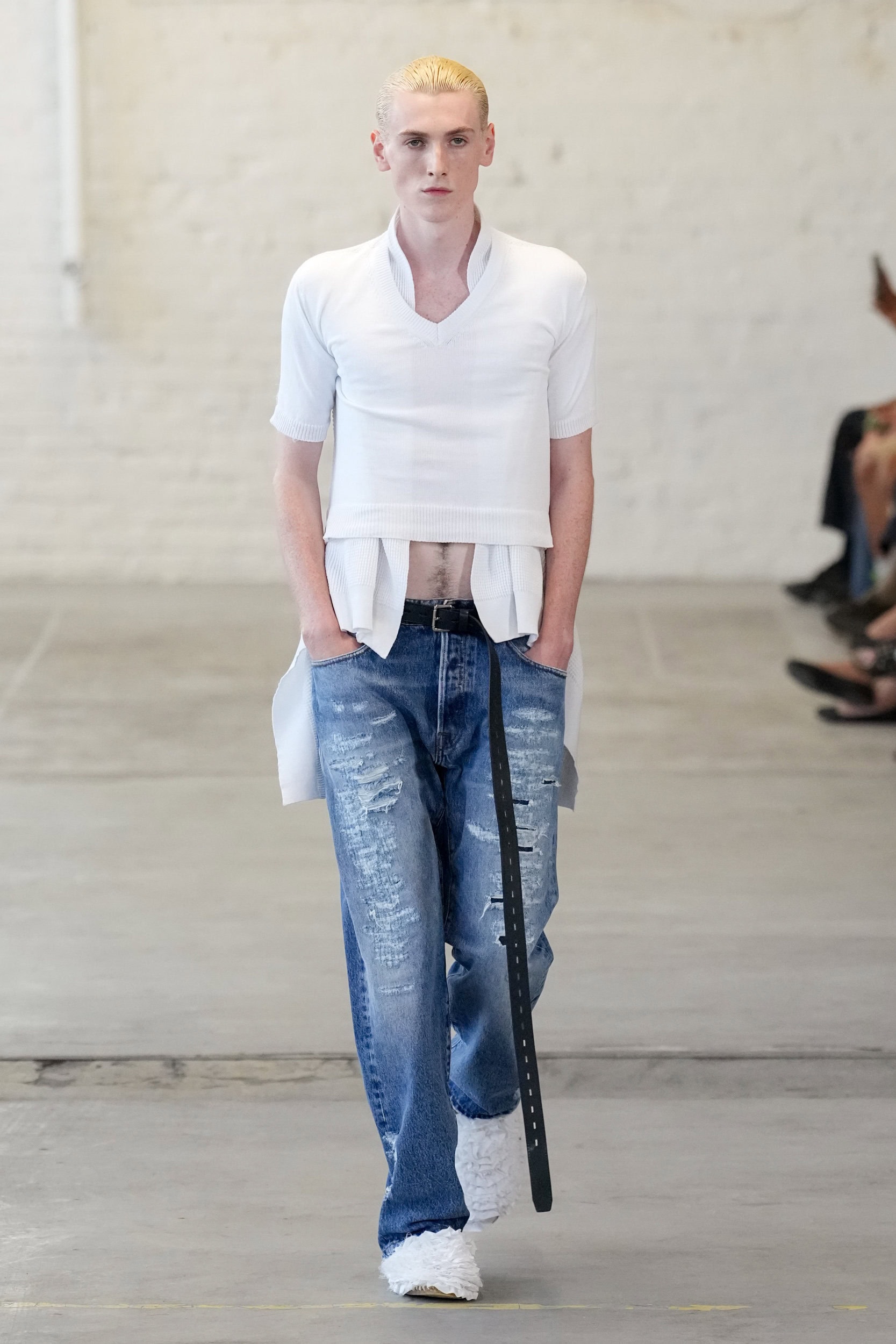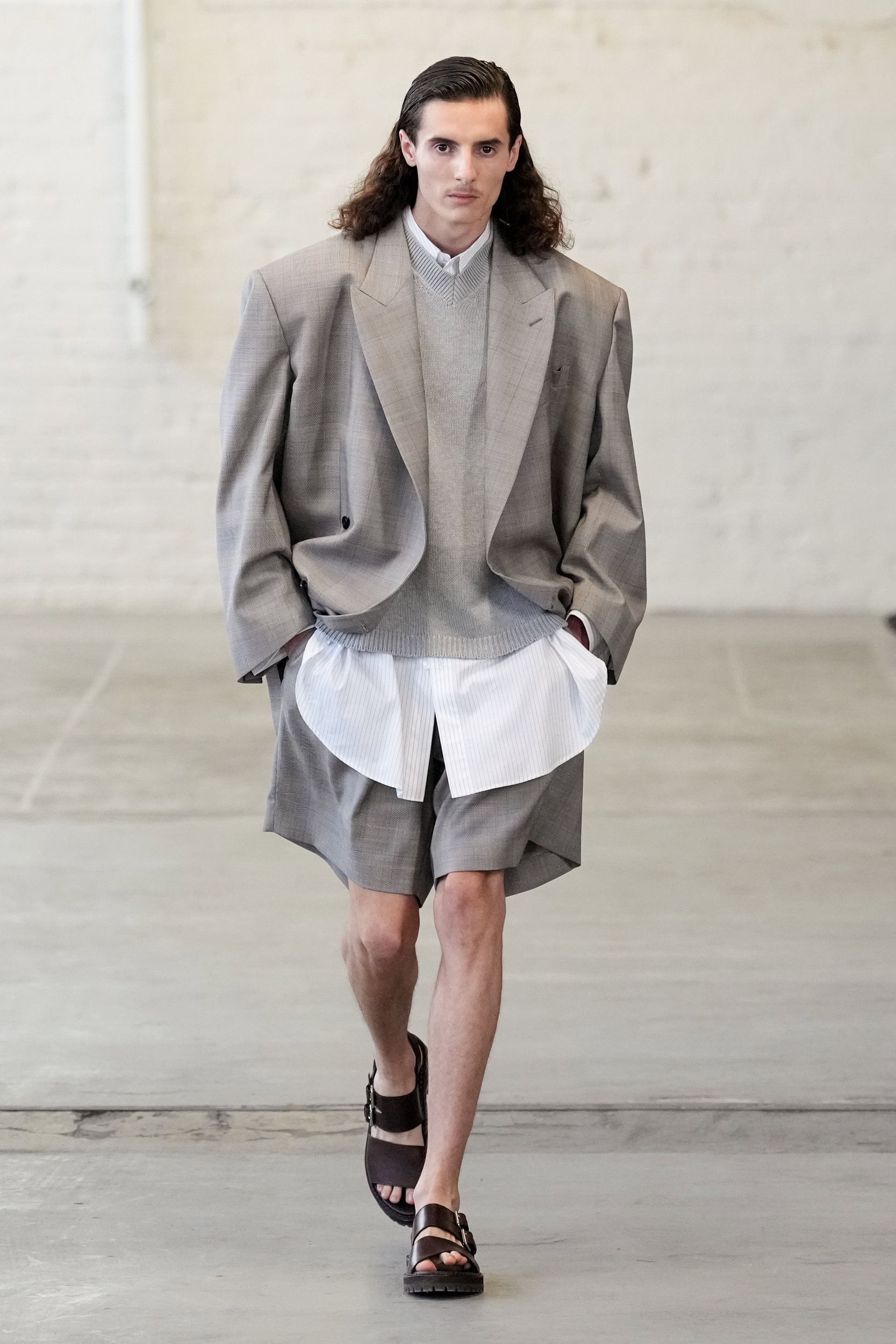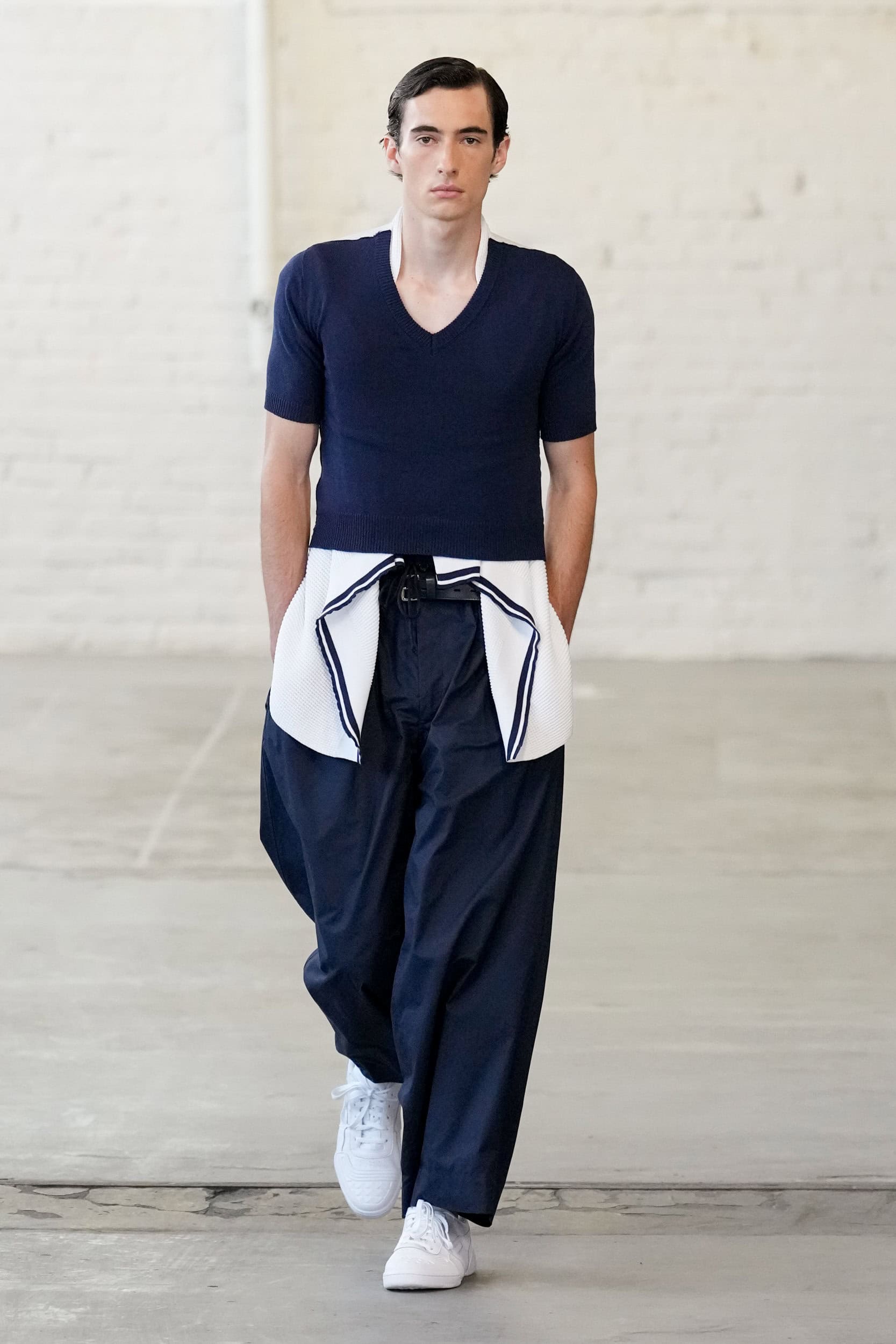 Hed Mayner 于本季展现出对「轻盈感」的全新追求。相较过往标志性的宽大肩线与结构性轮廓,2026 春夏系列在剪裁上明显向身体靠近,轻质羊毛、透薄棉料与针织材质被悬垂于肩部与腰线,随行走鼓起空气,带来柔和的浮动感。
