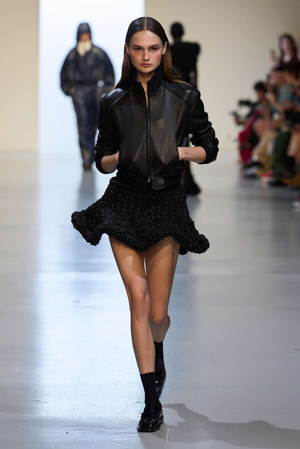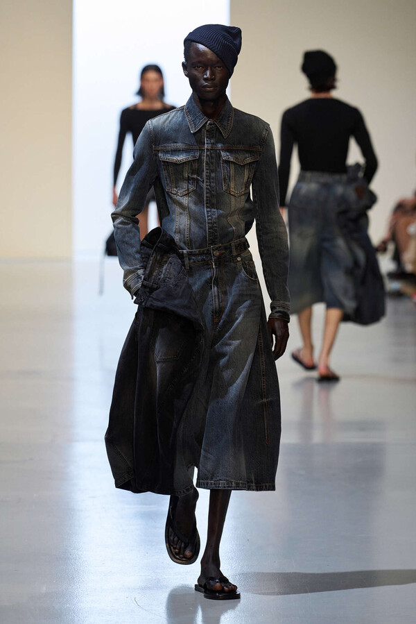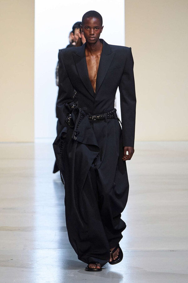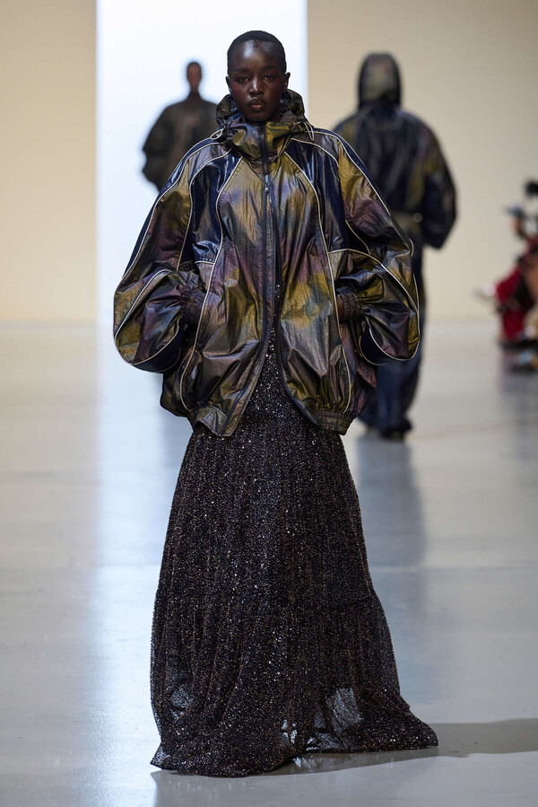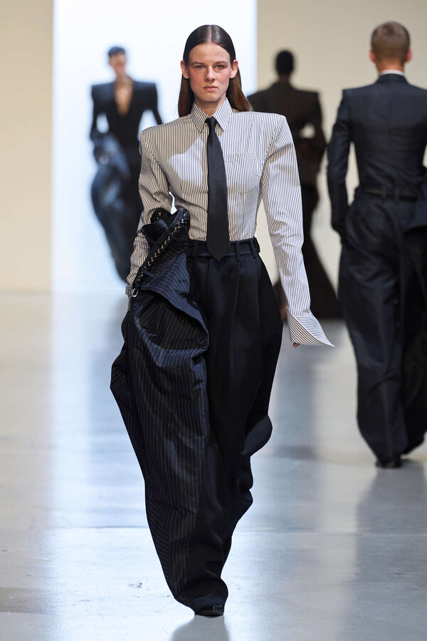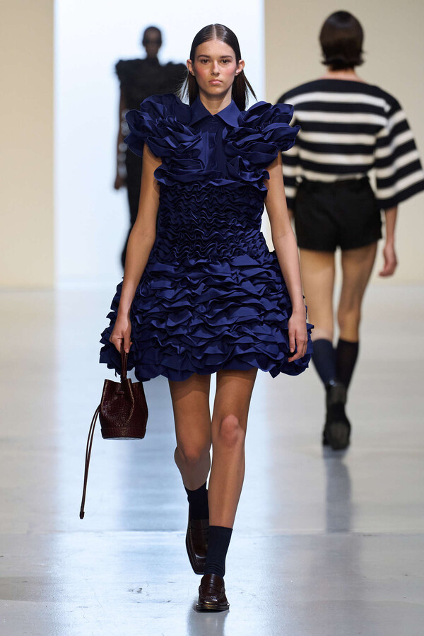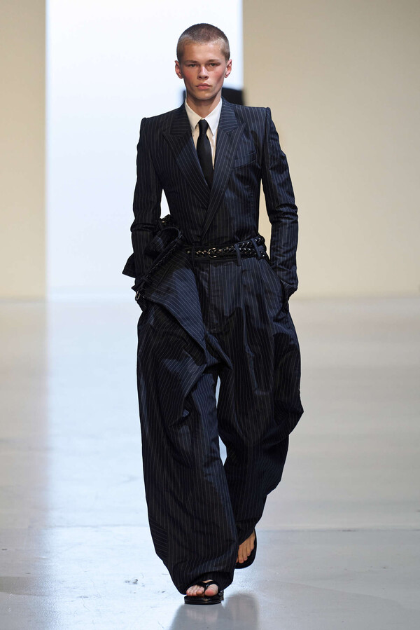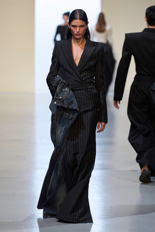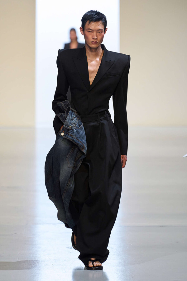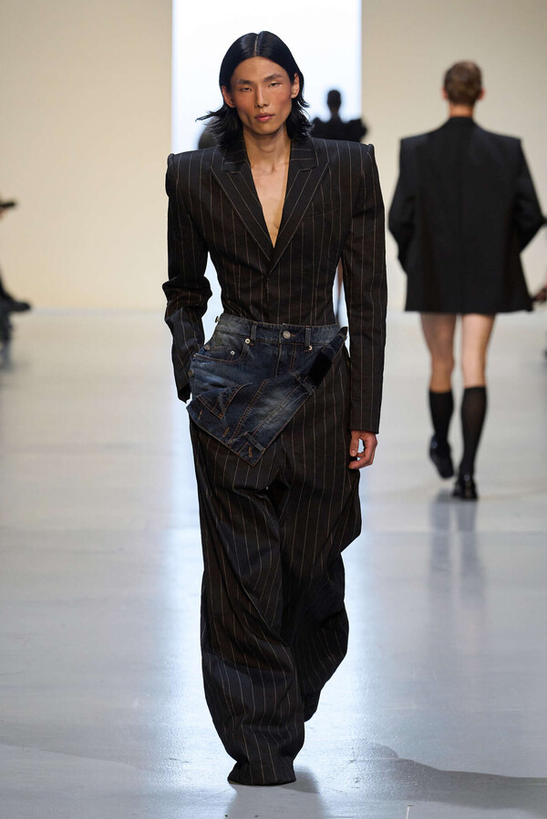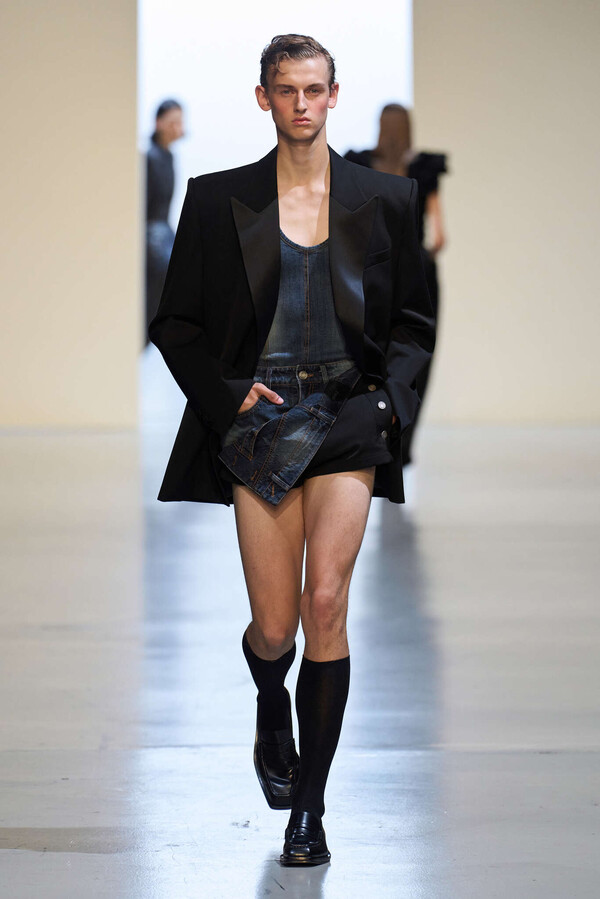 Juun.J 2026 春夏系列的灵感来自于年轻人玩转从长辈衣柜里找到的服装。创意总监 Jung Wook-jun 说:「我发现他们在首次打扮自己时犯的错很有趣」 ,例如把姐姐的派对连衣裙和运动夹克相搭配,亦或试穿爸爸的西装和领带。这激发了他重新定义 X 形轮廓——上半身商务、下半身派对。其清晰的肩线正好符合设计师认为的即将到来的大趋势。