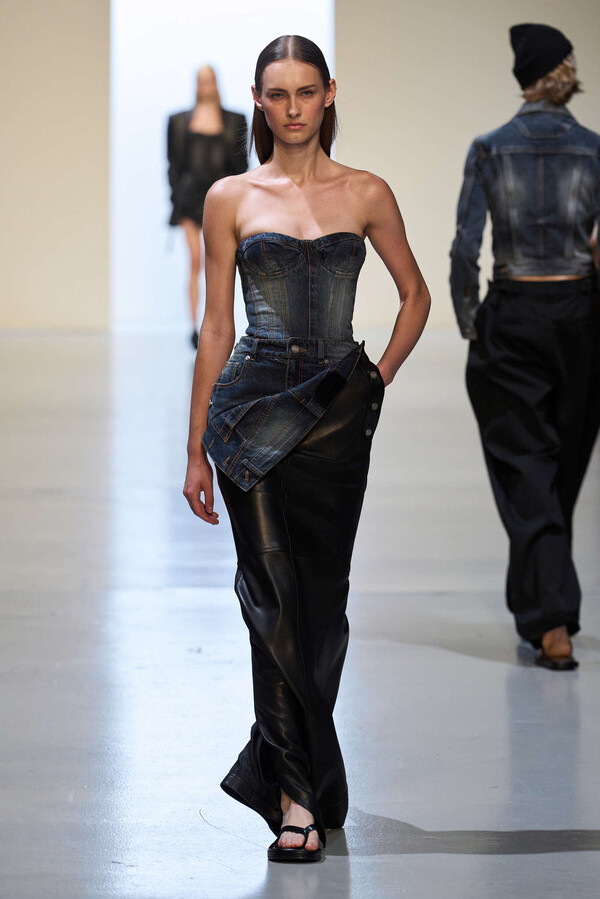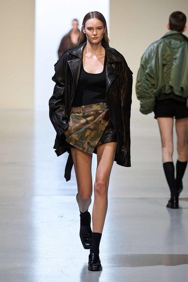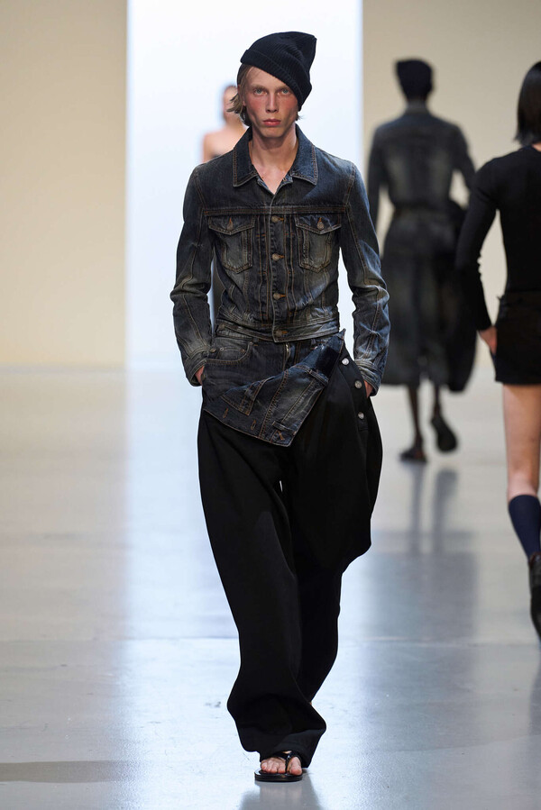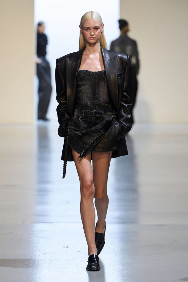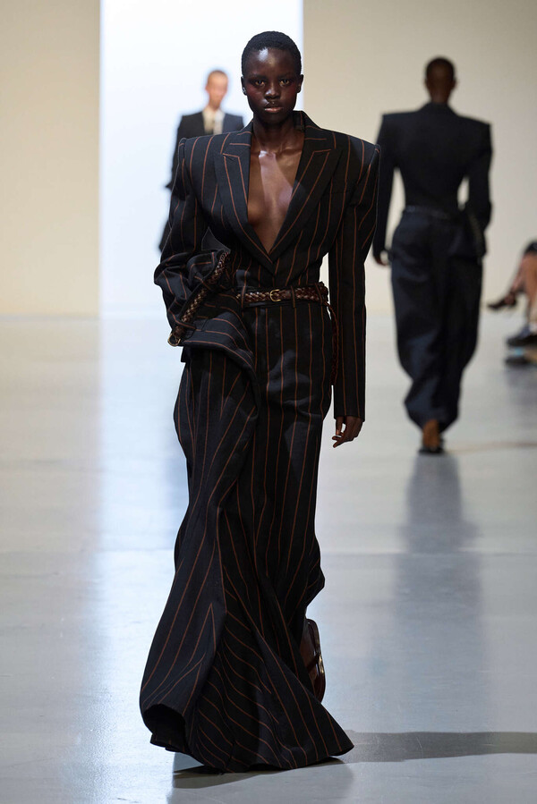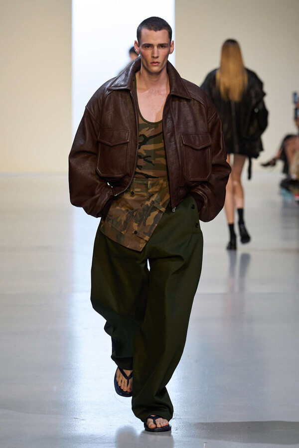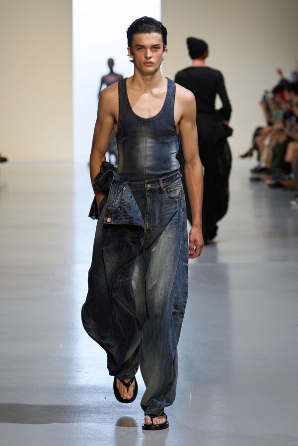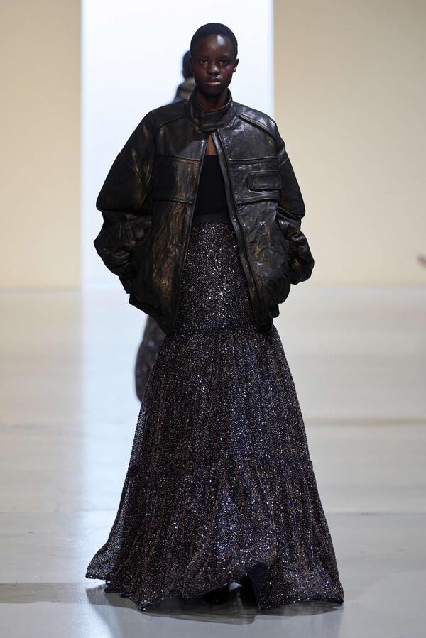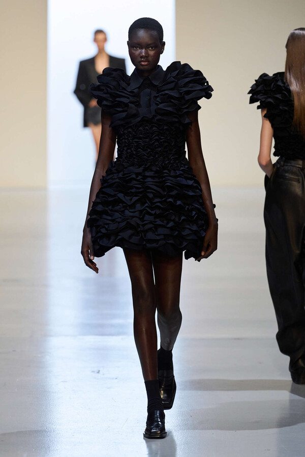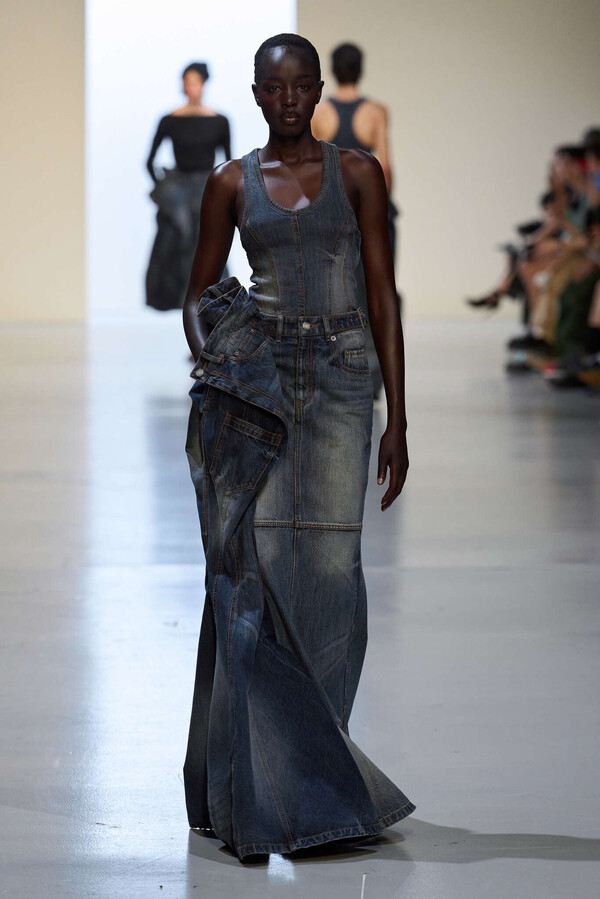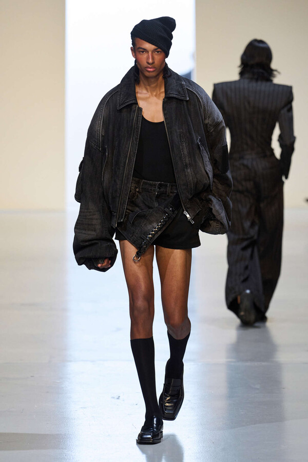 Juun.J 2026 春夏系列的灵感来自于年轻人玩转从长辈衣柜里找到的服装。创意总监 Jung Wook-jun 说:「我发现他们在首次打扮自己时犯的错很有趣」 ,例如把姐姐的派对连衣裙和运动夹克相搭配,亦或试穿爸爸的西装和领带。这激发了他重新定义 X 形轮廓——上半身商务、下半身派对。其清晰的肩线正好符合设计师认为的即将到来的大趋势。
