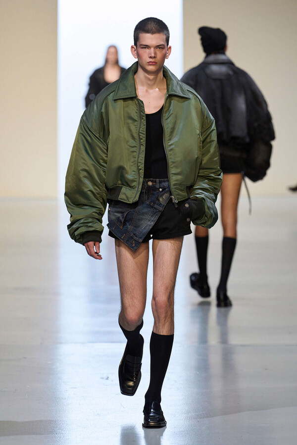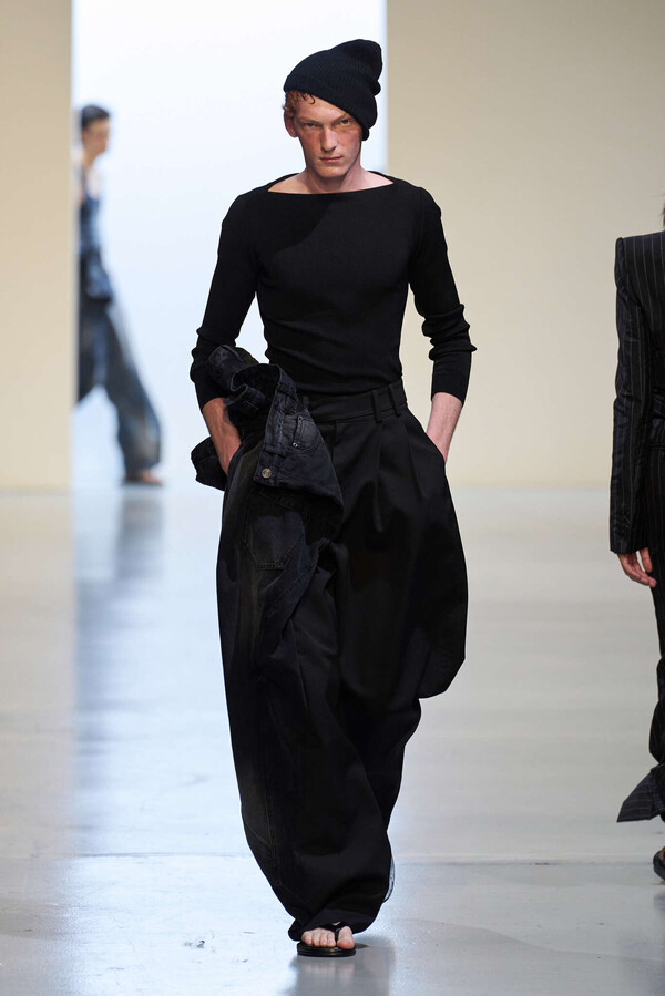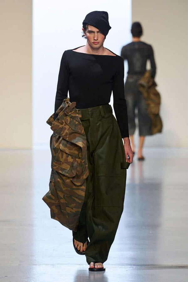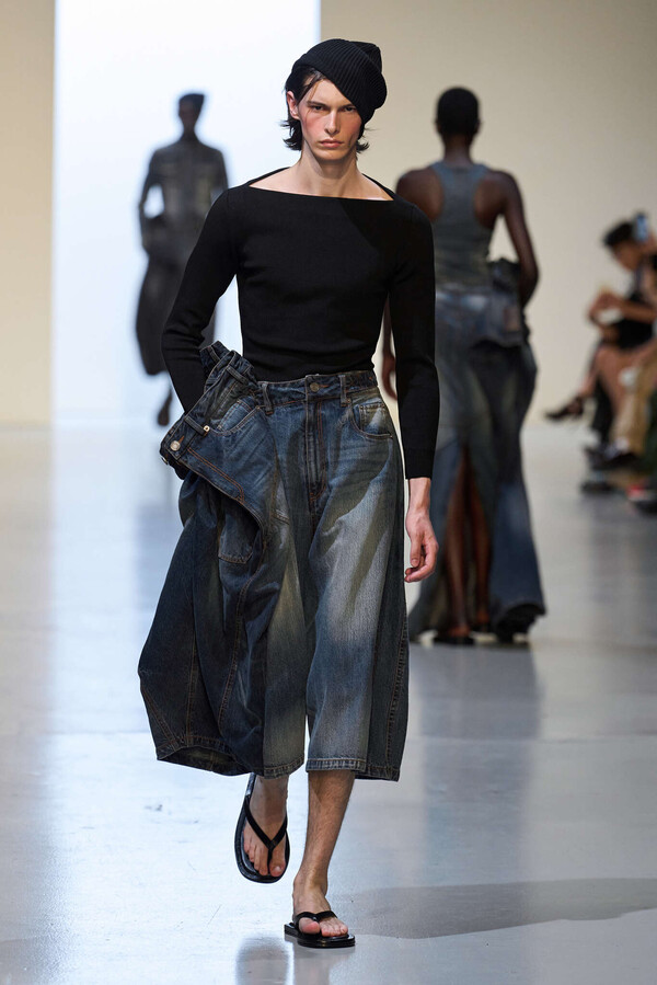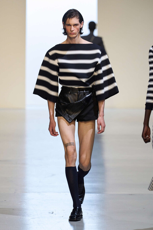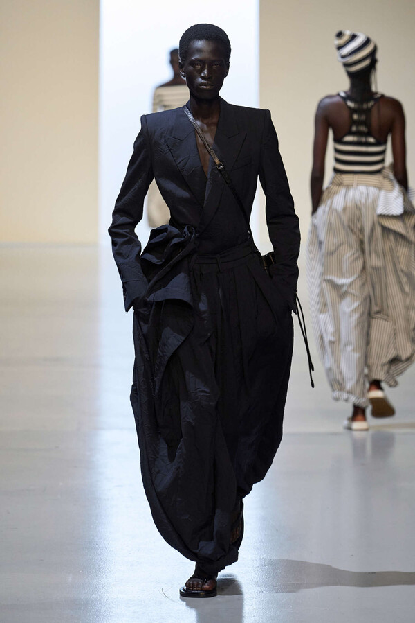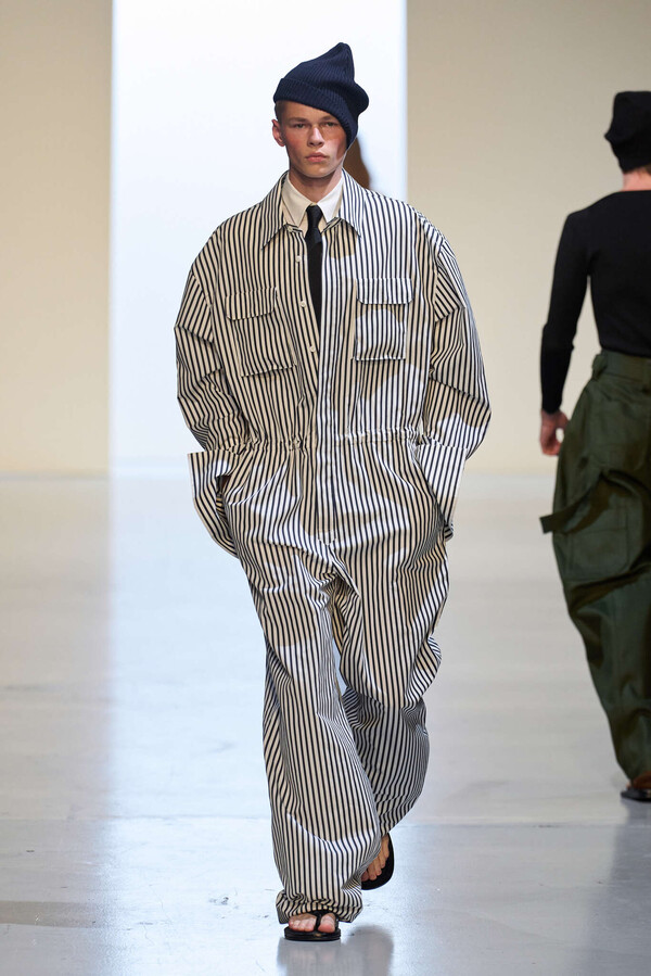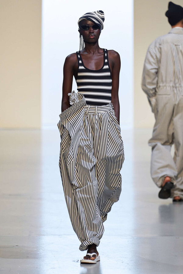 本季的另一大亮点是 Jung Wook-jun 对灯笼裤的演绎,它为身材娇小的人解决了过大的衣服穿不下的问题。他设计的「折叠半裤」将多余的布料(有些采用了对比鲜明的材质)变成了美观的雕塑感褶皱。无论是夏季轻薄西装、轻微褶皱的尼龙还是让人想到工装裤的条纹棉帆布,由这些流畅面料剪裁而成的版本尤为抢眼。