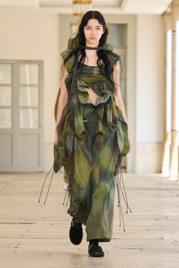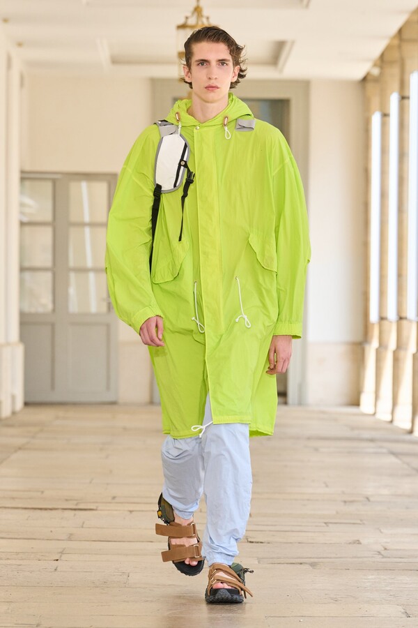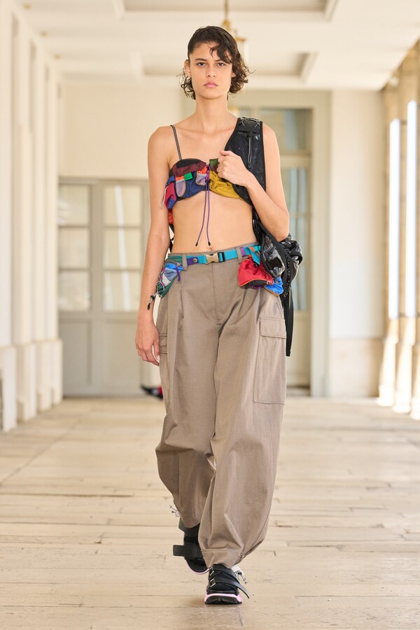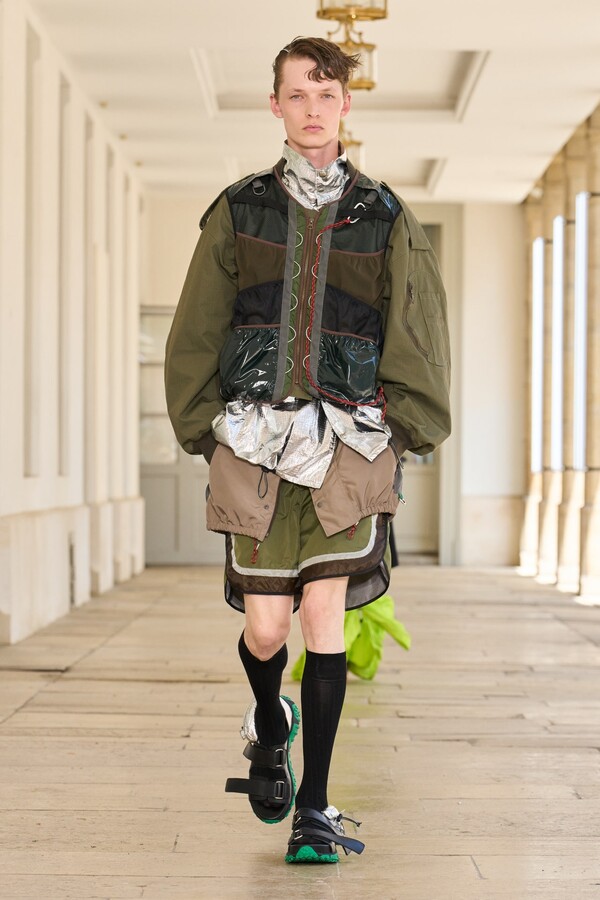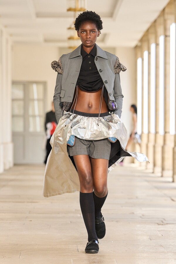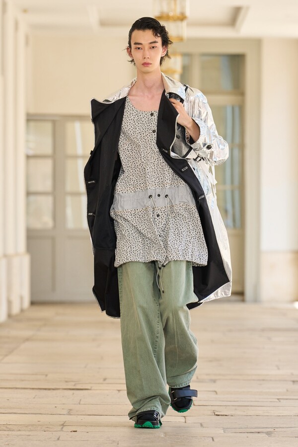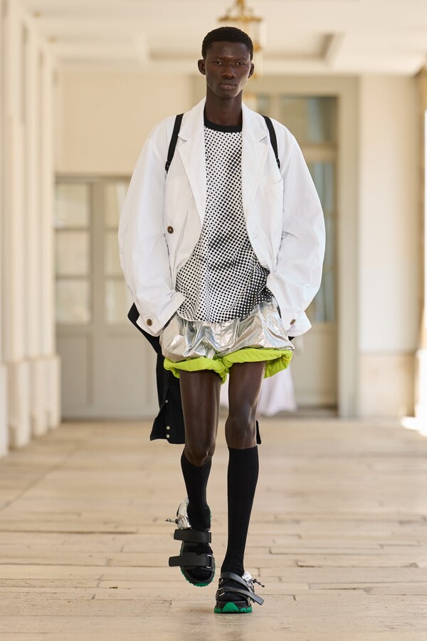 本季秉承了 Kolor 的既定风格——将时尚与实用功能完美融合。尼龙风衣、工装短裤和运动文胸等单品体现了这一点。堀内太郎还通过一些独特的色彩搭配注入新意,例如充满活力的酸黄色和黄绿色与更秋季感的卡其色和棕色系相得益彰。设计师还探索了更多实验性设计,包括泳衣上的醒目薄纱裙摆、点缀在蓬松半裙上的半月形裙摆,以及色彩缤纷的浸染半裙。轻盈的派克大衣饰有斑驳的印花,短裤、鞋子和风衣中的金属银色则增添了一丝未来感。