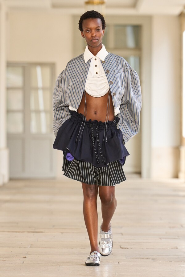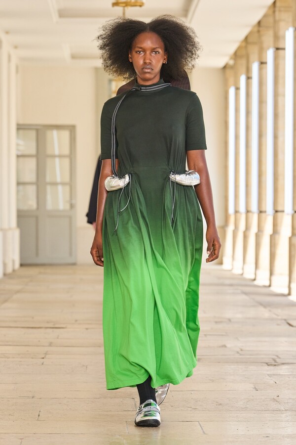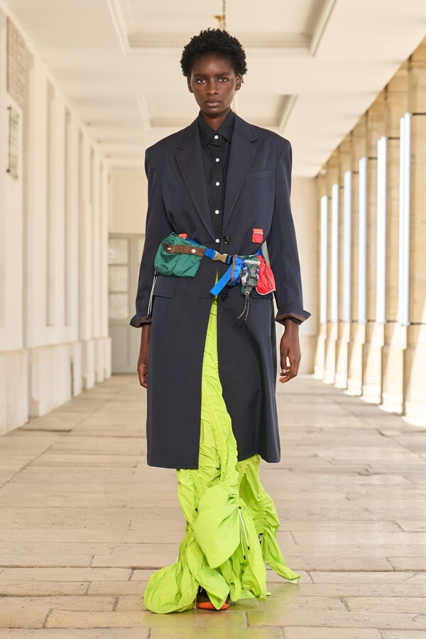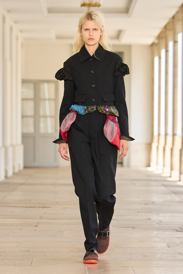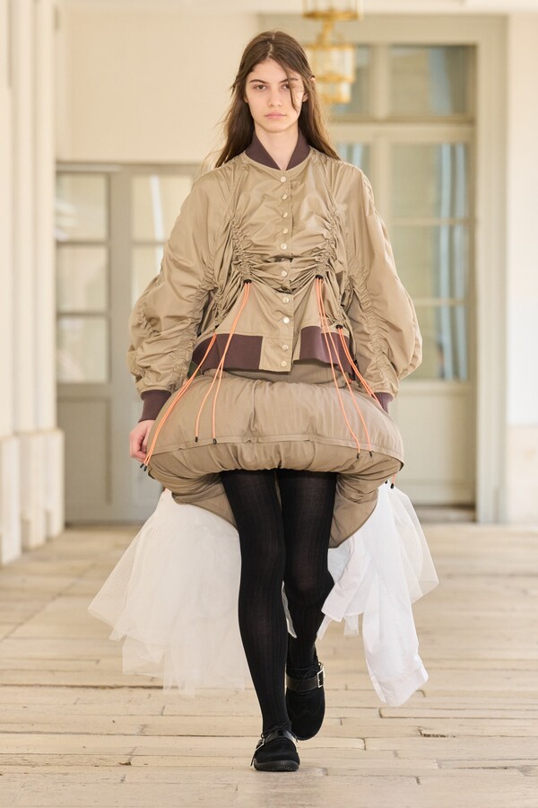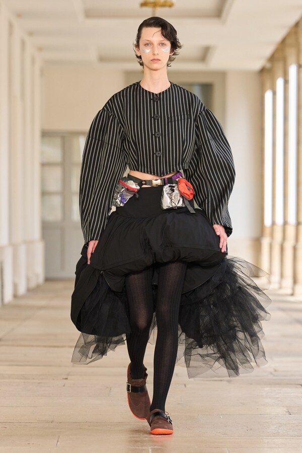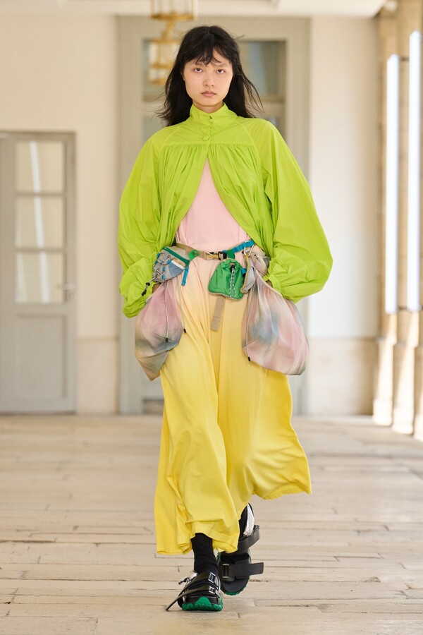 本季秉承了 Kolor 的既定风格——将时尚与实用功能完美融合。尼龙风衣、工装短裤和运动文胸等单品体现了这一点。堀内太郎还通过一些独特的色彩搭配注入新意,例如充满活力的酸黄色和黄绿色与更秋季感的卡其色和棕色系相得益彰。设计师还探索了更多实验性设计,包括泳衣上的醒目薄纱裙摆、点缀在蓬松半裙上的半月形裙摆,以及色彩缤纷的浸染半裙。轻盈的派克大衣饰有斑驳的印花,短裤、鞋子和风衣中的金属银色则增添了一丝未来感。