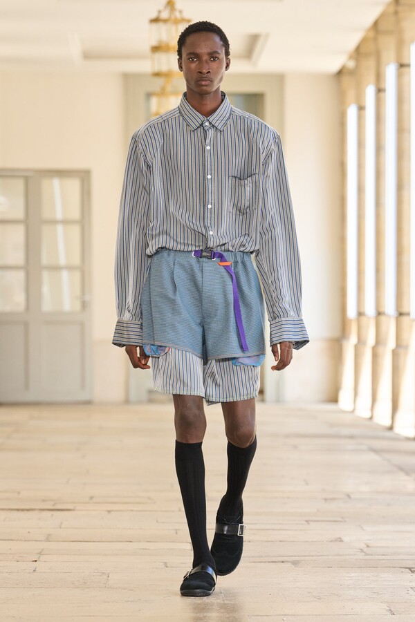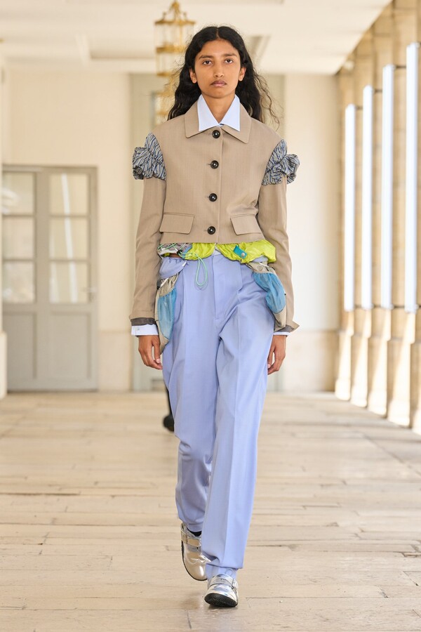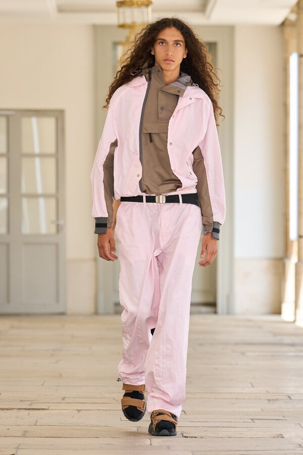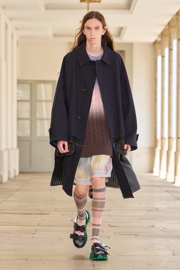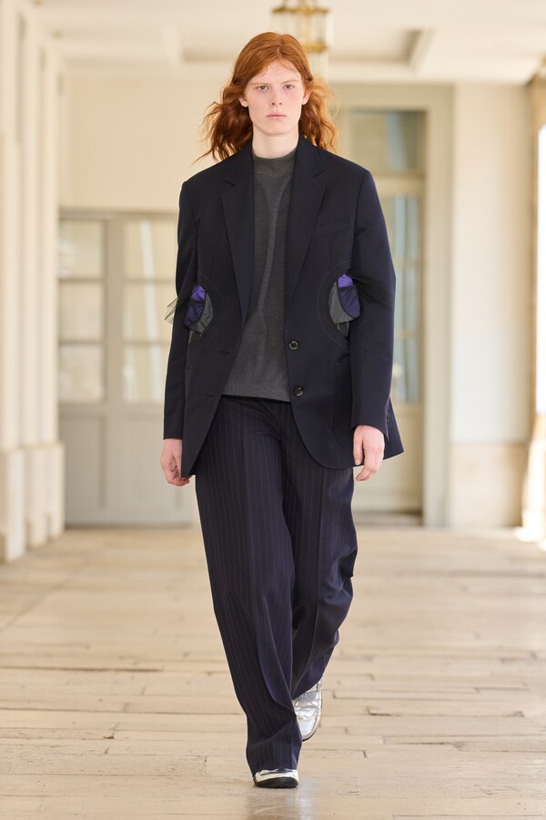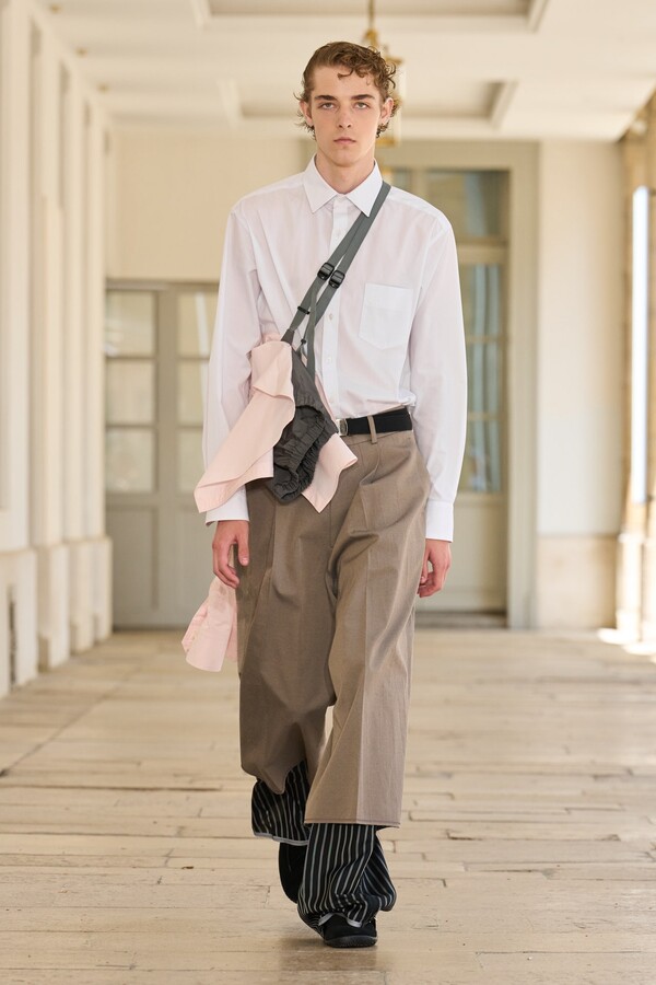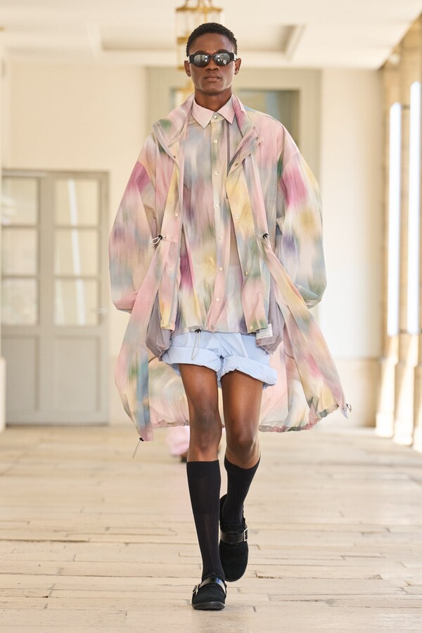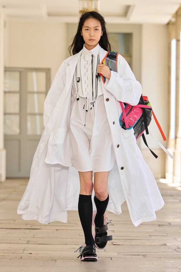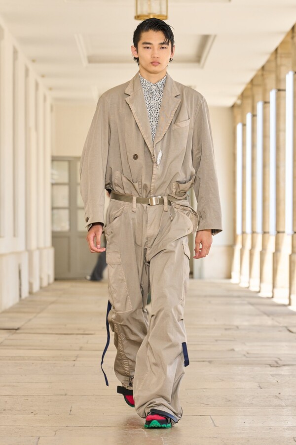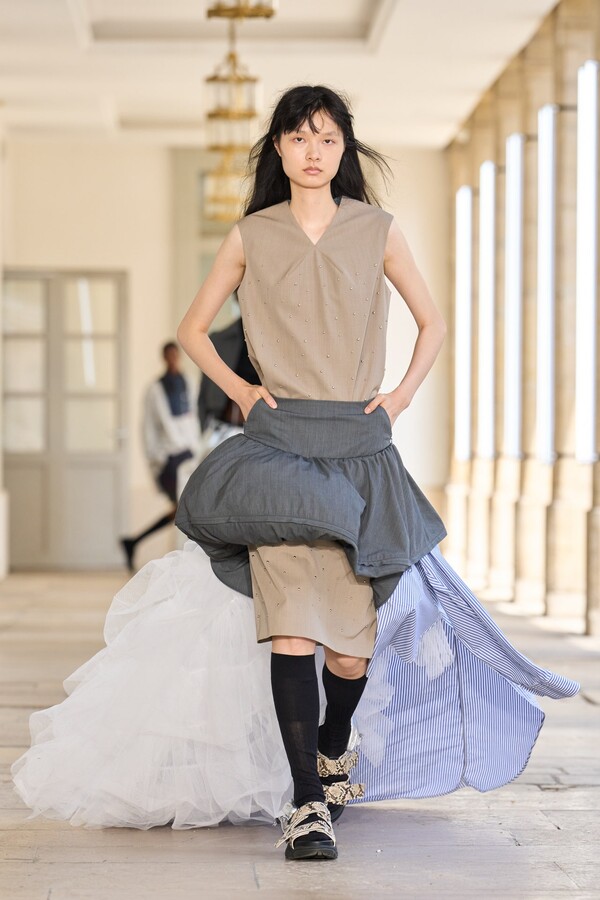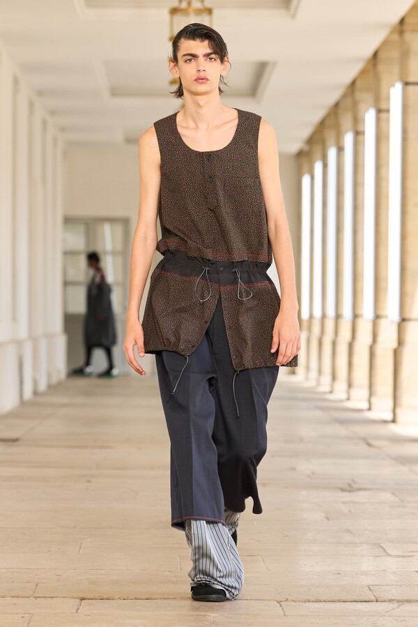 该系列还展示了轻薄的夏季羊毛面料,它们层叠在纽扣衬衫上并与之形成对比,展现出 90 年代极简主义风格。短夹克背面的镂空等实用细节则增强了透气性。虽然Kolor 长期以来在男装领域占据重要地位,但堀内太郎希望进一步发展女装,使其成为 Kolor 未来的代表性优势。