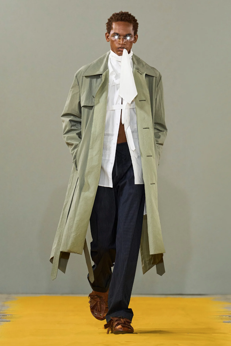 本季的廓形表达了青春与成熟并存的时刻。 秉承「如同口袋和衣摆中积聚的沙子,衣服也承载着记忆」这一理念,设计师对面料进行了处理,使其能够唤起时间的流逝和经验的积累,并呈现出一种随着穿着者的生活而变化的有机质感。