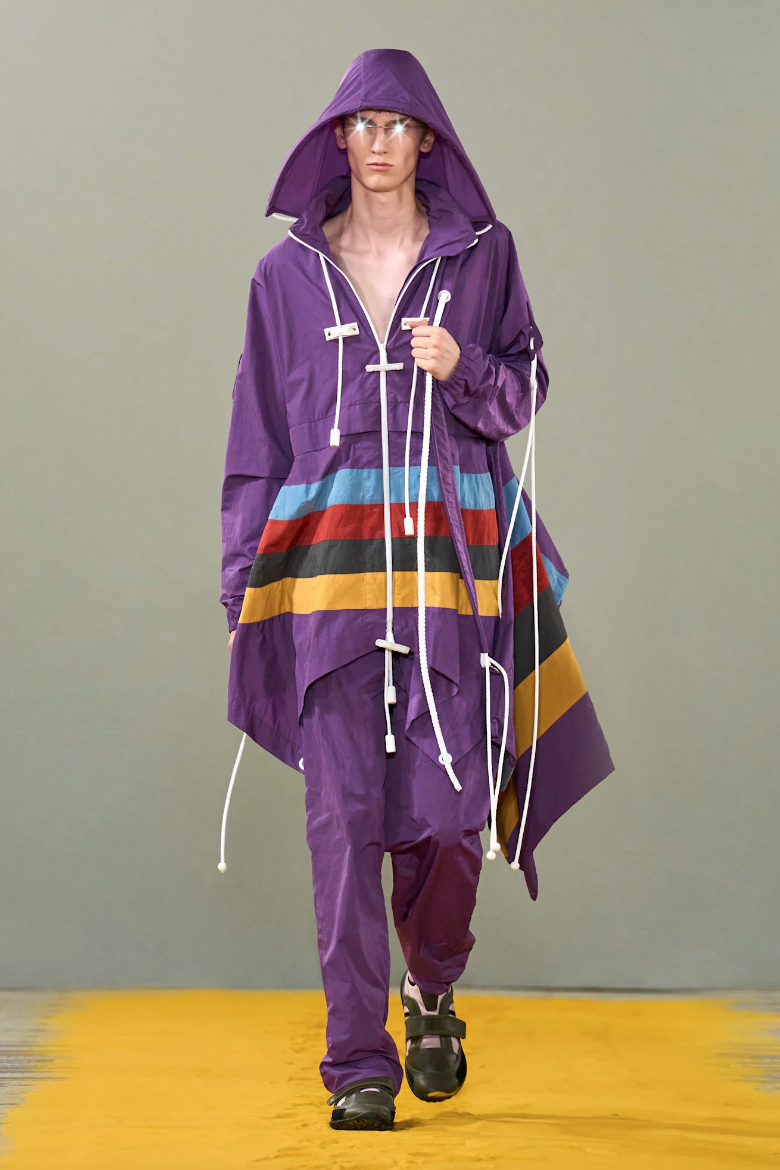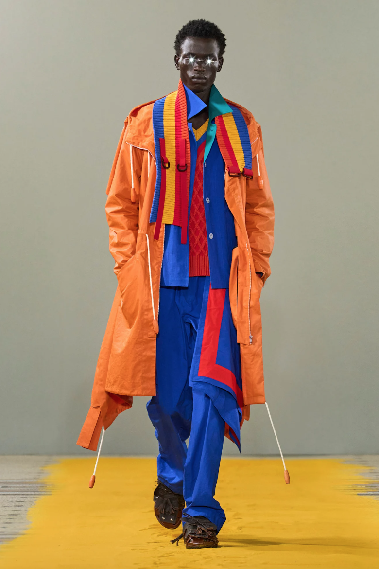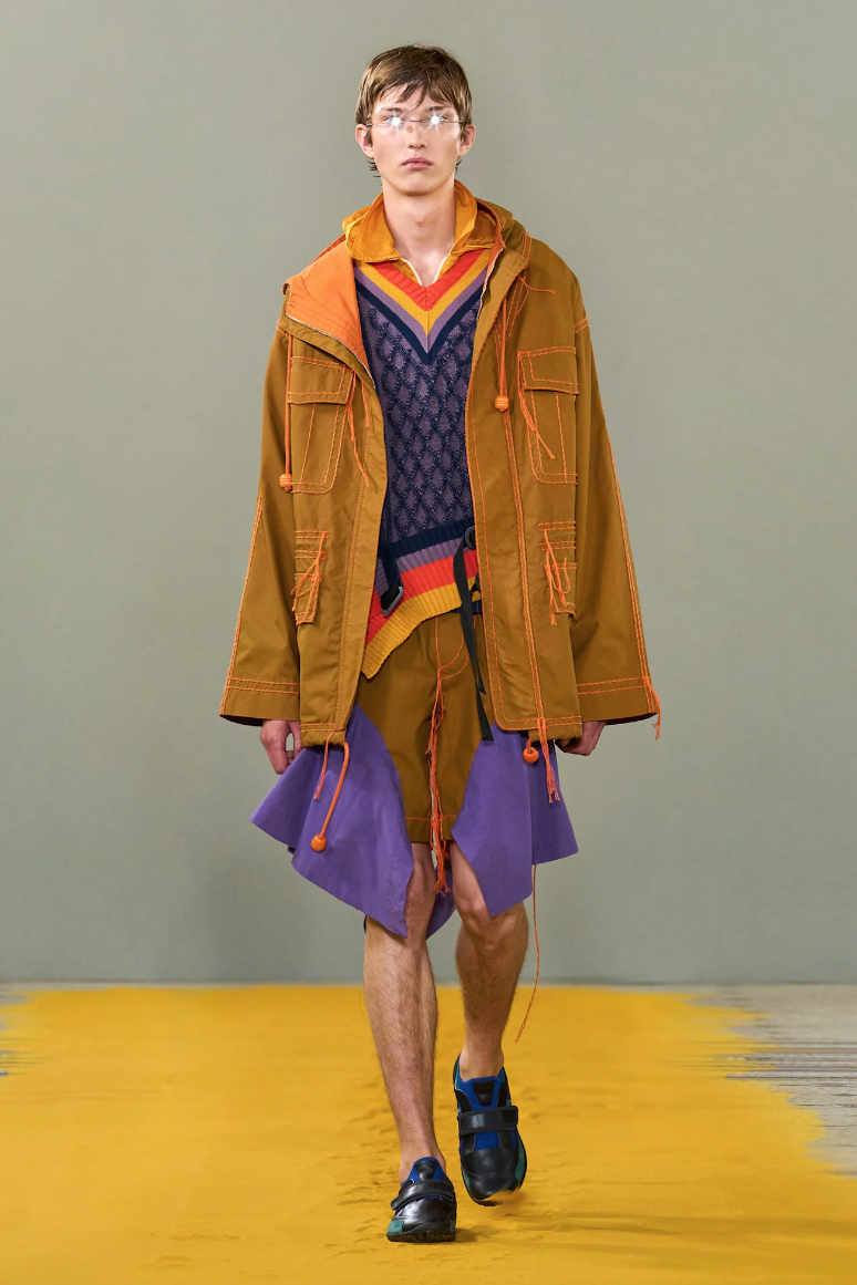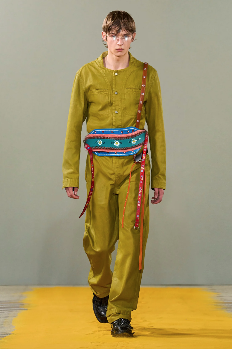 外套的灵感源自宠物狗外套和 20 世纪 70 年代早期的印花床单。花朵图案外套和裤子饰有飘逸的长流苏,防寒夹克则饰有粗彩虹条纹和绳索细节。这些色彩缤纷的花朵也出现在针织衫、腰带和皮革背带上,与 Craig Green 独具特色的迷幻外套相得益彰。