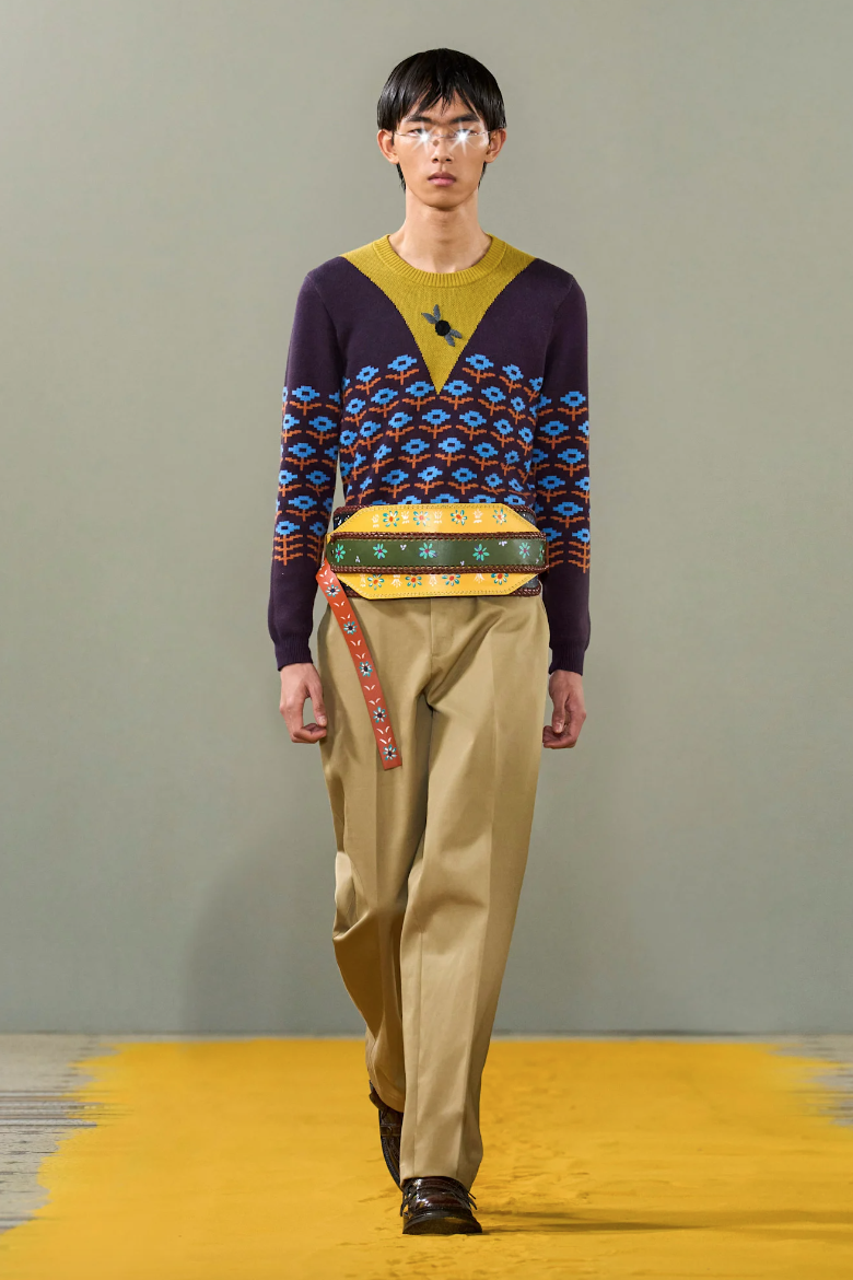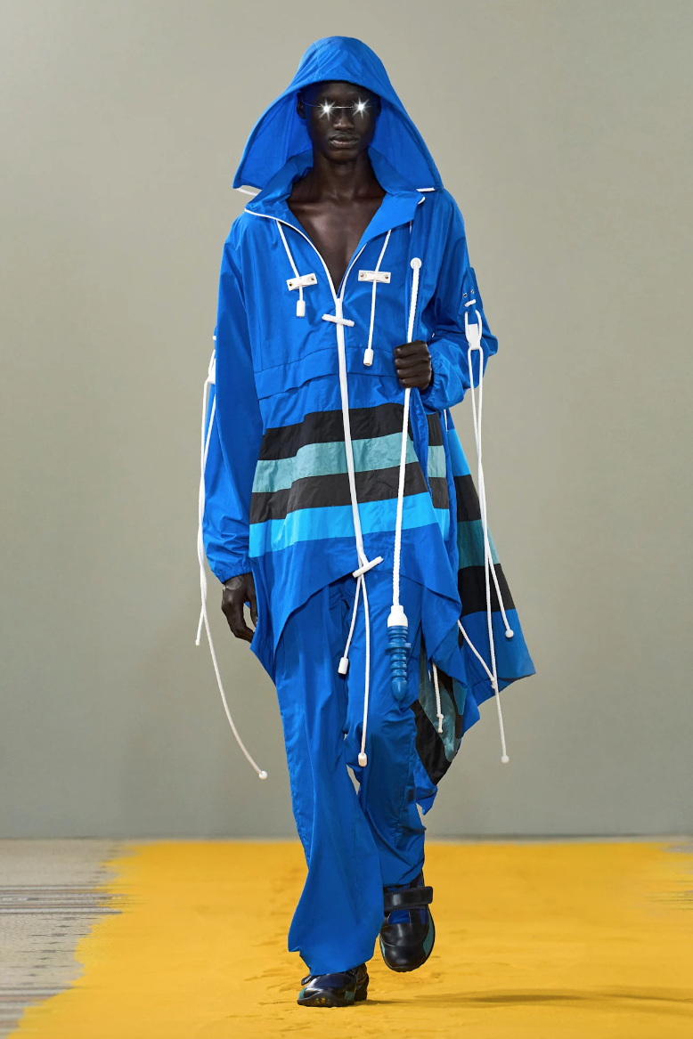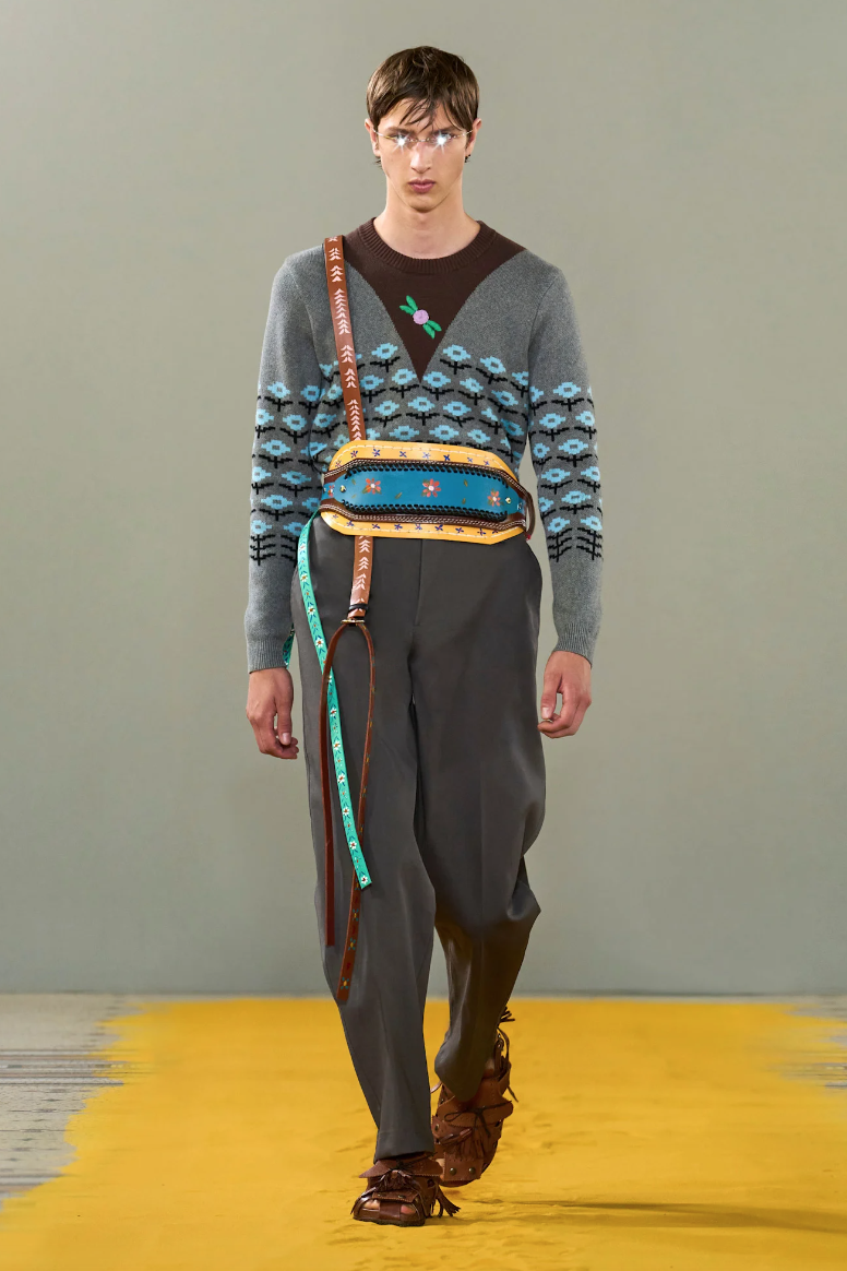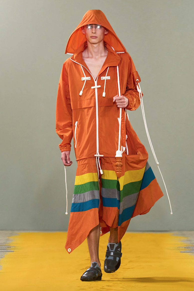 外套的灵感源自宠物狗外套和 20 世纪 70 年代早期的印花床单。花朵图案外套和裤子饰有飘逸的长流苏,防寒夹克则饰有粗彩虹条纹和绳索细节。这些色彩缤纷的花朵也出现在针织衫、腰带和皮革背带上,与 Craig Green 独具特色的迷幻外套相得益彰。