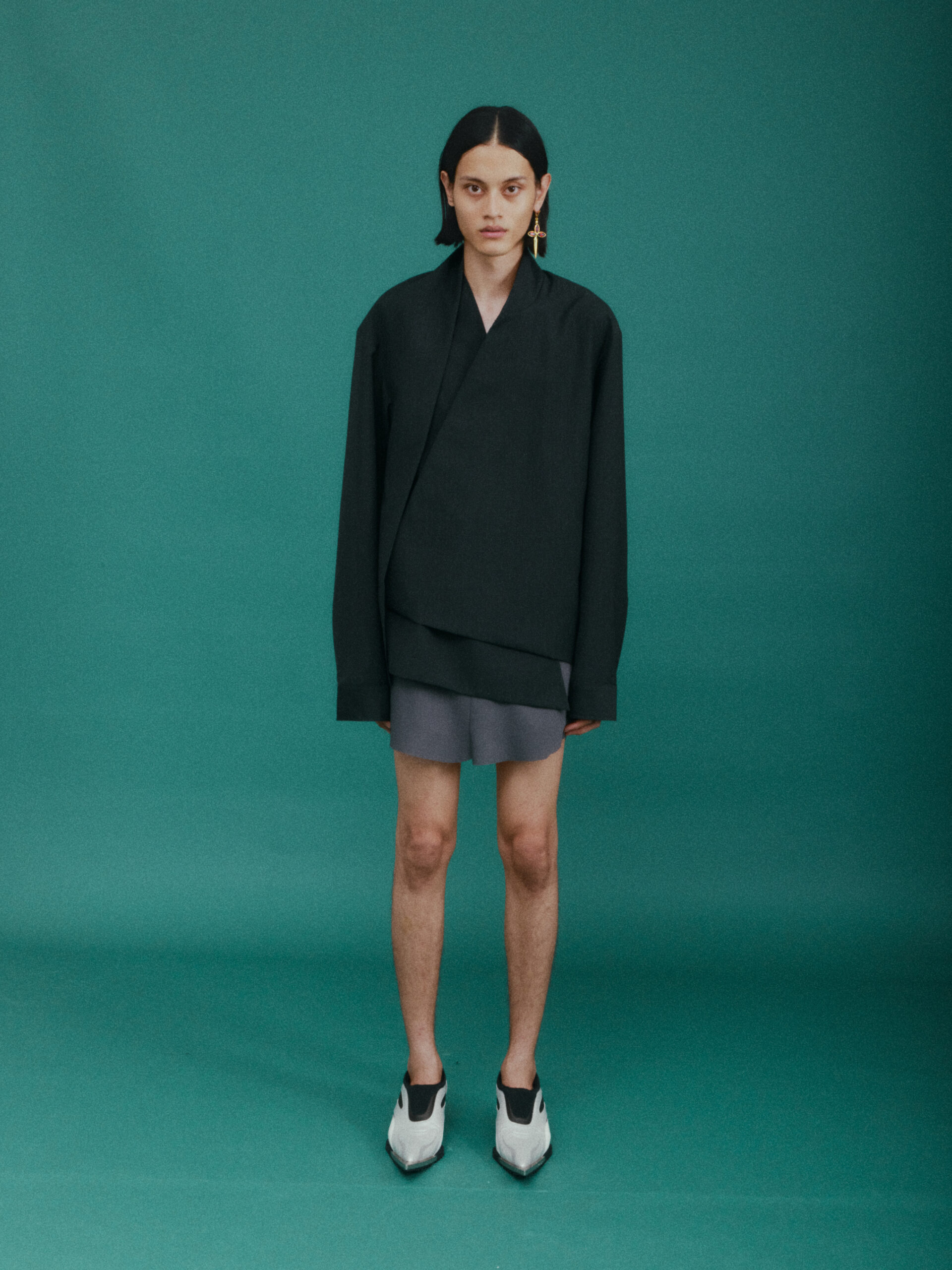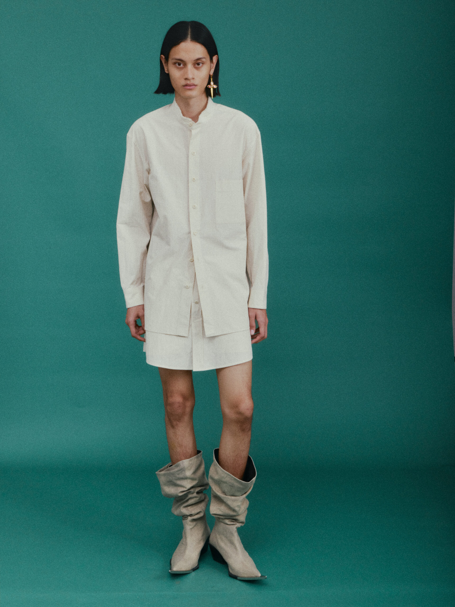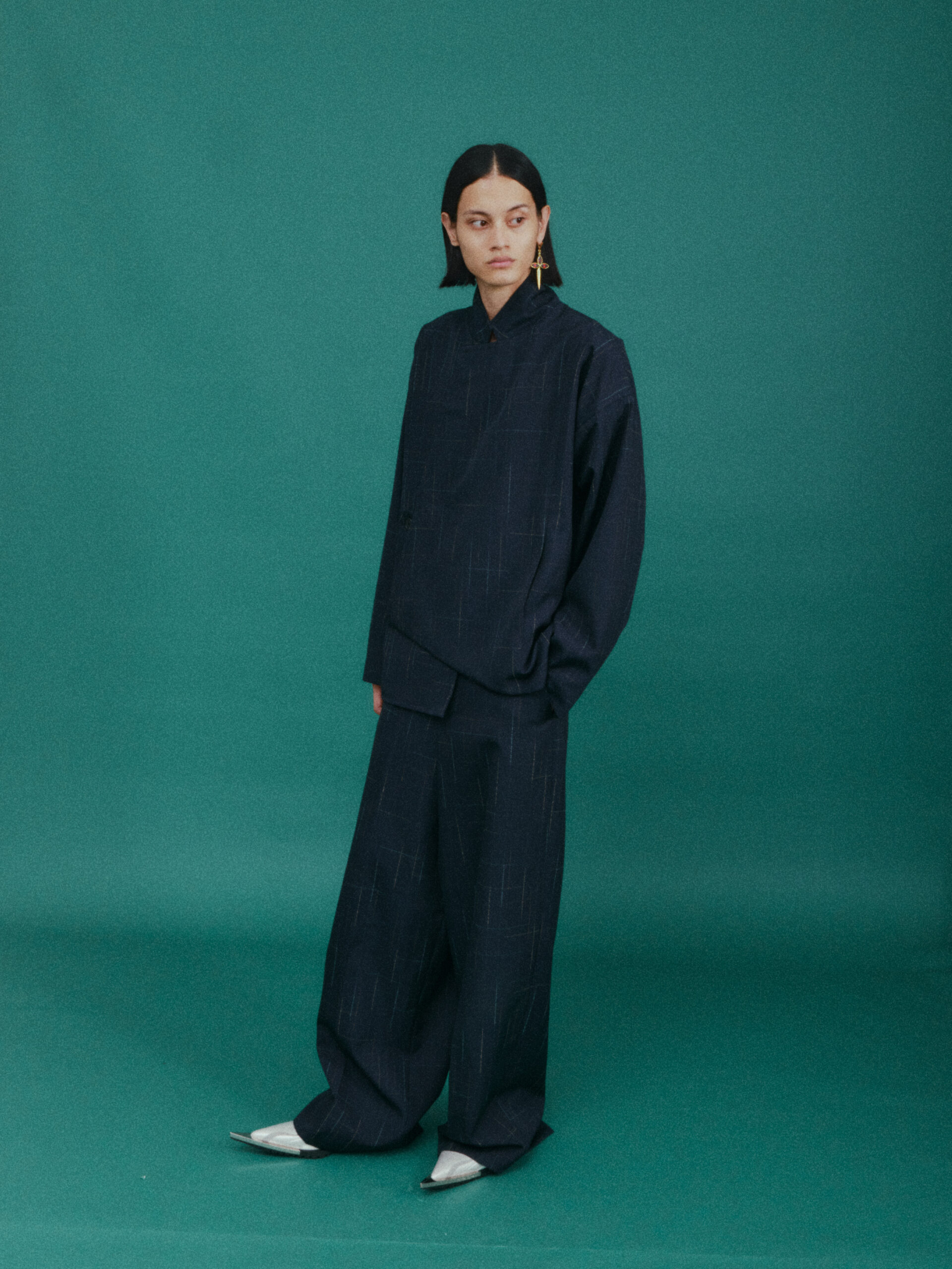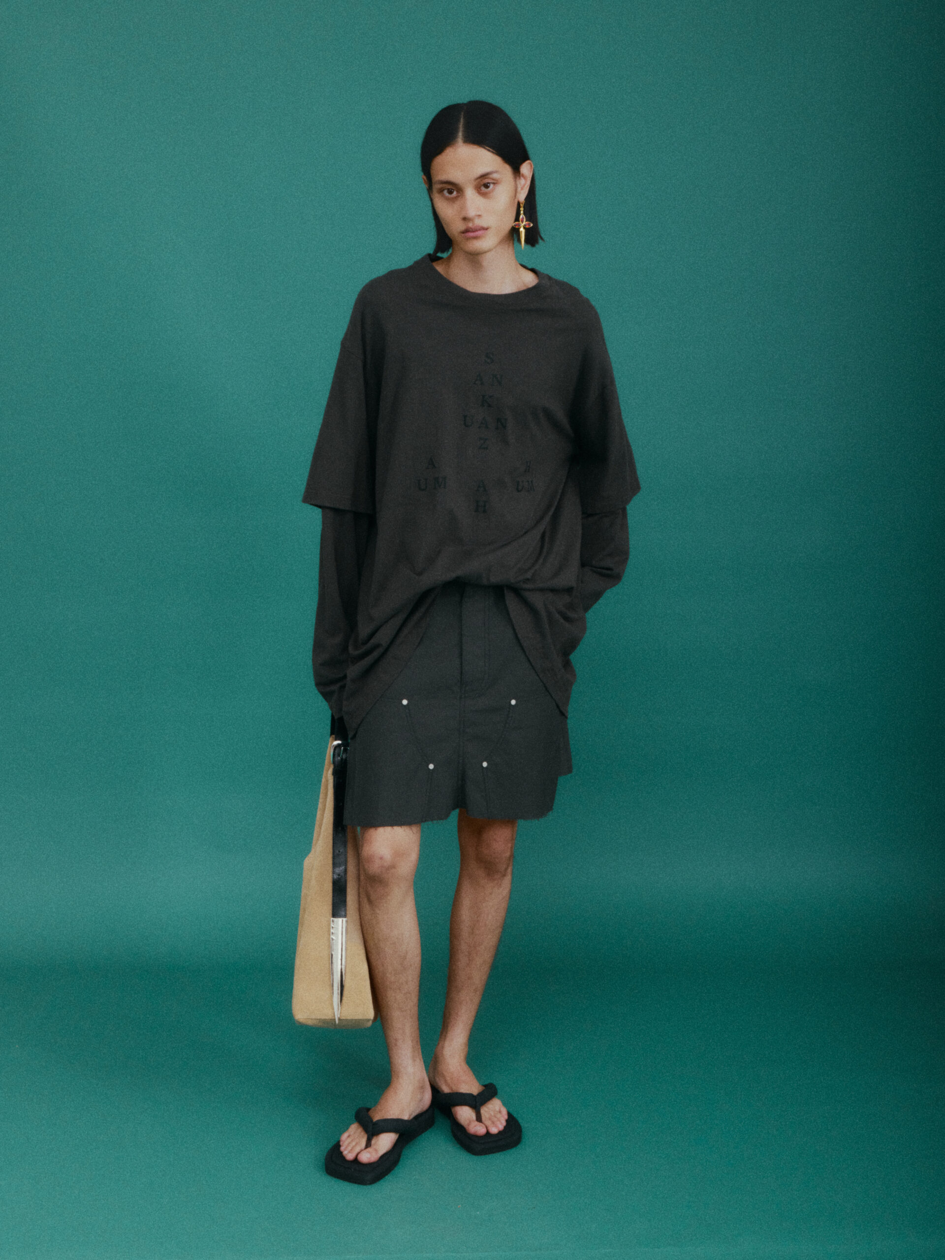 作为对喜马拉雅风格的时装演绎又一次深化:大衣延续了藏袍的披挂式设计和门襟的折叠造型;经典的西装并未采用常规的翻领,而是将青果领改为平面设计并让其与衣身形成轮廓流畅的拼接;油蜡布夹克、教练夹克、飞行员夹克等街头经典单品,也在经典廓形中增加了连袖的中式平面剪裁;裤装上则将短裙与长裤的轮廓外观相互融合。本季大量出现的牦牛绒材质,是 SANKUANZ 将喜马拉雅地区天然纤维与高级时装设计的融合。珍稀的牦牛绒历经多重工序捻成纤柔的细纱,最终纺织、型塑为大衣、西装、夹克、衬衣等多品类、多场景时装,结合浅咖、深灰和奶油色等自然色泽,让东方式平面裁剪强调面料本身的质地,也令雪域高原的精神在日常中可知可感。同时 SANKUANZ 经典的 DAGGER 元素在整个服装及配饰系列中一以贯之地传承与深化。