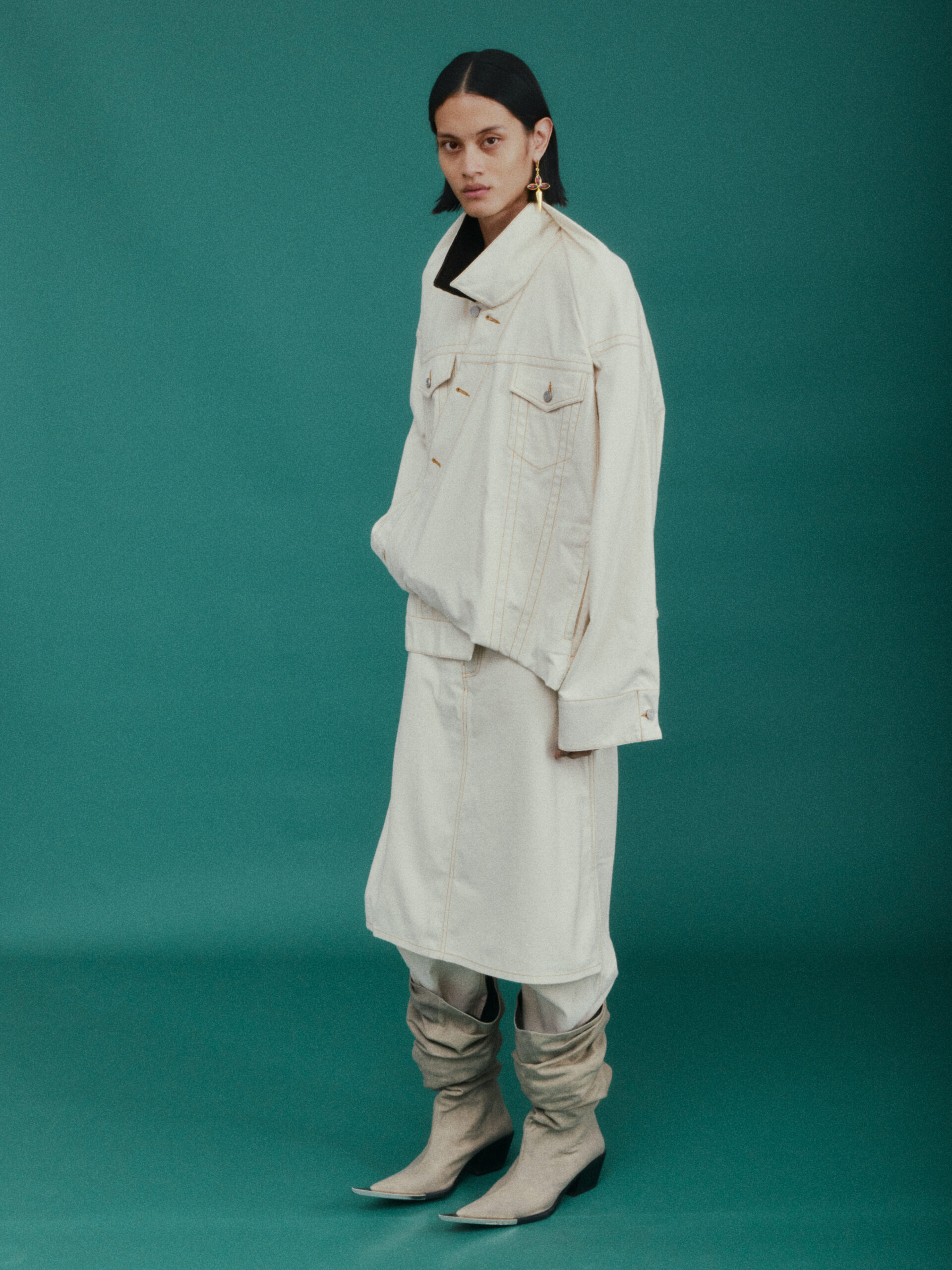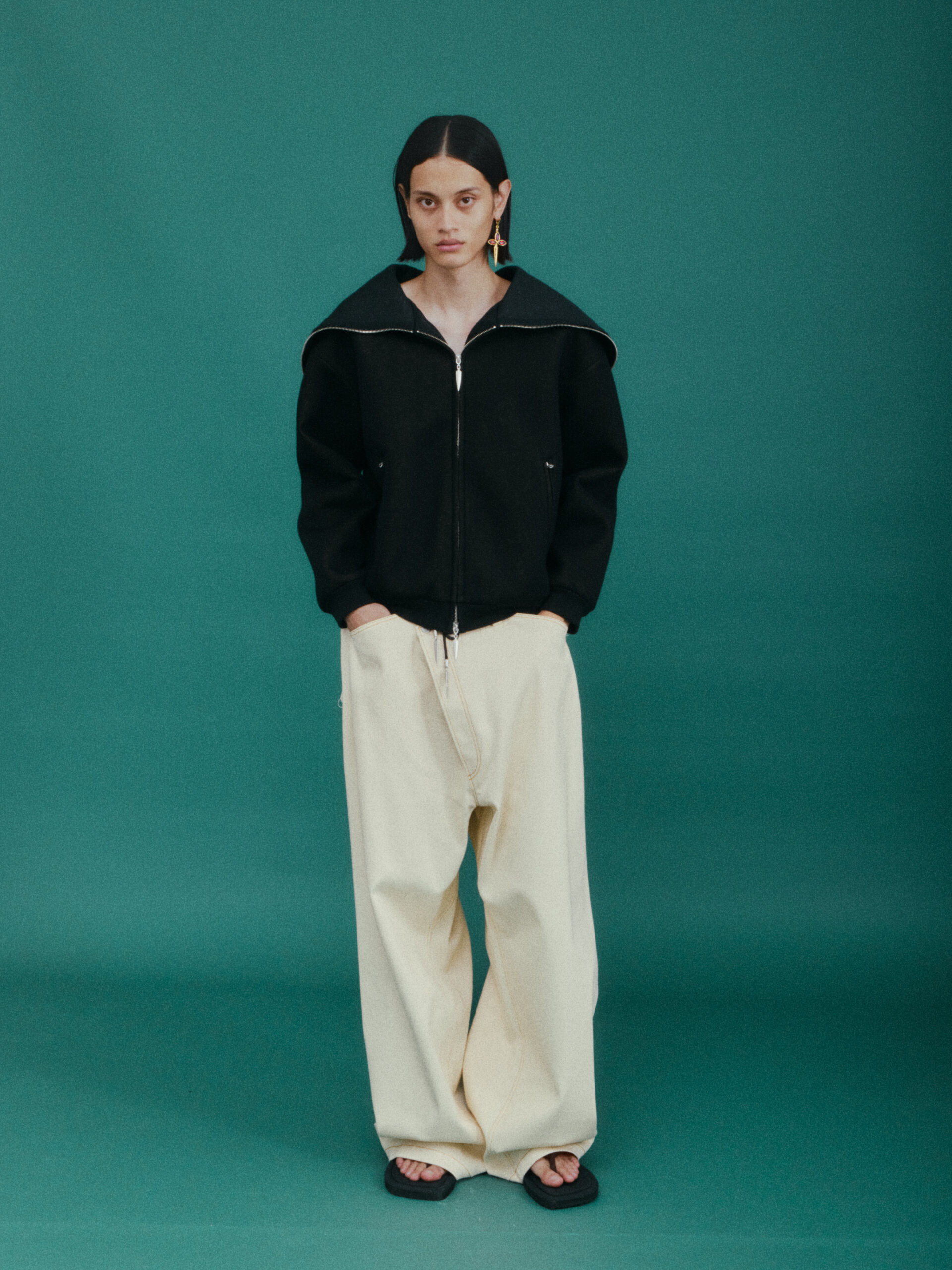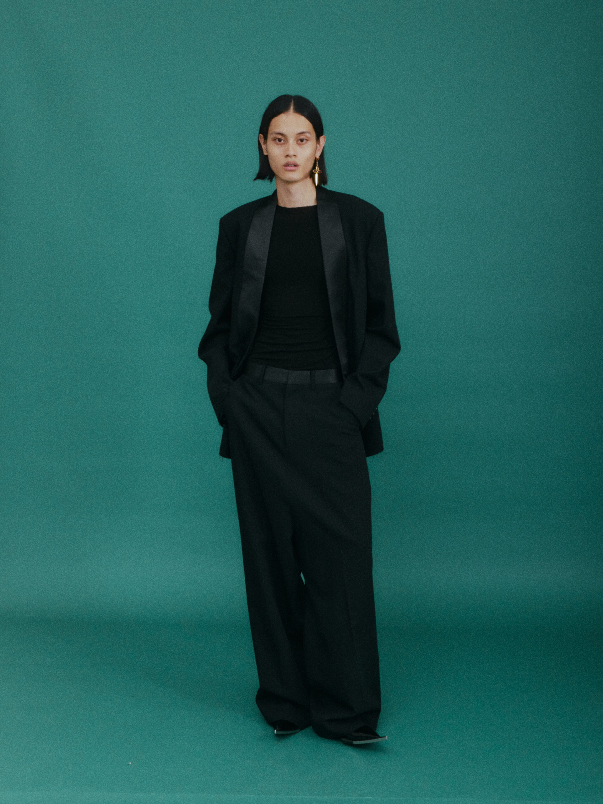 作为对喜马拉雅风格的时装演绎又一次深化:大衣延续了藏袍的披挂式设计和门襟的折叠造型;经典的西装并未采用常规的翻领,而是将青果领改为平面设计并让其与衣身形成轮廓流畅的拼接;油蜡布夹克、教练夹克、飞行员夹克等街头经典单品,也在经典廓形中增加了连袖的中式平面剪裁;裤装上则将短裙与长裤的轮廓外观相互融合。本季大量出现的牦牛绒材质,是 SANKUANZ 将喜马拉雅地区天然纤维与高级时装设计的融合。珍稀的牦牛绒历经多重工序捻成纤柔的细纱,最终纺织、型塑为大衣、西装、夹克、衬衣等多品类、多场景时装,结合浅咖、深灰和奶油色等自然色泽,让东方式平面裁剪强调面料本身的质地,也令雪域高原的精神在日常中可知可感。同时 SANKUANZ 经典的 DAGGER 元素在整个服装及配饰系列中一以贯之地传承与深化。