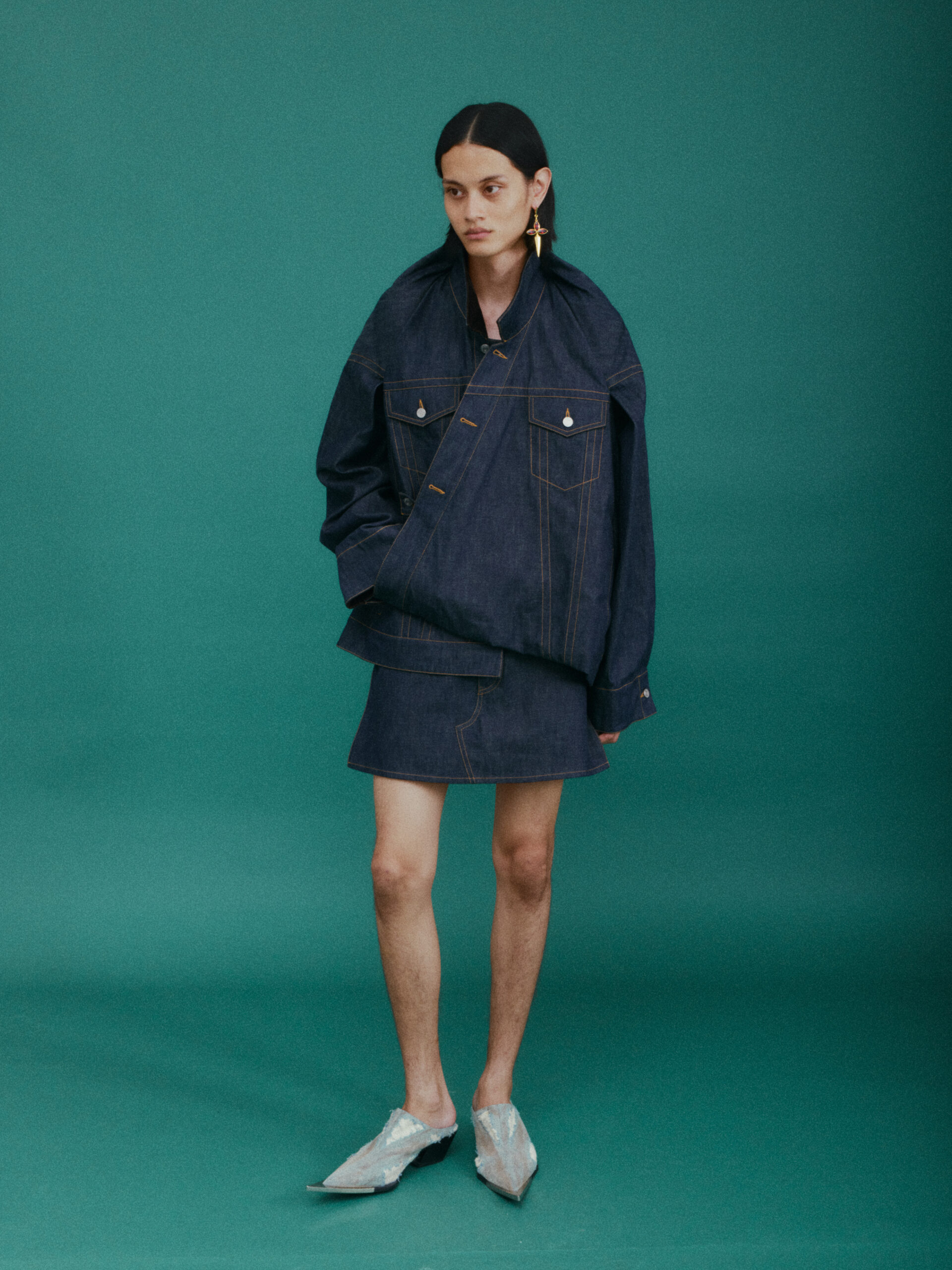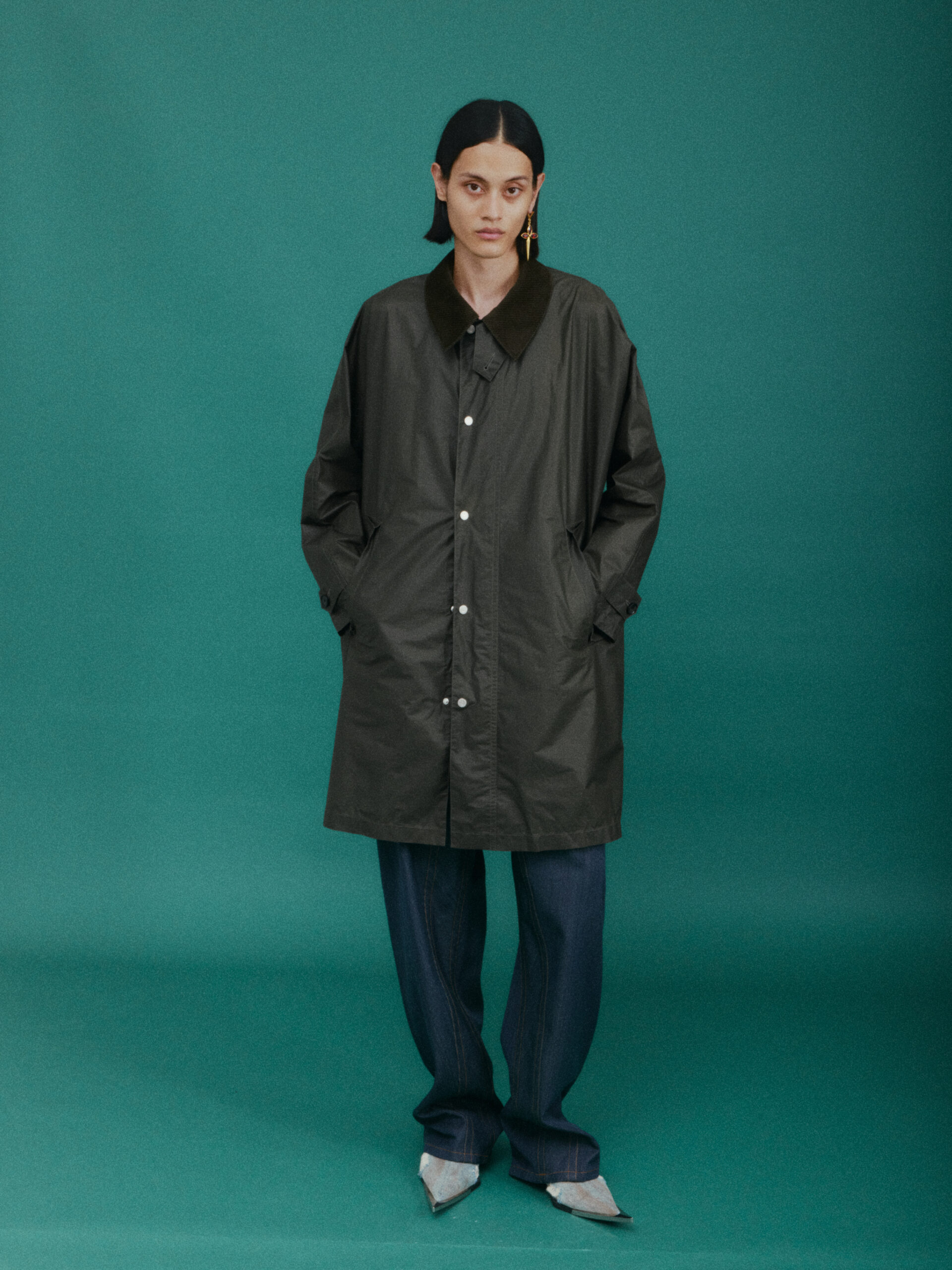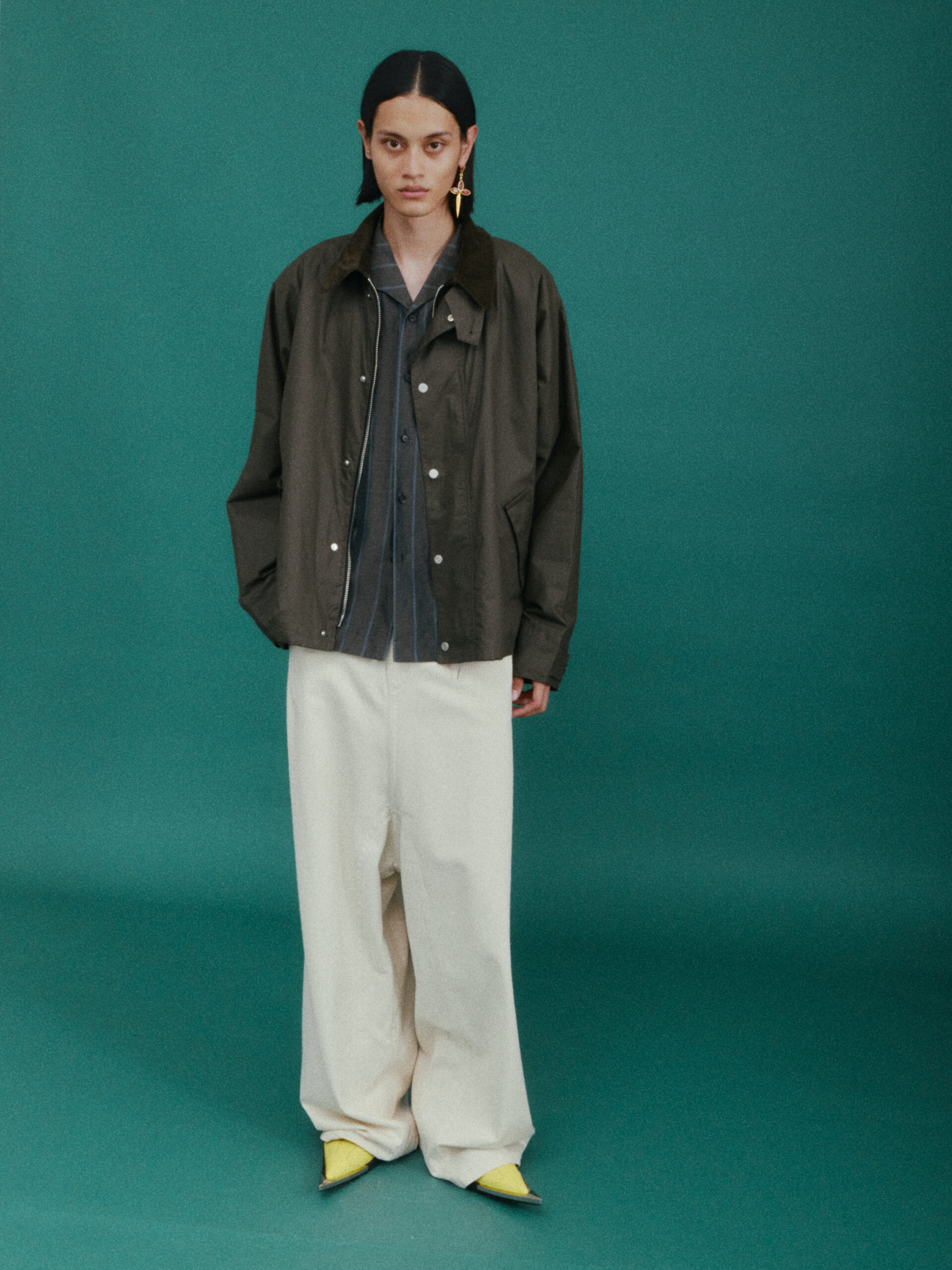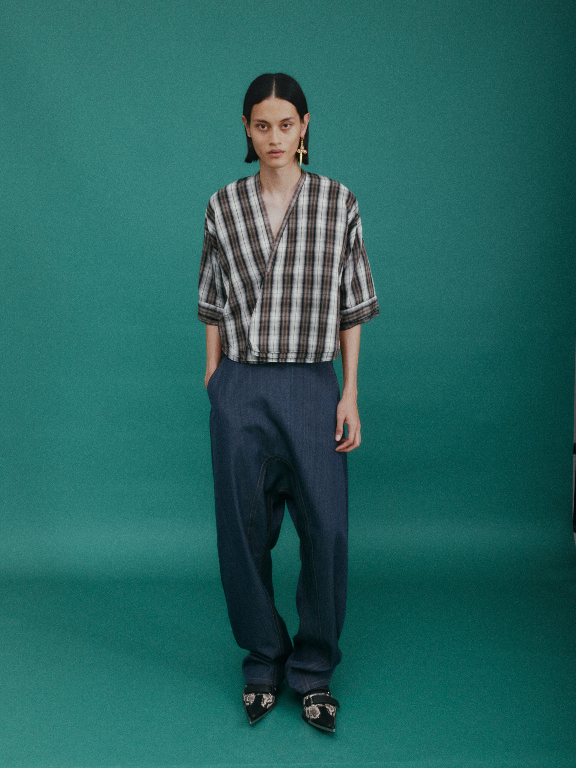作为对喜马拉雅风格的时装演绎又一次深化:大衣延续了藏袍的披挂式设计和门襟的折叠造型;经典的西装并未采用常规的翻领,而是将青果领改为平面设计并让其与衣身形成轮廓流畅的拼接;油蜡布夹克、教练夹克、飞行员夹克等街头经典单品,也在经典廓形中增加了连袖的中式平面剪裁;裤装上则将短裙与长裤的轮廓外观相互融合。本季大量出现的牦牛绒材质,是 SANKUANZ 将喜马拉雅地区天然纤维与高级时装设计的融合。珍稀的牦牛绒历经多重工序捻成纤柔的细纱,最终纺织、型塑为大衣、西装、夹克、衬衣等多品类、多场景时装,结合浅咖、深灰和奶油色等自然色泽,让东方式平面裁剪强调面料本身的质地,也令雪域高原的精神在日常中可知可感。同时 SANKUANZ 经典的 DAGGER 元素在整个服装及配饰系列中一以贯之地传承与深化。