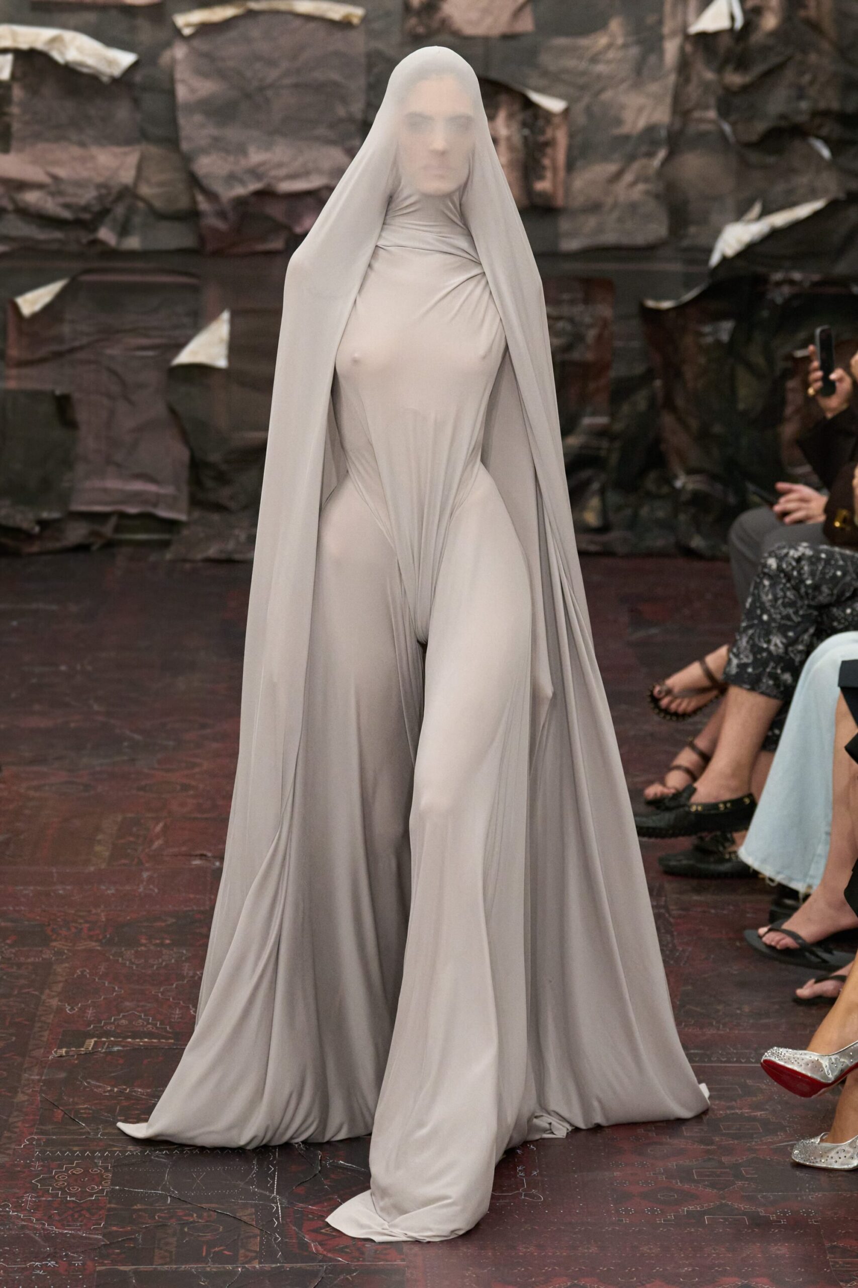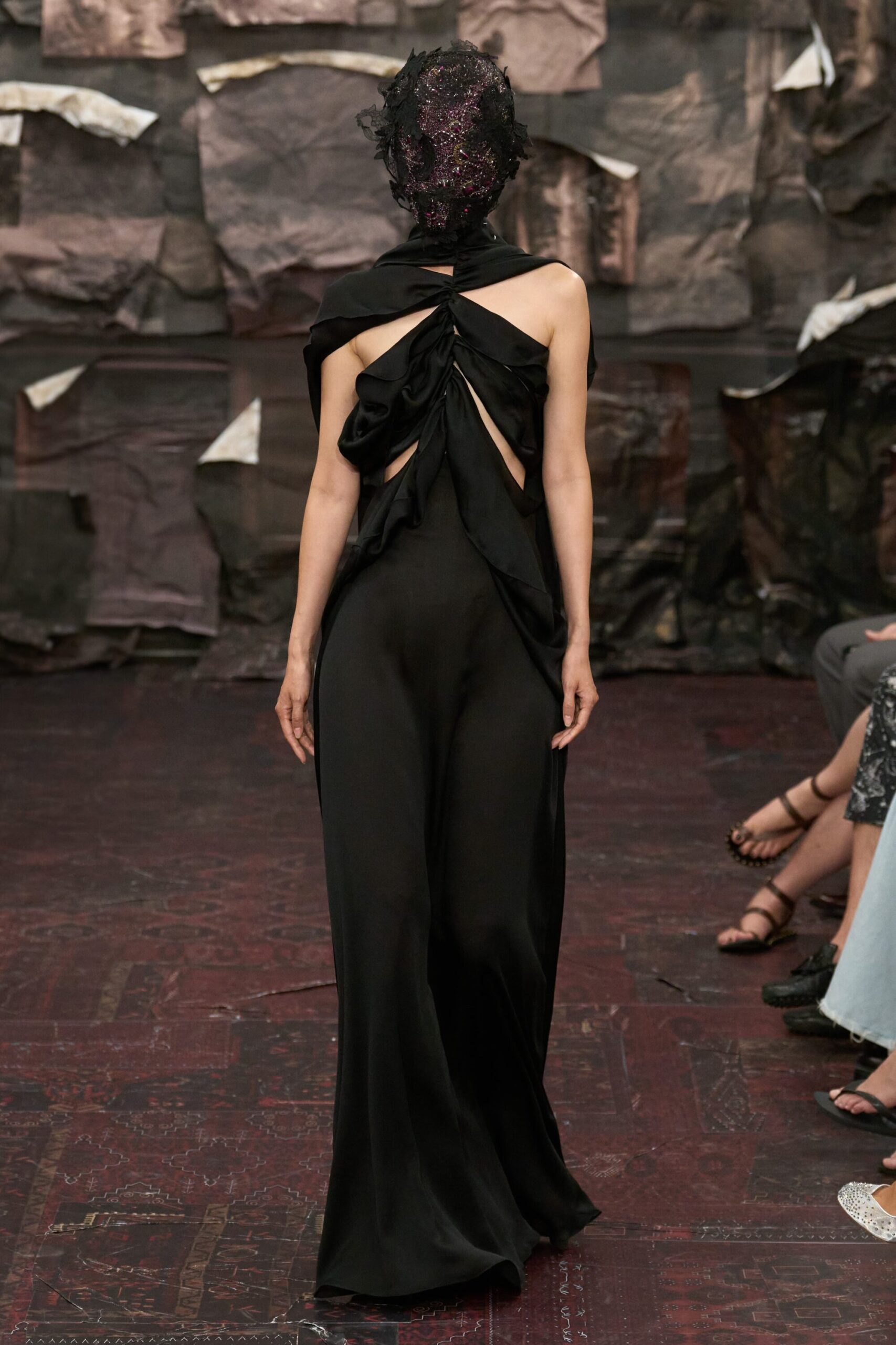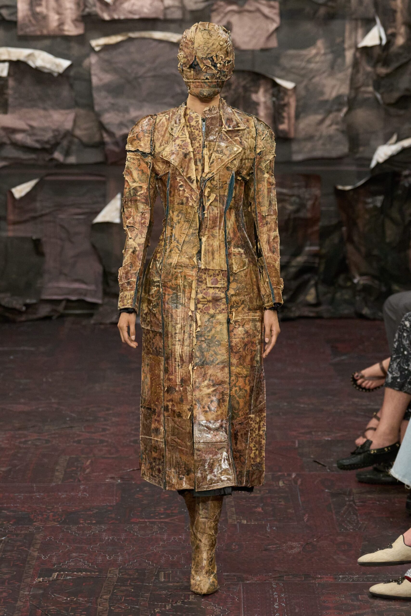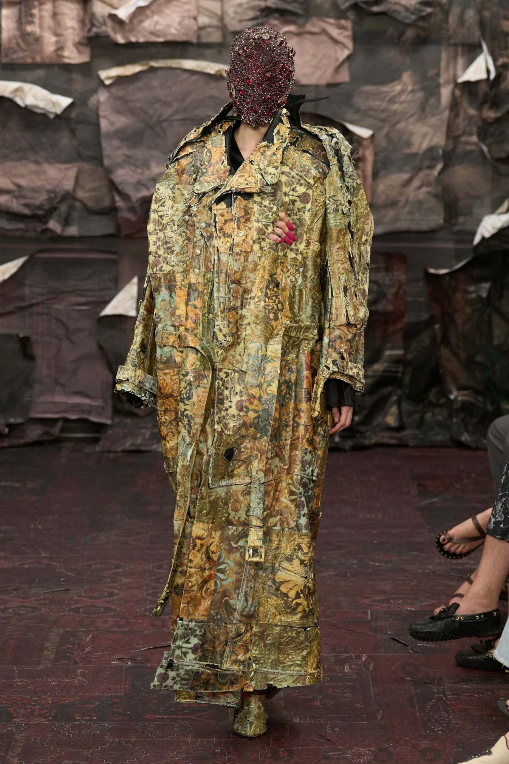 Glenn Martens 在 Maison Margiela 的首秀正式亮相。此次秀场设在巴黎 Le Centquatre,一座曾是市政殡仪馆的空间,具有浓厚的历史感与象征意义。秀场内的墙面装饰着拼接杂乱的纸质印刷品,呈现出衰败中的巴洛克风格,与展品的「衰败奢华」主题相呼应。秀场上,面罩作为马吉拉经典元素再次出现,塑料膜和废弃饰品被重新运用,进一步强调「面部遮掩」与「匿名性」的设计理念。