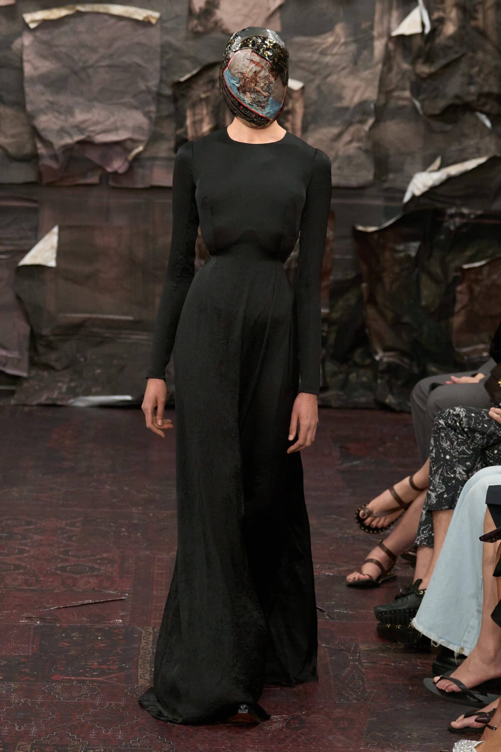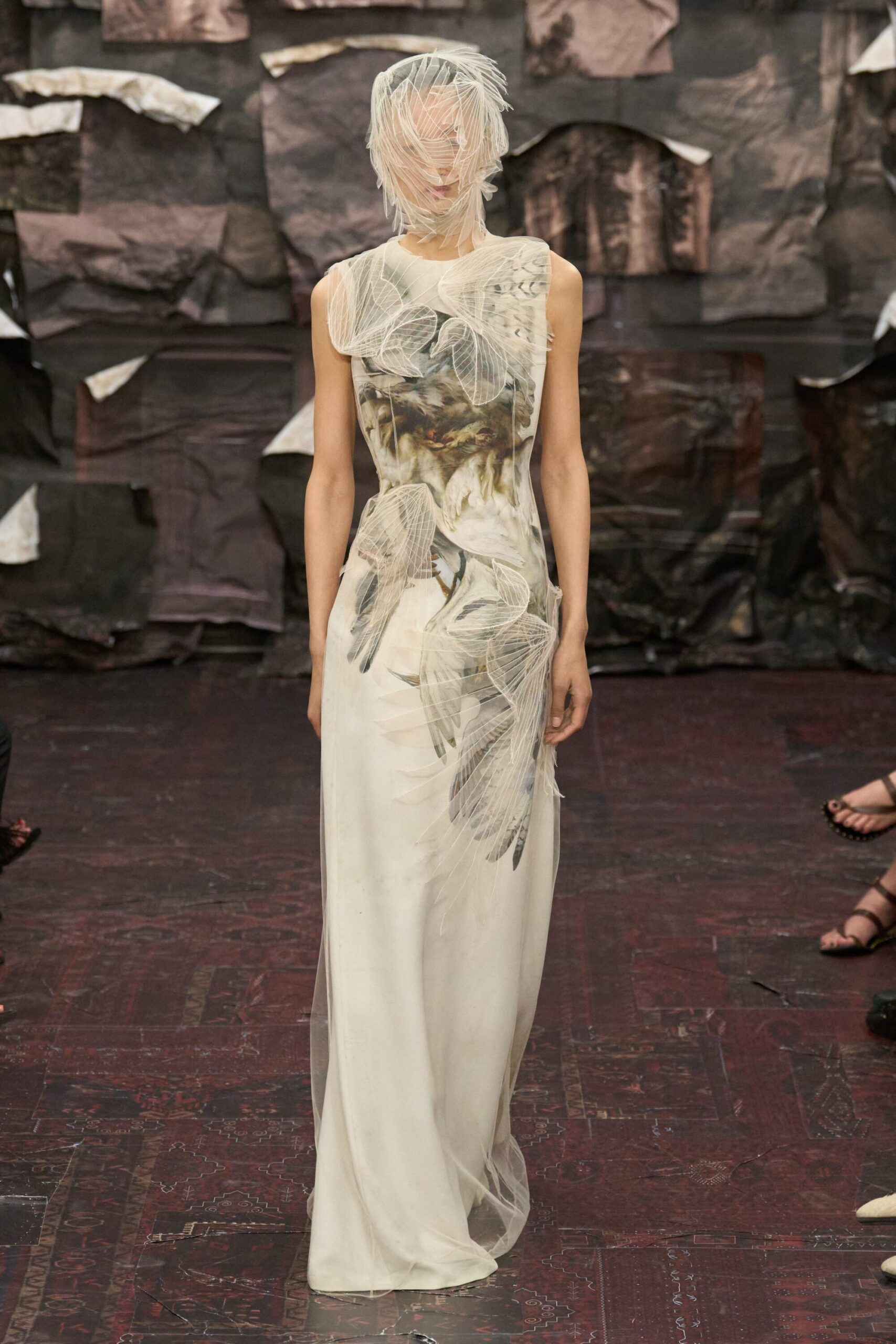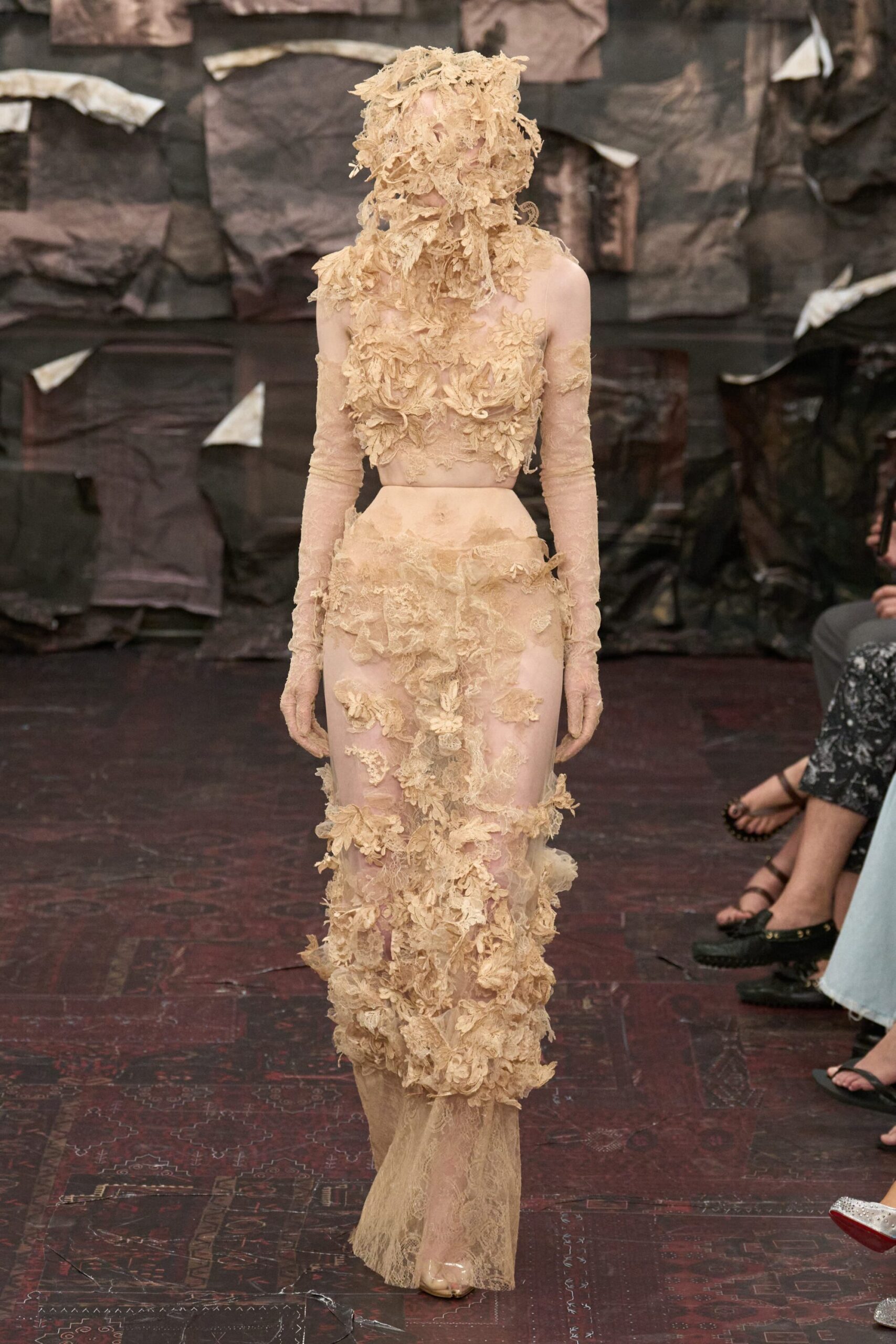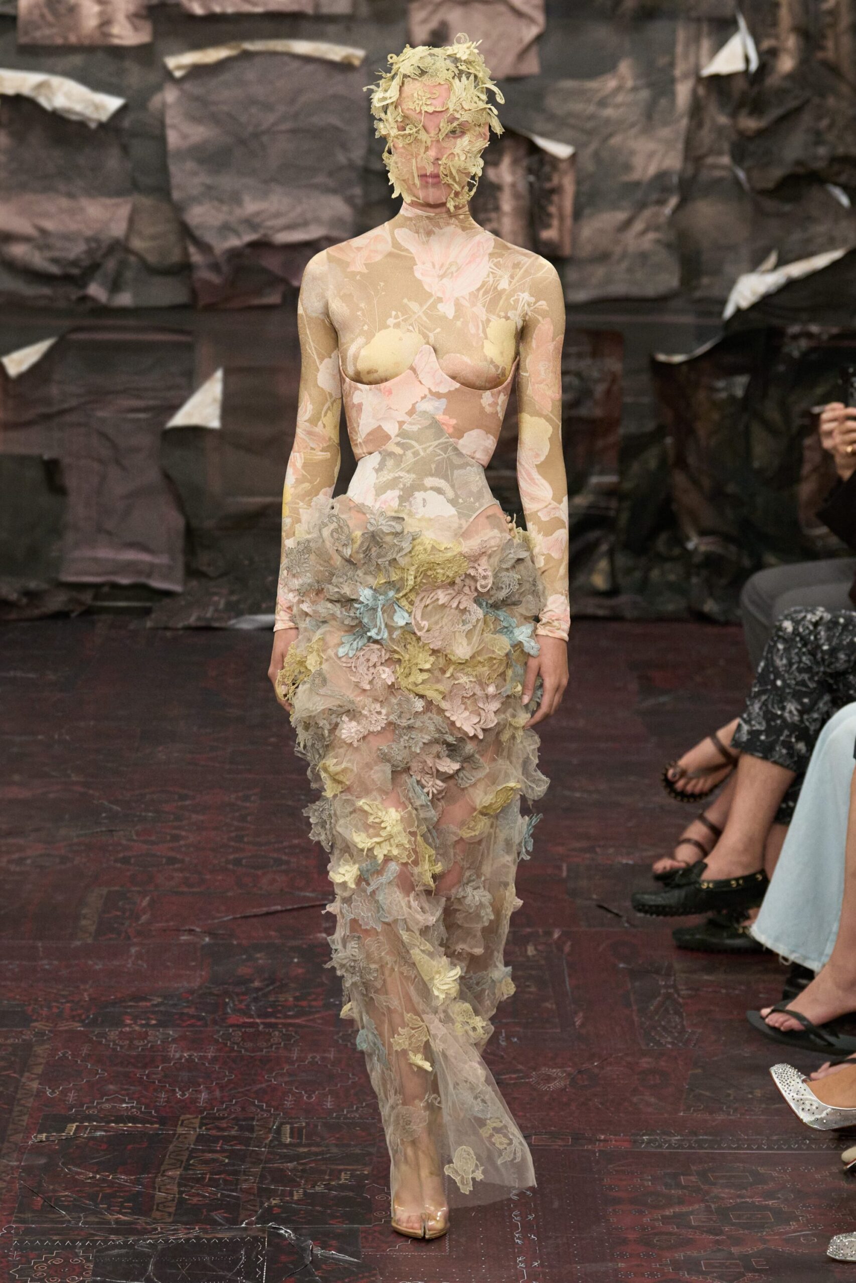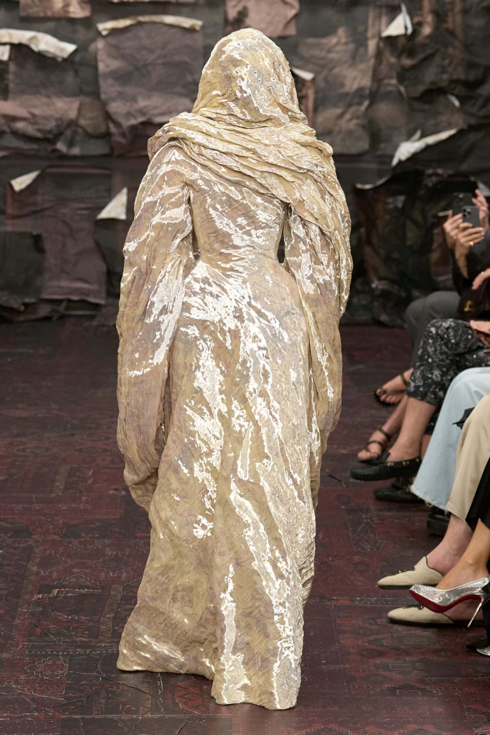 Glenn Martens 在 Maison Margiela 的首秀正式亮相。此次秀场设在巴黎 Le Centquatre,一座曾是市政殡仪馆的空间,具有浓厚的历史感与象征意义。秀场内的墙面装饰着拼接杂乱的纸质印刷品,呈现出衰败中的巴洛克风格,与展品的「衰败奢华」主题相呼应。秀场上,面罩作为马吉拉经典元素再次出现,塑料膜和废弃饰品被重新运用,进一步强调「面部遮掩」与「匿名性」的设计理念。