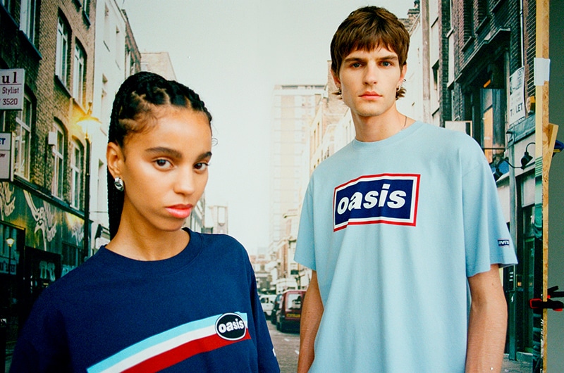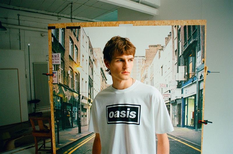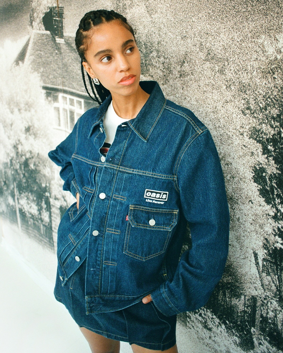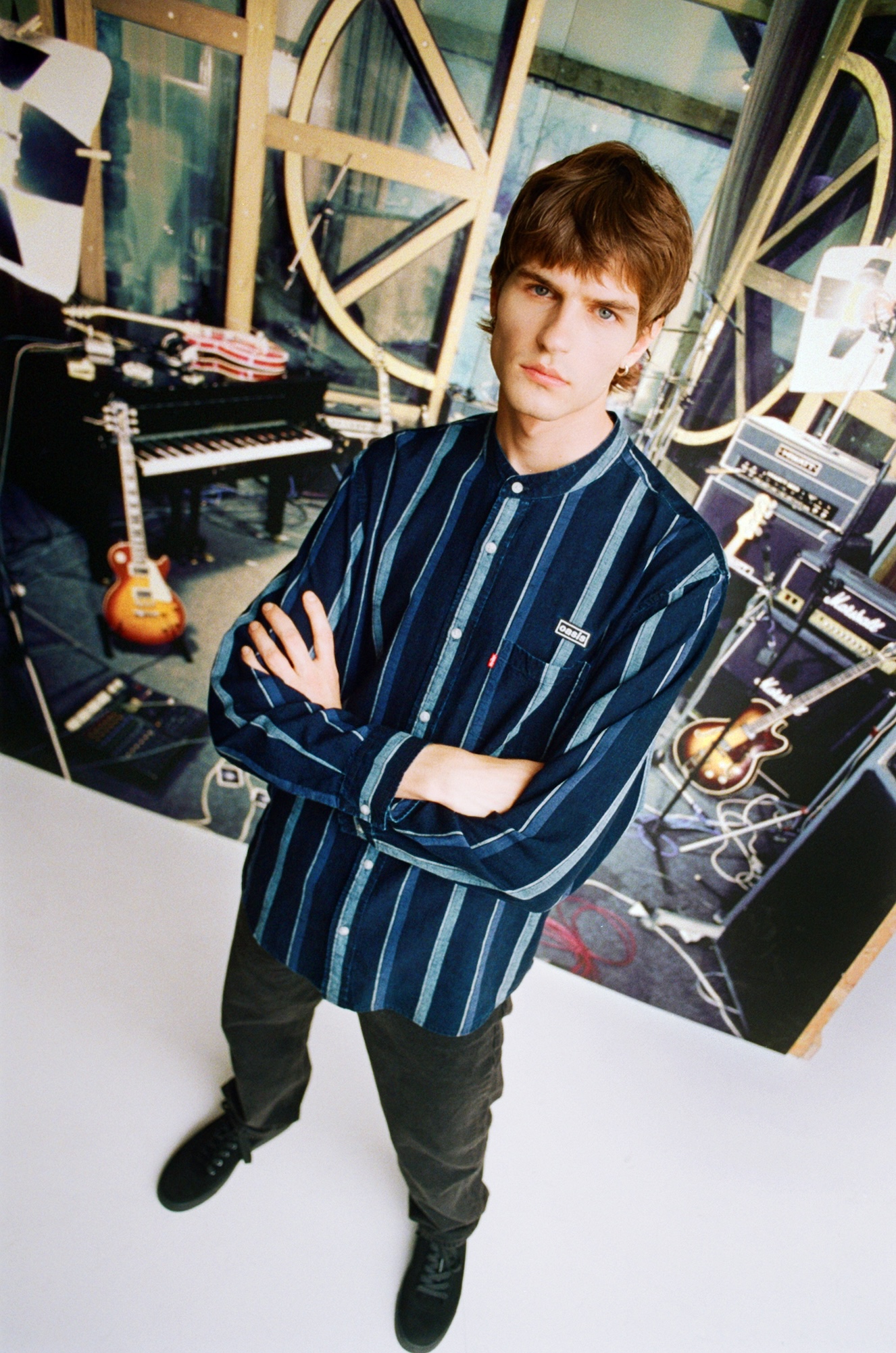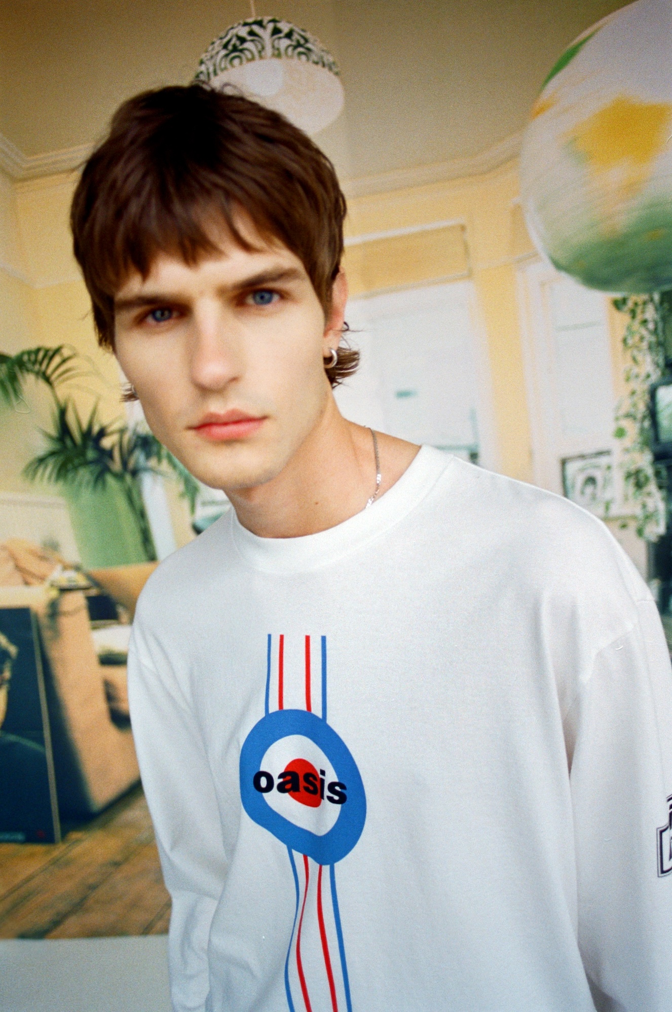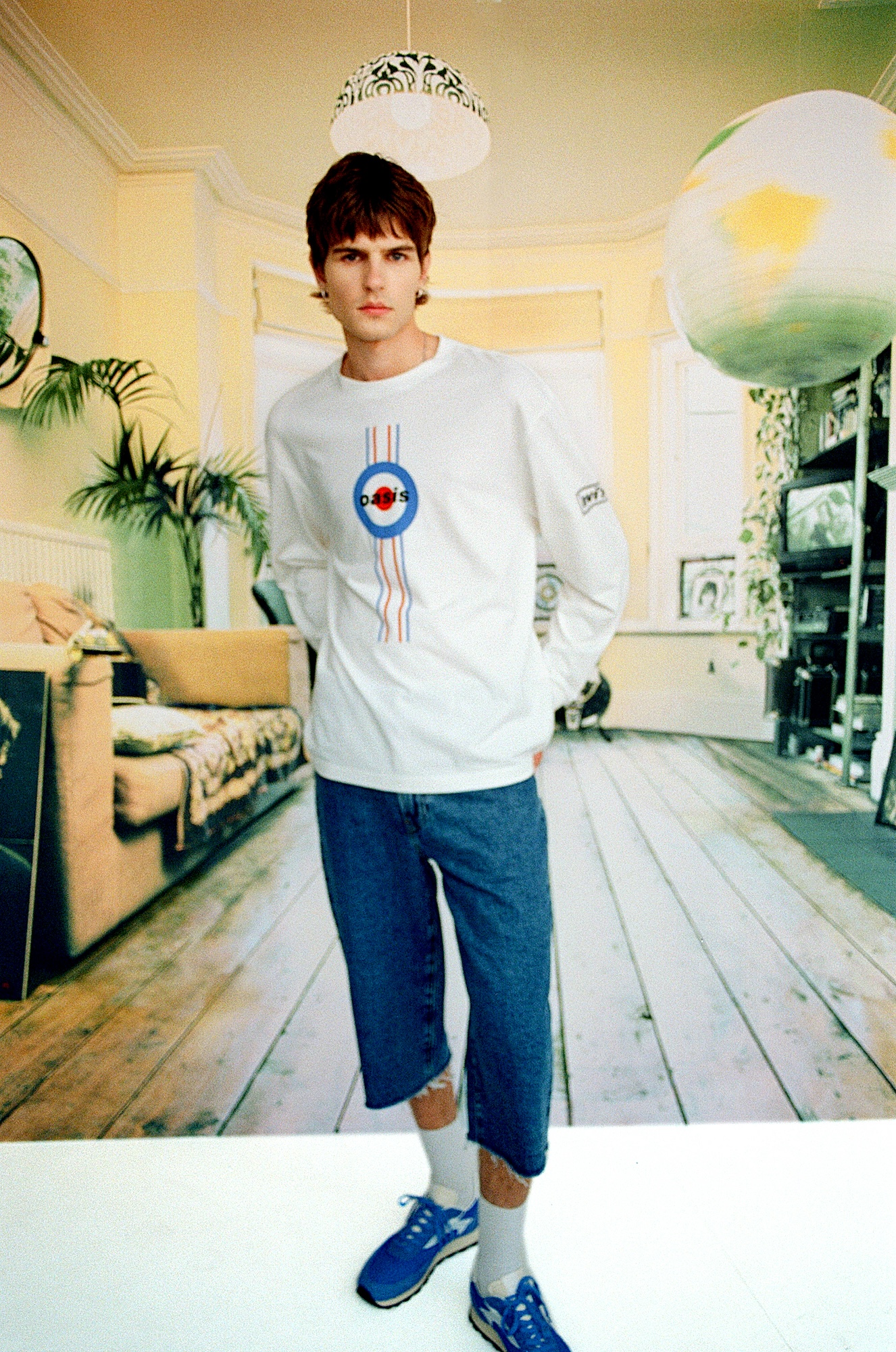 该系列还包含三款直接来自 Oasis 衣橱的牛仔单品。最抢眼的派克大衣致敬了 Liam Gallagher 的标志性风格,饰有 70 年代的橙色标签细节,袖子上还有 Oasis 的刺绣。卡车司机夹克的灵感源自 Levi’s 为 Oasis 1996 年 Knebworth 演出制作的那件。曼城队配色的衬衫则致敬了乐队的家乡。另外,本次型录也由 Oasis 最著名专辑封面的设计师 Michael Spencer Jones 掌镜。