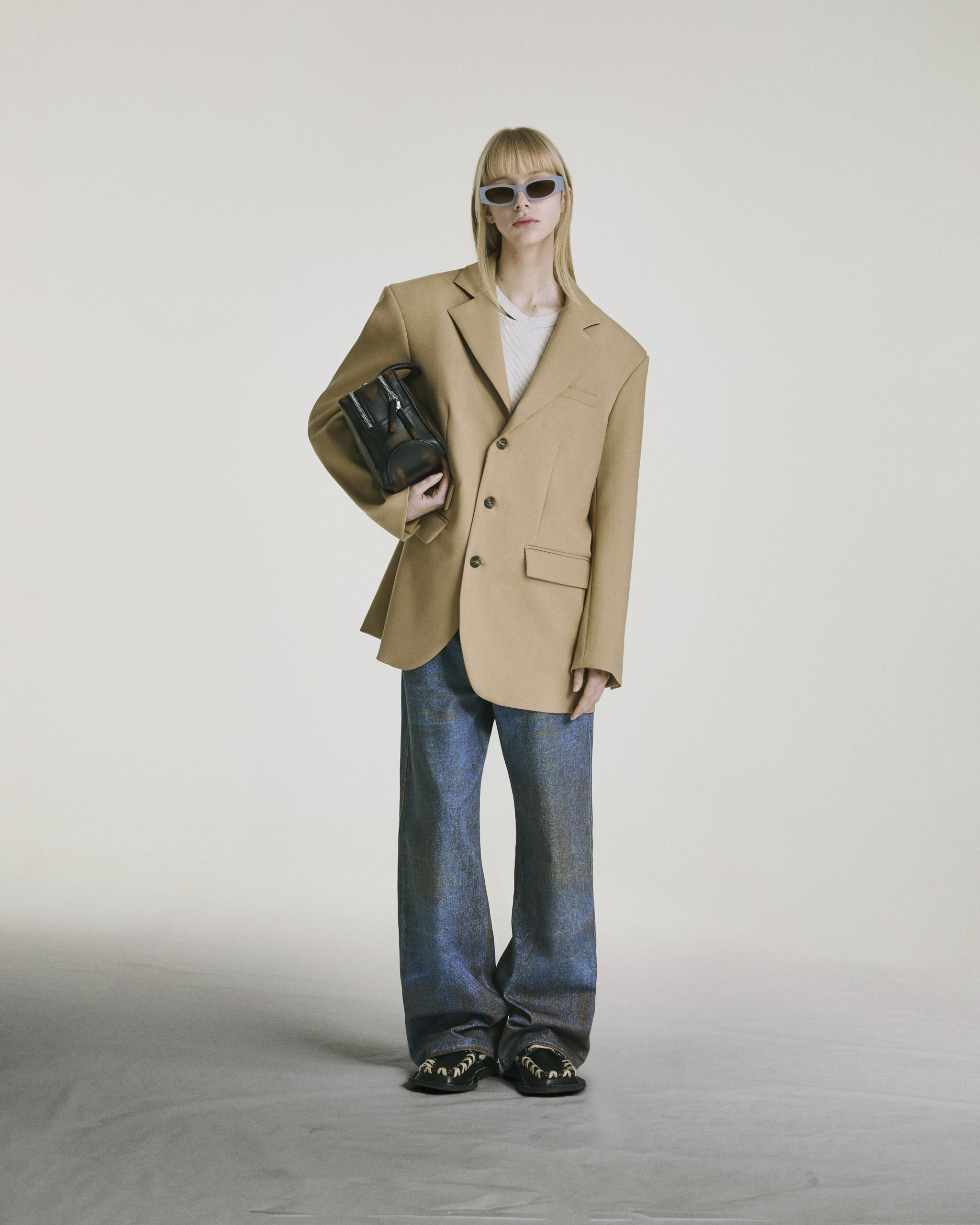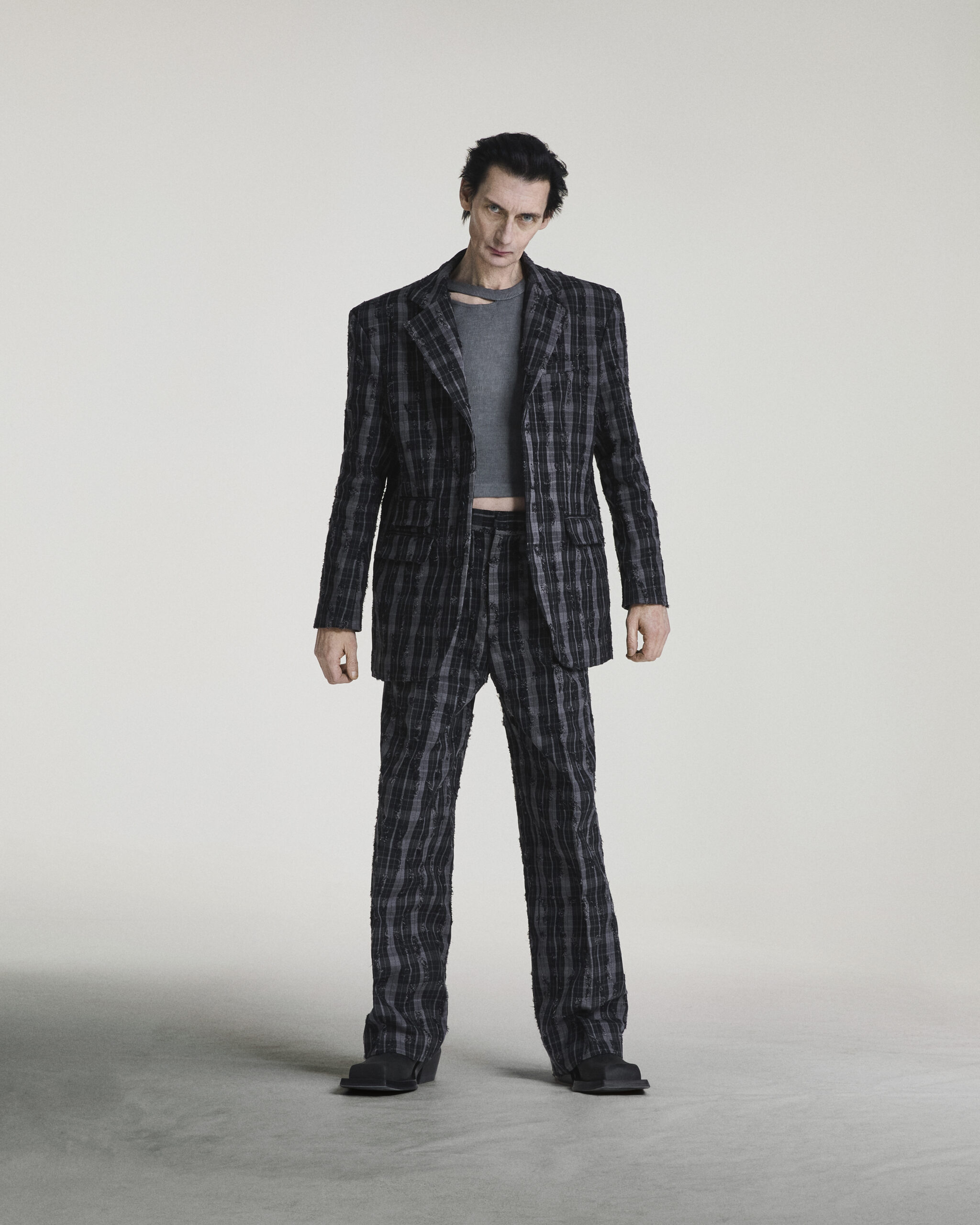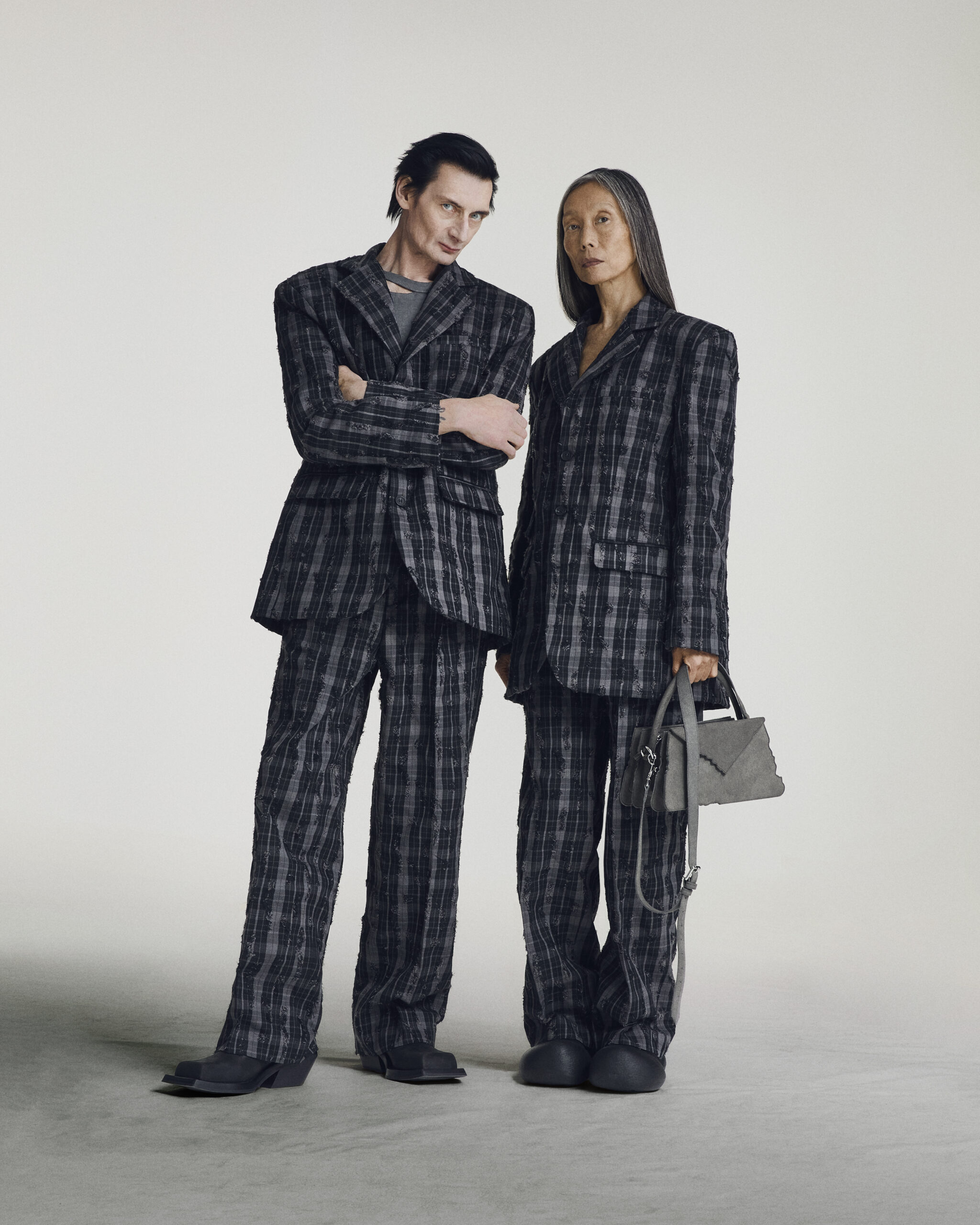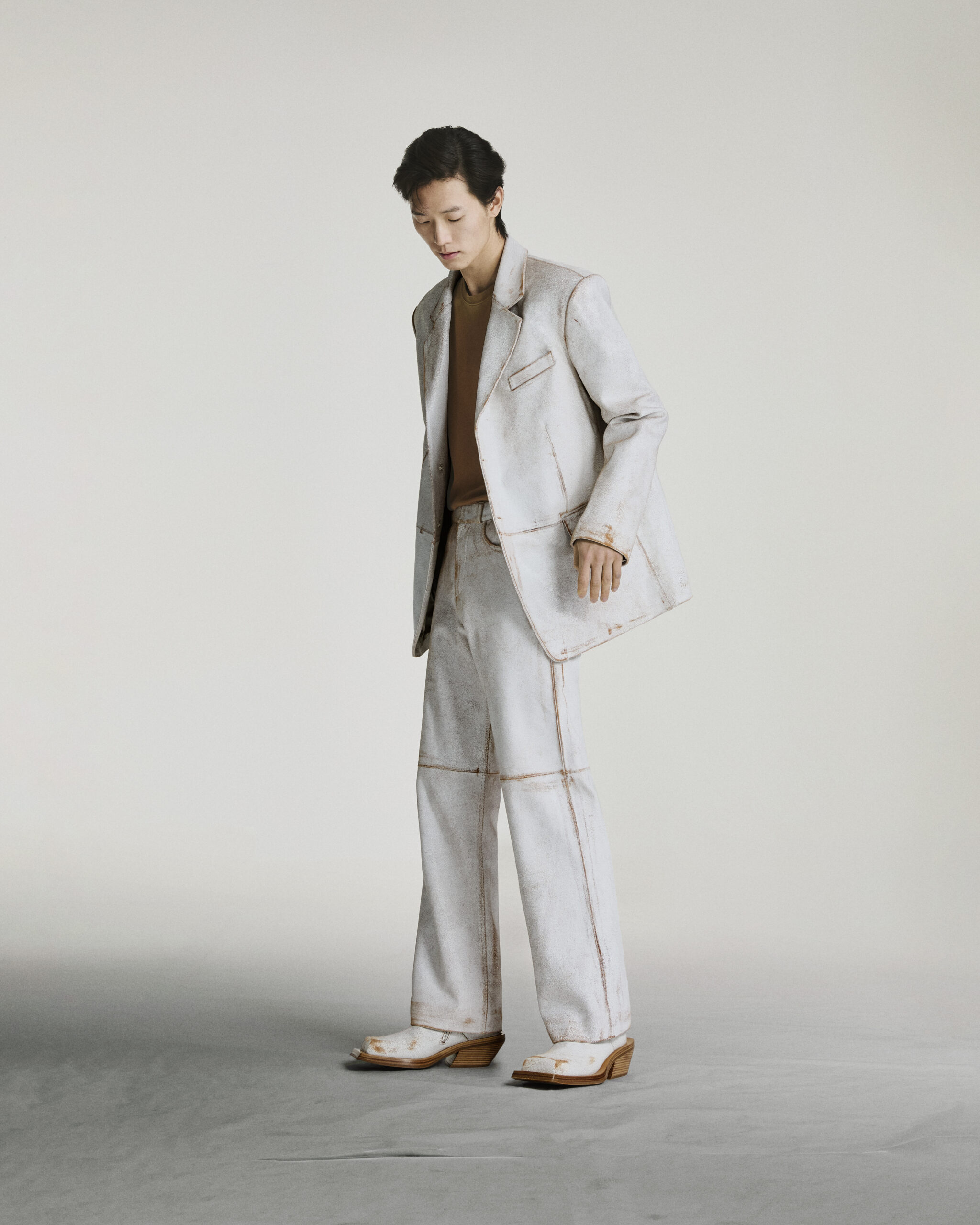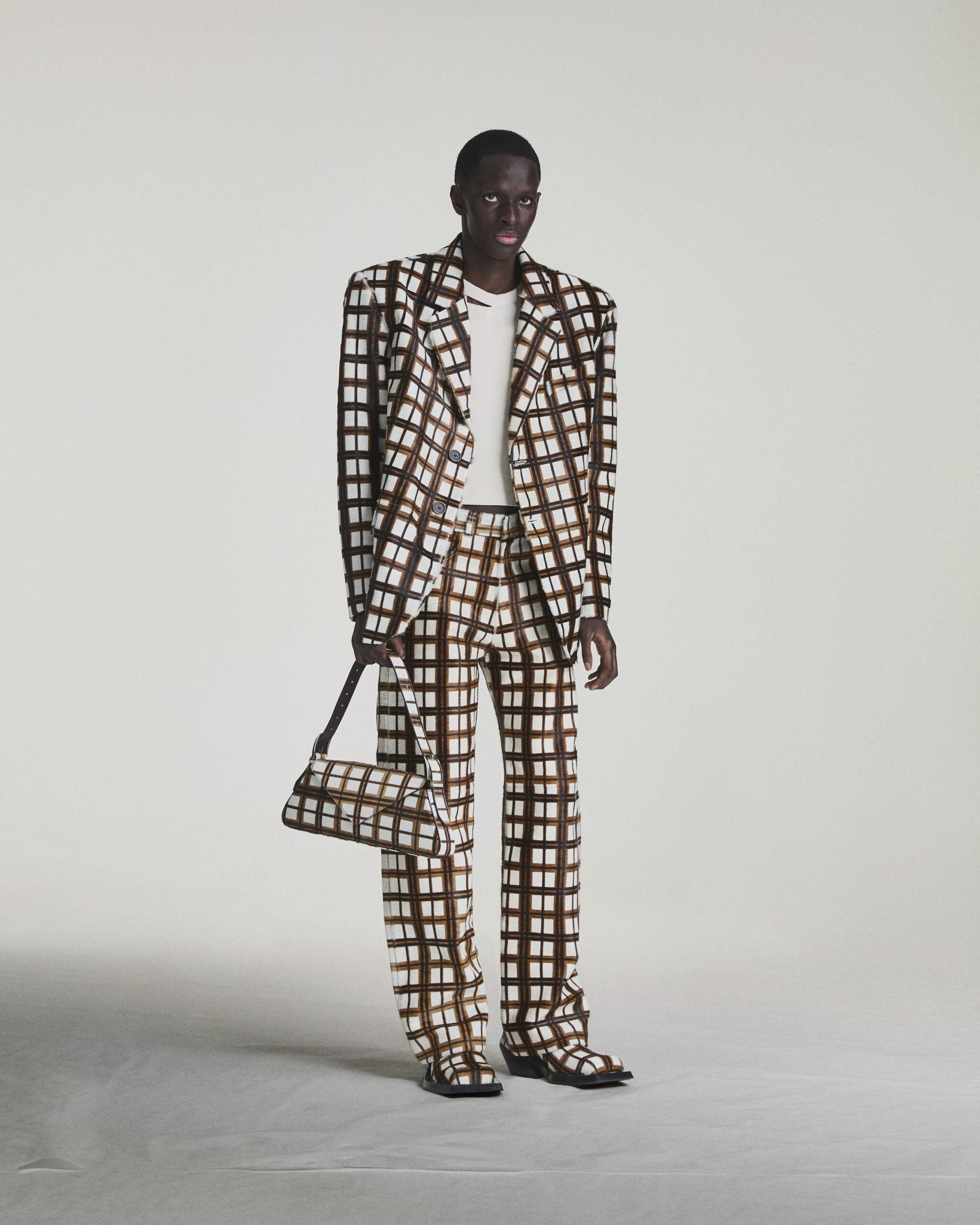 本季,CAMPERLAB 推出两款独特西装套装:棕白格纹毛面皮革款与赤陶色底纹裂痕纹理皮革款,既可单独穿着也可混搭。结构感单排扣西装外套,搭配中腰直筒长裤,巧妙平衡正装与休闲风格;与 Quetal 或 Vamonos 鞋履系列相配,呈现前卫造型。
