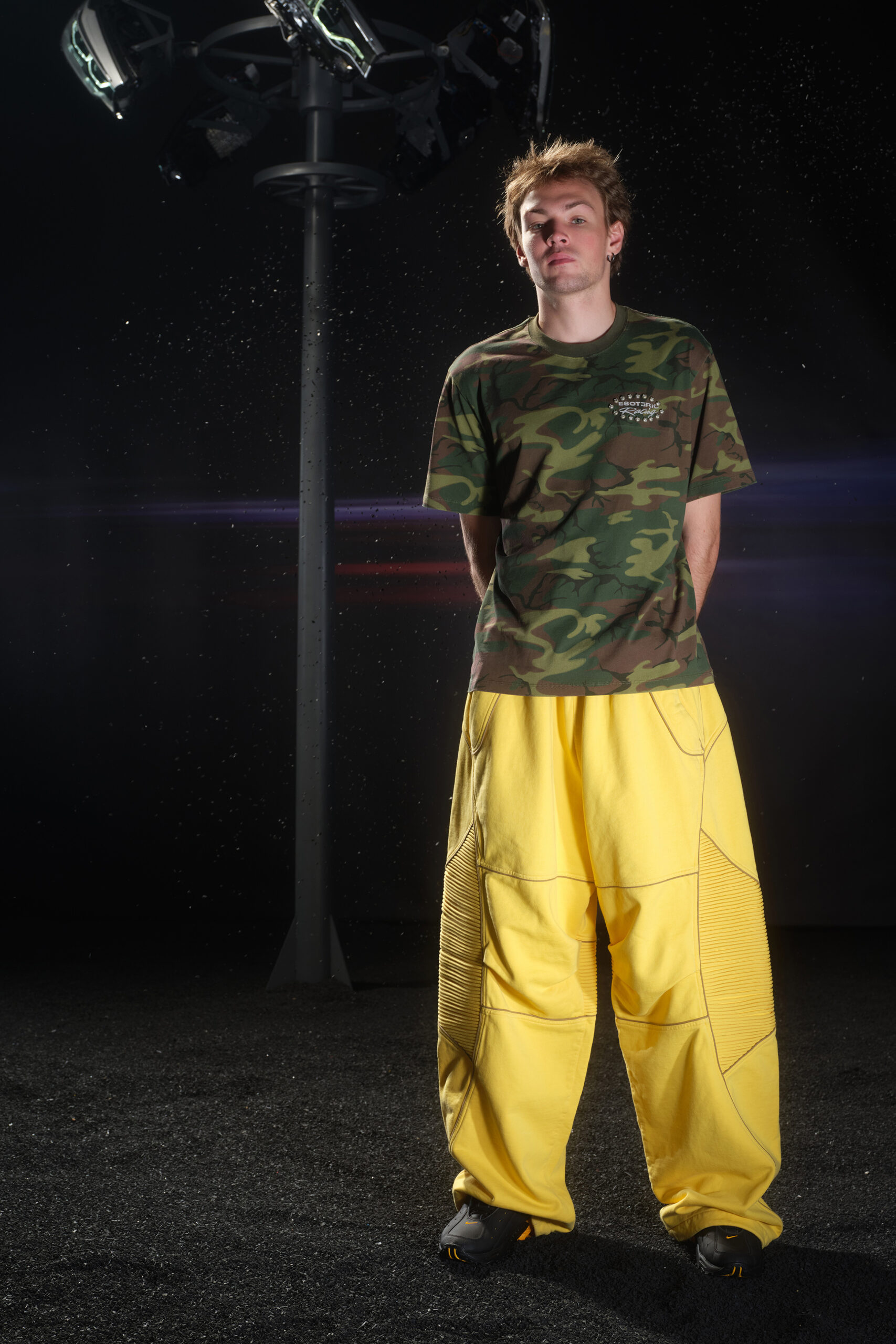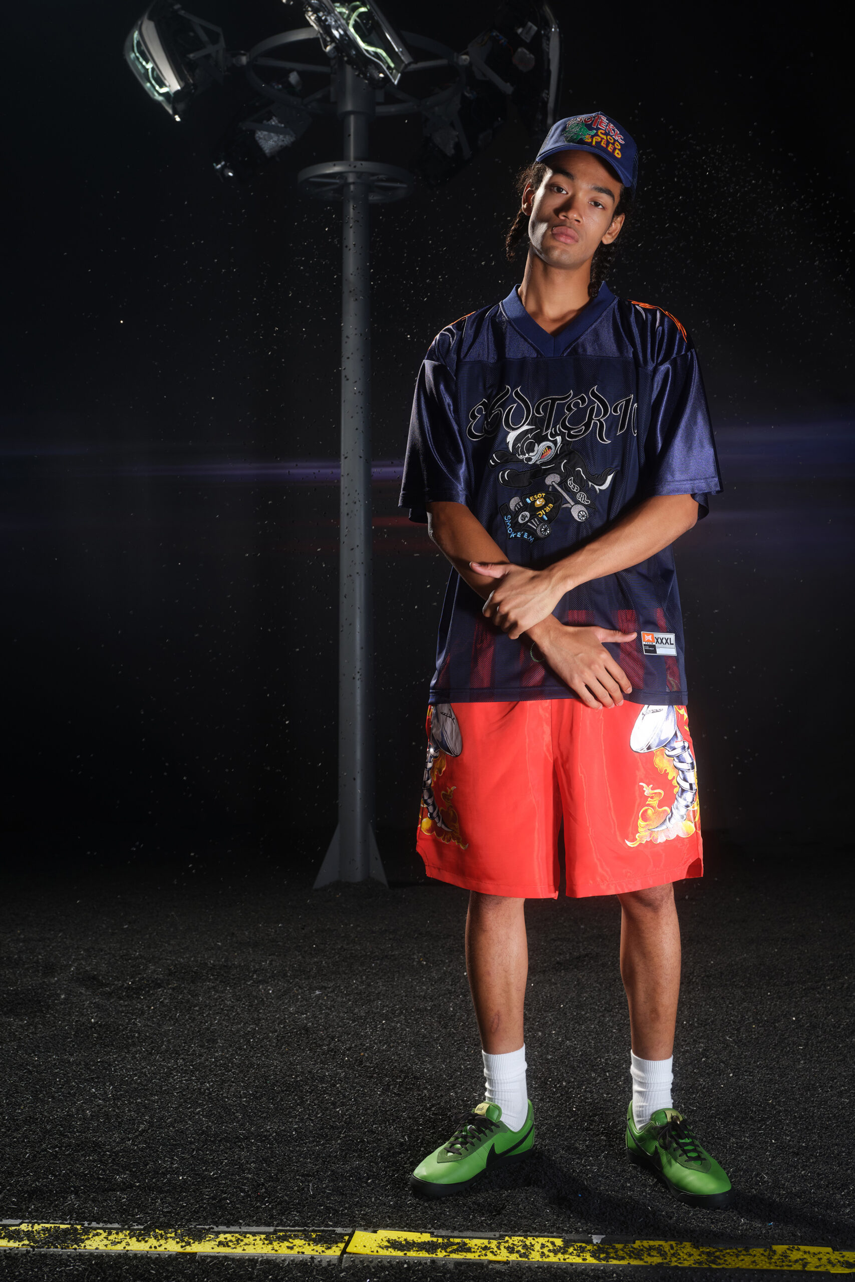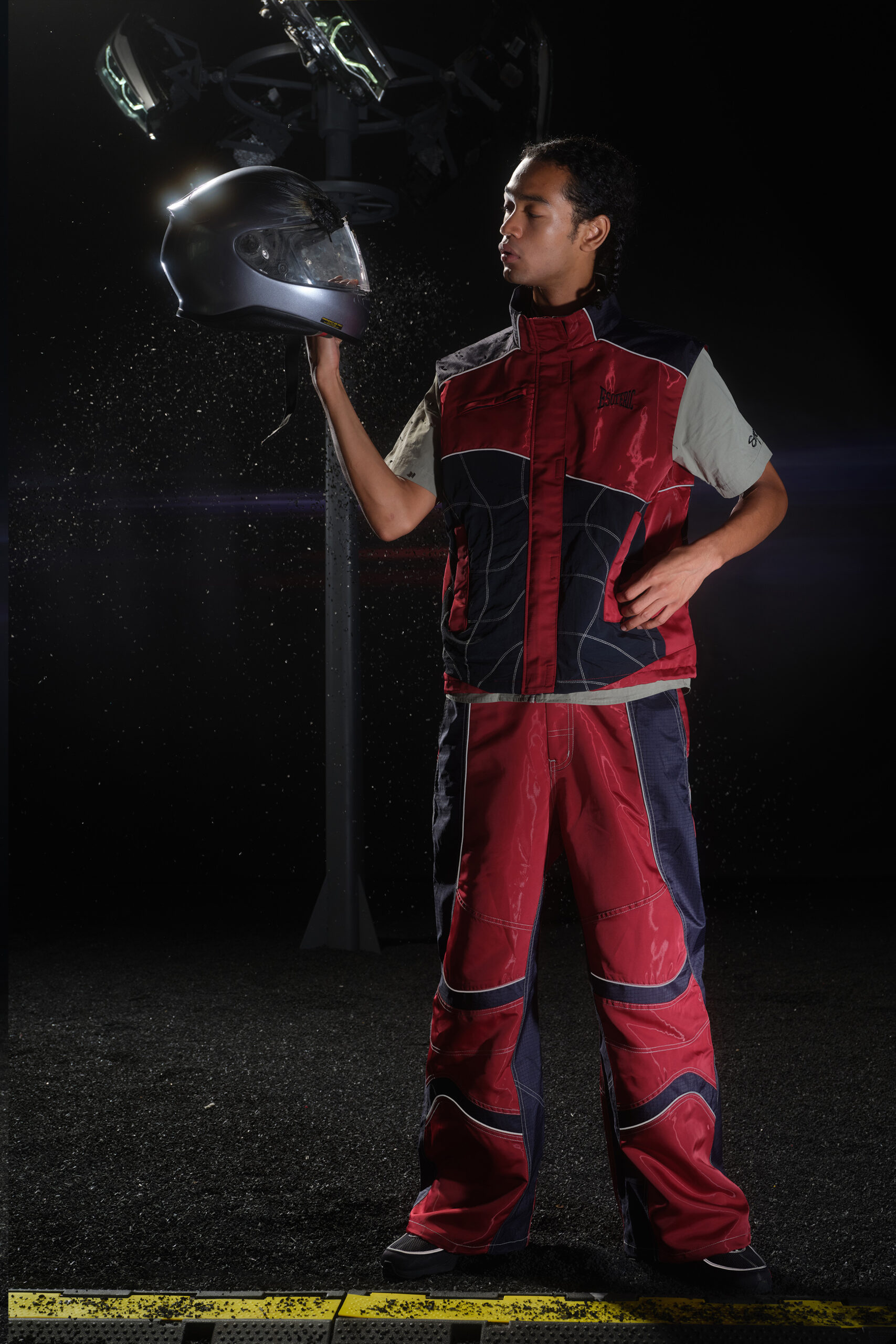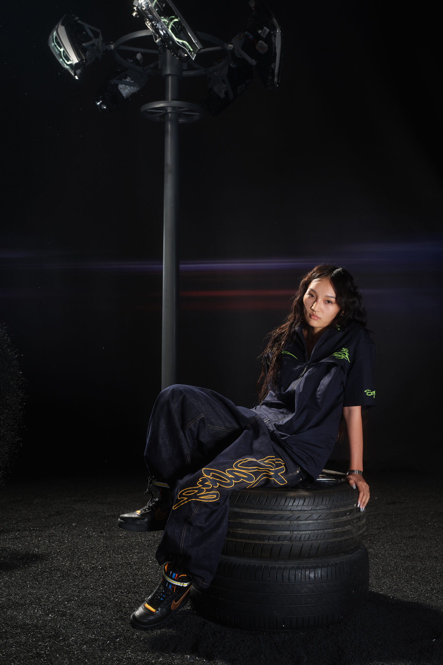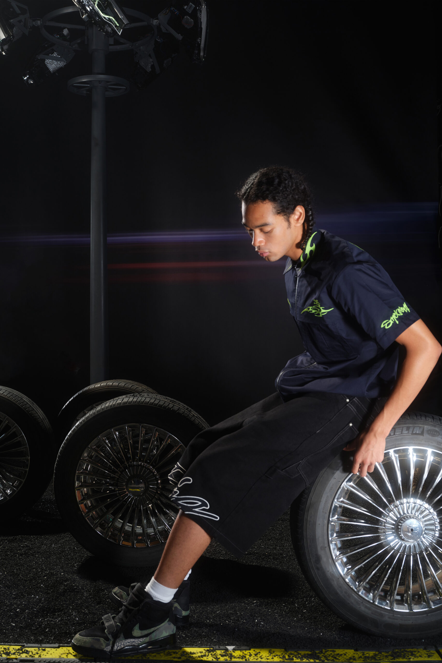 除去 T 恤品类外的其他上装单品也同样瞩目,POLY 贴布刺绣橄榄球球衣采用带有复古感的网眼拼布面料,以 TPU 刺绣工艺呈现涂鸦艺术家 Alfonso Juarez 为 ESOTERIC 创作的图案作品;刺绣维修组工装衬衫以经典赛工作服为蓝本,利用锁链绣工艺搭配图案内容提升产品质感;坎肩背心以刺绣工艺集中展现带有强烈竞速风格的主题图案;3M 反光赛车马甲使用光泽感面料结合不规则裁片体现速度感;满印 POLY 睡衣衬衫则使用包容性的款式承载品牌标识性的形象图案传递轻松随意的情绪体验,其中刺绣坎肩背心、反光赛车马甲与满印 POLY 睡衣衬衫均带有配套下装。