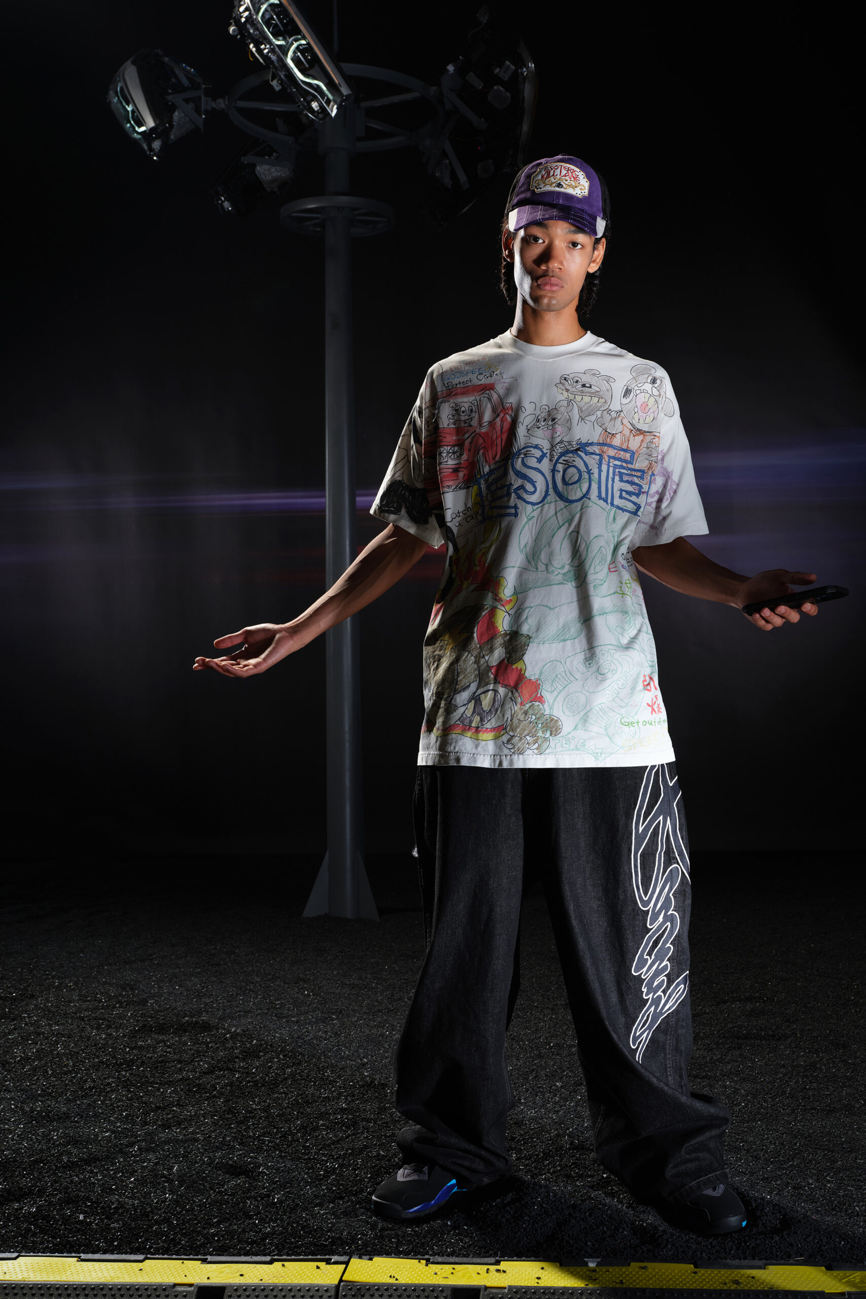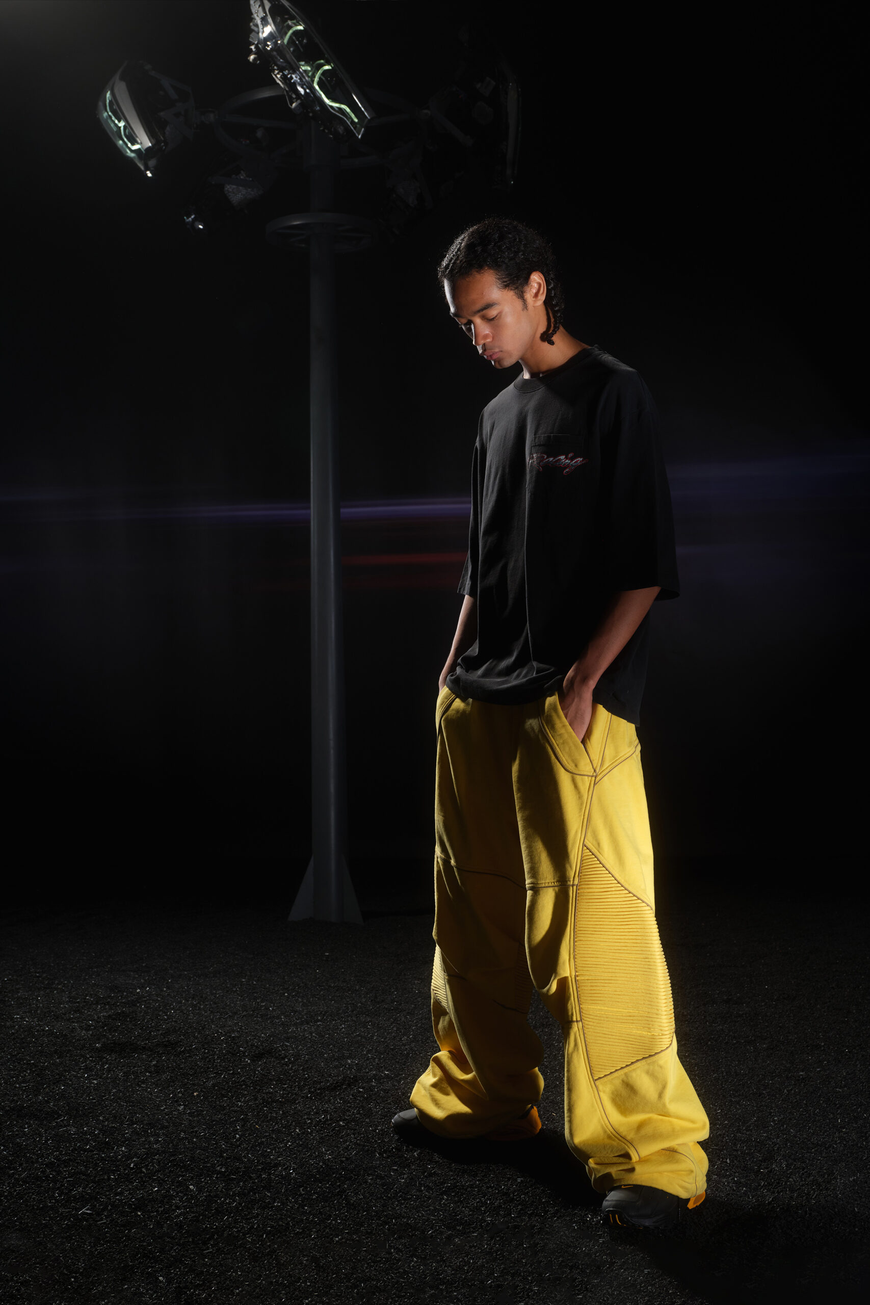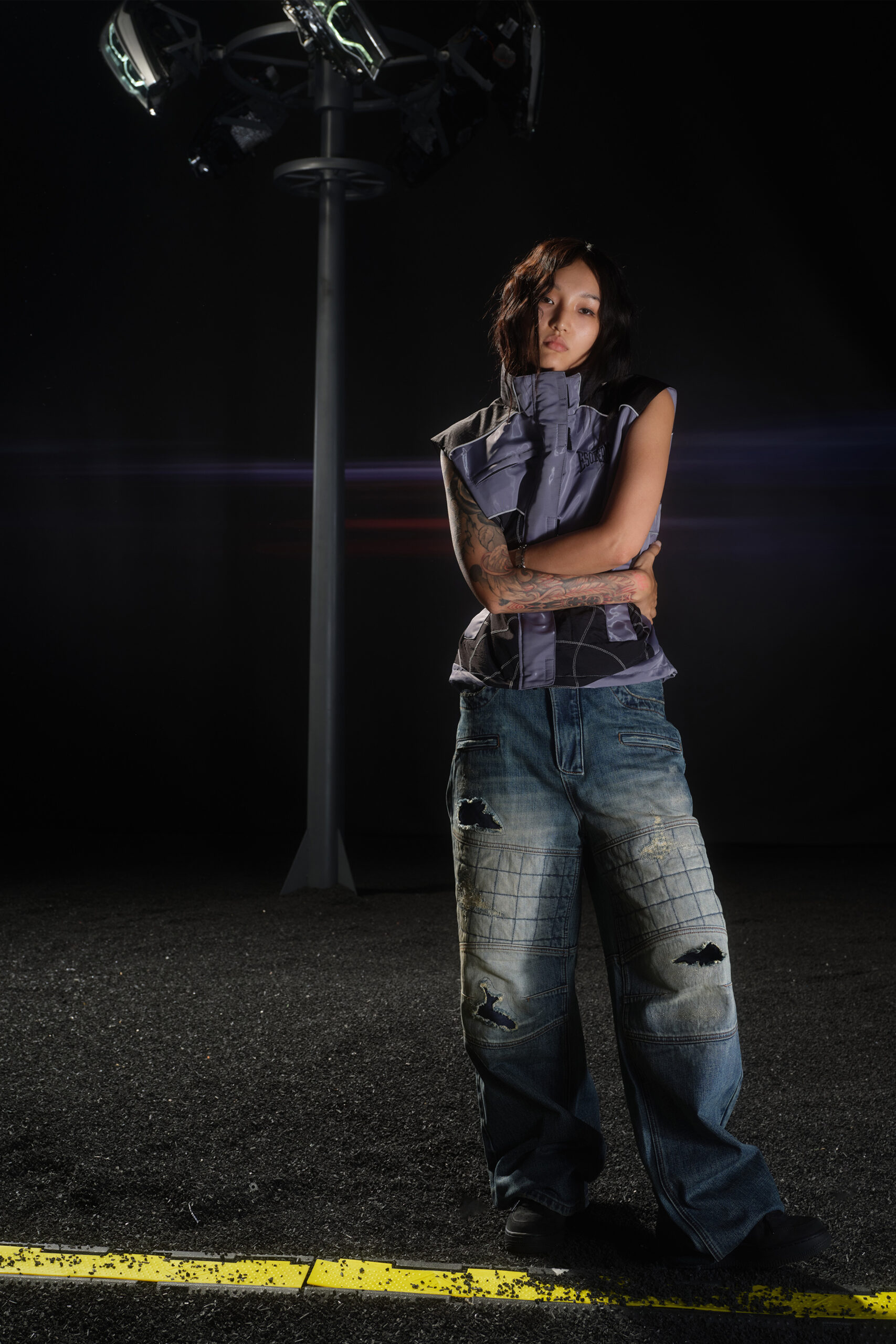 系列裤装依旧围绕街头与竞速展开,竞速刺绣原色牛仔裤采用大幅「Racing」字体设计凸显主题,辅以撞钉与后腰五金丰富细节,相同面料的牛仔七分裤更改了字体设计,在后方新增刺绣图案,更适合夏日穿着;火焰钉金属尼龙短裤将铆钉印花图案与经典拳击短裤设计结合,在复古感受中传递新颖体验;两段式拆卸裤采用宽松军裤版型,通过迷彩与格纹两款配色设计达到不同上身内容;最重磅的反光结构机车卫裤将经典赛车裤结构融入宽松廓形,并通过反光线条强化竞速风格;机车牛仔裤采用相同思路,在赛车结构上配合破坏、水洗工艺,实现了速度感与街头风格的碰撞融合。