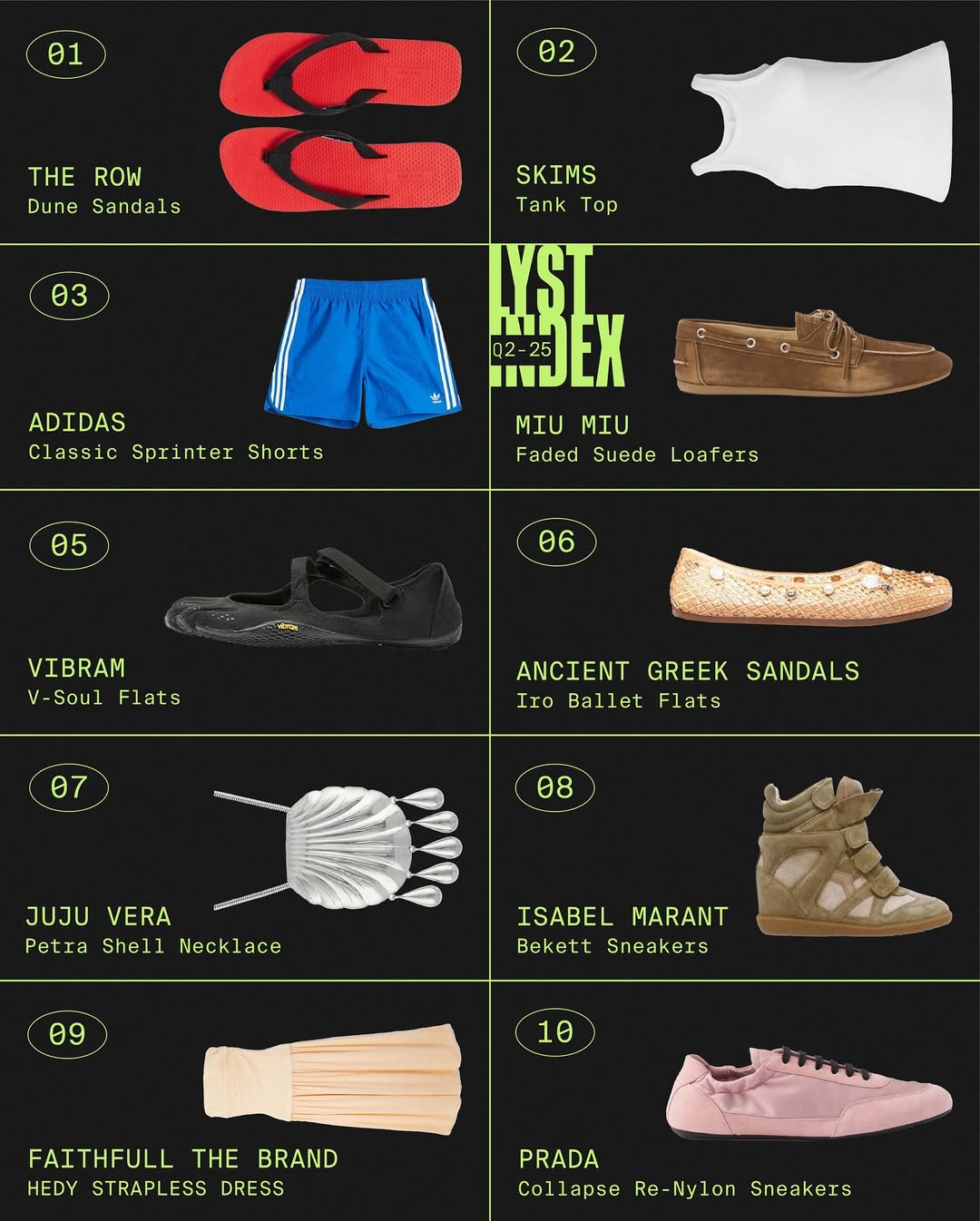 本季度最热门单品由 THE ROW 的 Dune 凉鞋夺得,极简夹脚拖因明星穿搭而从基础款跃升为风格标志。adidas 的复古短裤借助名人效应与亲民售价跻身第三,Miu Miu 的麂皮乐福鞋则将校园风格带入主流视野。此外,Juju Vera 的贝壳项链唤起手工情感共鸣,Isabel Marant 坡跟运动鞋借 TikTok 势能回潮,Vibram FiveFingers 强化功能与时尚融合。Jacques Marie Mage 墨镜凭借叙事性设计亦成为本季热门配件,鞋履和配饰占据榜单主导地位。