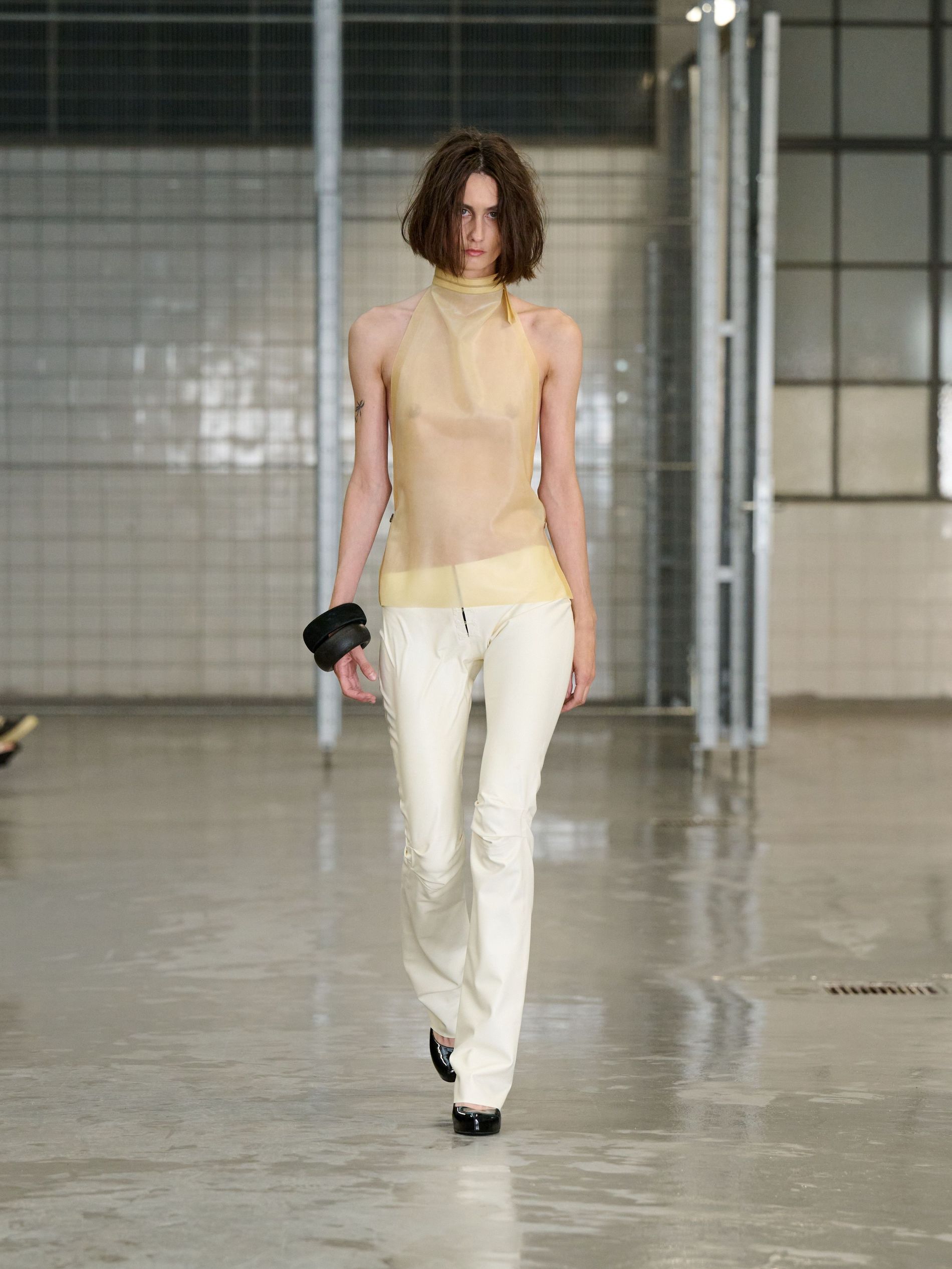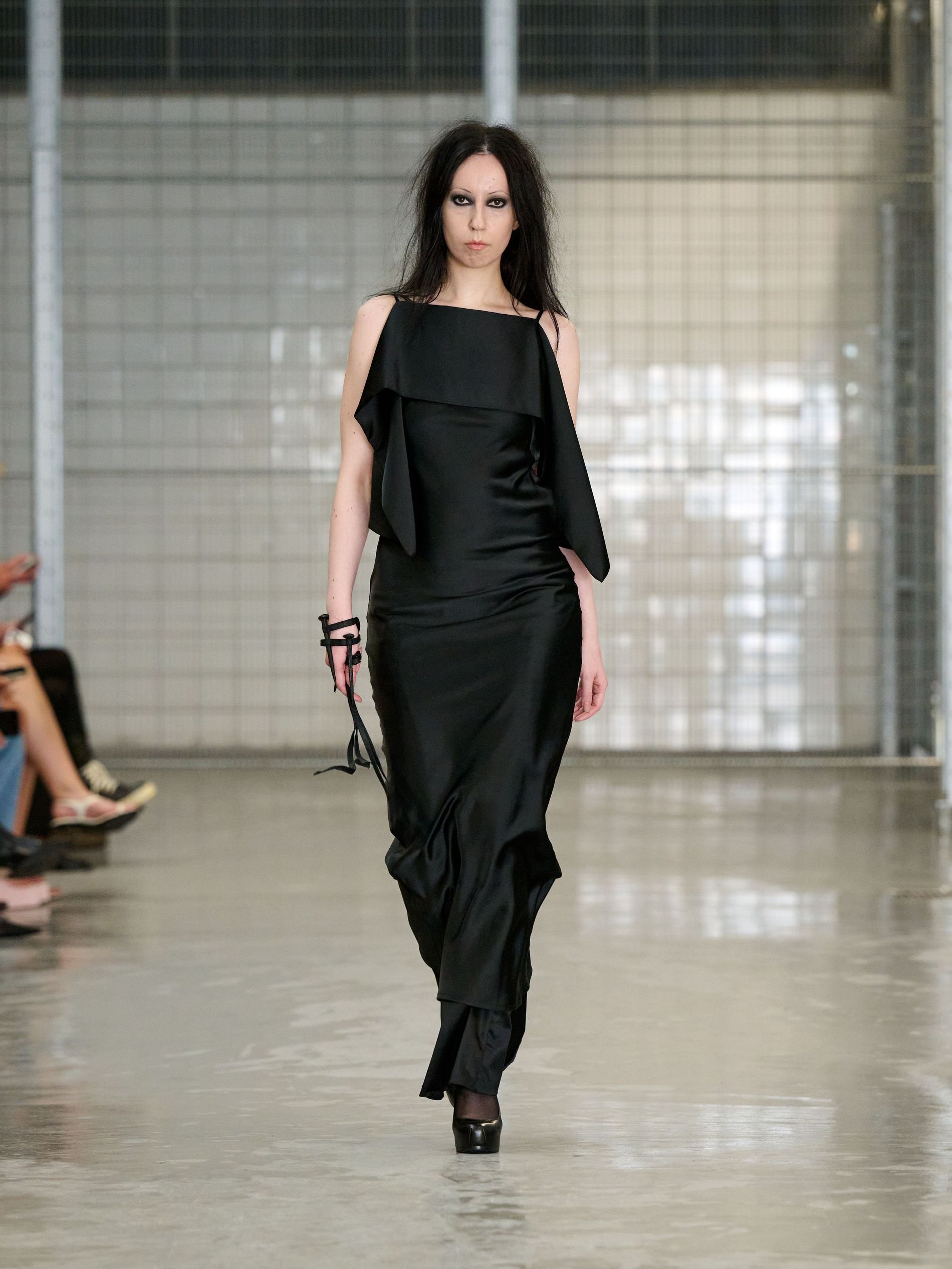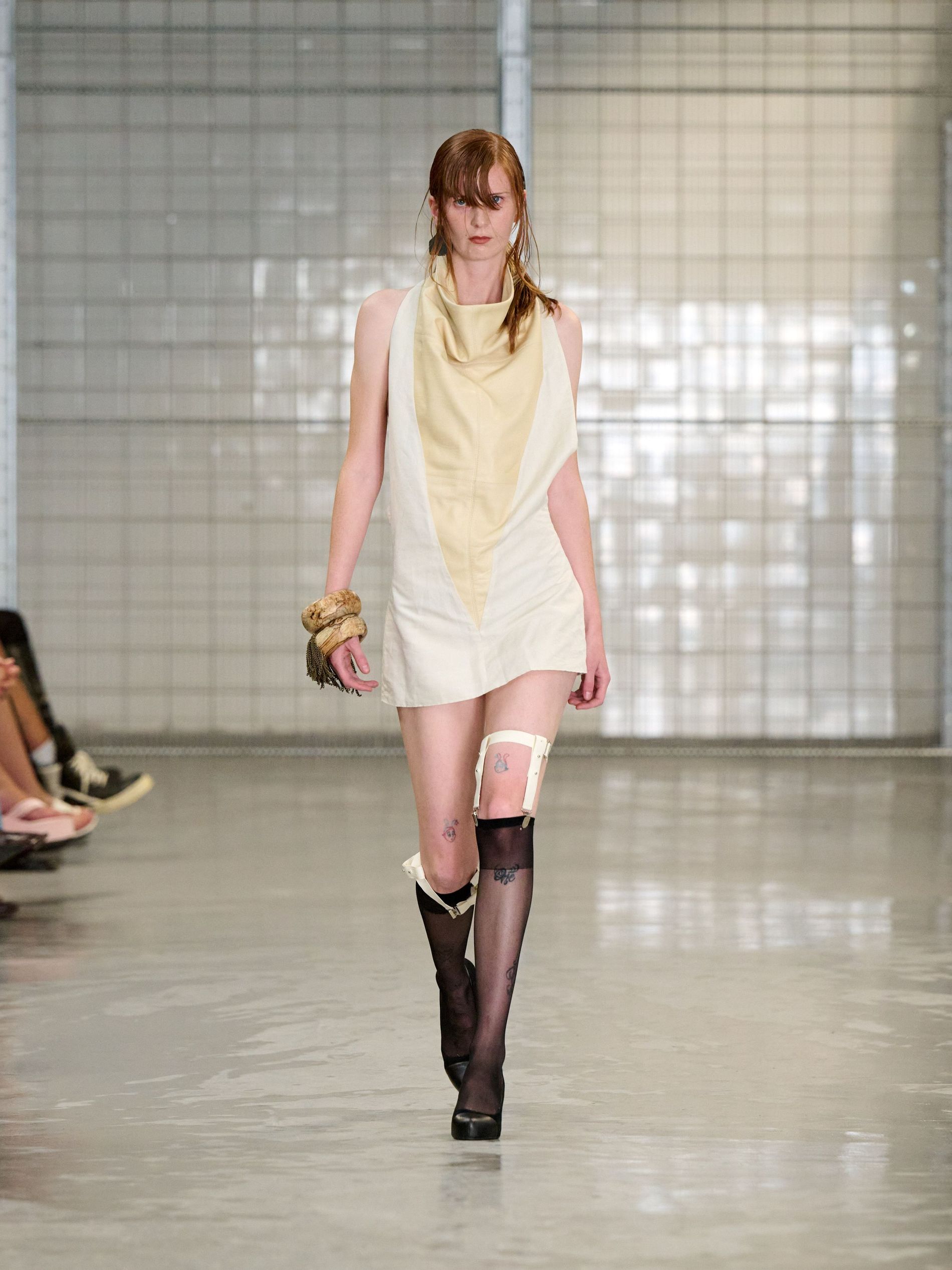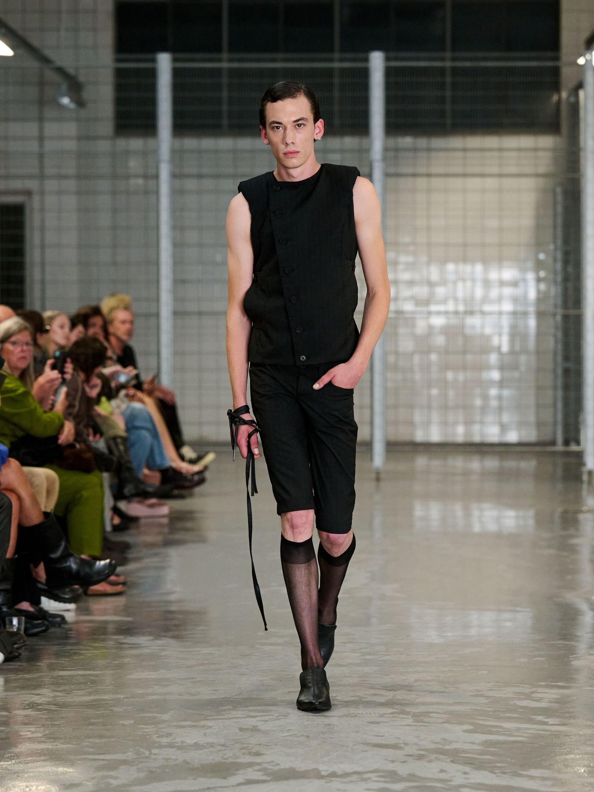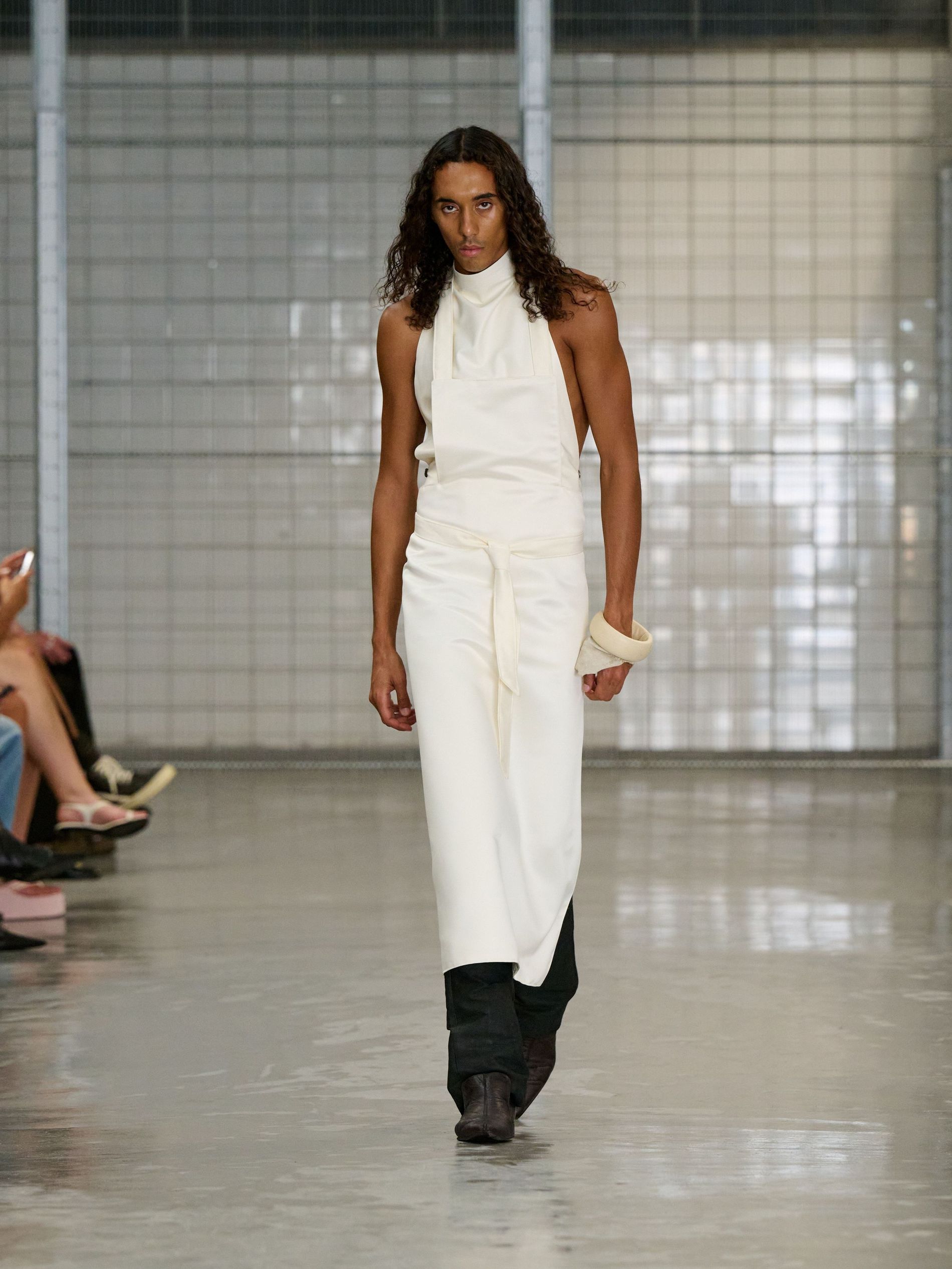 模特们在冷峻的秀道上缓步前行,身着无袖西装、皮革短裤叠搭透视丝袜、轻薄纱质上衣等造型,在实用主义的严厉感与凌乱的原始气质之间来回游走。白色挂脖长衫配黑色长裤,呈现近乎仪式化的极简风格;而不对称剪裁的亚麻吊带裙则以纸质般的脆弱质感,传递触感上的对比与不安。