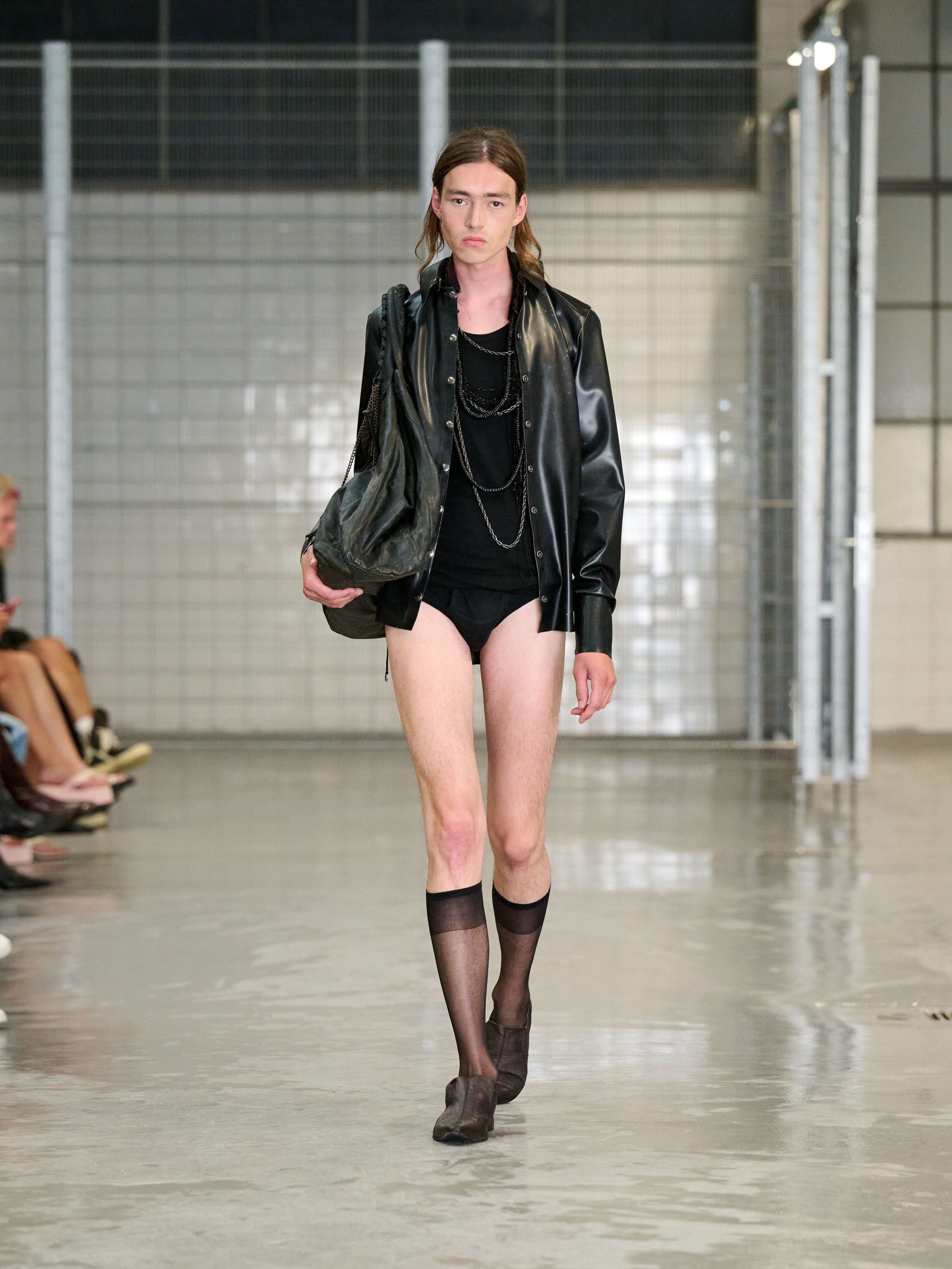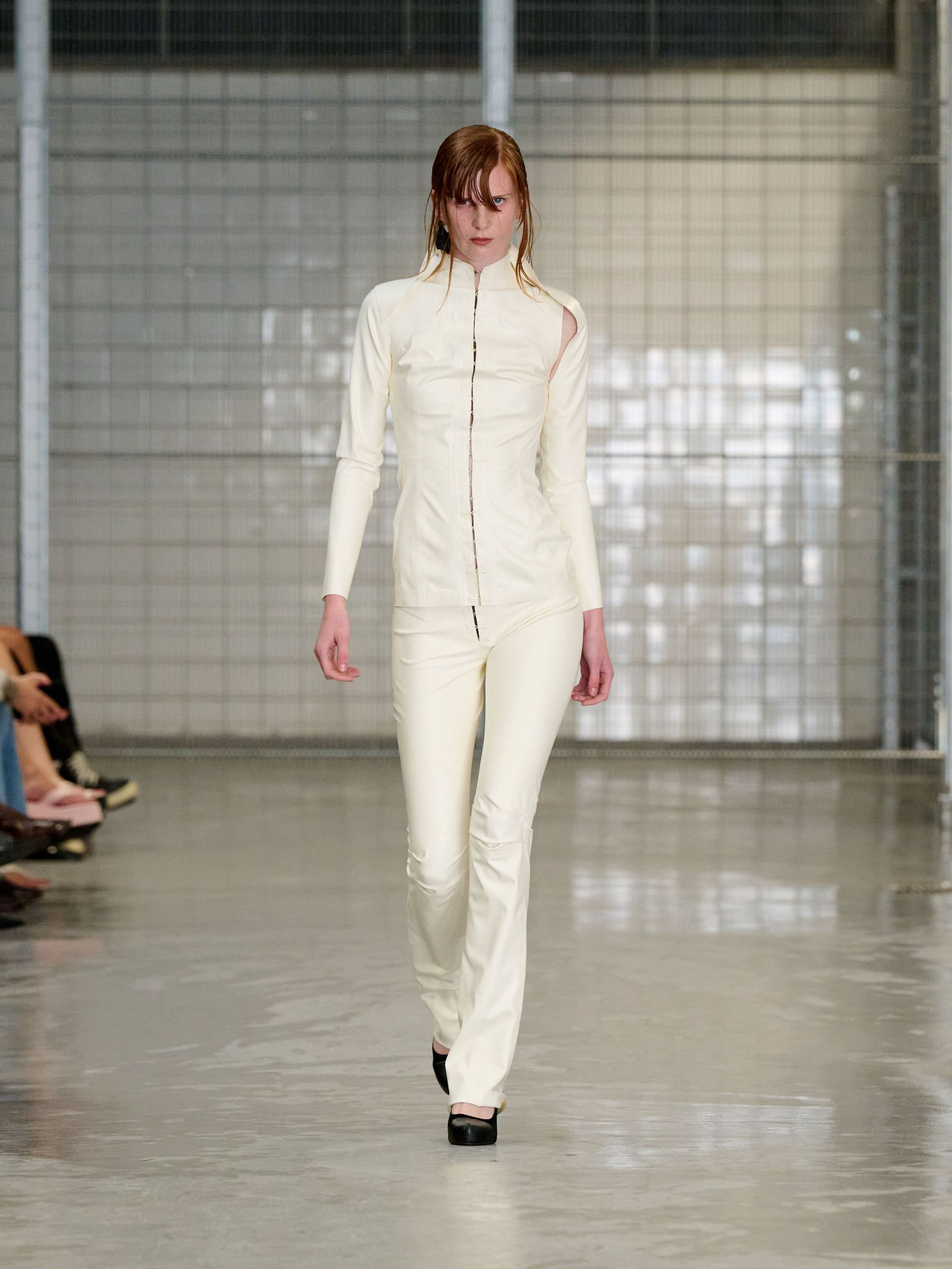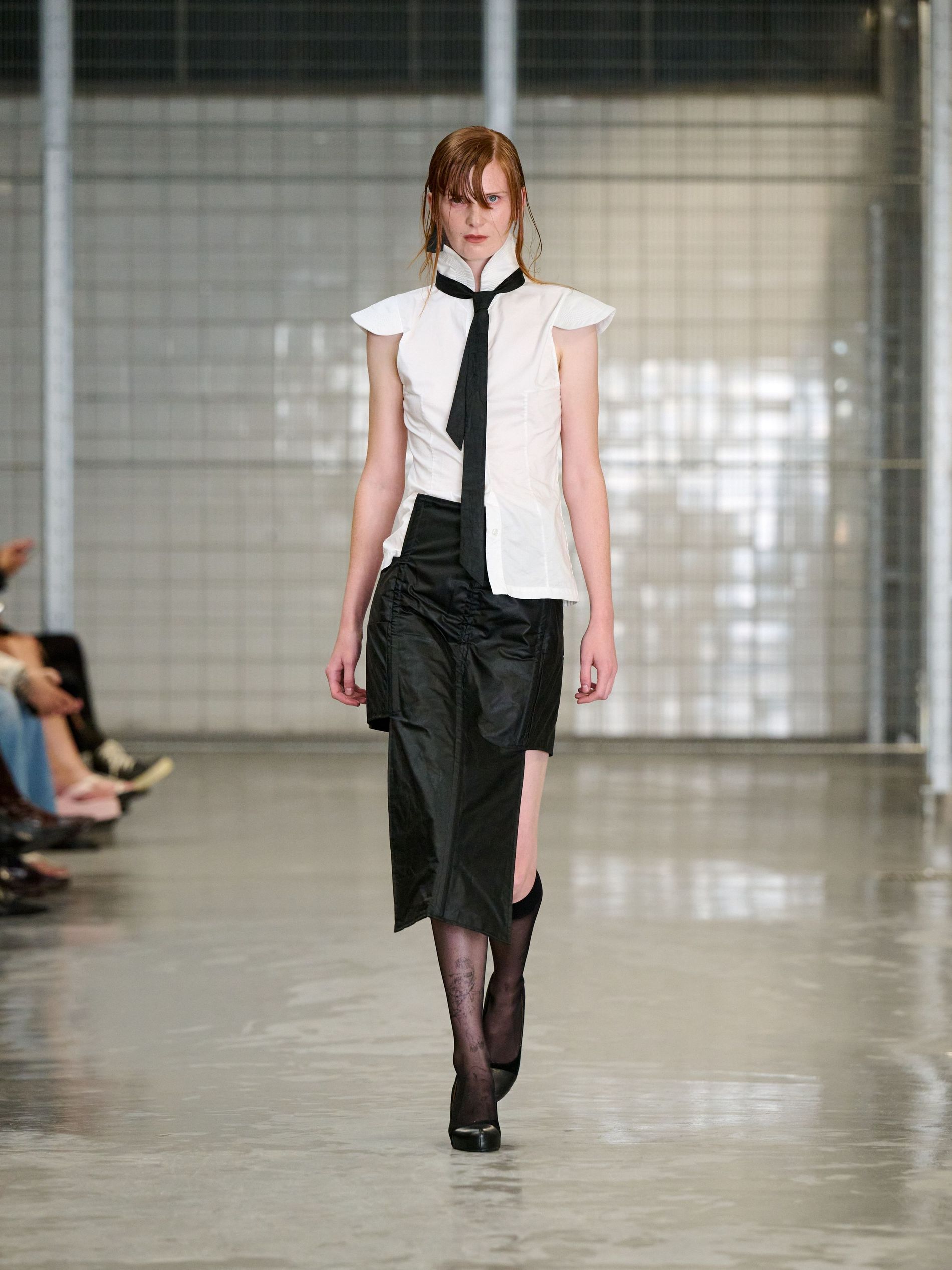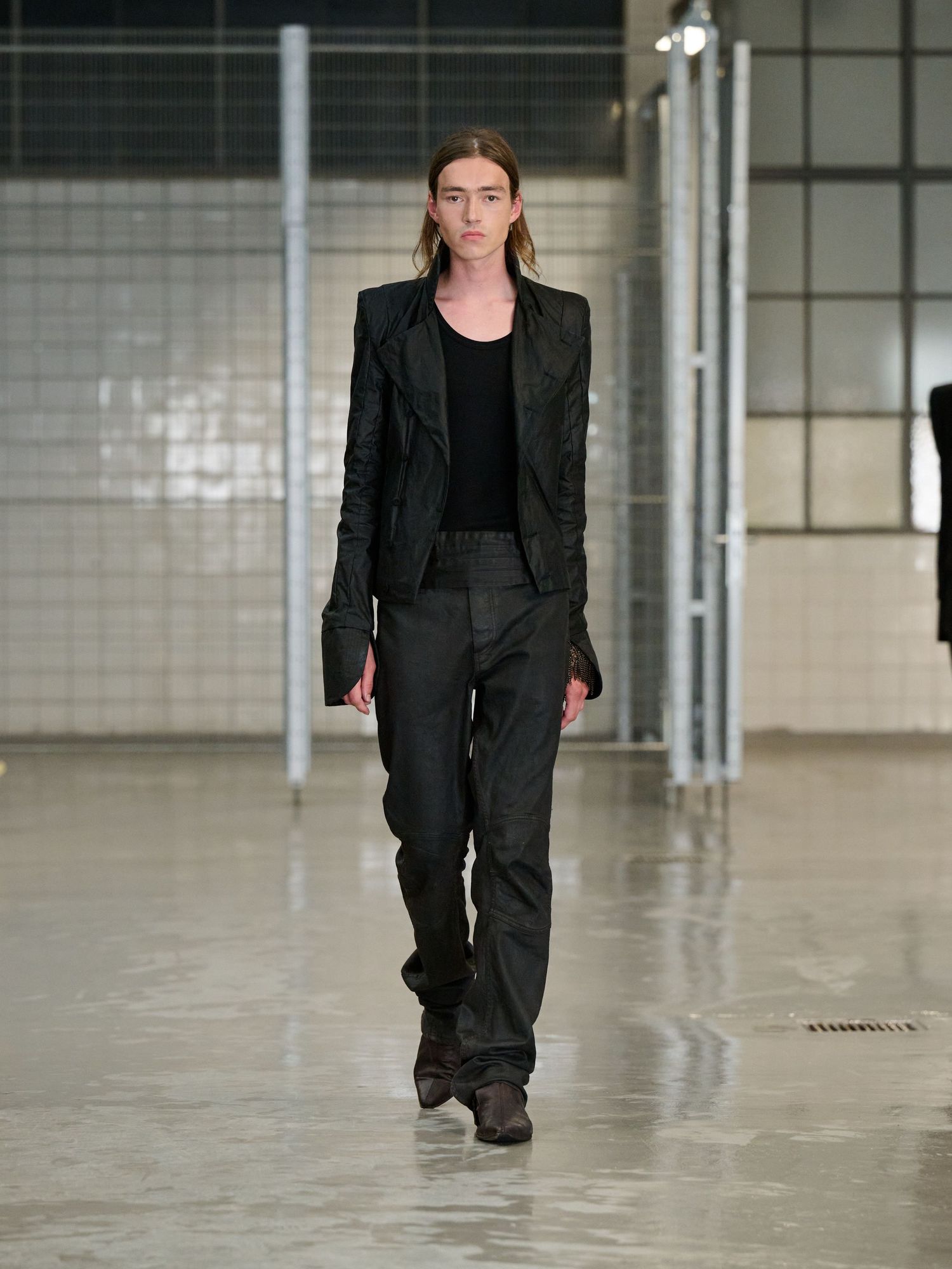 模特们在冷峻的秀道上缓步前行,身着无袖西装、皮革短裤叠搭透视丝袜、轻薄纱质上衣等造型,在实用主义的严厉感与凌乱的原始气质之间来回游走。白色挂脖长衫配黑色长裤,呈现近乎仪式化的极简风格;而不对称剪裁的亚麻吊带裙则以纸质般的脆弱质感,传递触感上的对比与不安。
