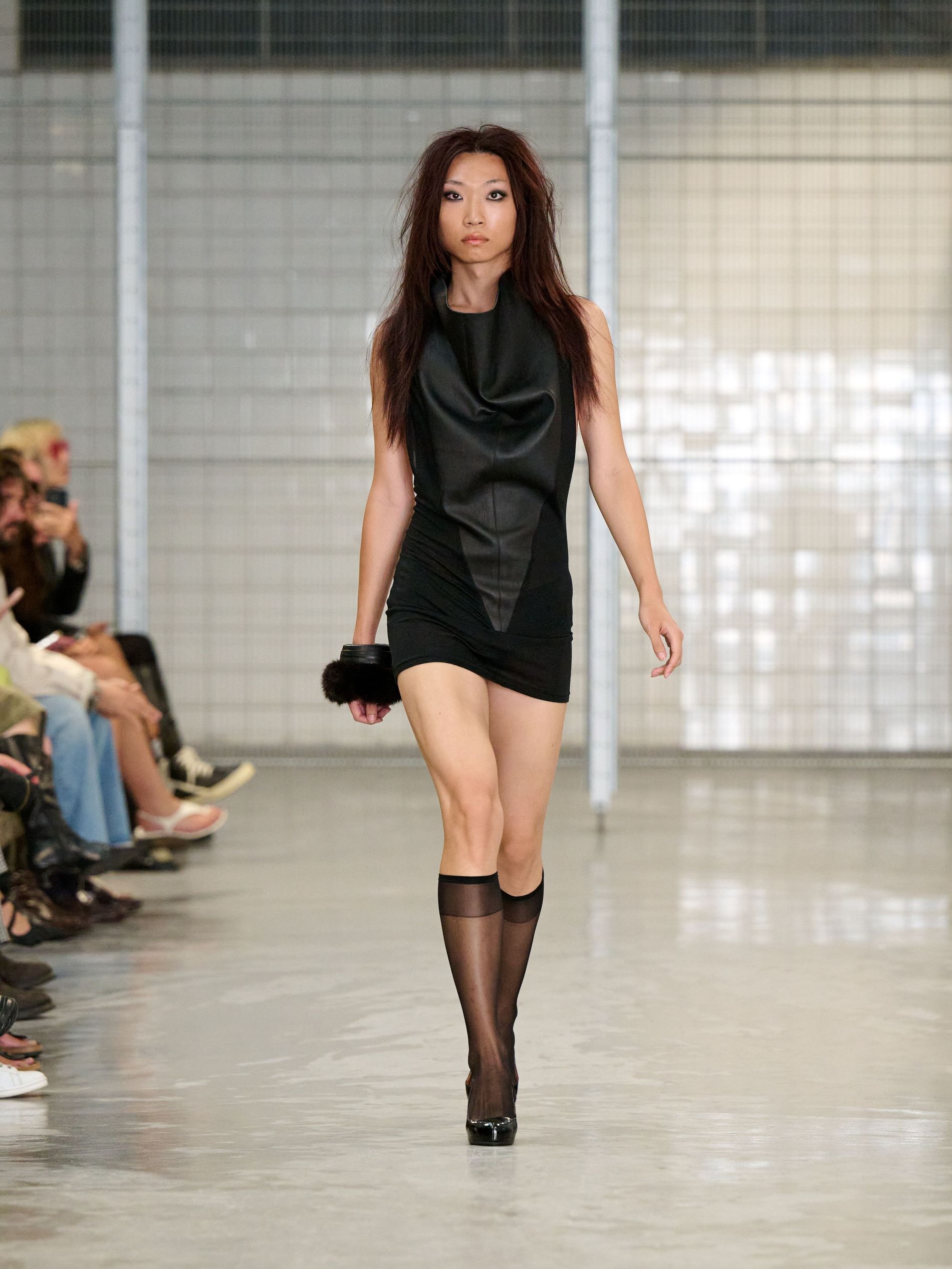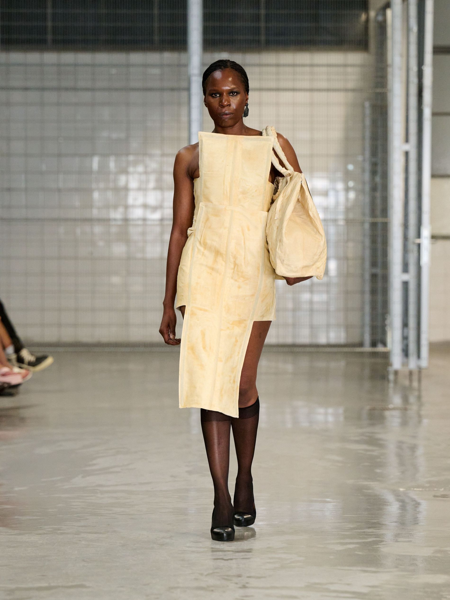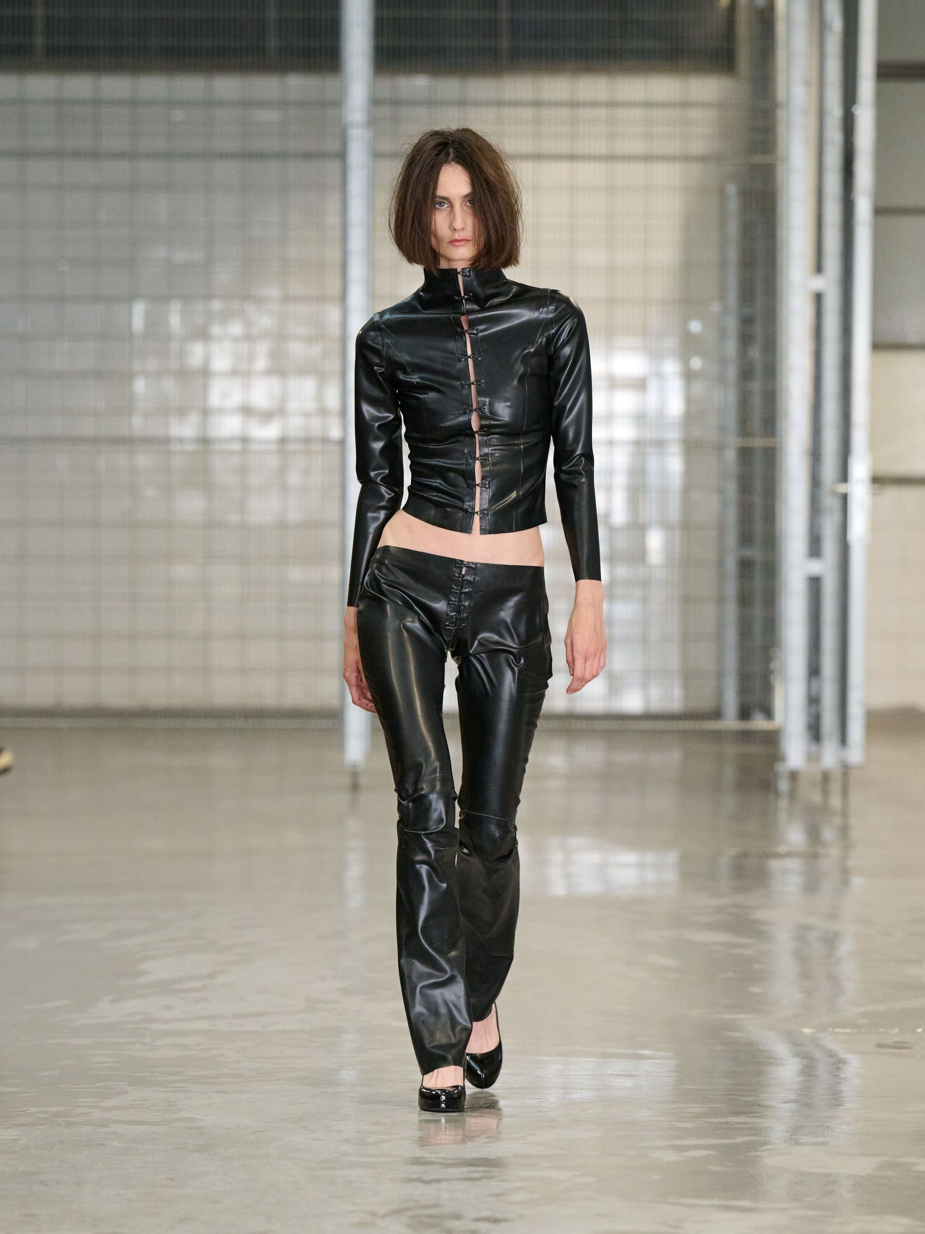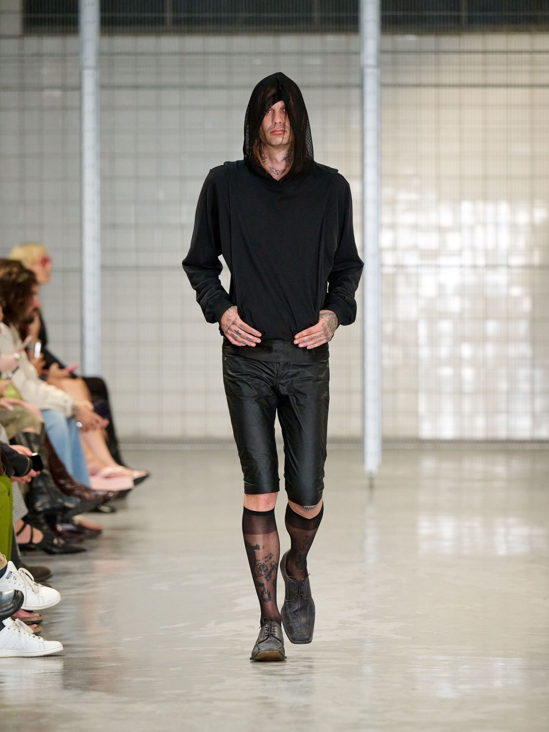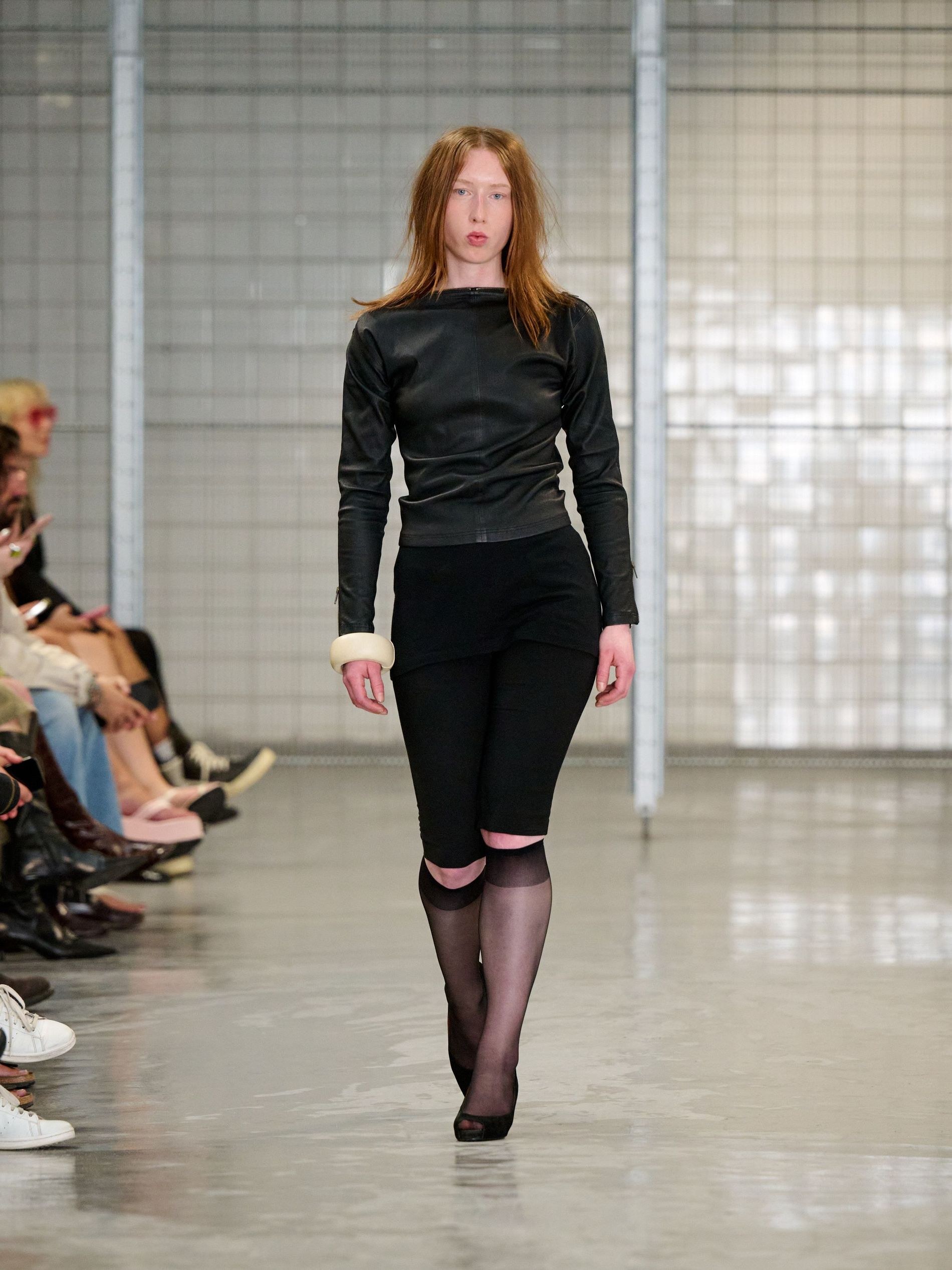 模特们在冷峻的秀道上缓步前行,身着无袖西装、皮革短裤叠搭透视丝袜、轻薄纱质上衣等造型,在实用主义的严厉感与凌乱的原始气质之间来回游走。白色挂脖长衫配黑色长裤,呈现近乎仪式化的极简风格;而不对称剪裁的亚麻吊带裙则以纸质般的脆弱质感,传递触感上的对比与不安。