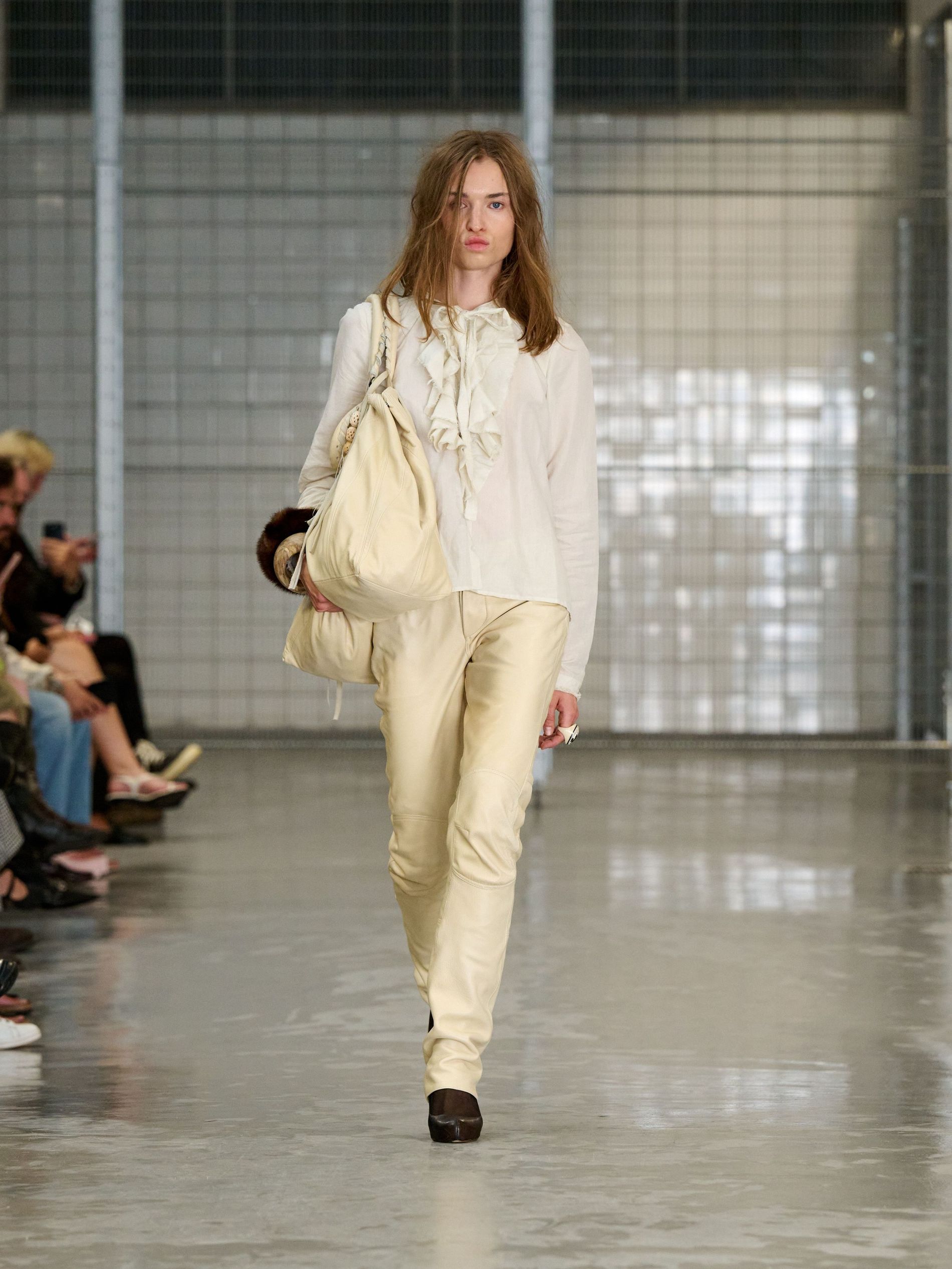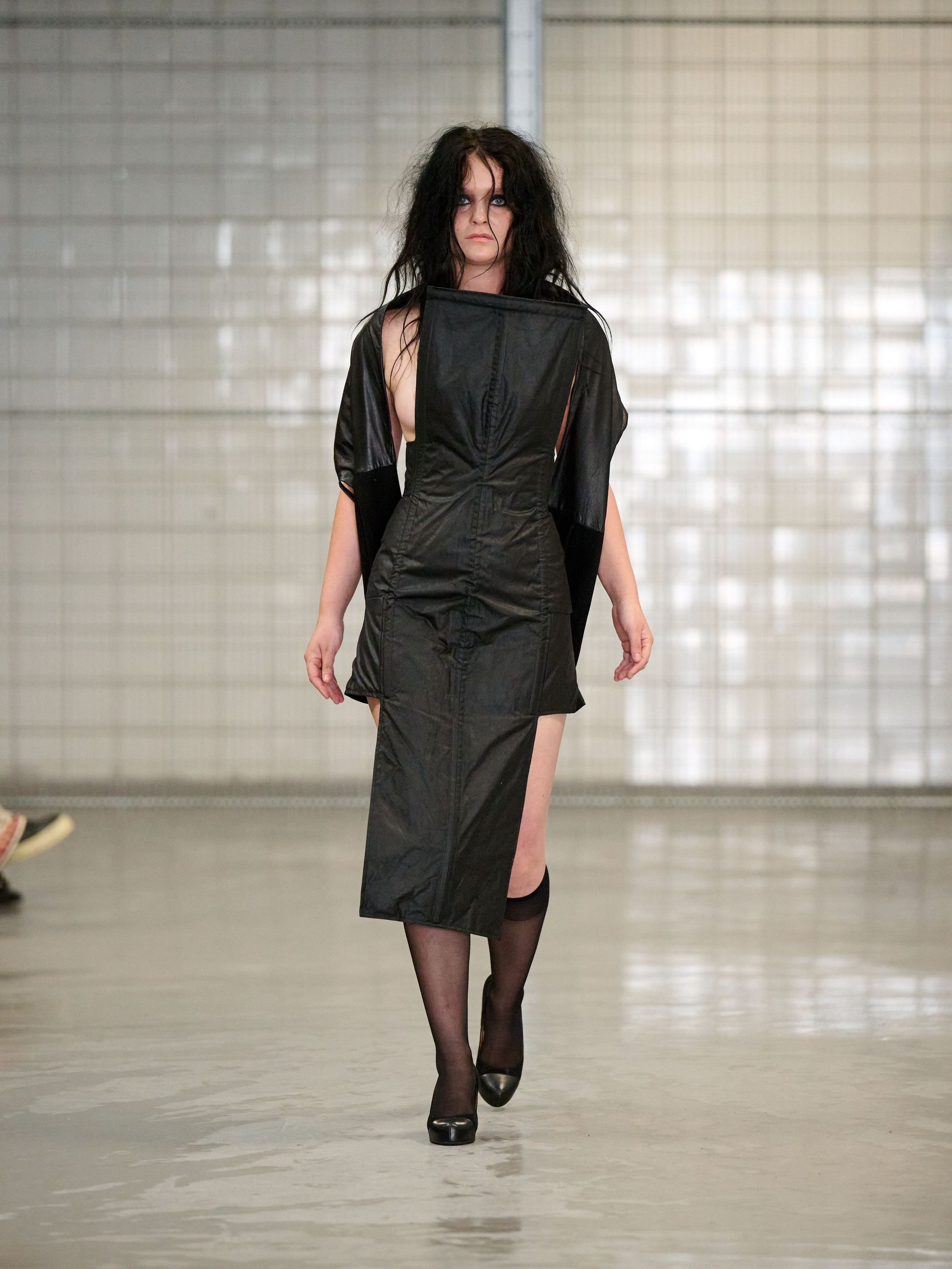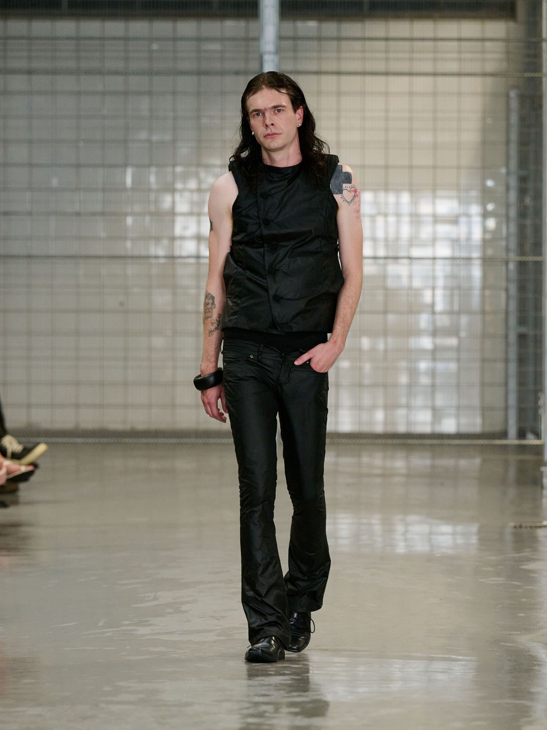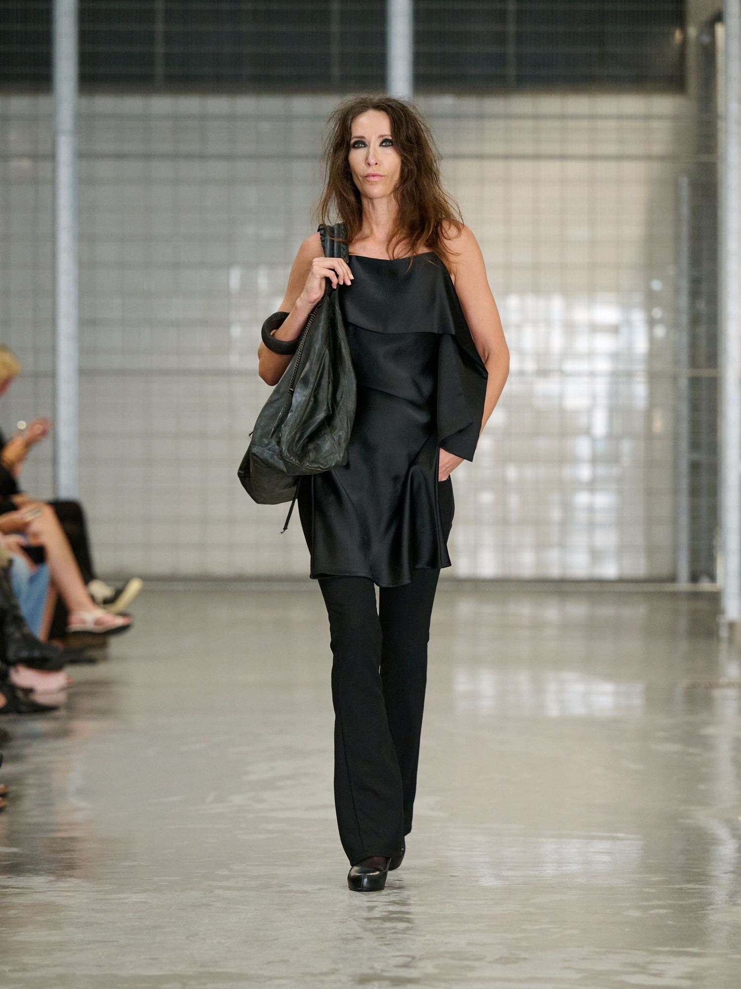 模特们在冷峻的秀道上缓步前行,身着无袖西装、皮革短裤叠搭透视丝袜、轻薄纱质上衣等造型,在实用主义的严厉感与凌乱的原始气质之间来回游走。白色挂脖长衫配黑色长裤,呈现近乎仪式化的极简风格;而不对称剪裁的亚麻吊带裙则以纸质般的脆弱质感,传递触感上的对比与不安。