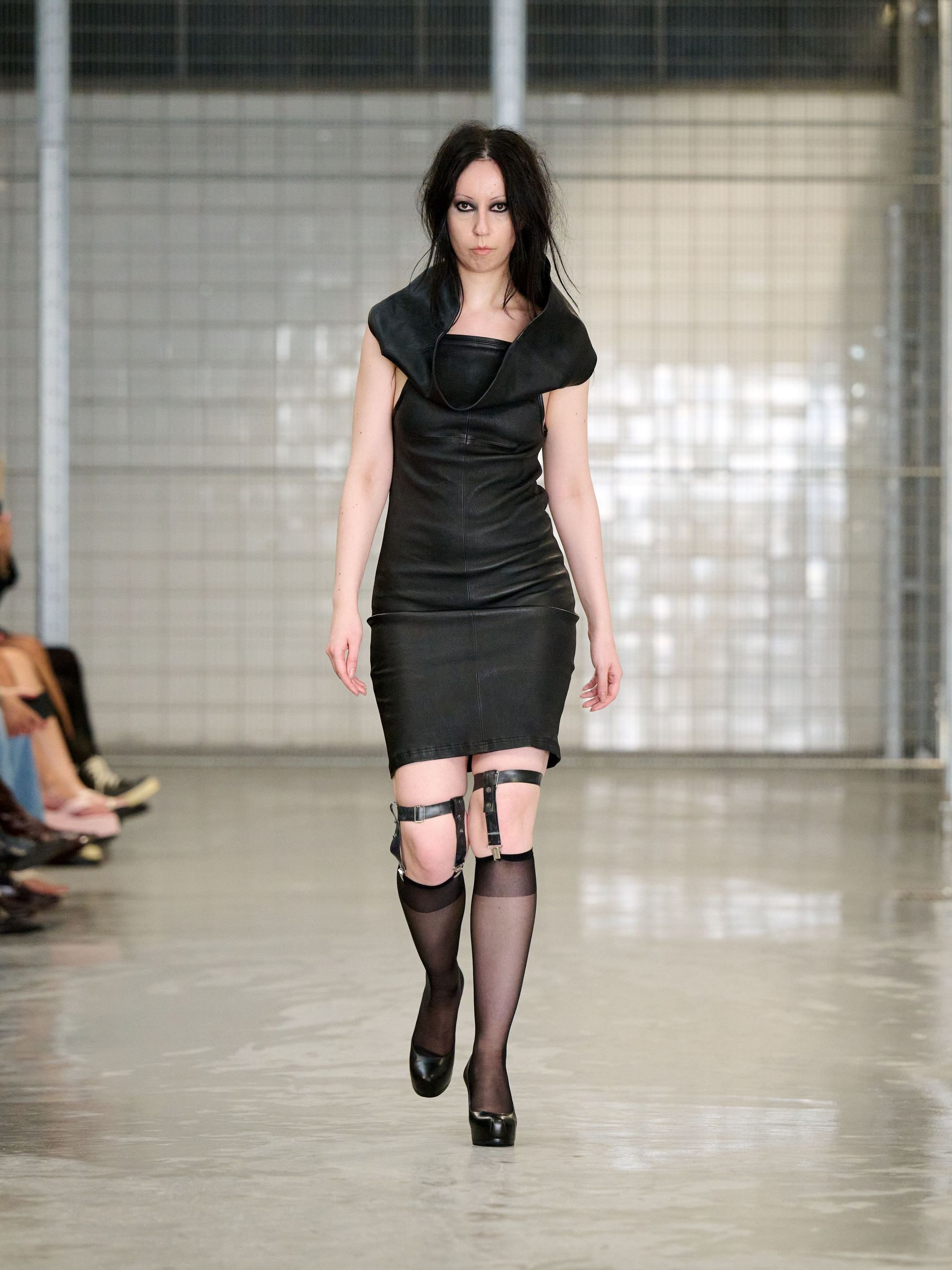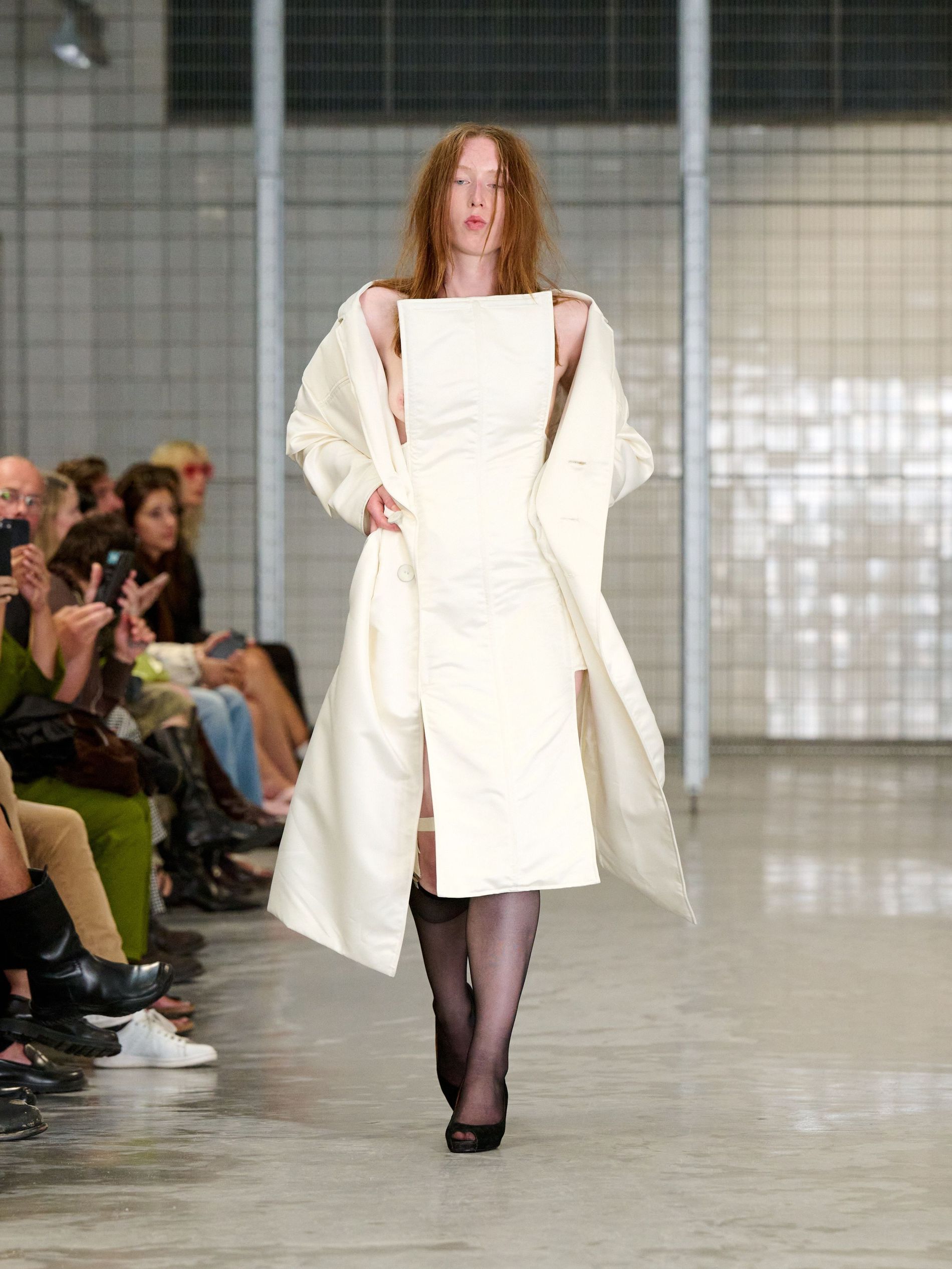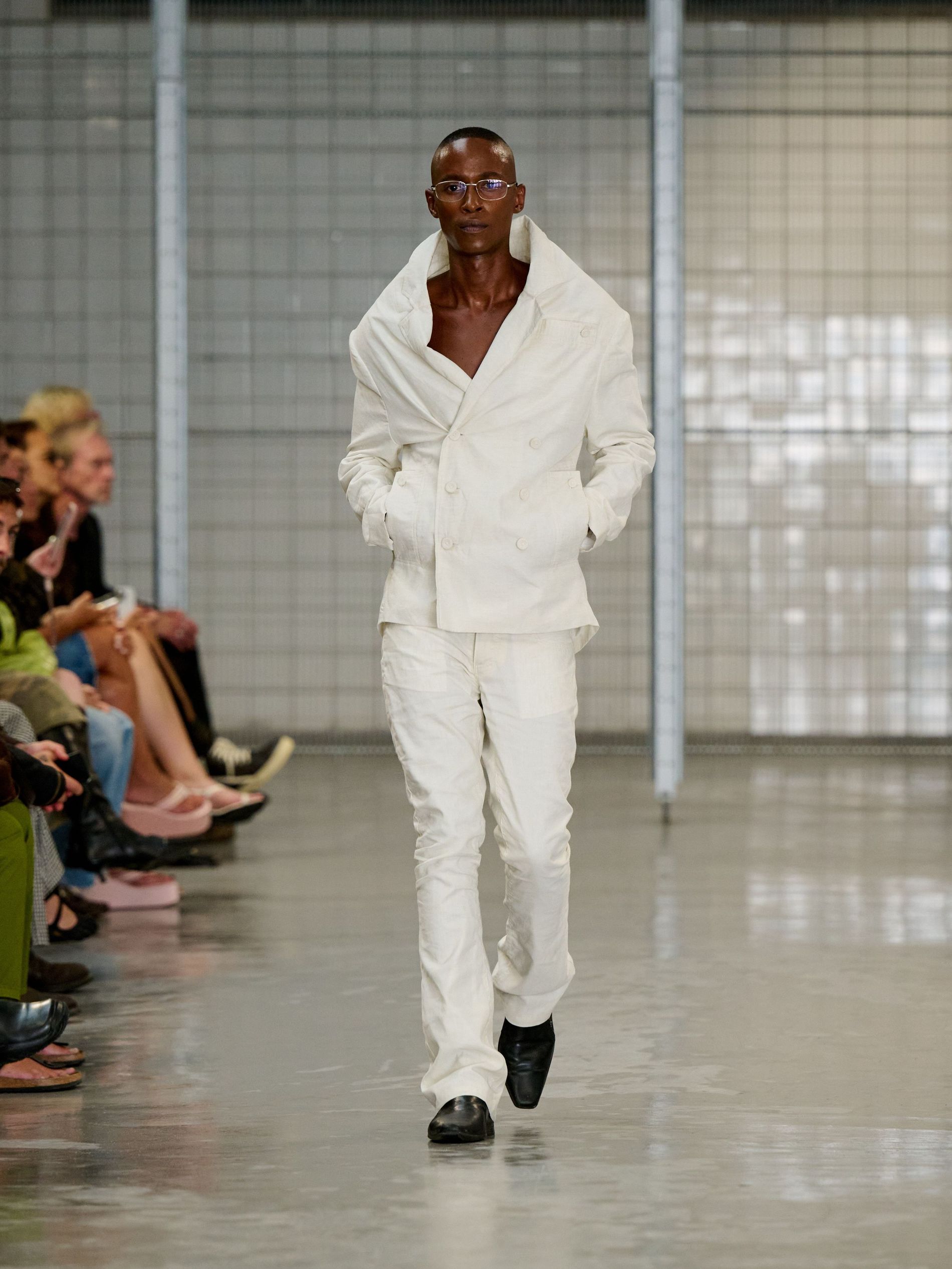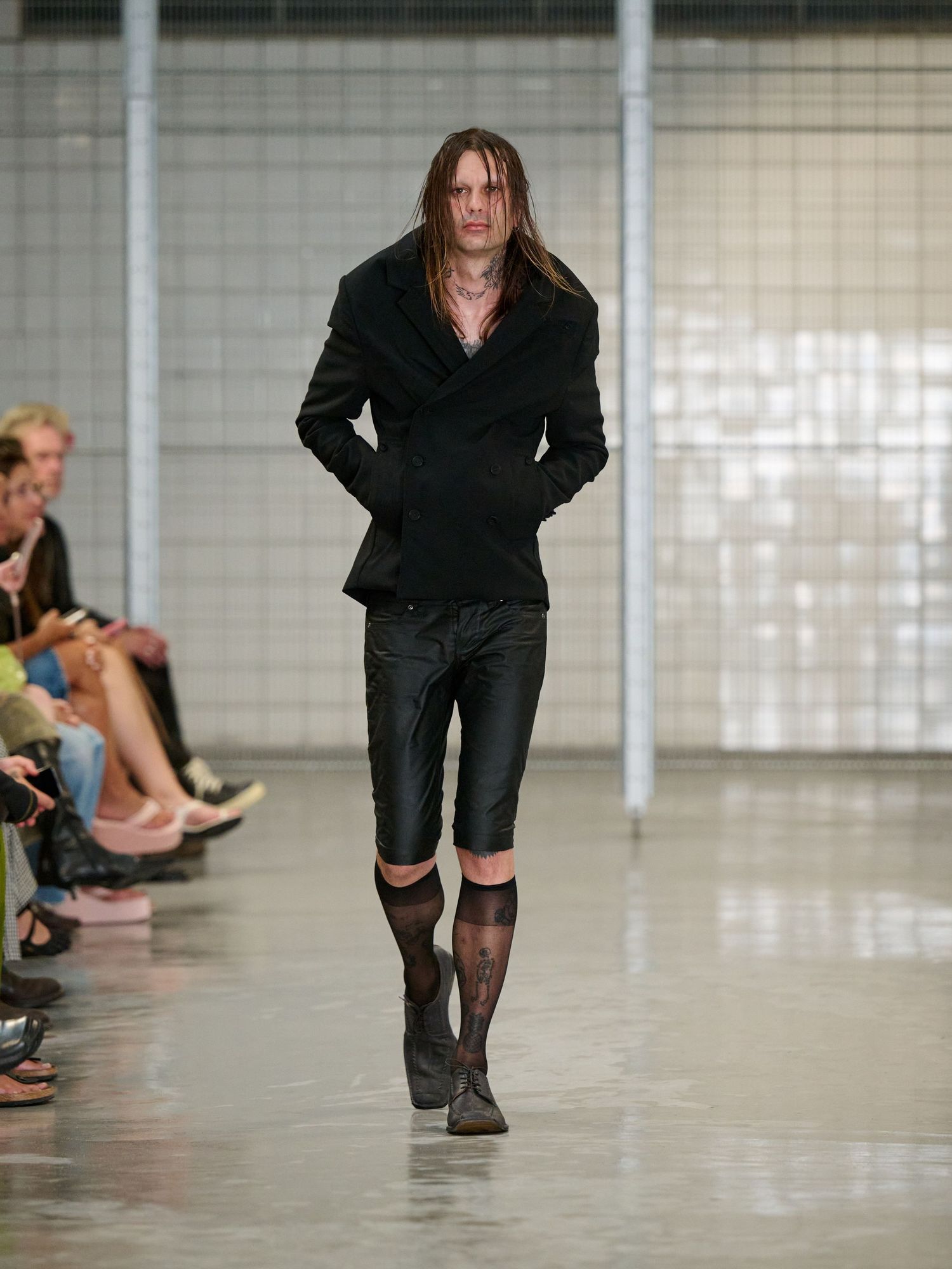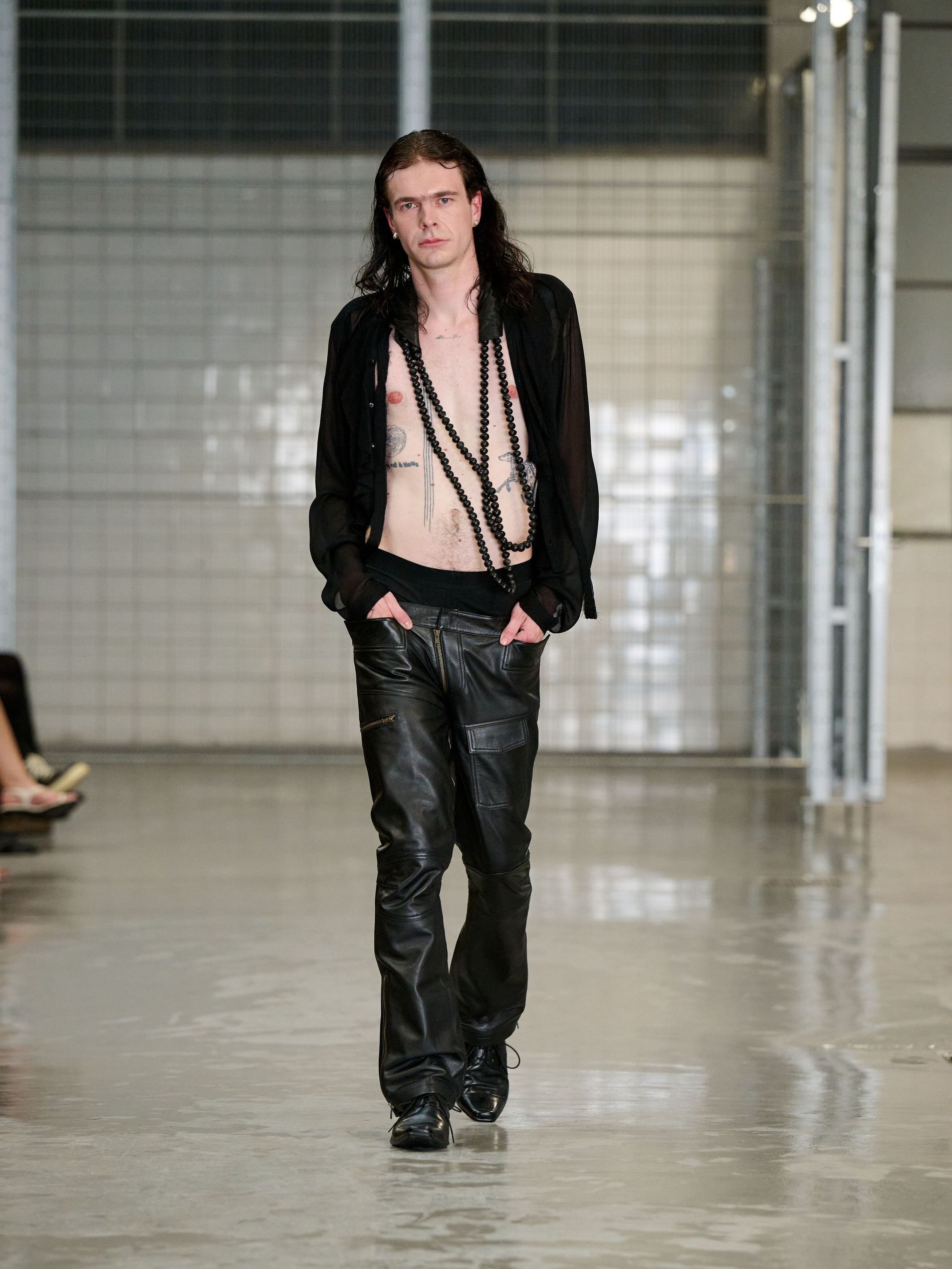 模特们在冷峻的秀道上缓步前行,身着无袖西装、皮革短裤叠搭透视丝袜、轻薄纱质上衣等造型,在实用主义的严厉感与凌乱的原始气质之间来回游走。白色挂脖长衫配黑色长裤,呈现近乎仪式化的极简风格;而不对称剪裁的亚麻吊带裙则以纸质般的脆弱质感,传递触感上的对比与不安。