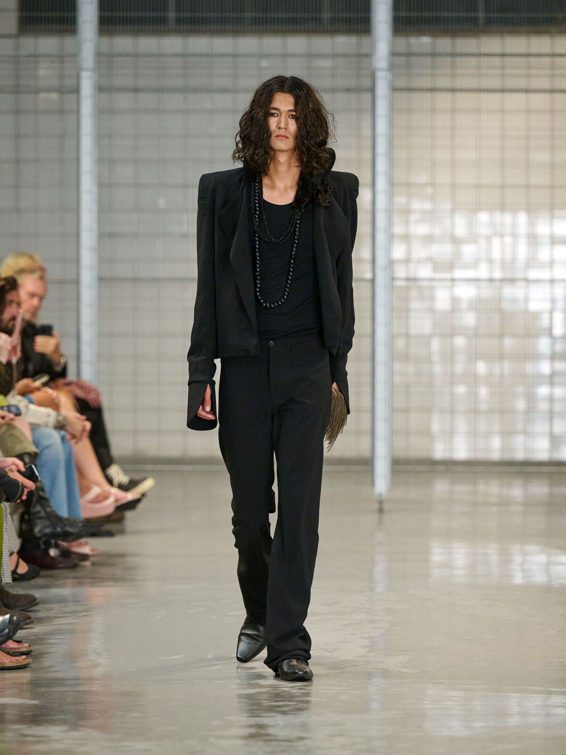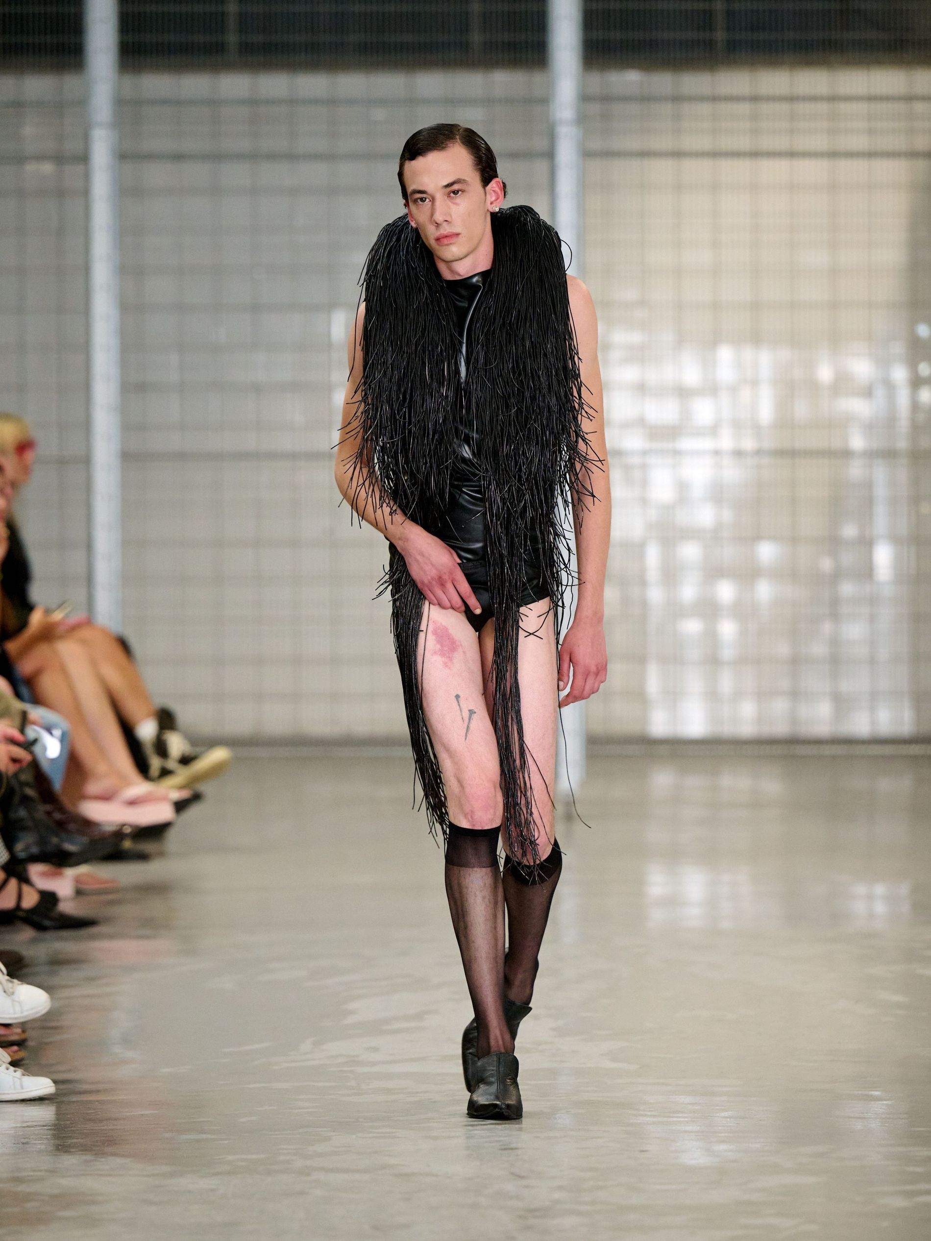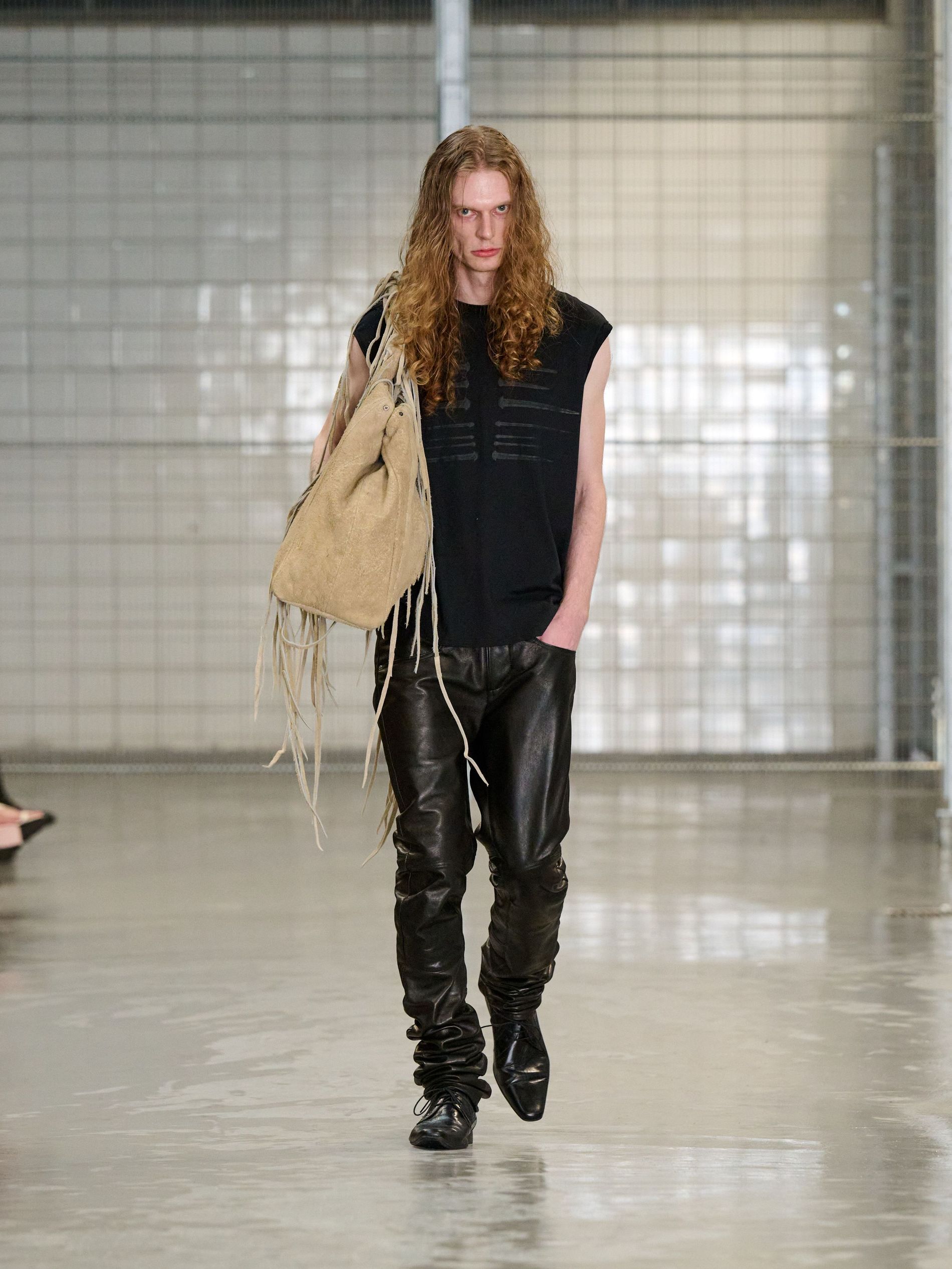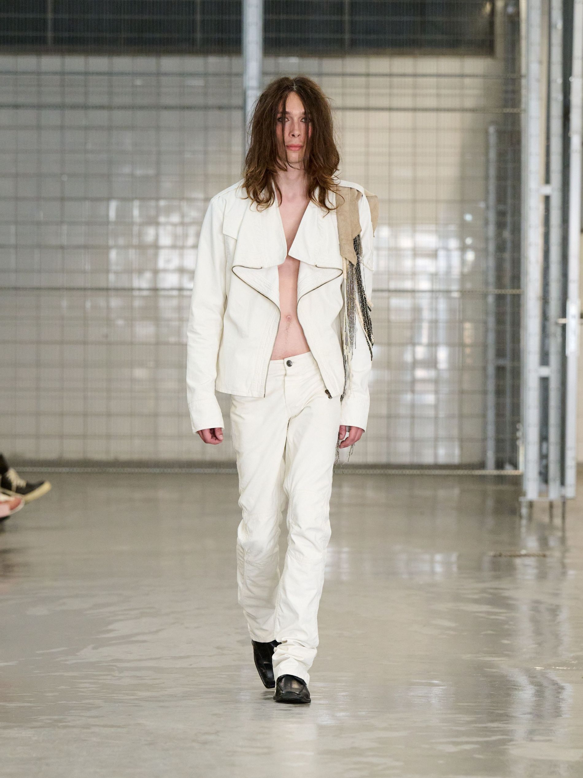 吊袜带元素贯穿西装与礼服线条,流苏长衫如被割裂的挽具般垂坠,纱布缠绕手臂、敞开的衬衫、随意背在肩上的实用包袋,皆带有游牧般的急迫与不羁。配色克制在黑、骨白与肤色之间,低调却锋利。