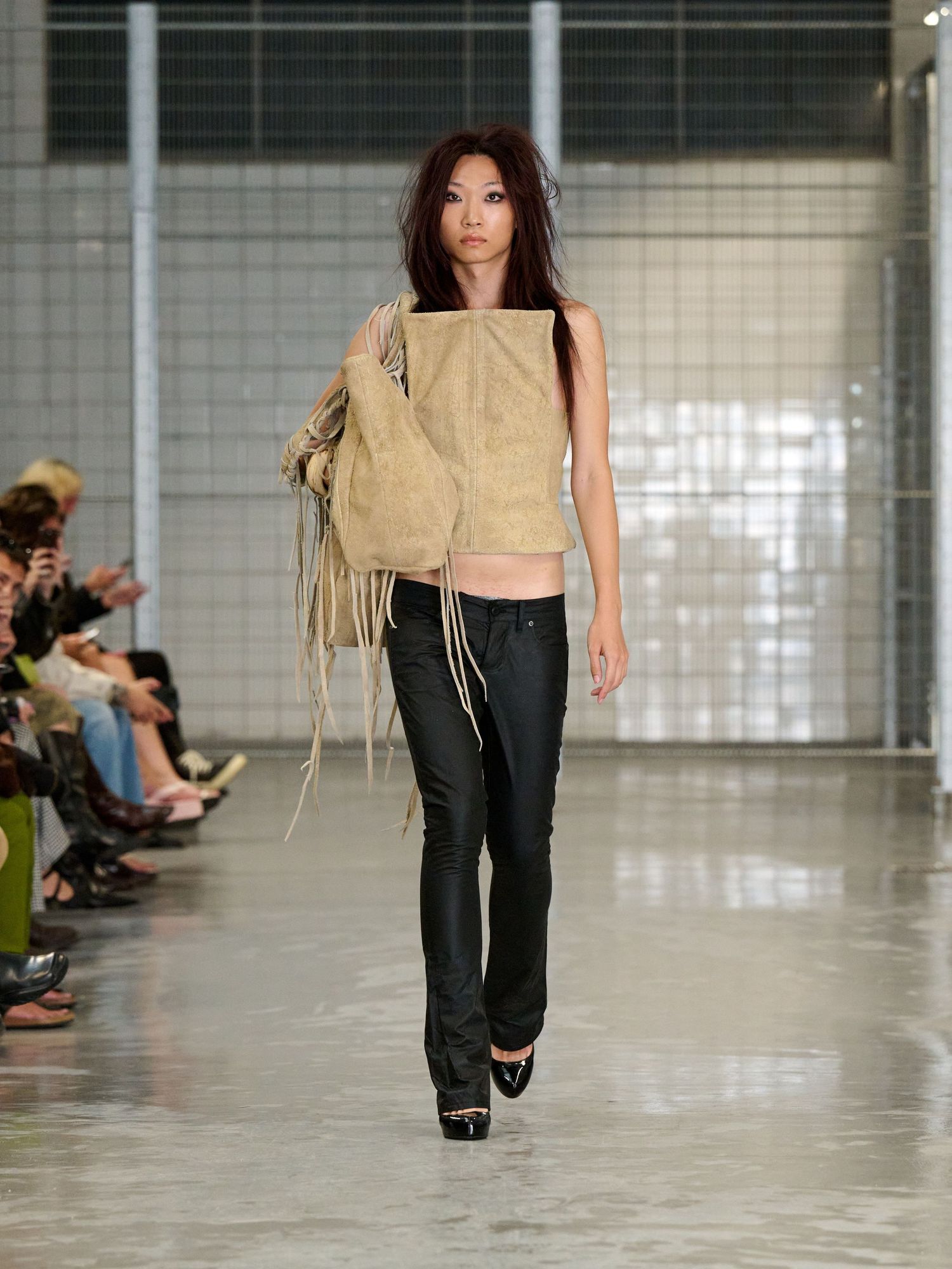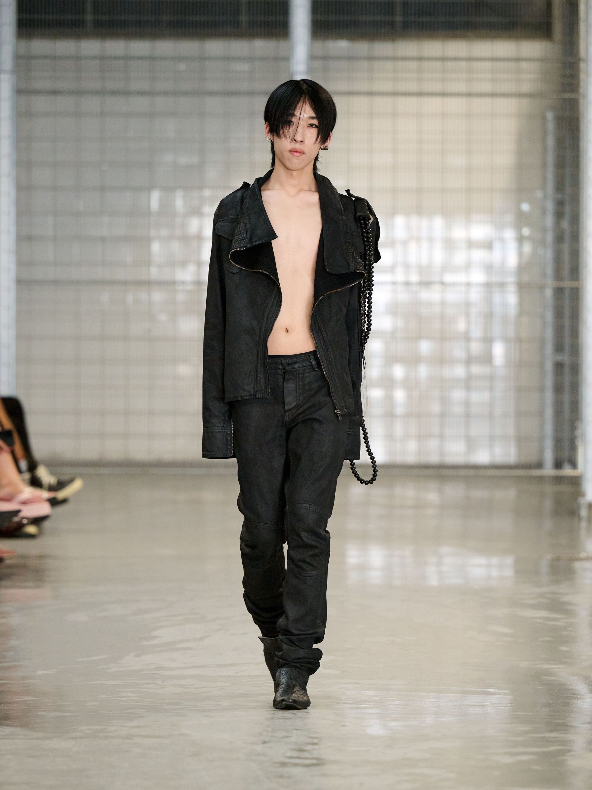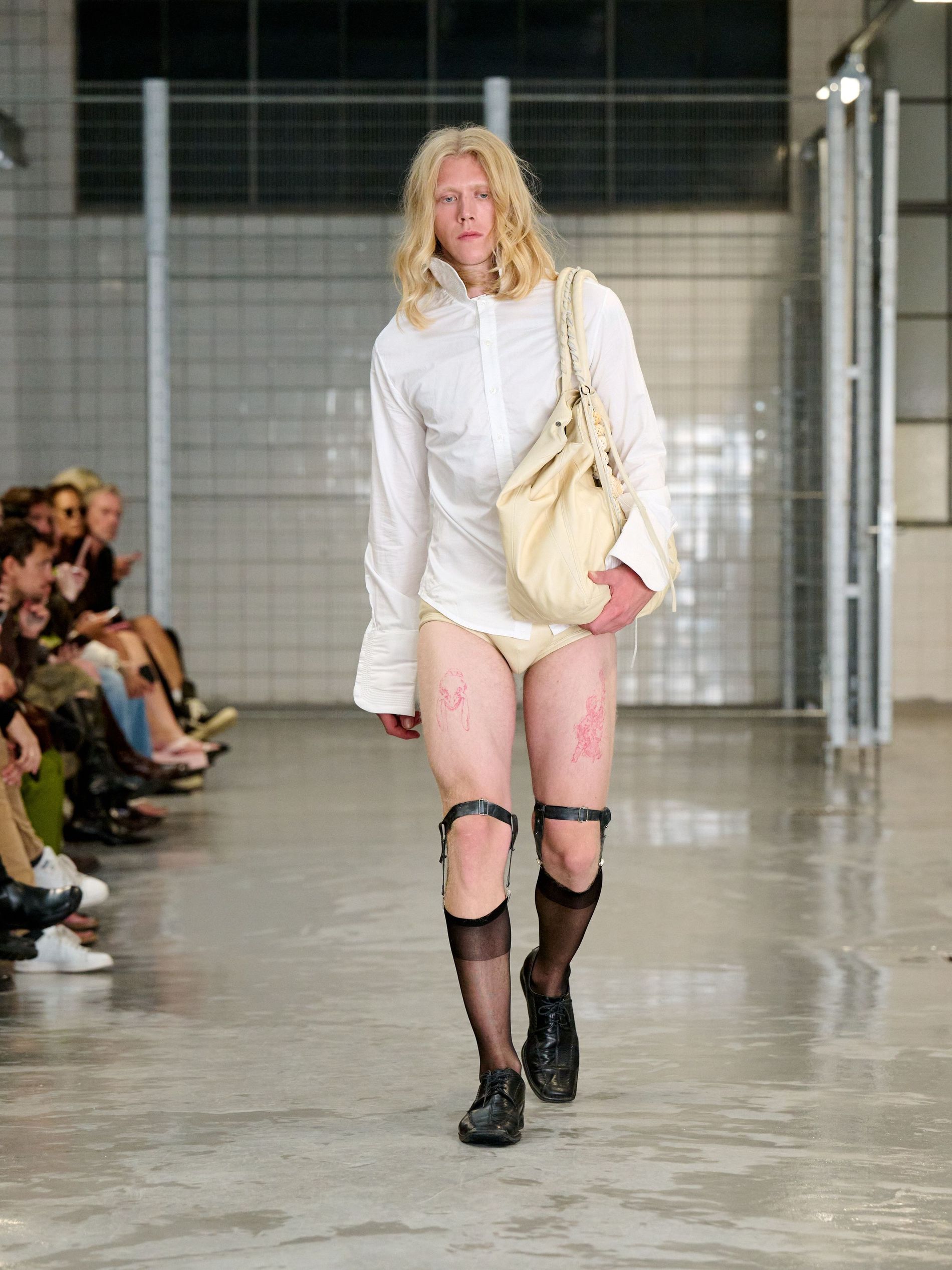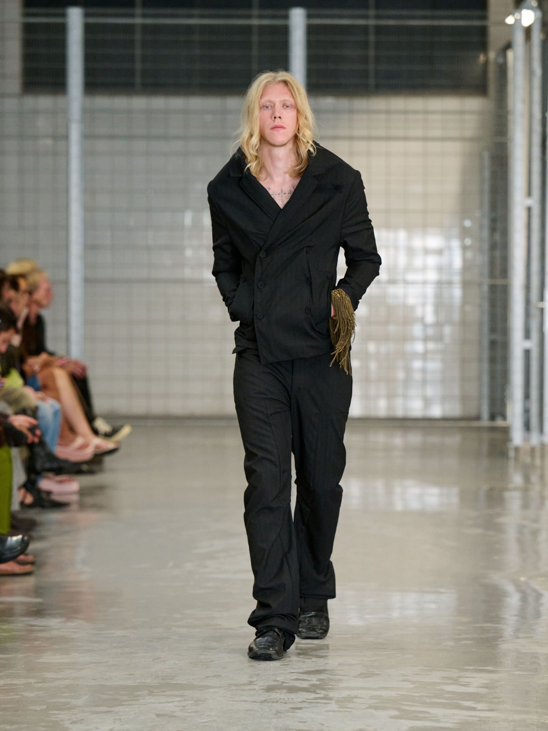 吊袜带元素贯穿西装与礼服线条,流苏长衫如被割裂的挽具般垂坠,纱布缠绕手臂、敞开的衬衫、随意背在肩上的实用包袋,皆带有游牧般的急迫与不羁。配色克制在黑、骨白与肤色之间,低调却锋利。