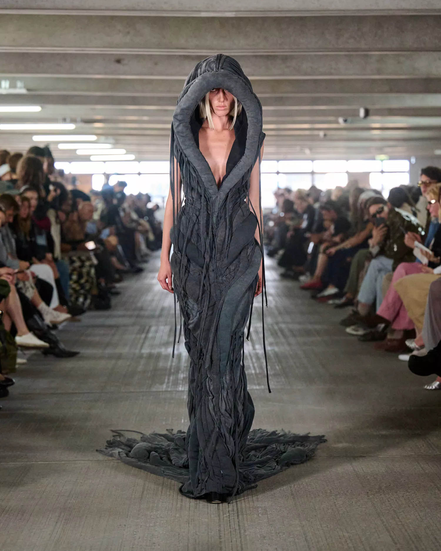 Han Kjøbenhavn 于哥本哈根时装周发布 2026 春夏系列「Another Day」,将街头服饰的「典礼感」推向极致,赋予其近乎高级定制般的戏剧张力。整场秀在大幅度的廓形与层叠结构中展开:织物自夸张的肩部与臀部垂落,衣领与兜帽向外突出,形成吞噬头部的轮廓。模特身着三维结构的美人鱼长裙缓步而行,裙摆鼓胀如浪,配以亮面人造羽毛与紧贴皮肤的仿皮革,展现出一种「夸张的克制」。