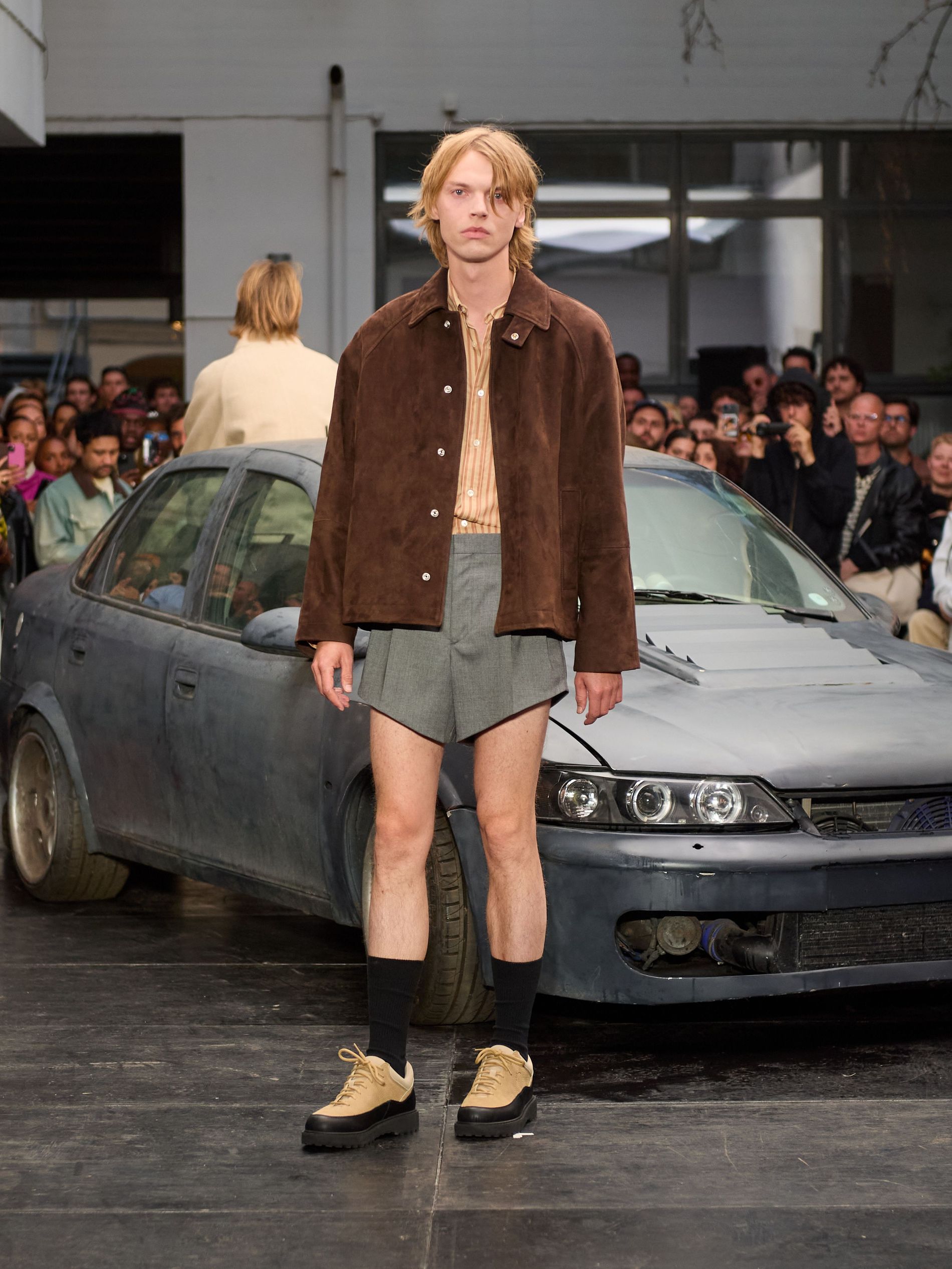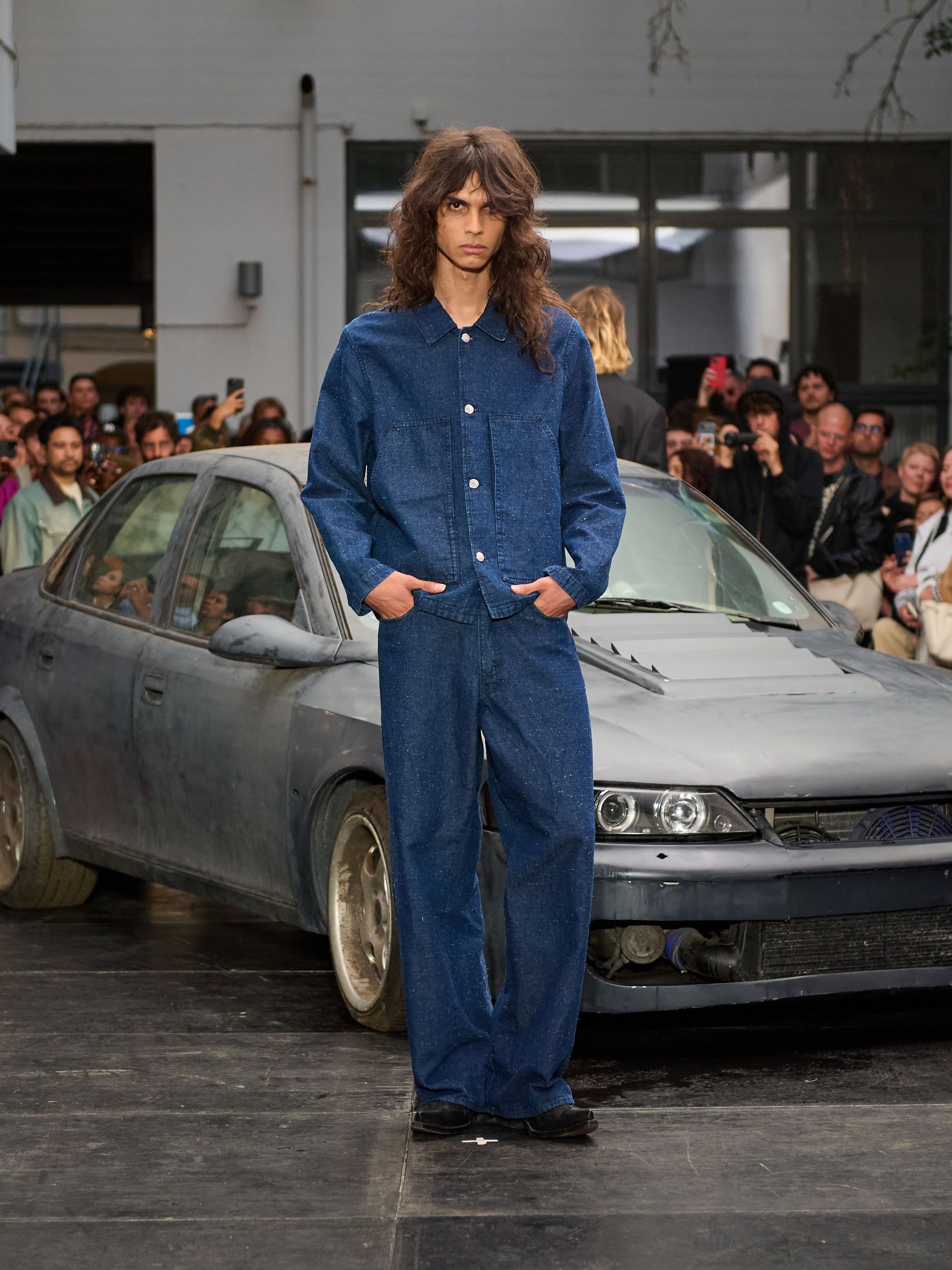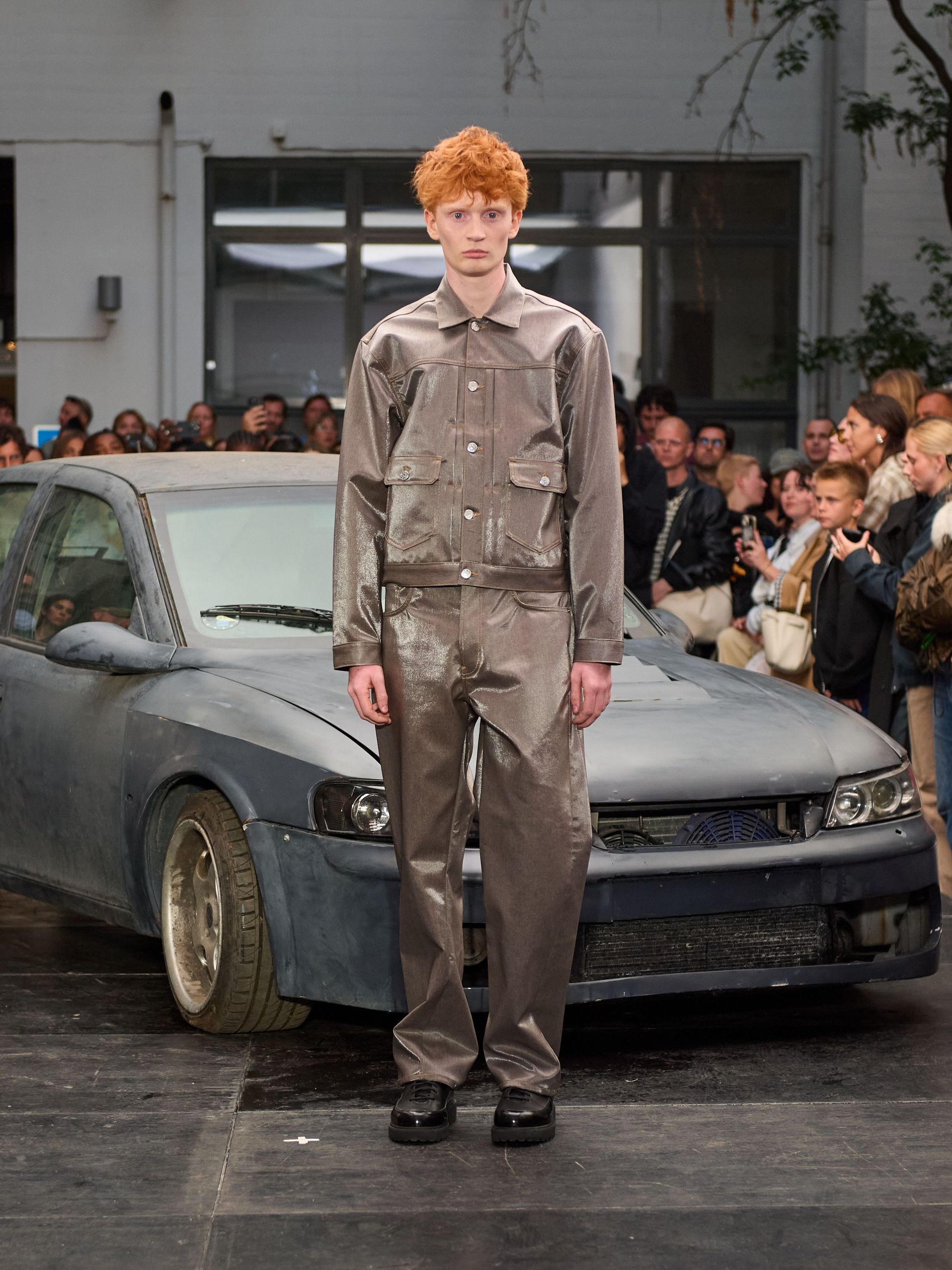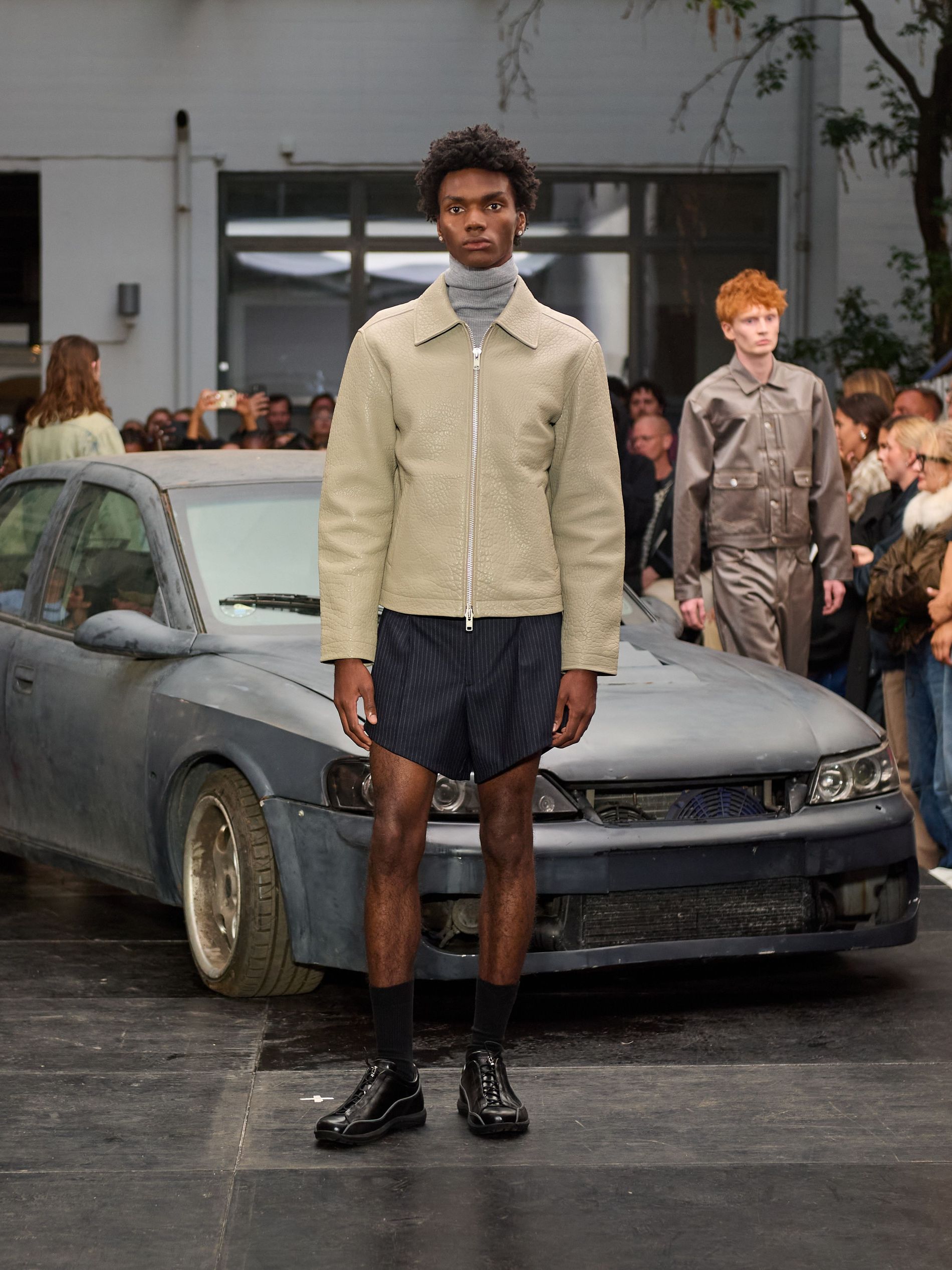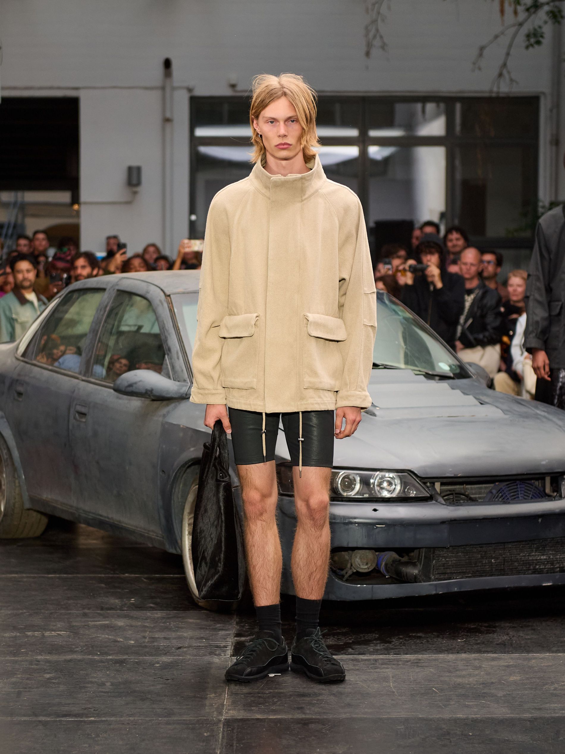 在 Sunflower 的 2026 春夏秀场上,创始人兼设计师 Ulrik Pedersen 展现了如何完美捕捉哥本哈根的悠闲氛围。与以往一样,秀场设在品牌的院子里,现场充满了当地的酷孩子和时尚绅士们,2026 春夏系列也延续了 Sunflower 特有的冷酷风格。模特们穿着街头风十足的服饰,随意地走在 T 台上,偶尔停下倚靠在一辆旧车或平台上。