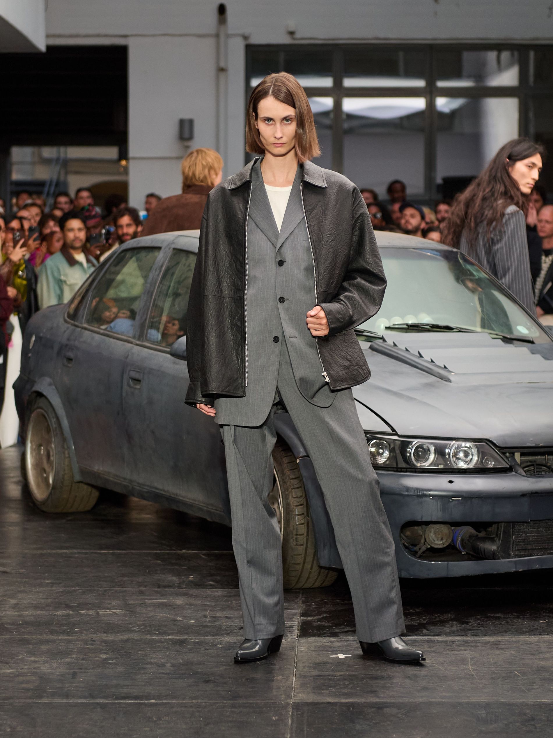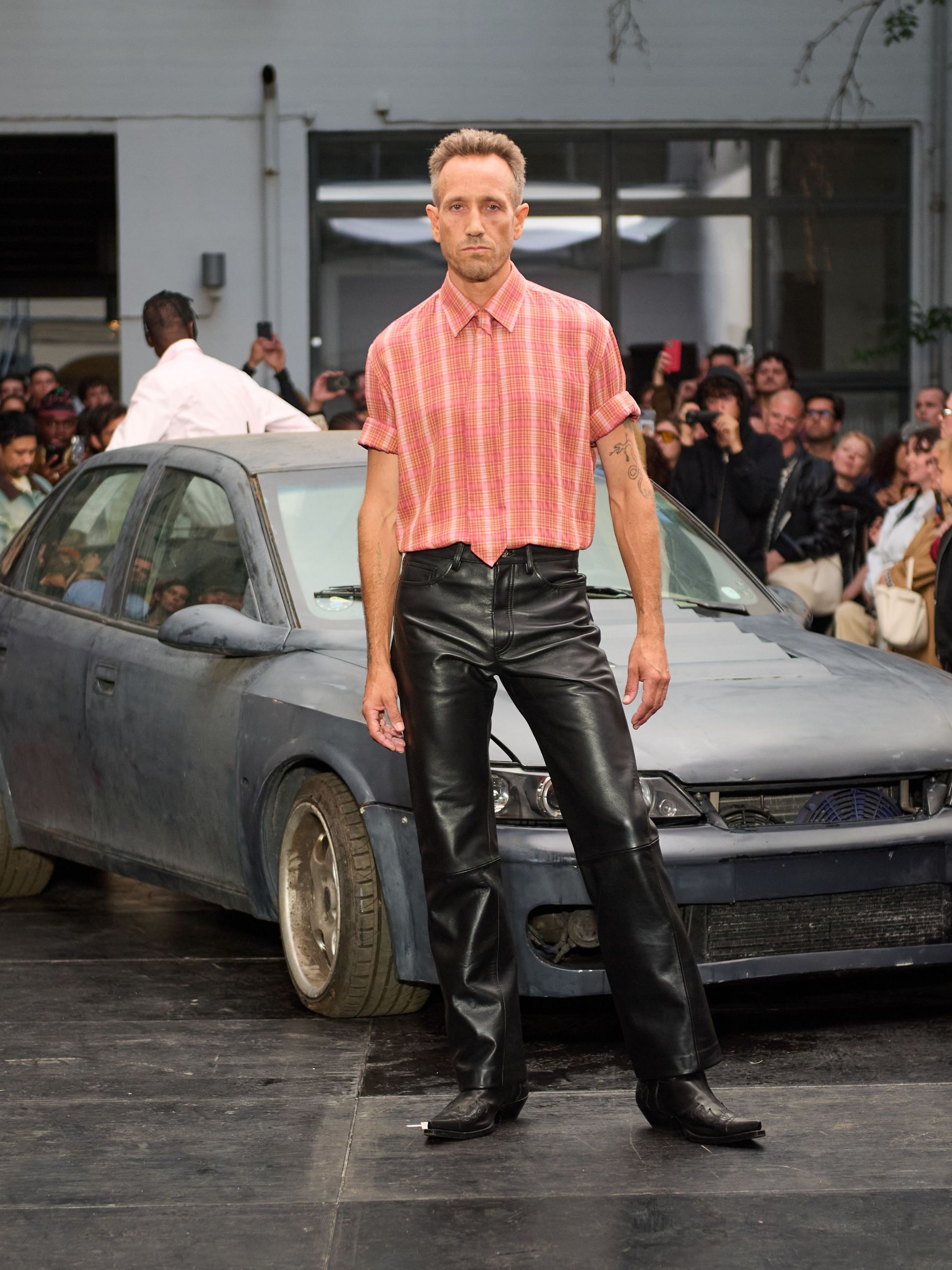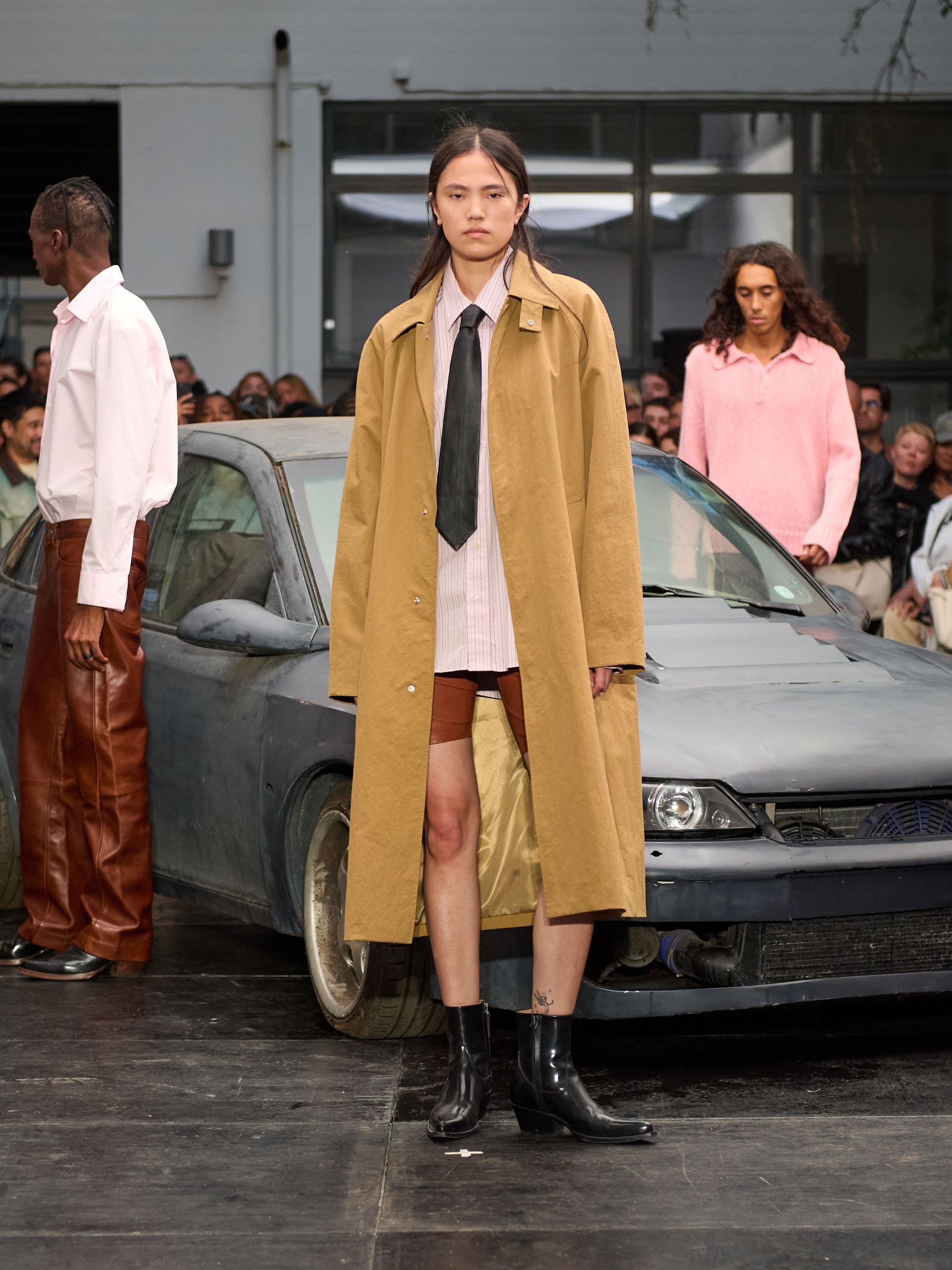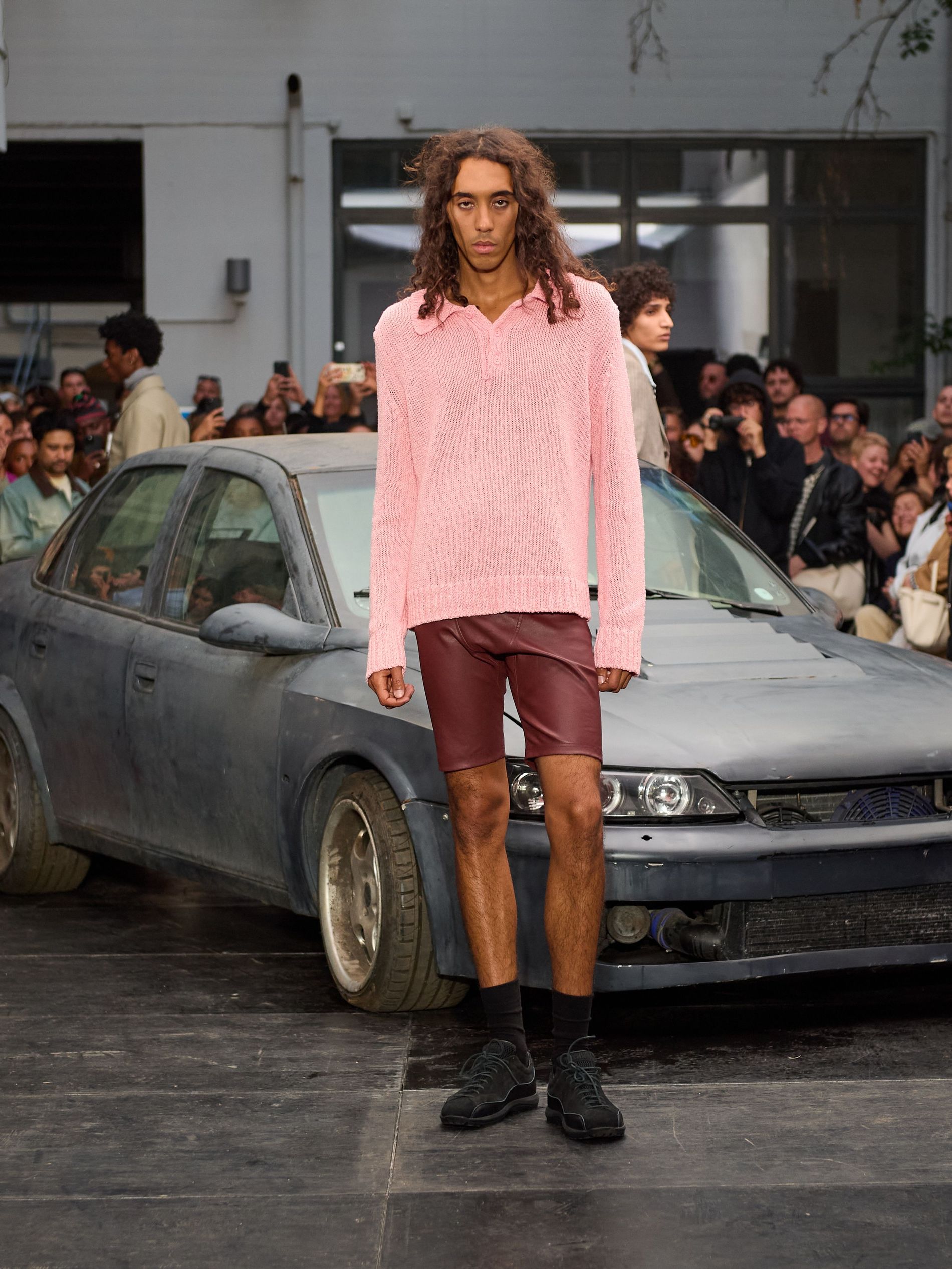 在 Sunflower 的 2026 春夏秀场上,创始人兼设计师 Ulrik Pedersen 展现了如何完美捕捉哥本哈根的悠闲氛围。与以往一样,秀场设在品牌的院子里,现场充满了当地的酷孩子和时尚绅士们,2026 春夏系列也延续了 Sunflower 特有的冷酷风格。模特们穿着街头风十足的服饰,随意地走在 T 台上,偶尔停下倚靠在一辆旧车或平台上。