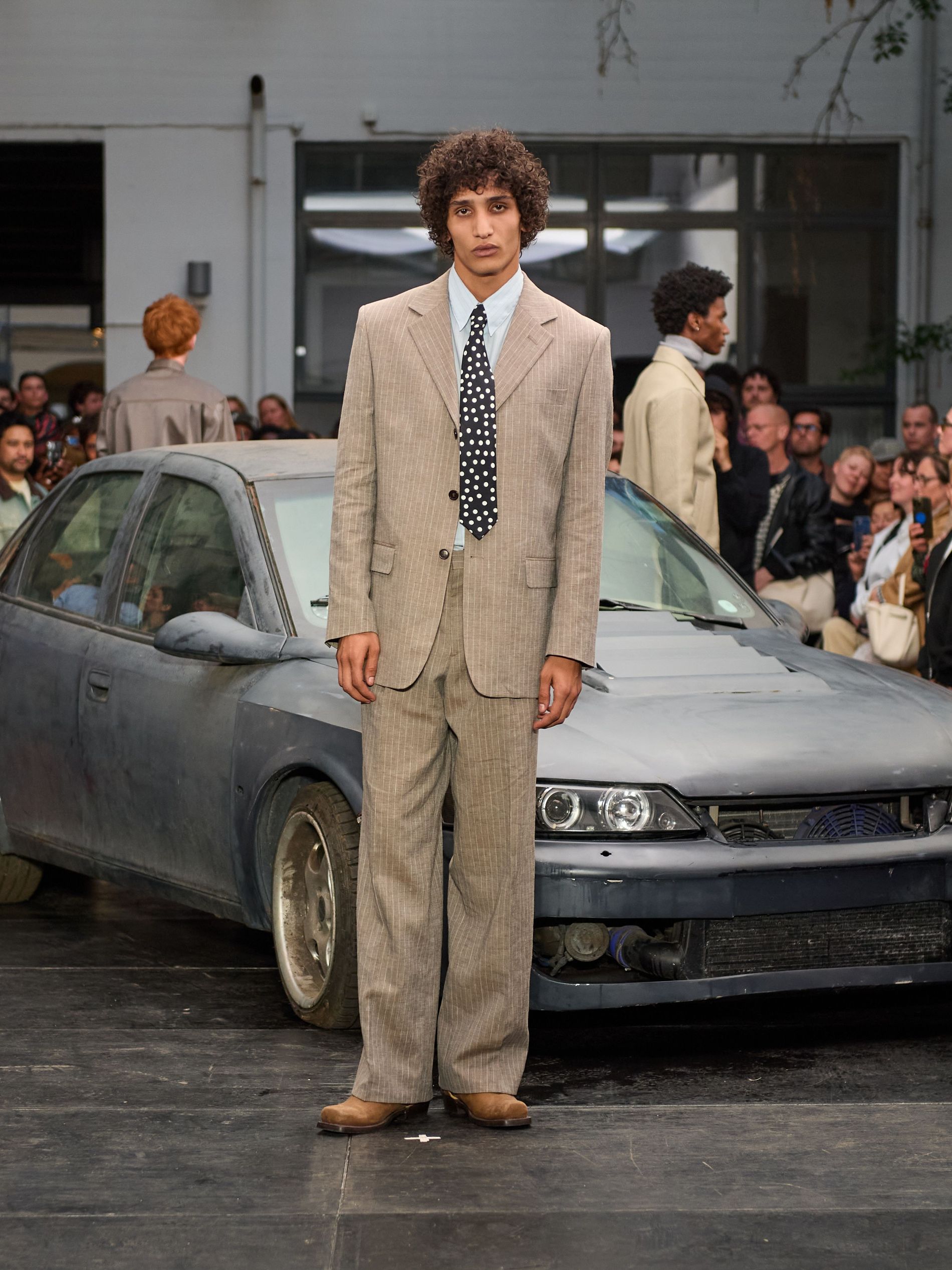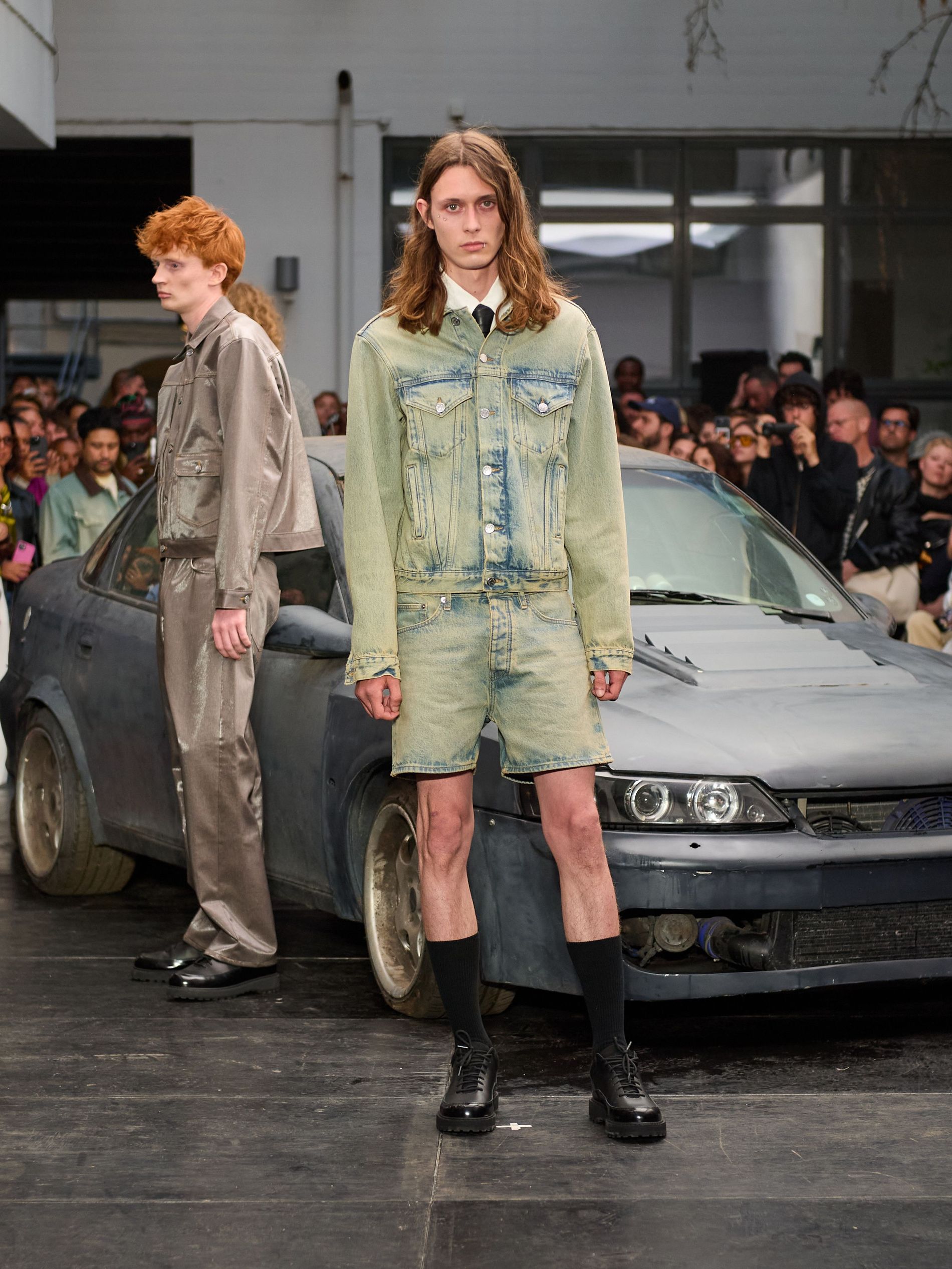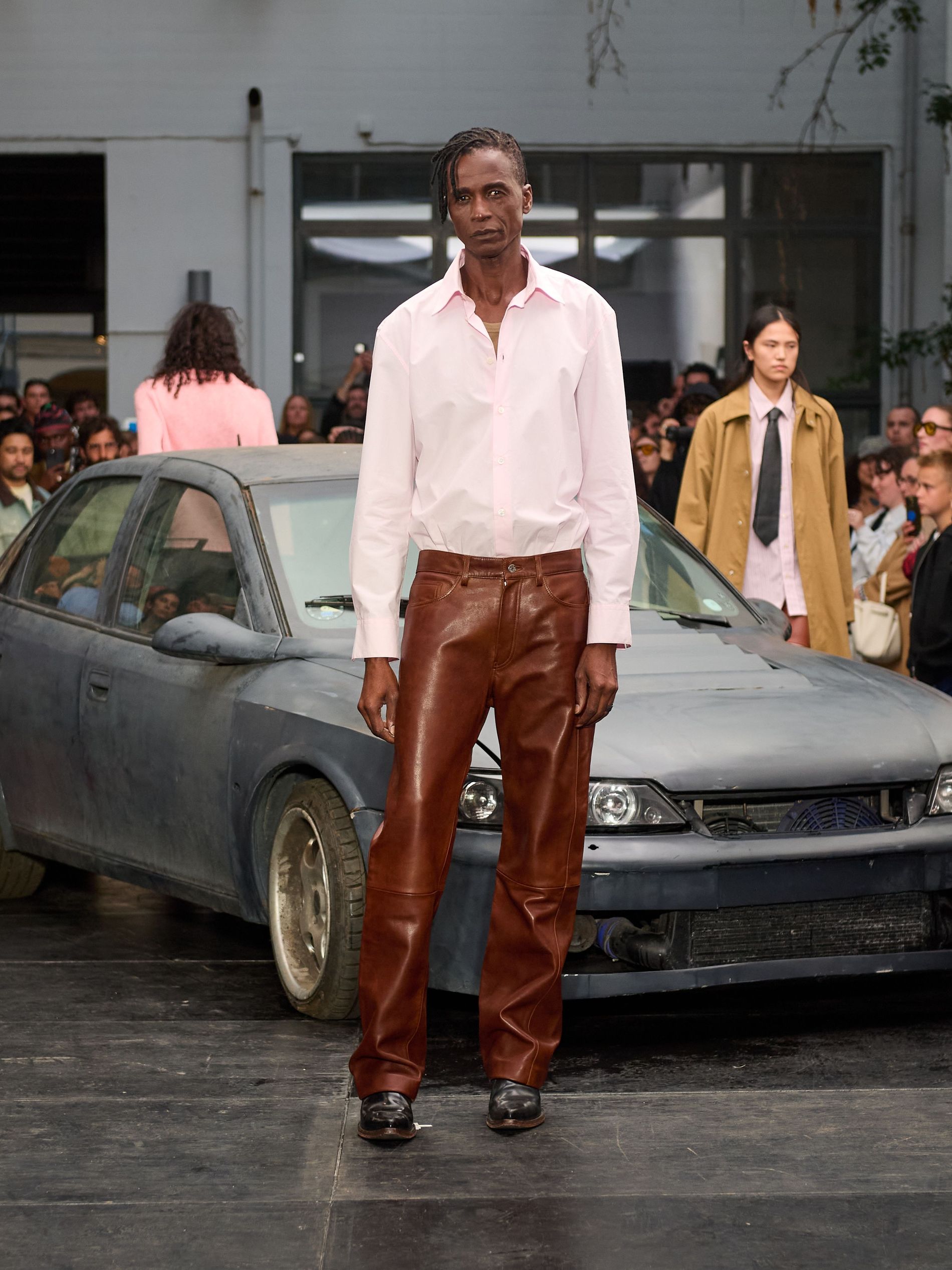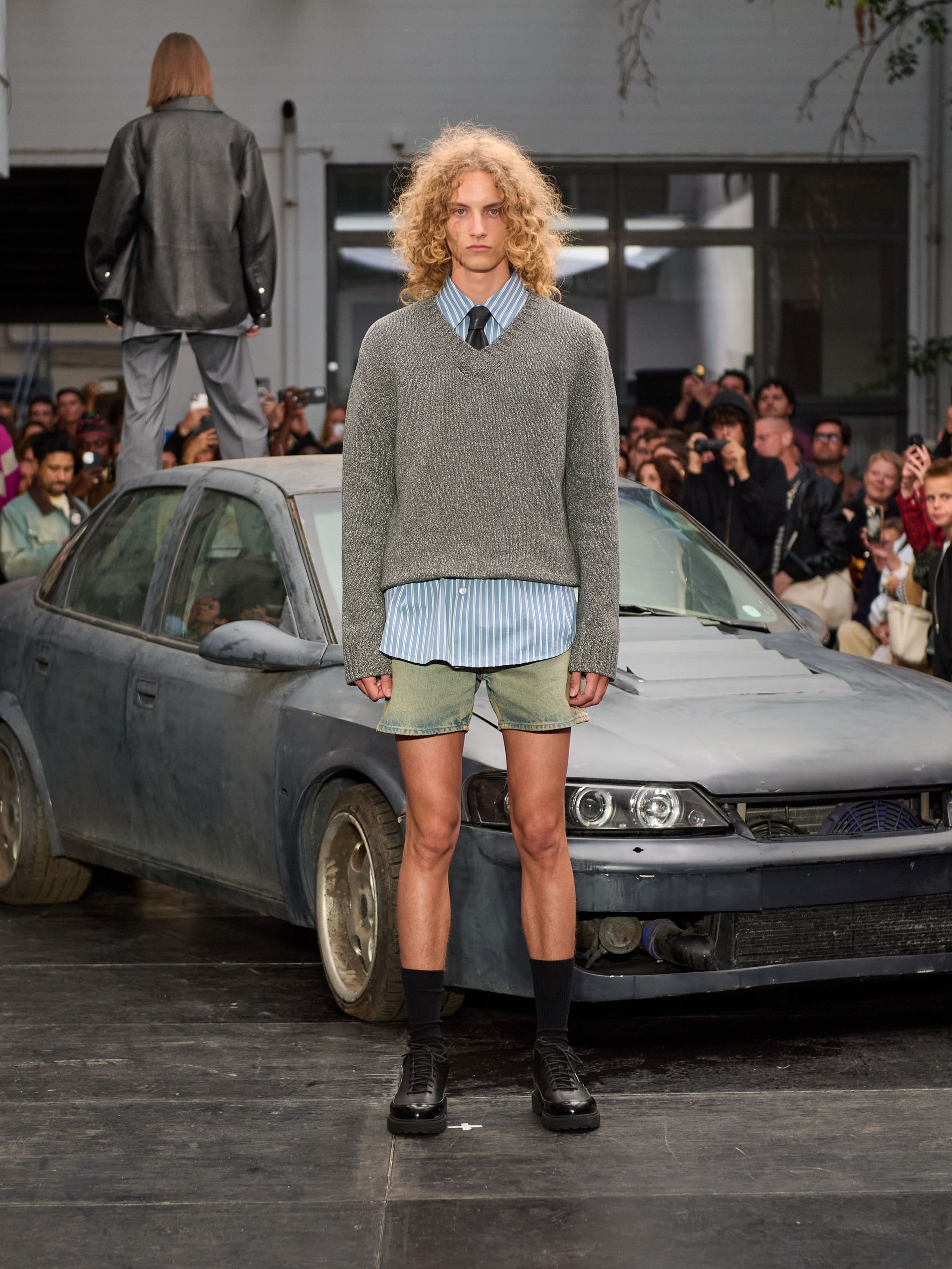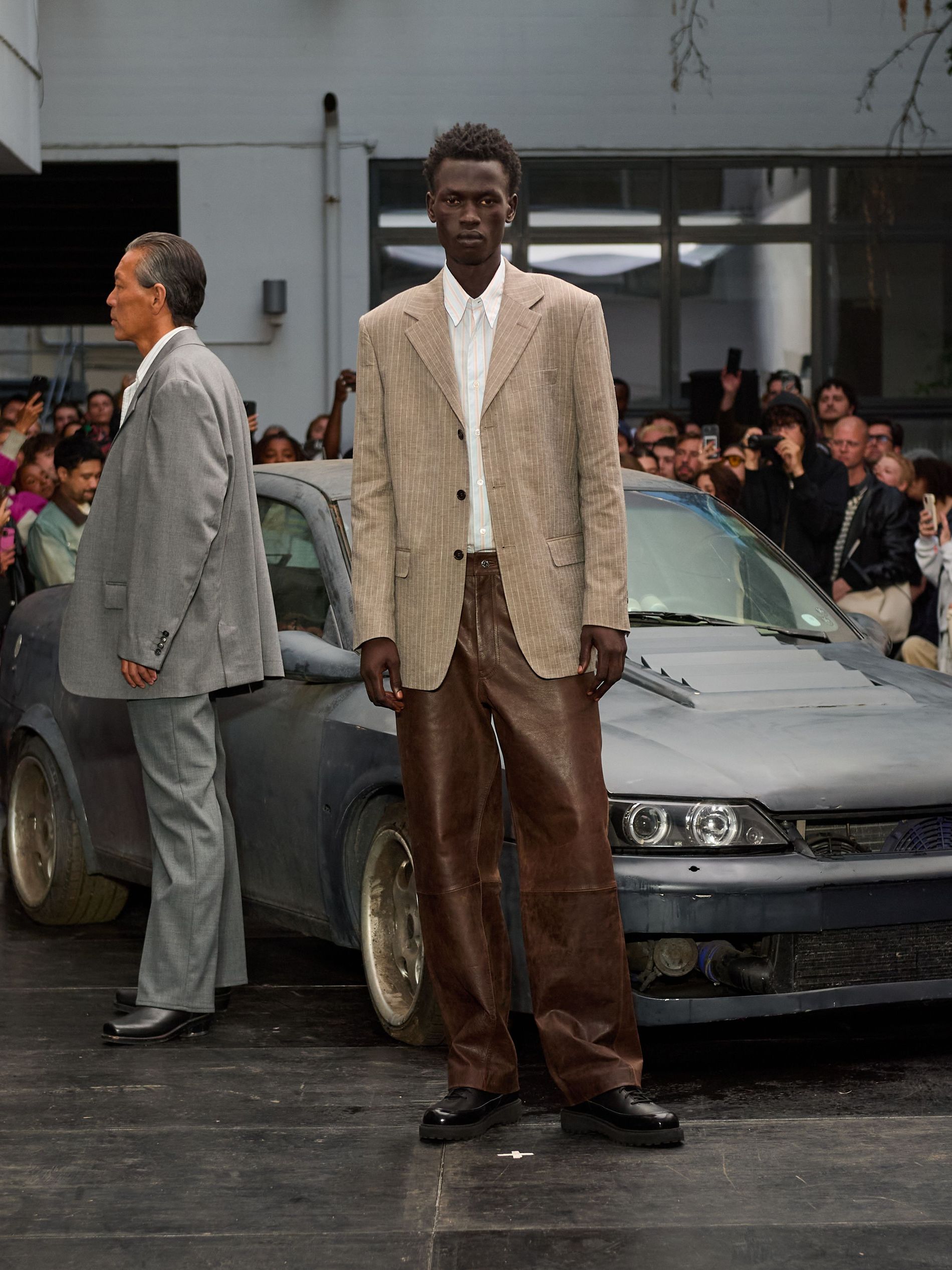 在 Sunflower 的 2026 春夏秀场上,创始人兼设计师 Ulrik Pedersen 展现了如何完美捕捉哥本哈根的悠闲氛围。与以往一样,秀场设在品牌的院子里,现场充满了当地的酷孩子和时尚绅士们,2026 春夏系列也延续了 Sunflower 特有的冷酷风格。模特们穿着街头风十足的服饰,随意地走在 T 台上,偶尔停下倚靠在一辆旧车或平台上。