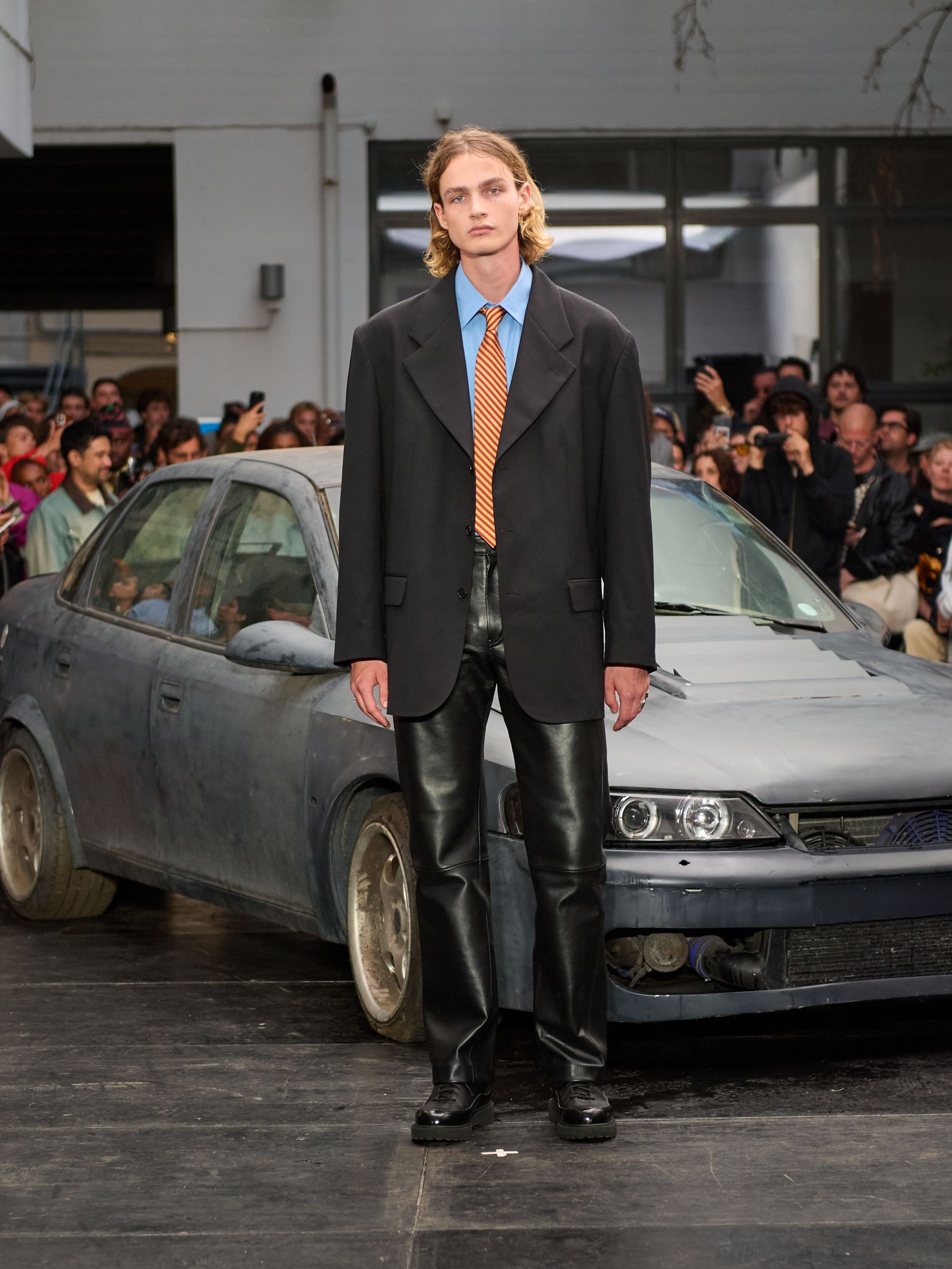 在服装方面,Sunflower 依旧在其拿手的 70 年代摇滚风格上大放异彩,强调剪裁与经典男装,但不失摇滚风味。特别是修身皮裤配宽松双排扣西装外套,展示了品牌对时尚与个性化搭配的理解。另外,随着越来越多女性模特的出现,Sunflower 的设计展现出其跨性别的魅力,连一条经典的紧身牛仔裤也令人印象深刻。
