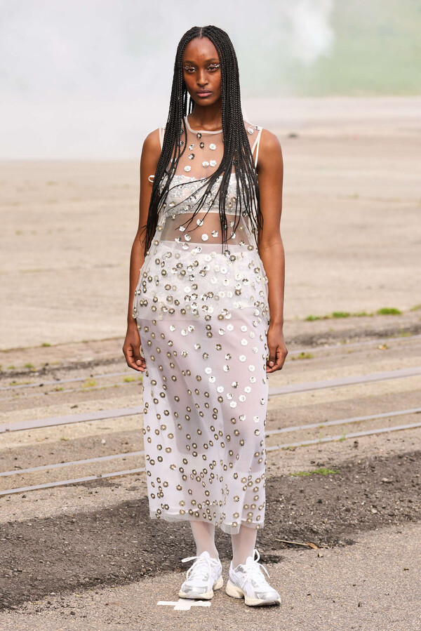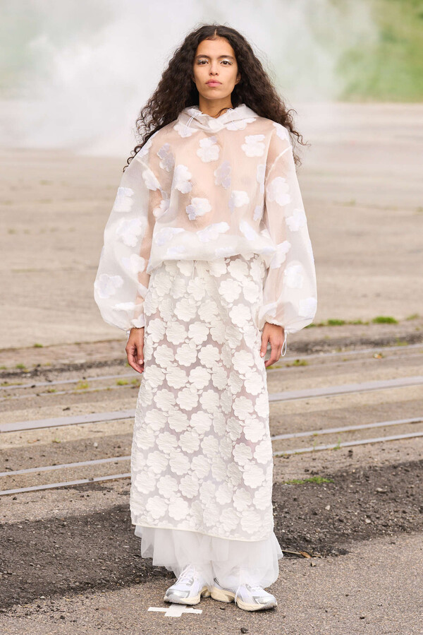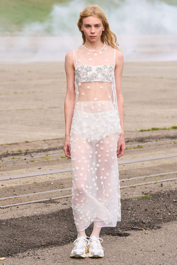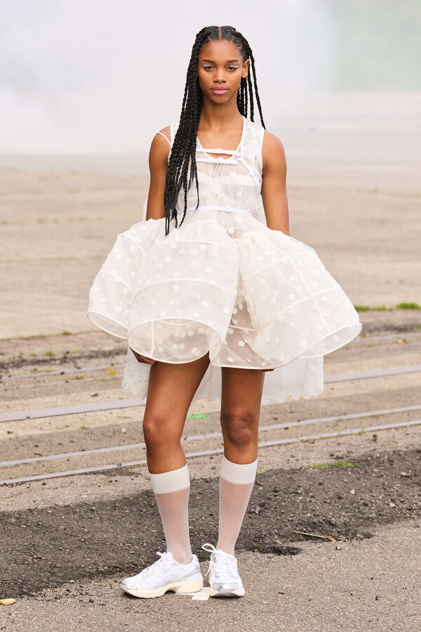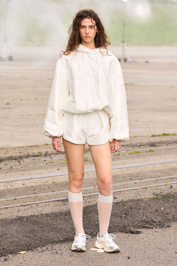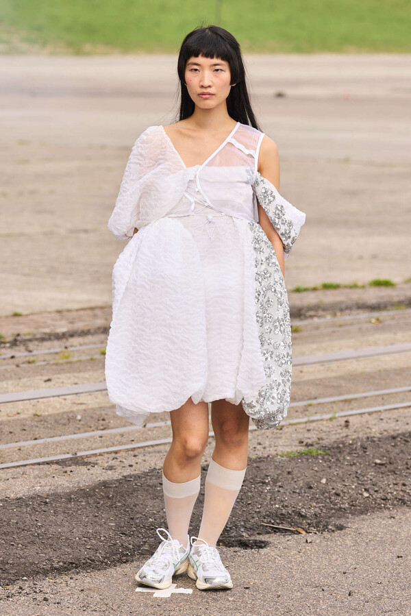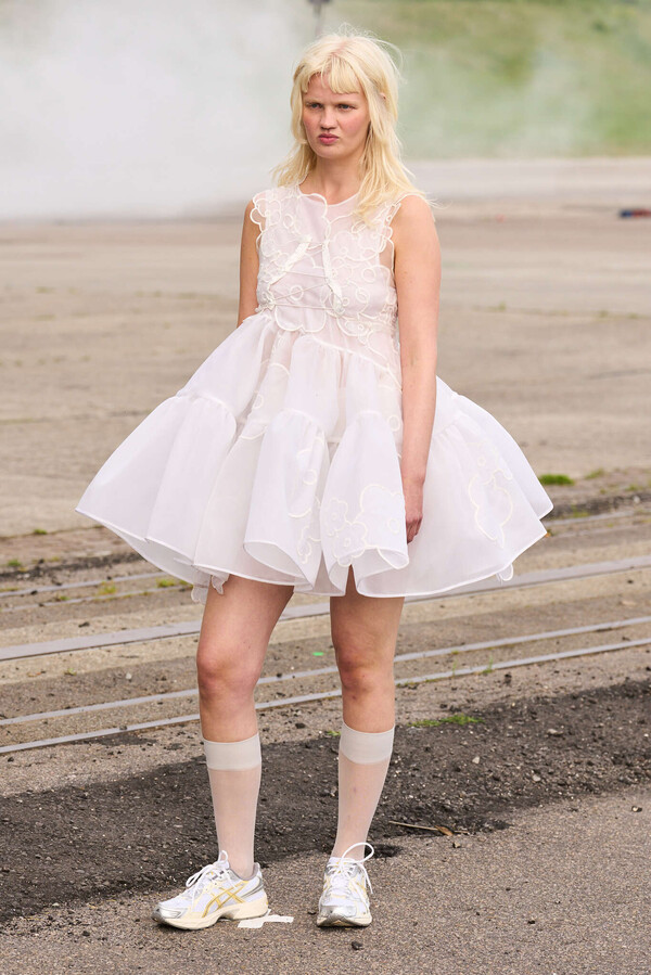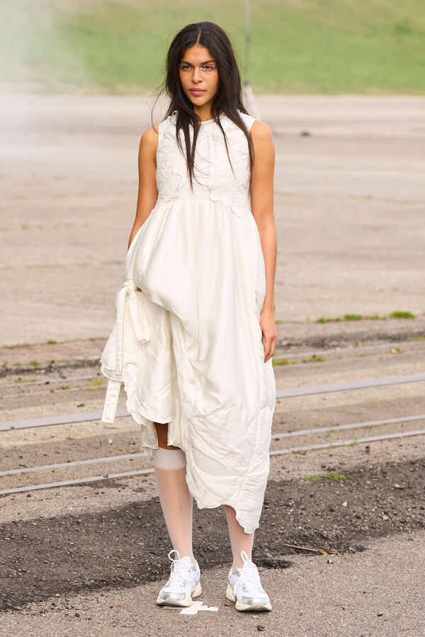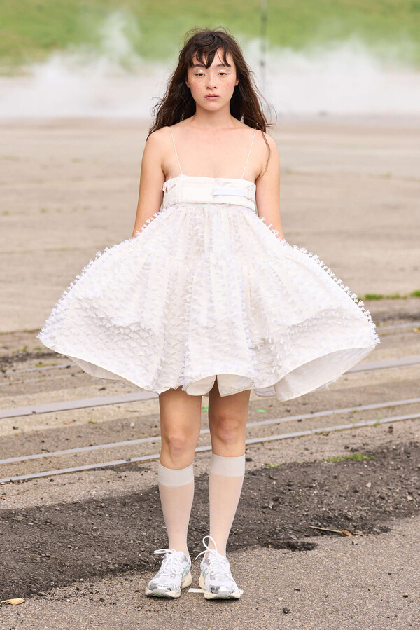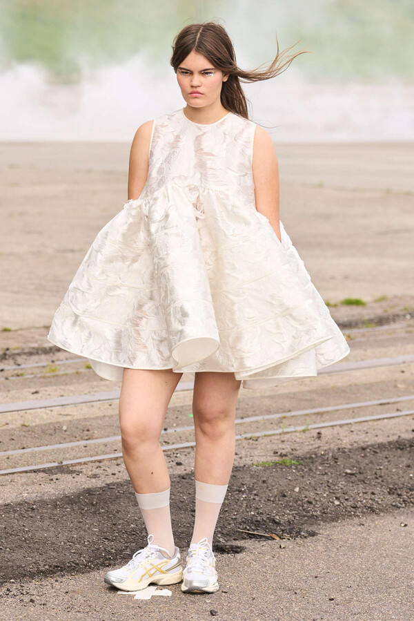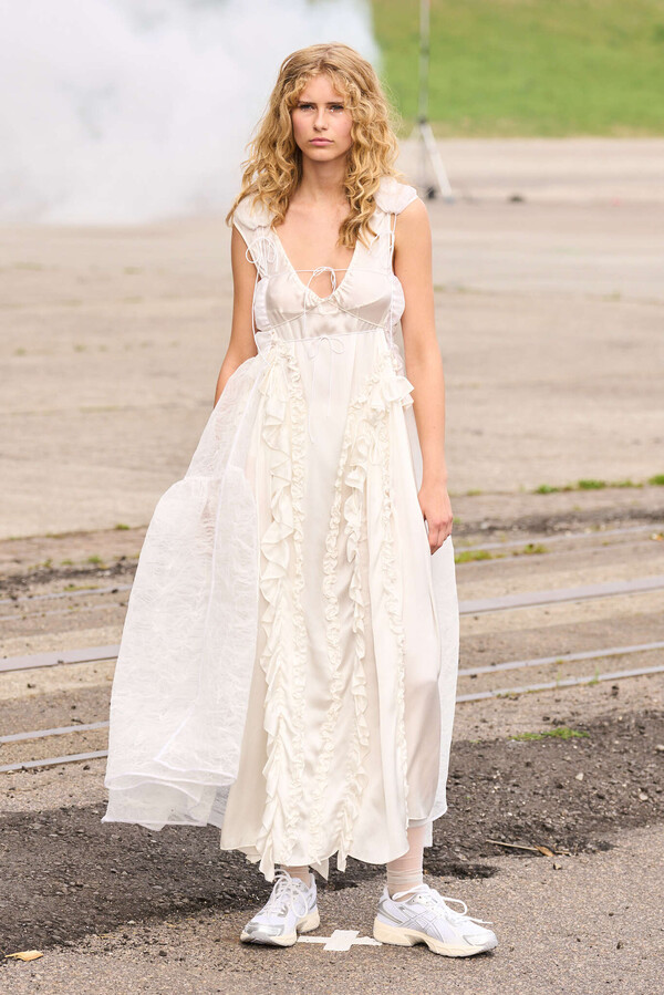 欧根纱、Fiama fil-coupé 和绗缝塔夫绸等惯用面料以全新形态回归。服装的廓形被翻转,下摆被改变,体积被压缩或释放。这种反复的改造甚至延伸到了鞋履:所有模特均穿着白色 ASICS 运动鞋,它们以刺绣、烫金工艺或外露衬里的方式被重新演绎——致敬了 Bahnsen 与 ASICS 的长期合作,以及她将实用性与诗意感相融合的能力。