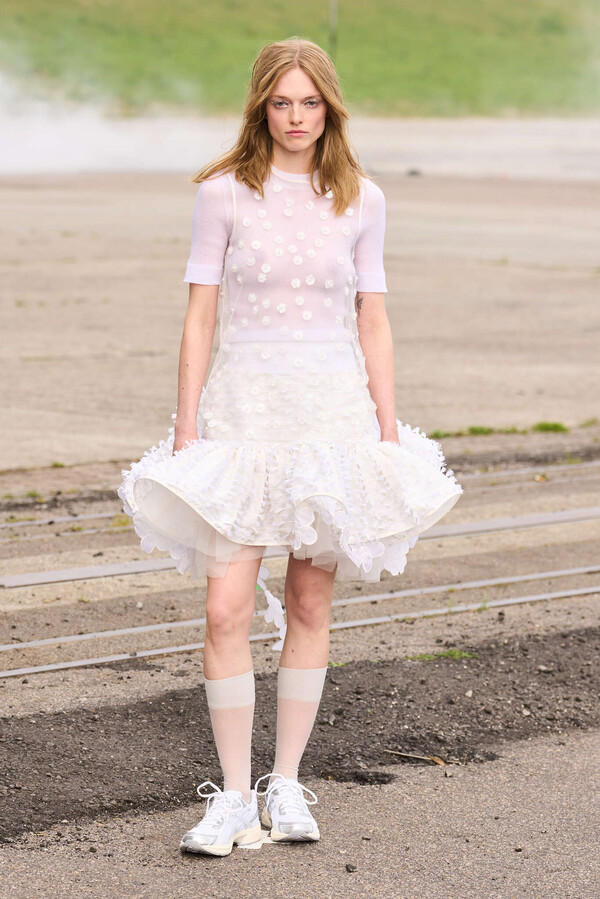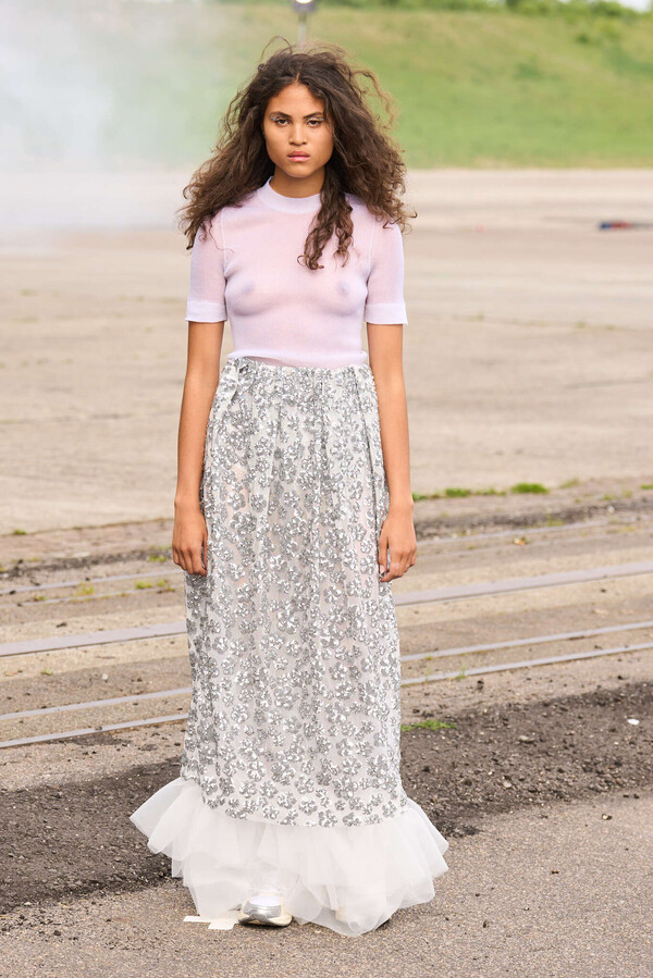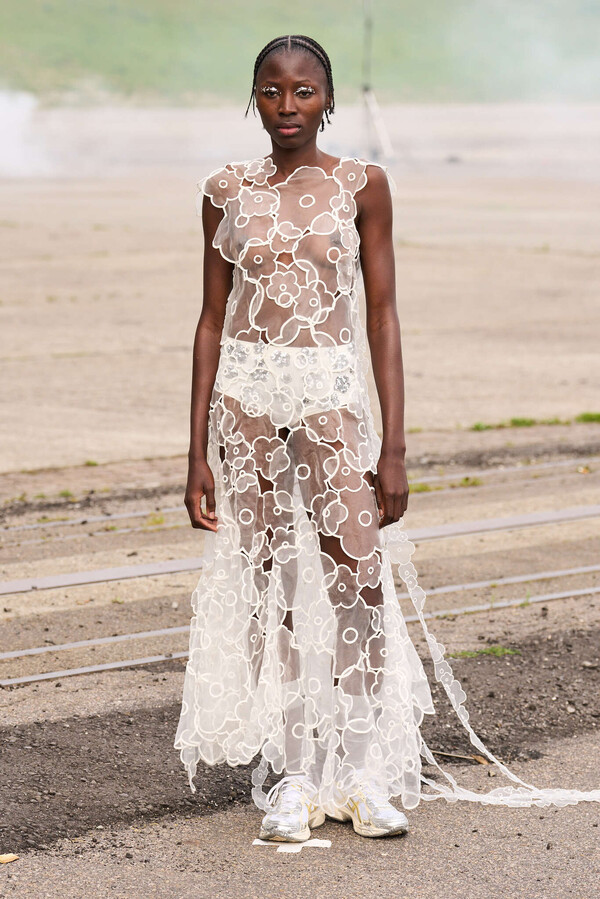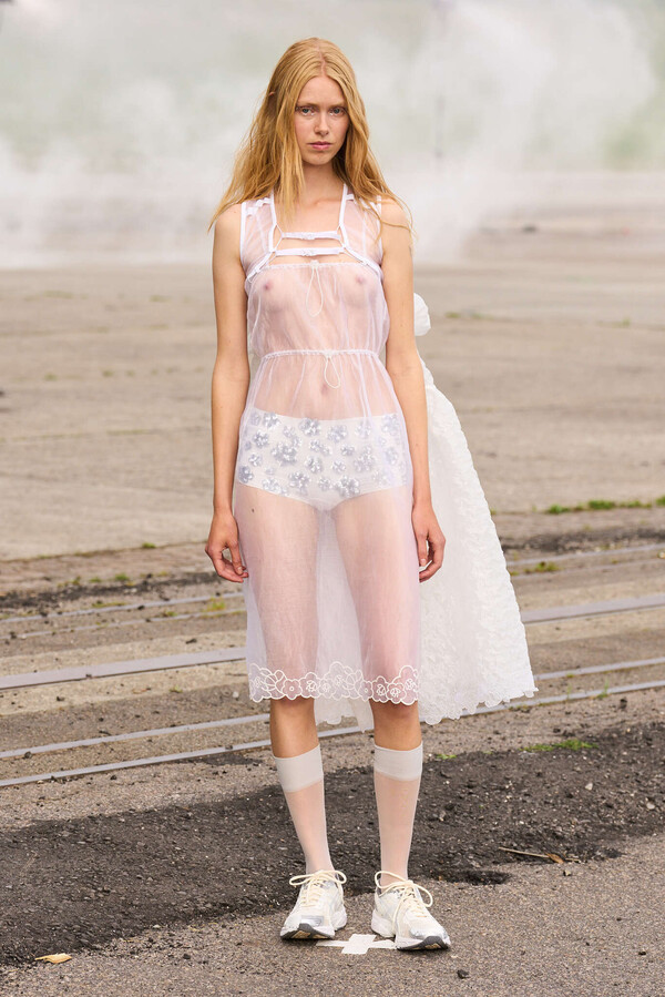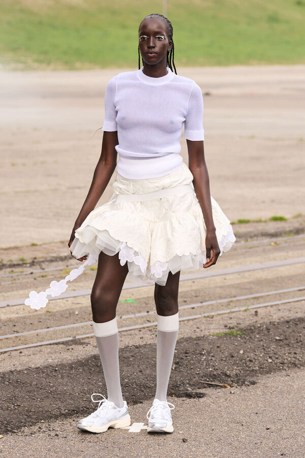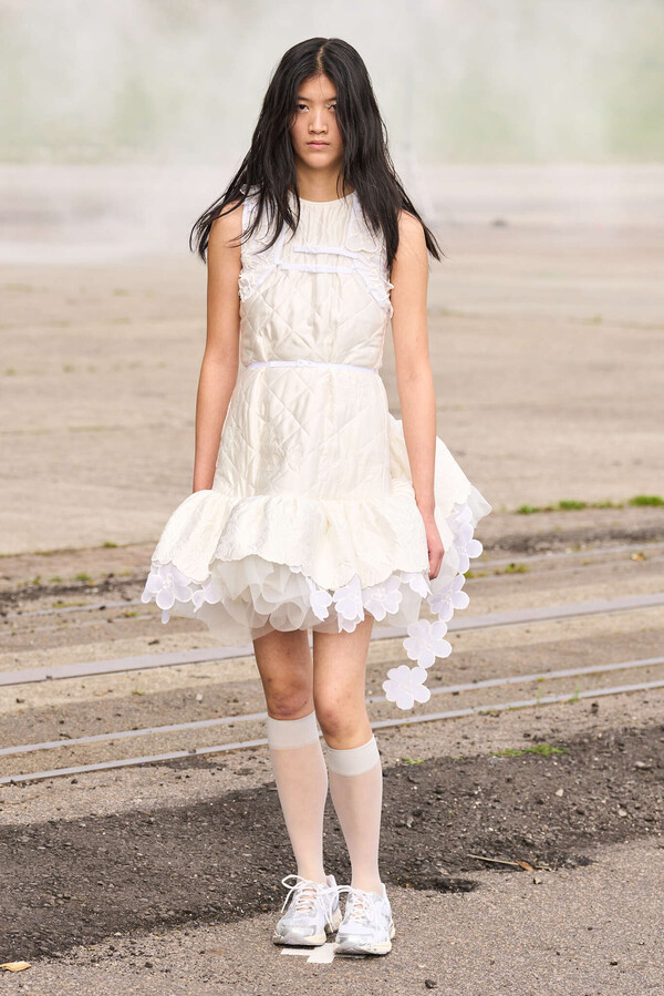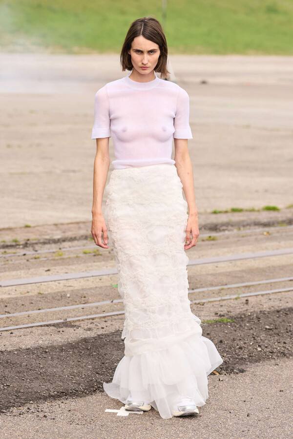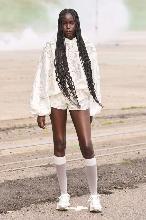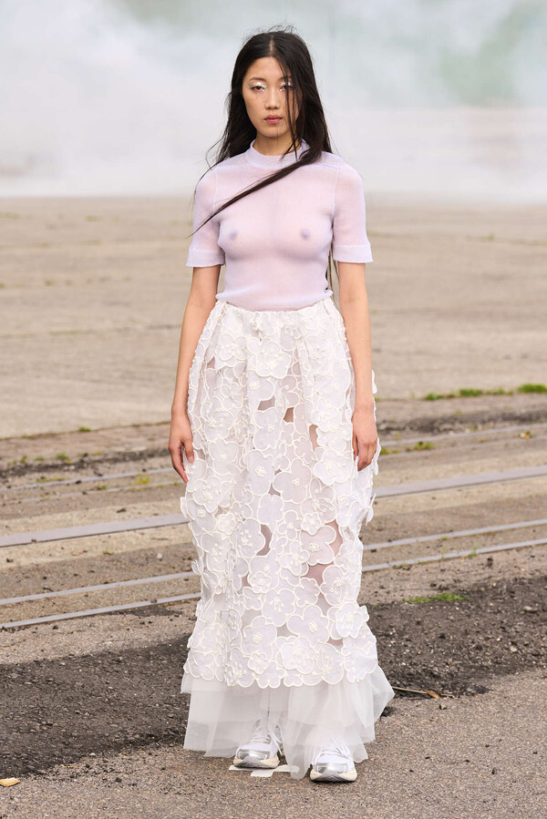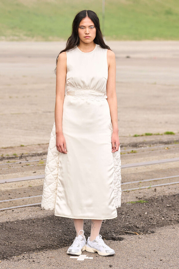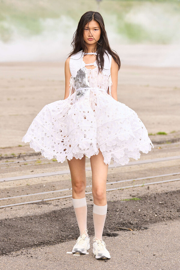 欧根纱、Fiama fil-coupé 和绗缝塔夫绸等惯用面料以全新形态回归。服装的廓形被翻转,下摆被改变,体积被压缩或释放。这种反复的改造甚至延伸到了鞋履:所有模特均穿着白色 ASICS 运动鞋,它们以刺绣、烫金工艺或外露衬里的方式被重新演绎——致敬了 Bahnsen 与 ASICS 的长期合作,以及她将实用性与诗意感相融合的能力。