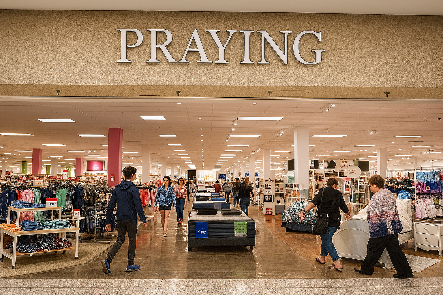 洛杉矶先锋品牌 Praying 首次于国内打造线下快闪店,空间灵感源自品牌主理人对其母亲曾任职的 21 世纪初美国女装百货商店的童年记忆。金属货架与复古字体广告牌,精准复刻了那个年代的标志性商业景观。
