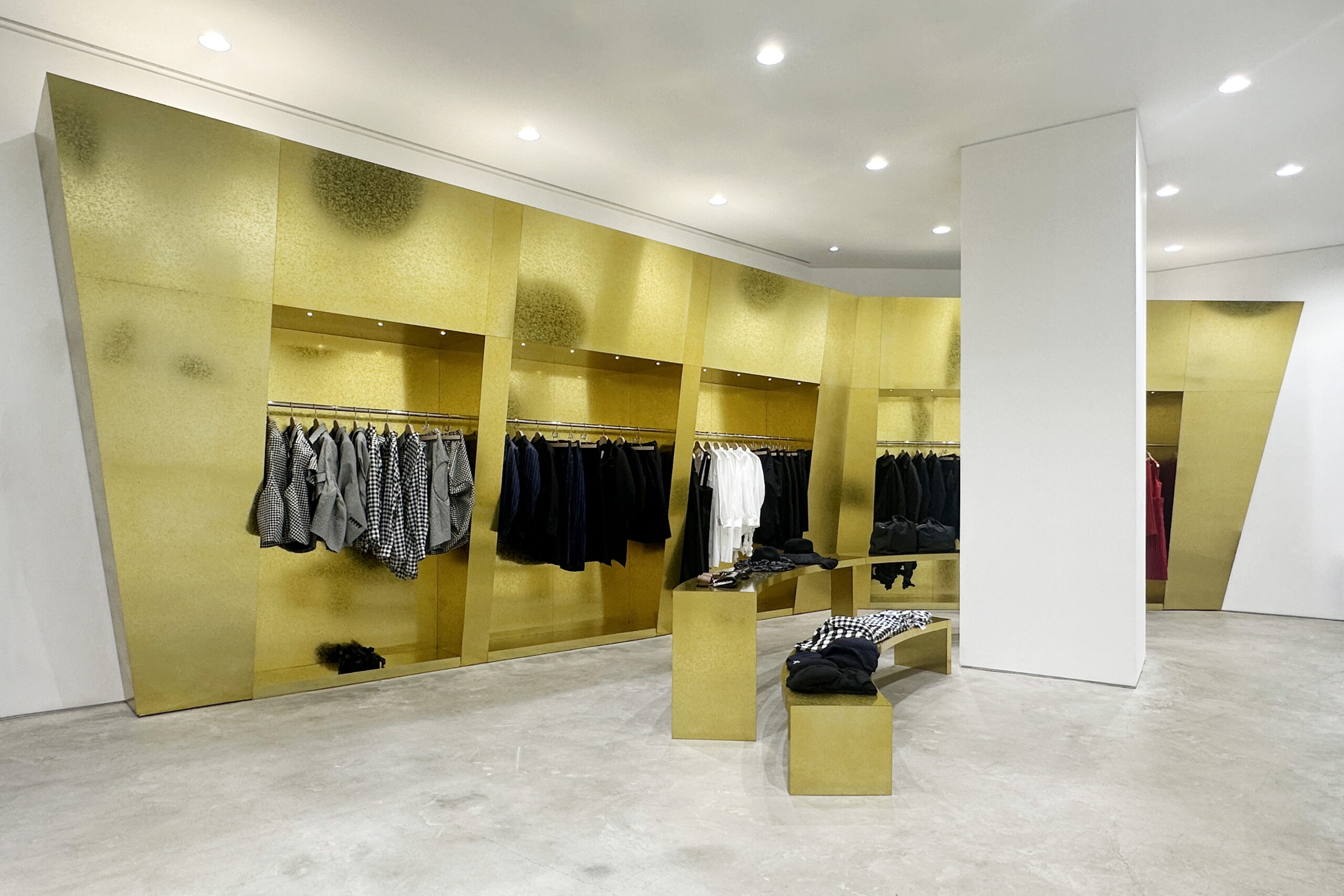 COMME des GARÇONS 在位于一层 Elephant Space 呈现 2025 秋冬特别装置。品牌创始人及设计师川久保玲亲自操刀,以「小而宏大」为题,在木质框架 T 台上搭建起戏剧化的空间:高低错落的体量、突兀的几何体与蜿蜒动线交错,仿佛一座可步入的装饰艺术展厅。